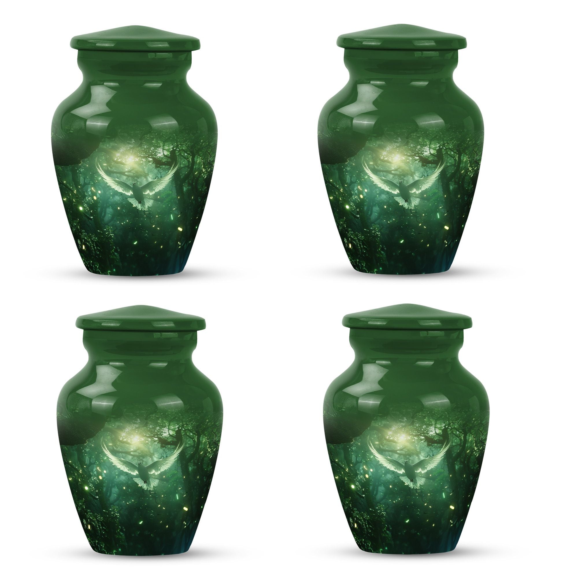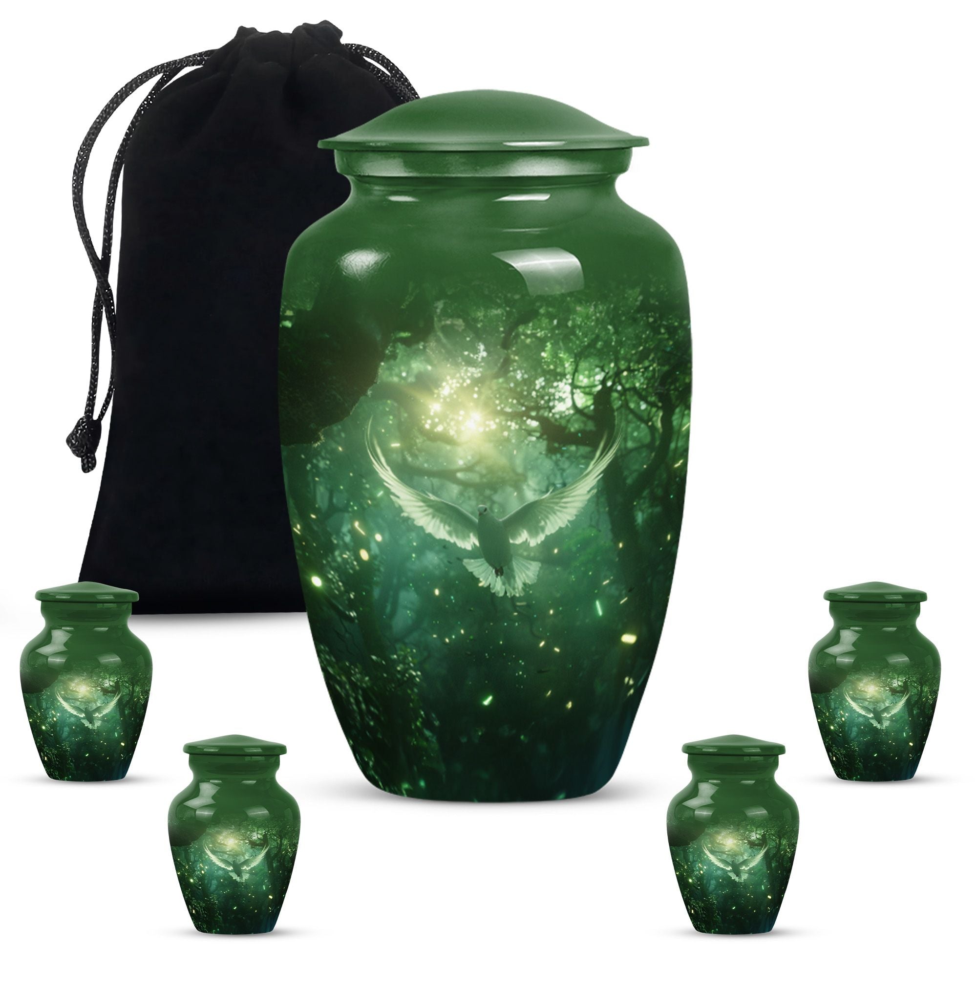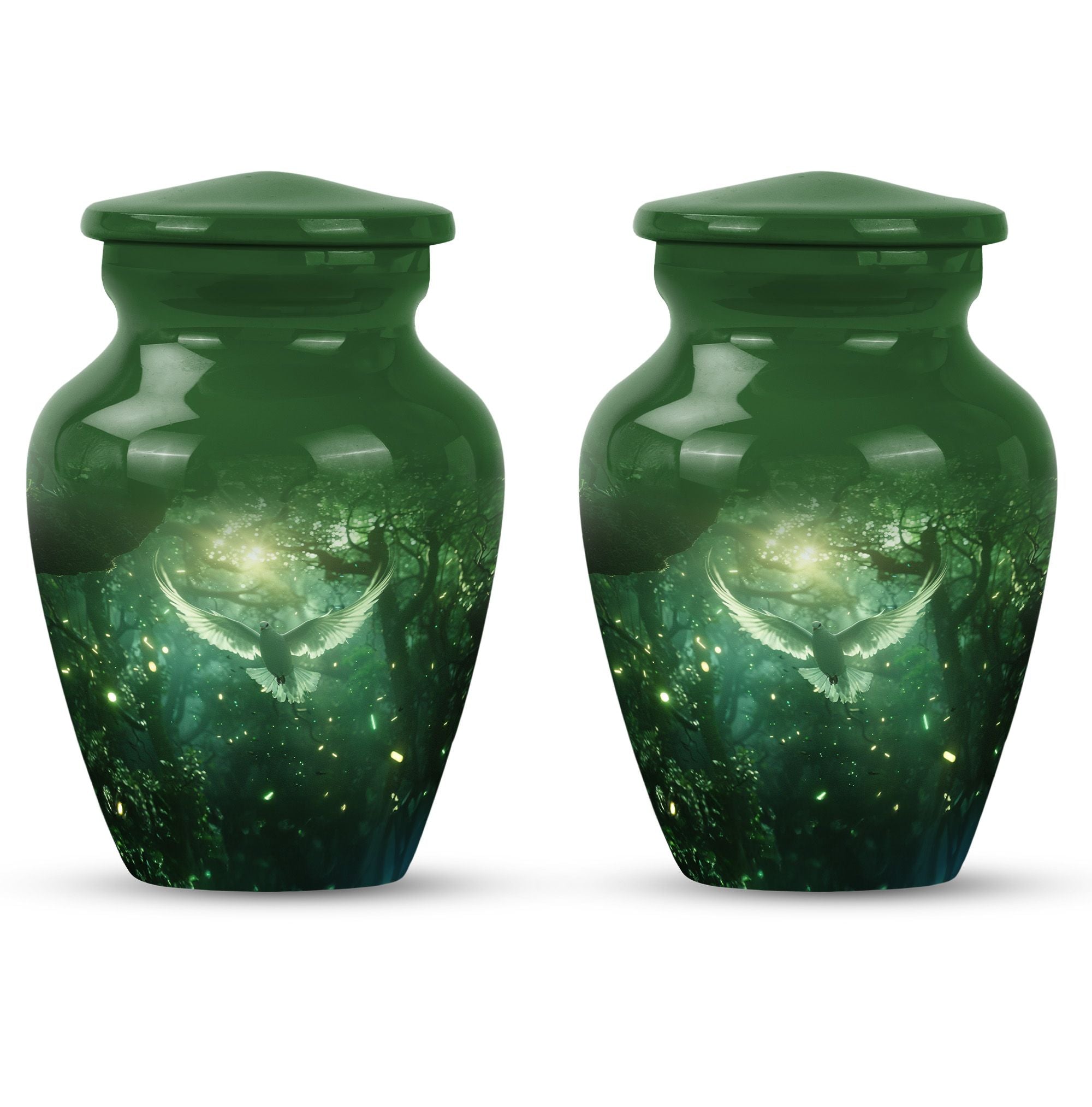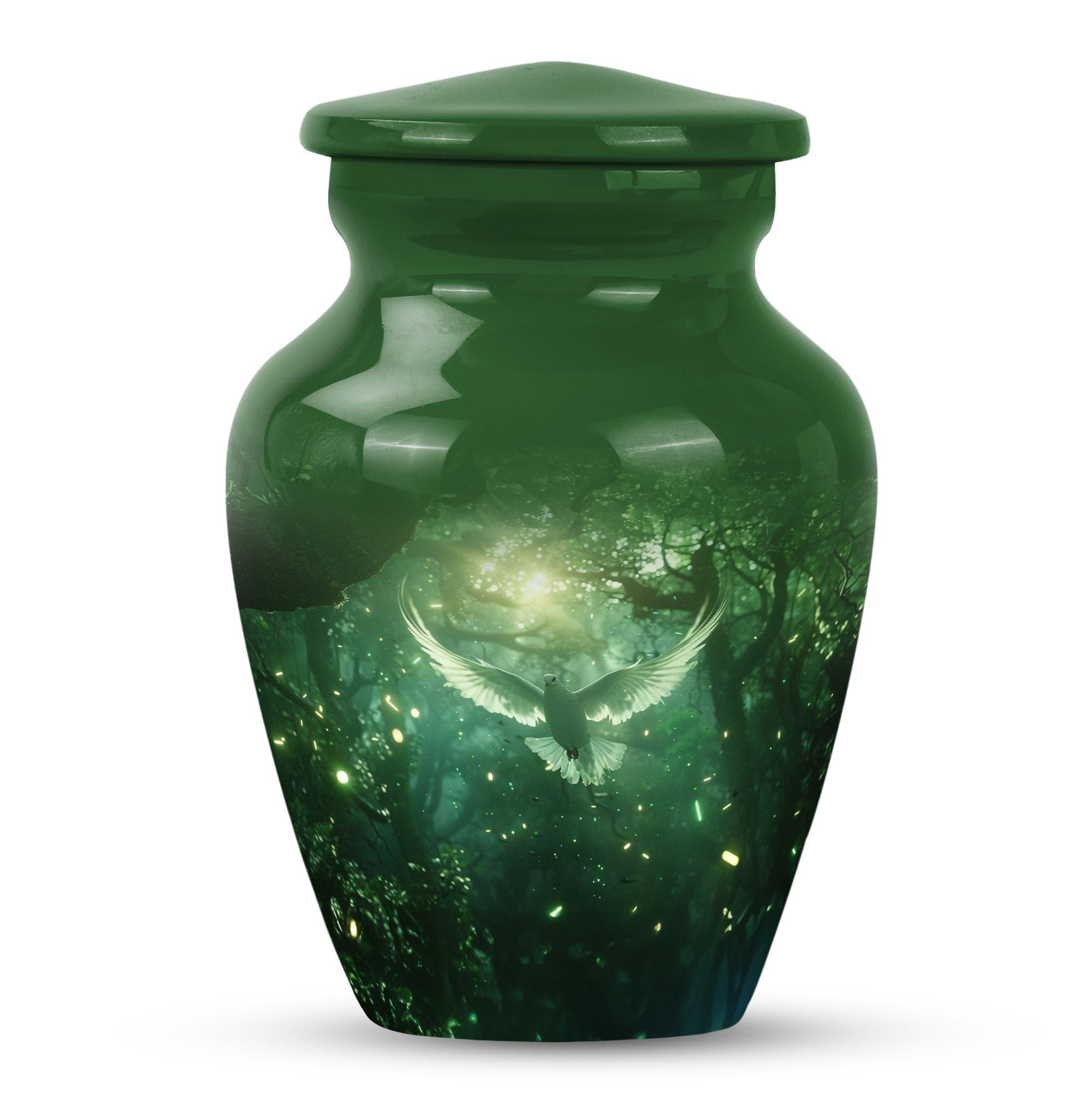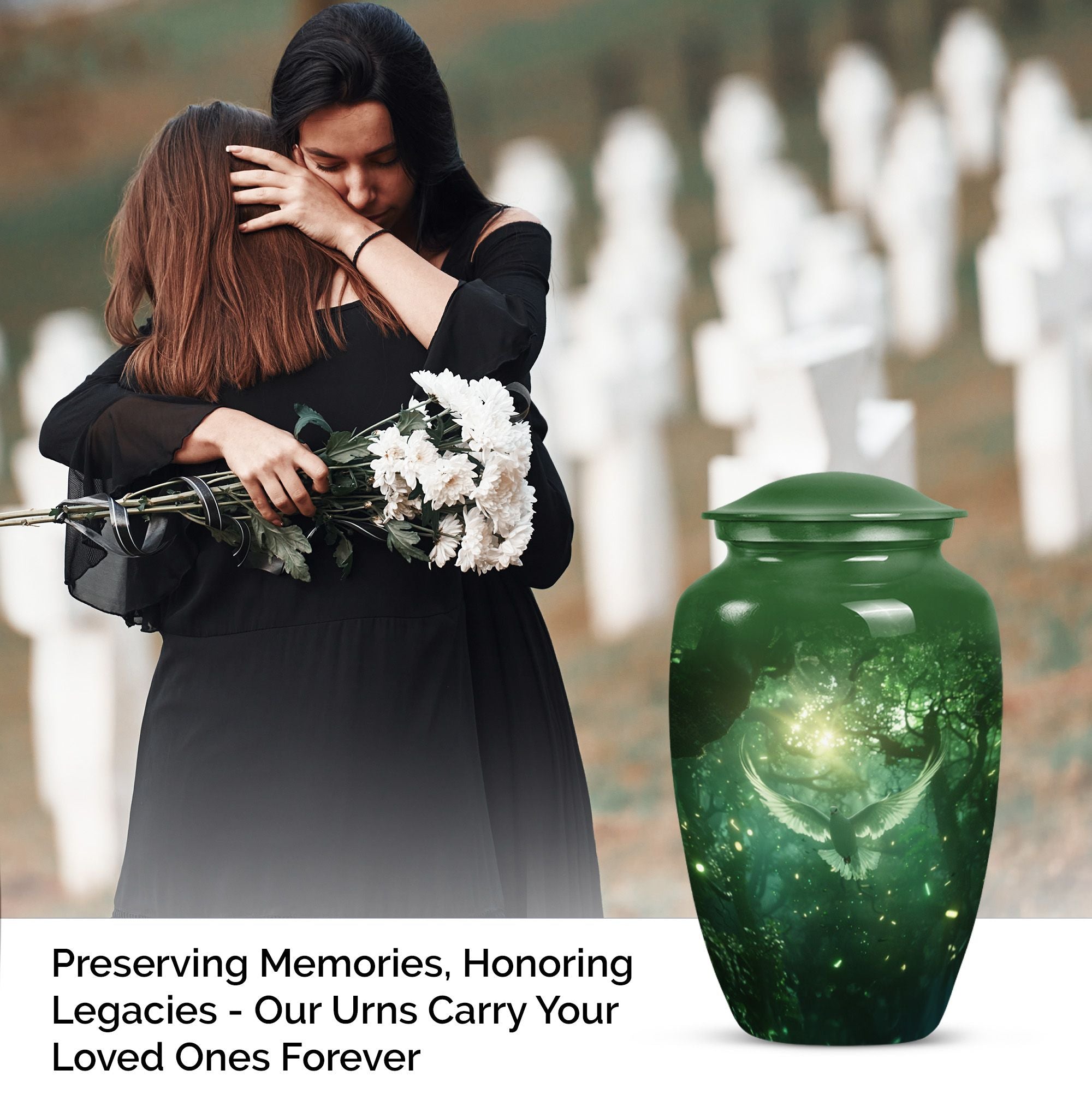 Experience the tranquility and peace offered by our Dove Urn, a timeless memorial medium-sized urn skillfully crafted from durable aluminium. With its impressive 10-inch height and a weight of 3.3 pounds, this large funeral urn captivates with its traditional design and graceful dove theme. Besides its beautiful physical attributes, it offers a substantial internal capacity of 200 cubic inches, ideal for adults. The urn also comes with a tastefully designed velvet pouch for respectful containment and transportation of the ashes. This exquisite urn strikes the perfect balance between functionality and aesthetic appeal, making it an excellent pick for those wanting to celebrate their loved ones' memories. Personalize this cremation urn with engraved names to add that unique, intimate touch. The soothing presence of this treasured piece is sure to bring comfort during challenging times. Note: ash burial urn and cremation urns for human ashes are common search terms in this category by those who treasure the quiet dignity and expressive power offered by such memorable objects.