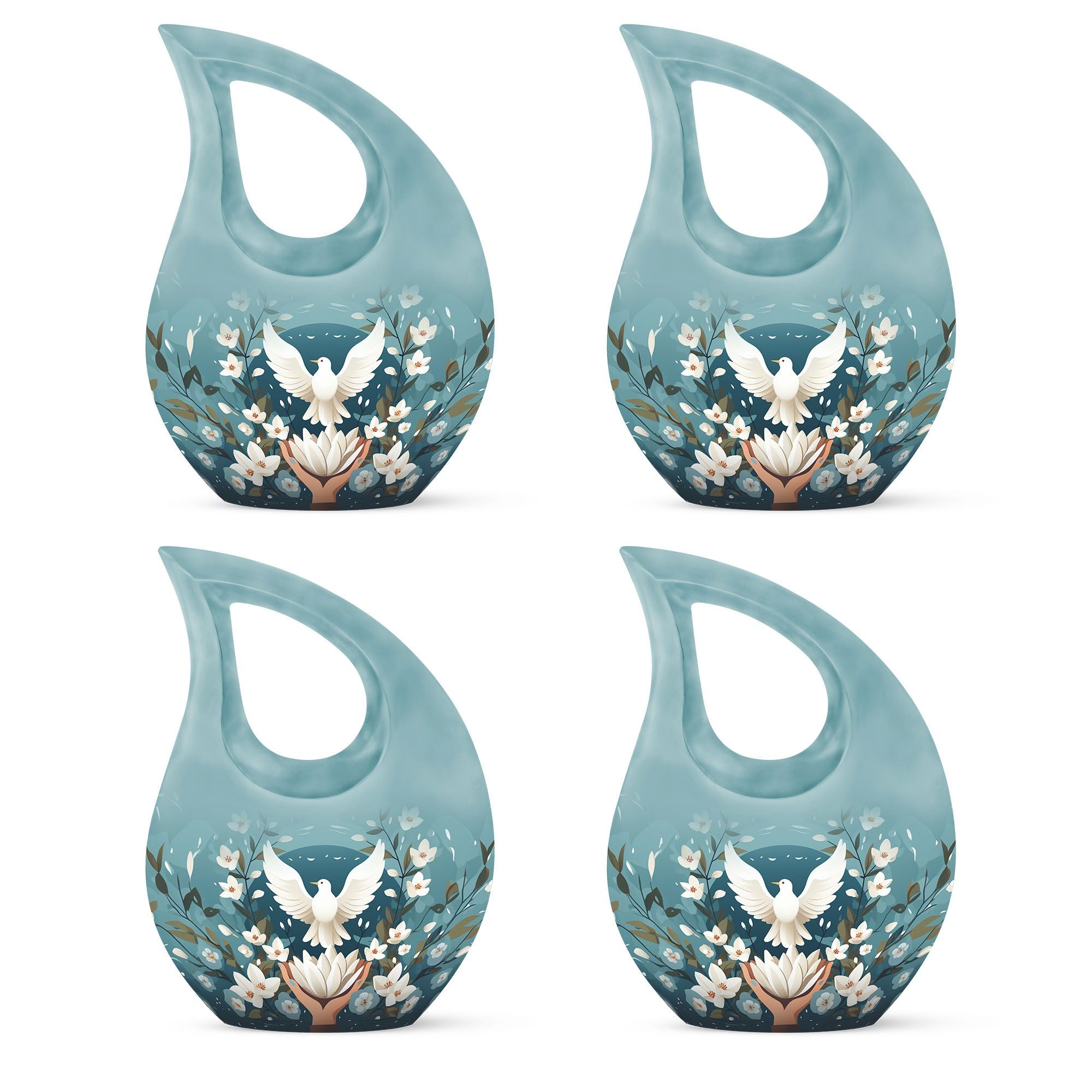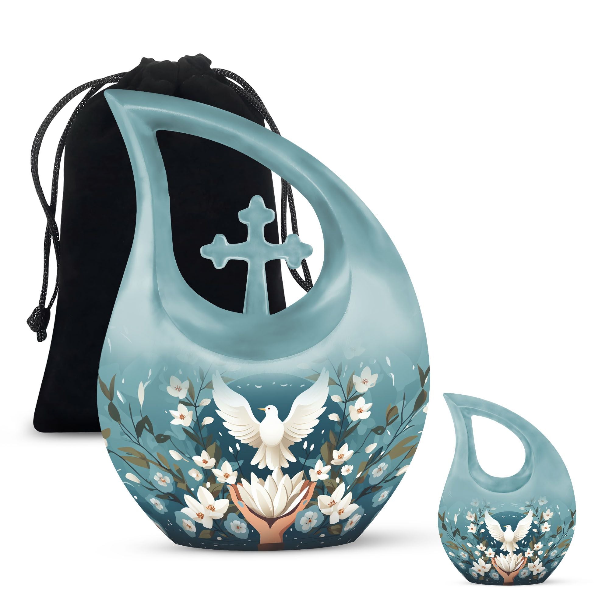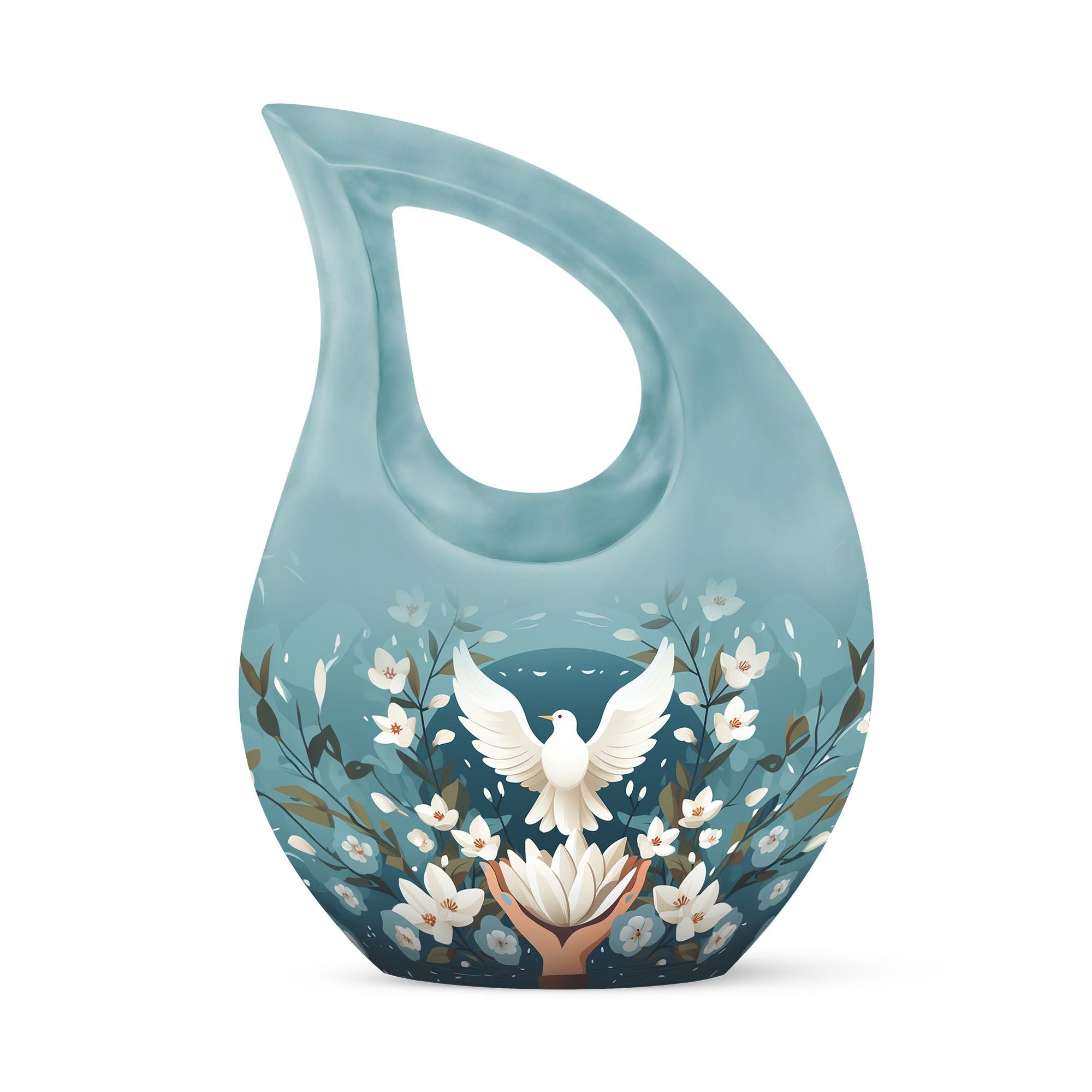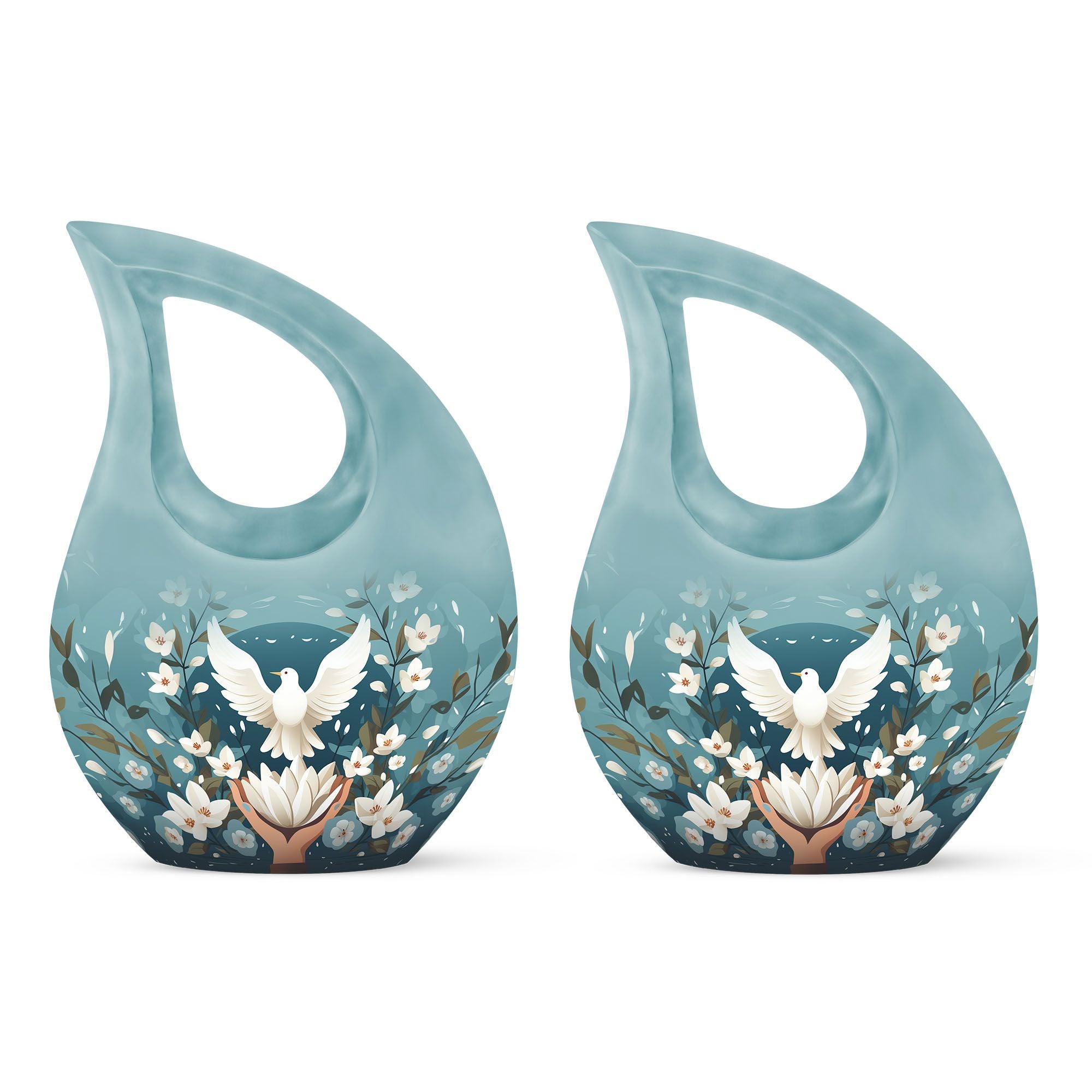 Meticulously handcrafted from durable aluminum, this large decorative urn showcases a serene blue finish adorned with engraved doves and lotus motifs—symbols of purity and the soul’s journey. Designed as a cremation urn large enough to hold the full remains of an adult, it combines strength with artistic detail. Whether used as a large funeral urn or displayed at home, it radiates calm and spiritual significance.