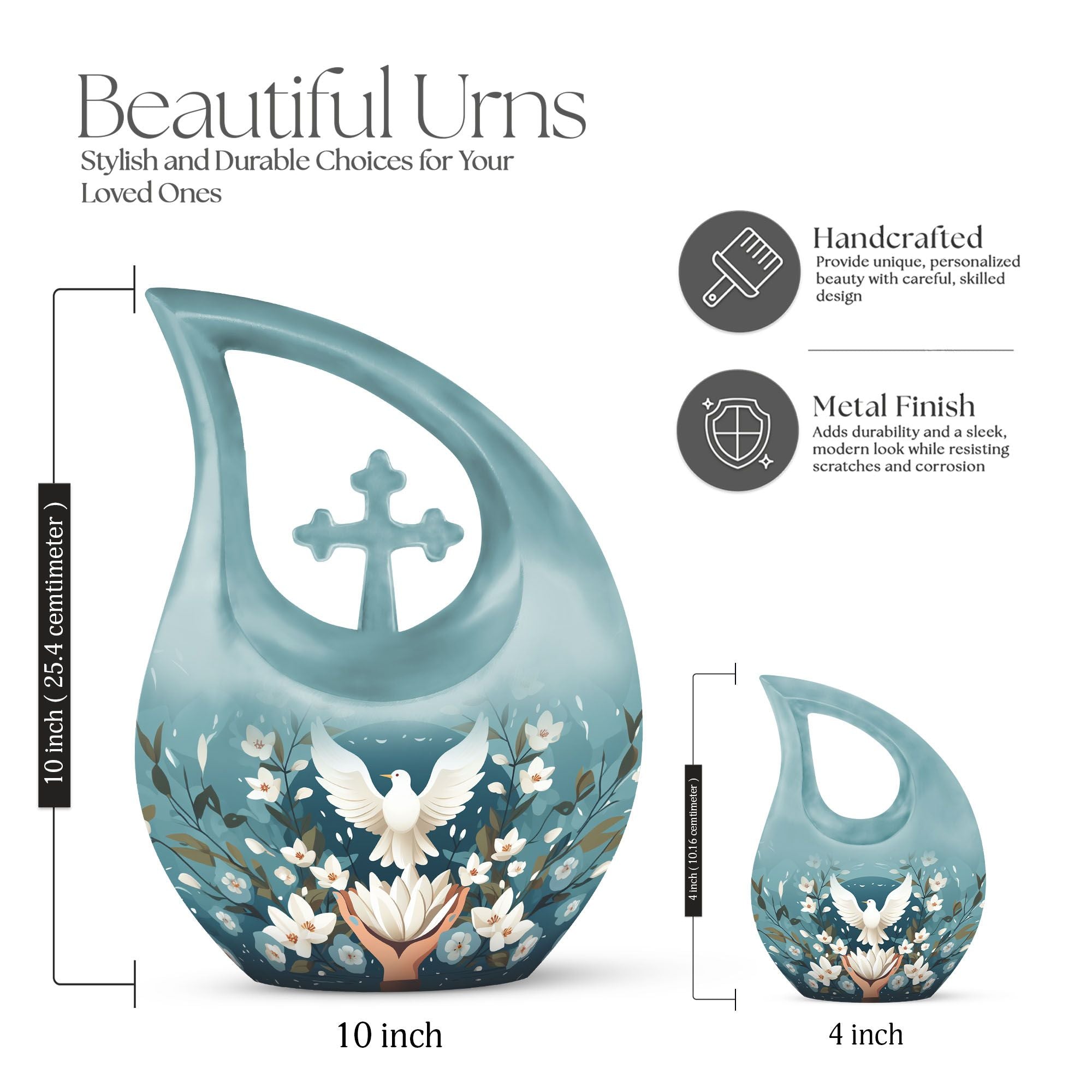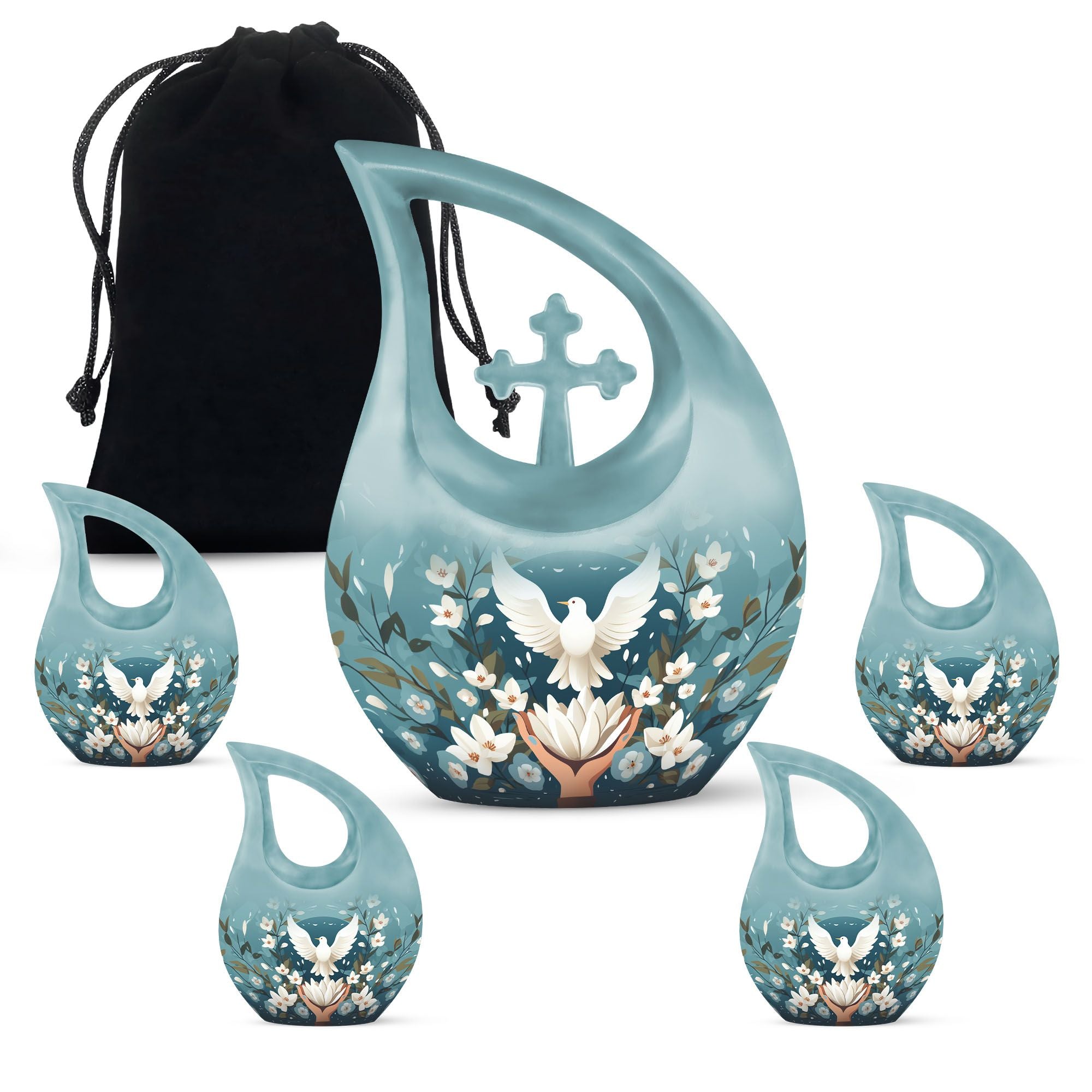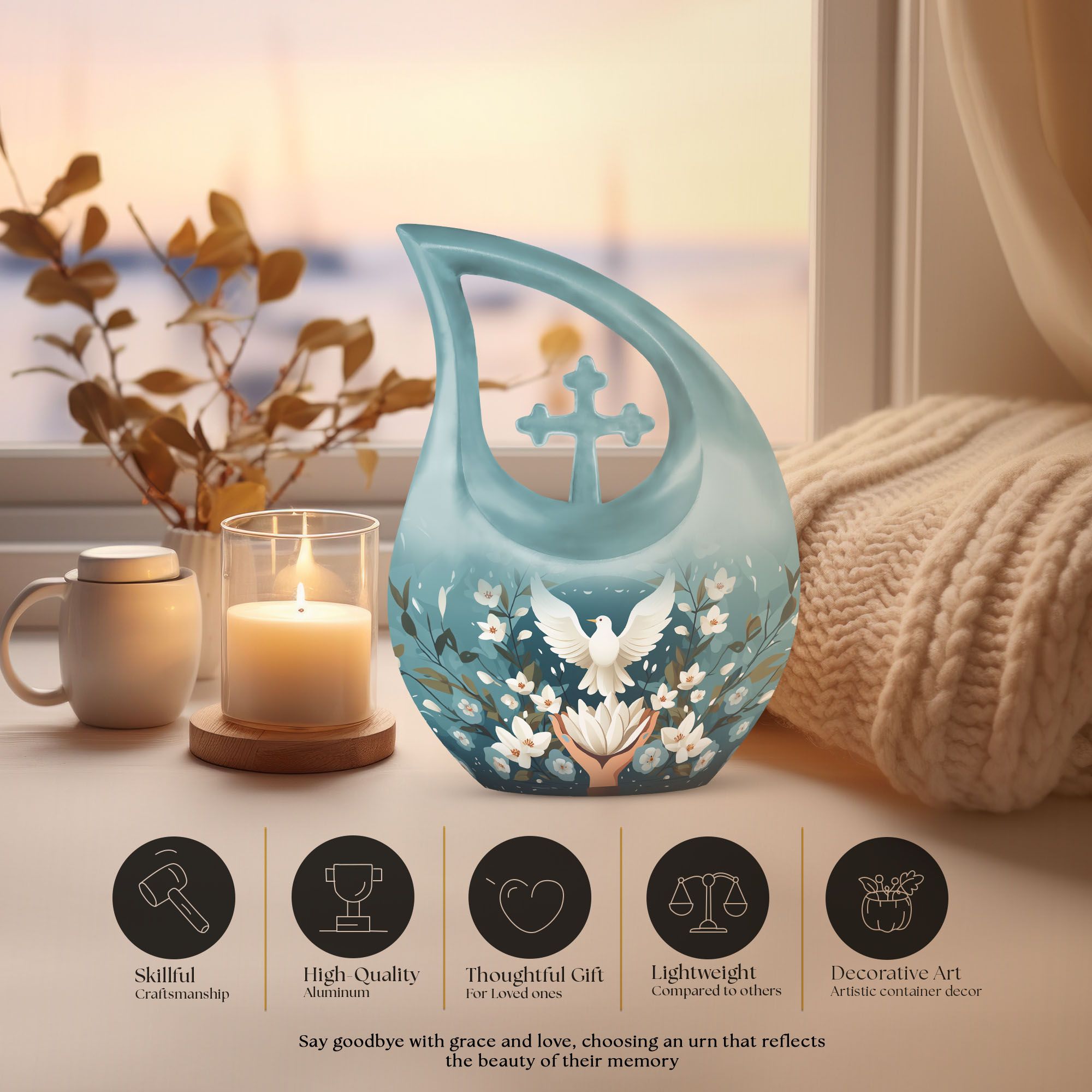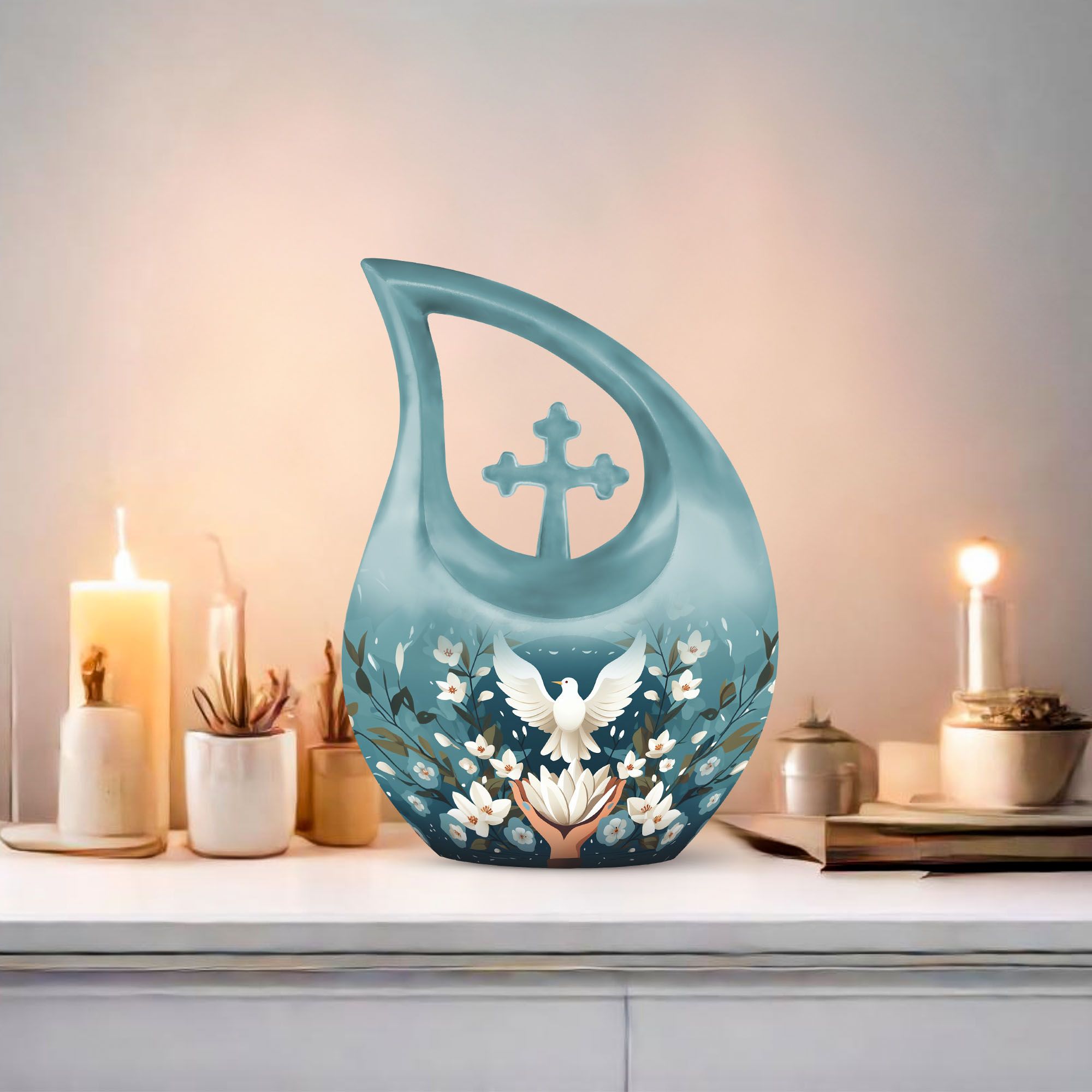 Meticulously handcrafted from durable aluminum, this large decorative urn showcases a serene blue finish adorned with engraved doves and lotus motifs—symbols of purity and the soul’s journey. Designed as a cremation urn large enough to hold the full remains of an adult, it combines strength with artistic detail. Whether used as a large funeral urn or displayed at home, it radiates calm and spiritual significance.