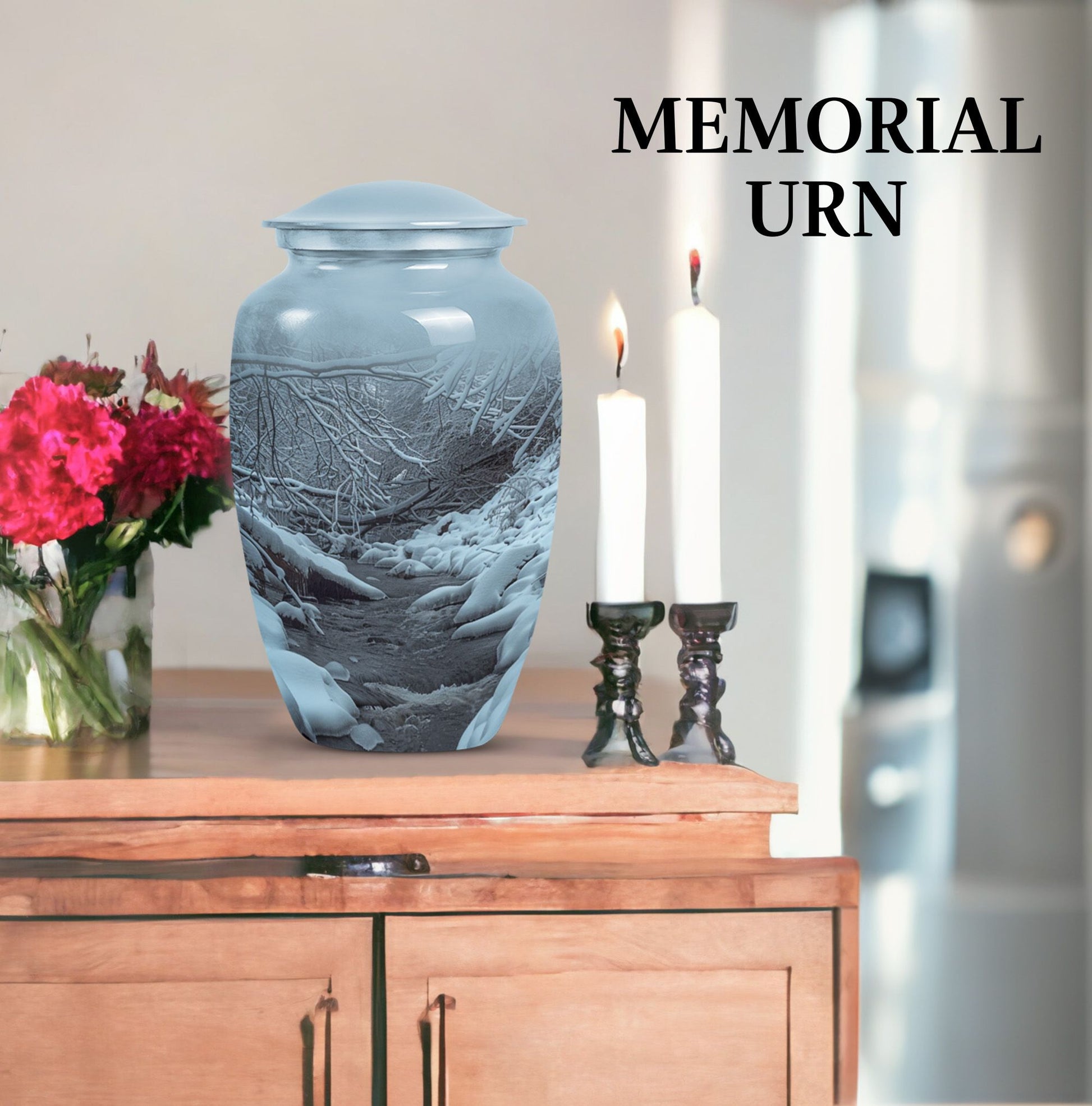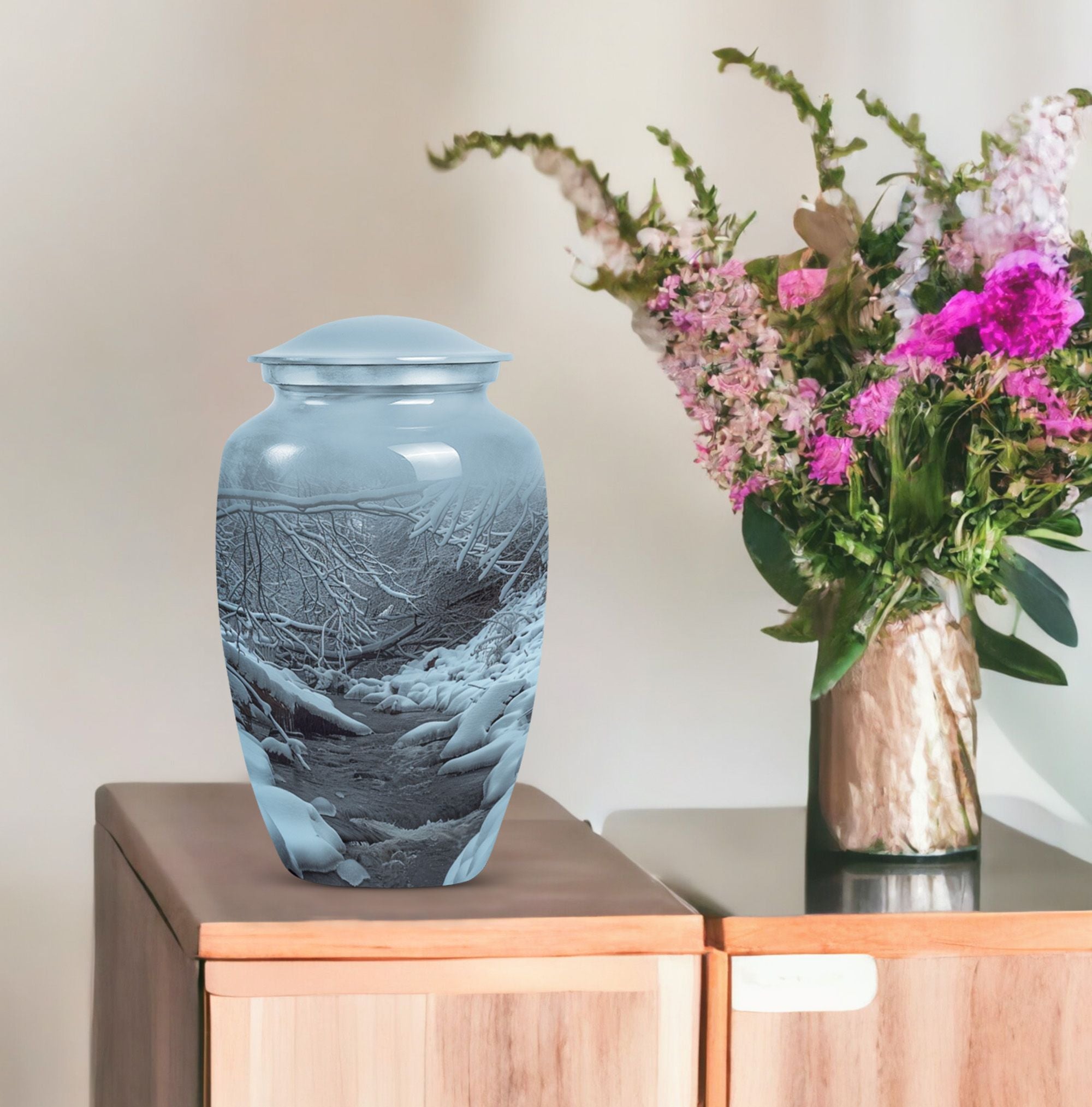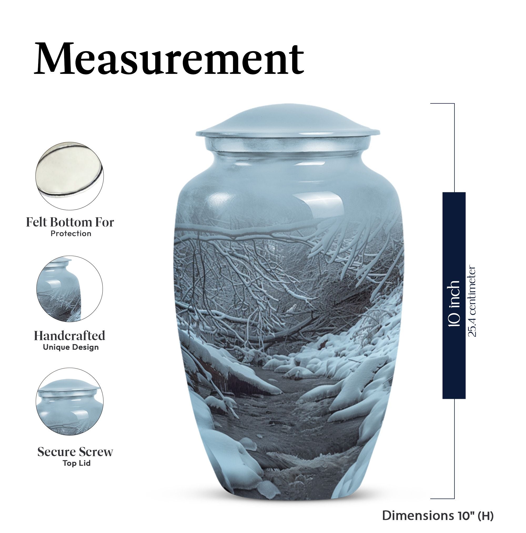 This 10-inch Mountains Urn is a dignified tribute and an ideal choice for memorial ceremony supplies. As a grand, large urn, its capacity holds up to 200 cubic inches for the containment of cremation remains. Crafted from high-quality aluminium, this funeral urn for men, bears an abstract theme, effectively mirroring individuality. Its weight affirms its sturdiness, being 3.3 pounds, conveying durability and resilience. The product arrives elegantly packaged with a dedicated velvet pouch, provided for the containment of ashes. Unique personalization options are available, allowing for an engraved names addition, adding an exceptional touch to commemorate a loved one's memory. This traditional, yet distinctive abstract themed urn, resonates reliability, ensuring a resolute and substantial memorial for your loved one. Ideal for those looking for memorial human urns for ashes, urn human funeral urns, burial urns or metal urns, this product presents a timeless choice.