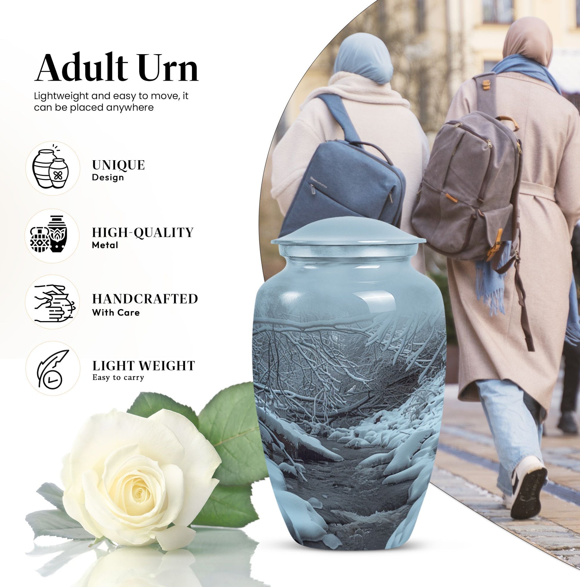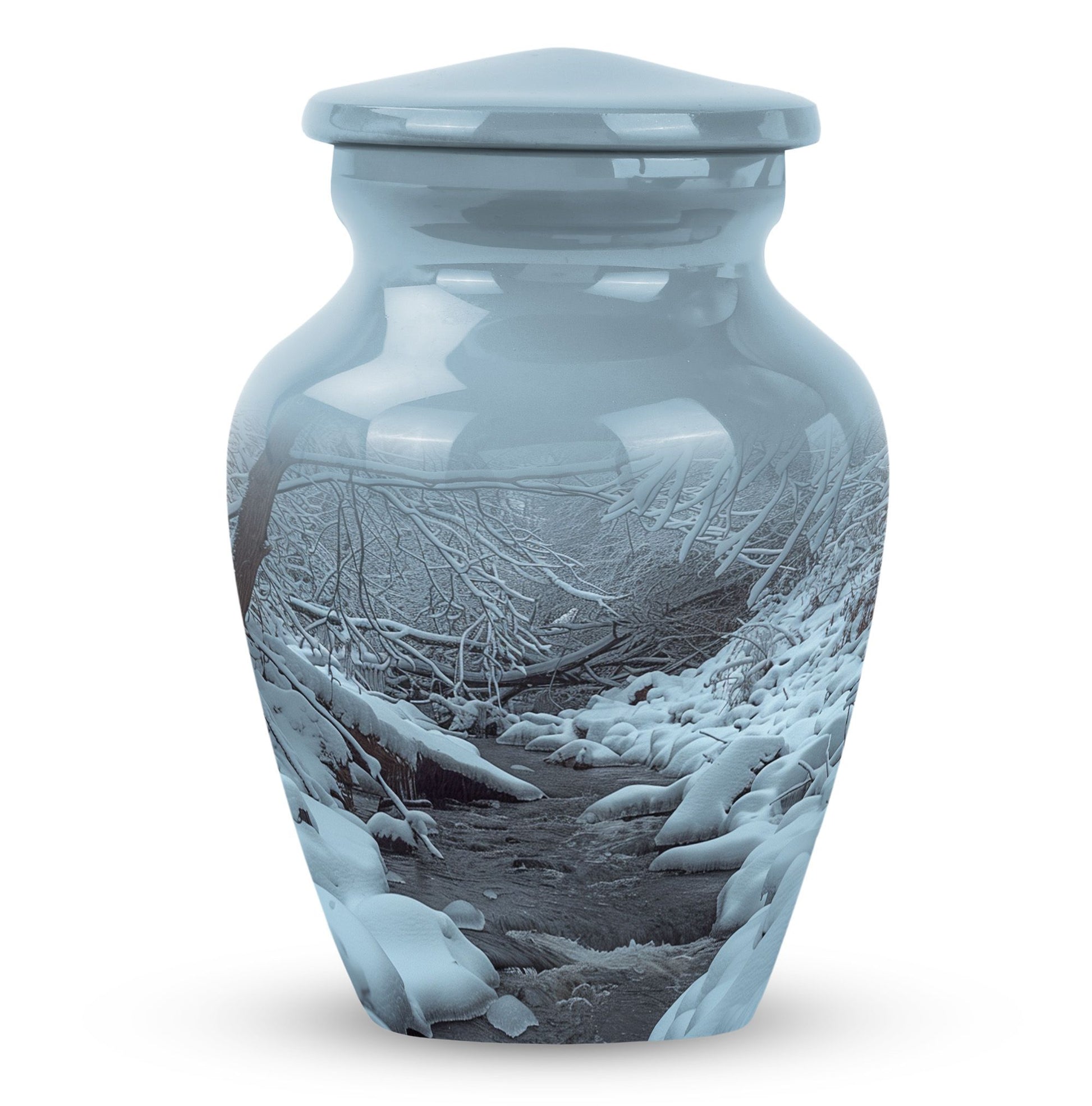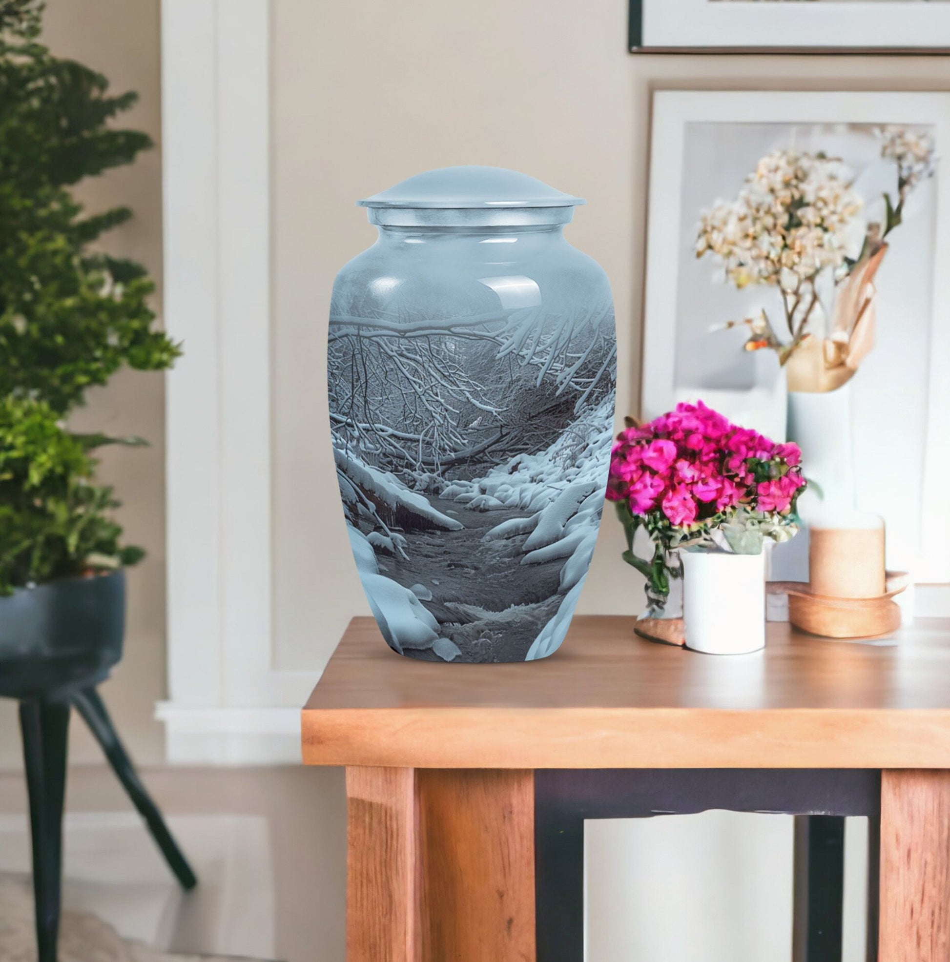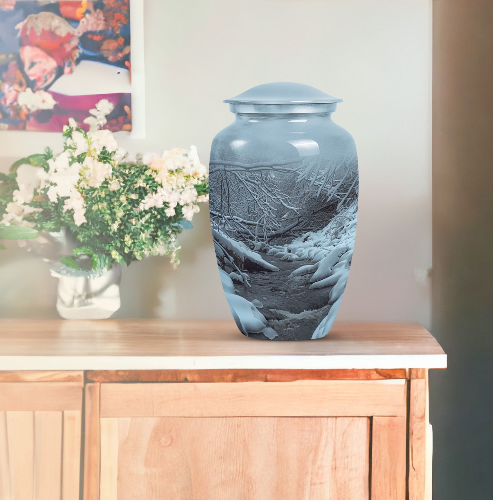 This 10-inch Mountains Urn is a dignified tribute and an ideal choice for memorial ceremony supplies. As a grand, large urn, its capacity holds up to 200 cubic inches for the containment of cremation remains. Crafted from high-quality aluminium, this funeral urn for men, bears an abstract theme, effectively mirroring individuality. Its weight affirms its sturdiness, being 3.3 pounds, conveying durability and resilience. The product arrives elegantly packaged with a dedicated velvet pouch, provided for the containment of ashes. Unique personalization options are available, allowing for an engraved names addition, adding an exceptional touch to commemorate a loved one's memory. This traditional, yet distinctive abstract themed urn, resonates reliability, ensuring a resolute and substantial memorial for your loved one. Ideal for those looking for memorial human urns for ashes, urn human funeral urns, burial urns or metal urns, this product presents a timeless choice.
