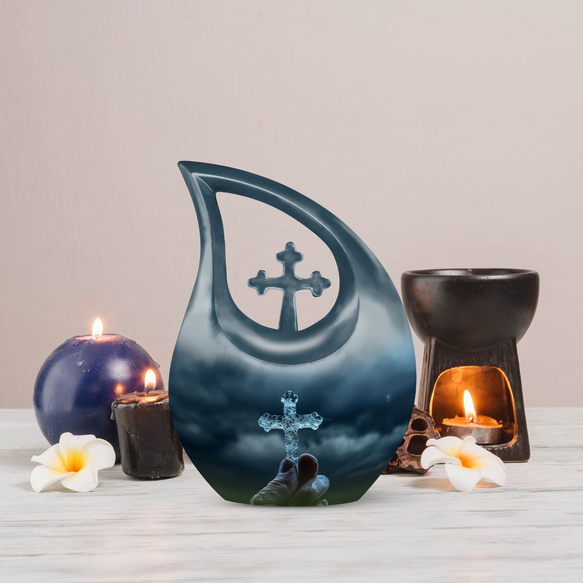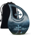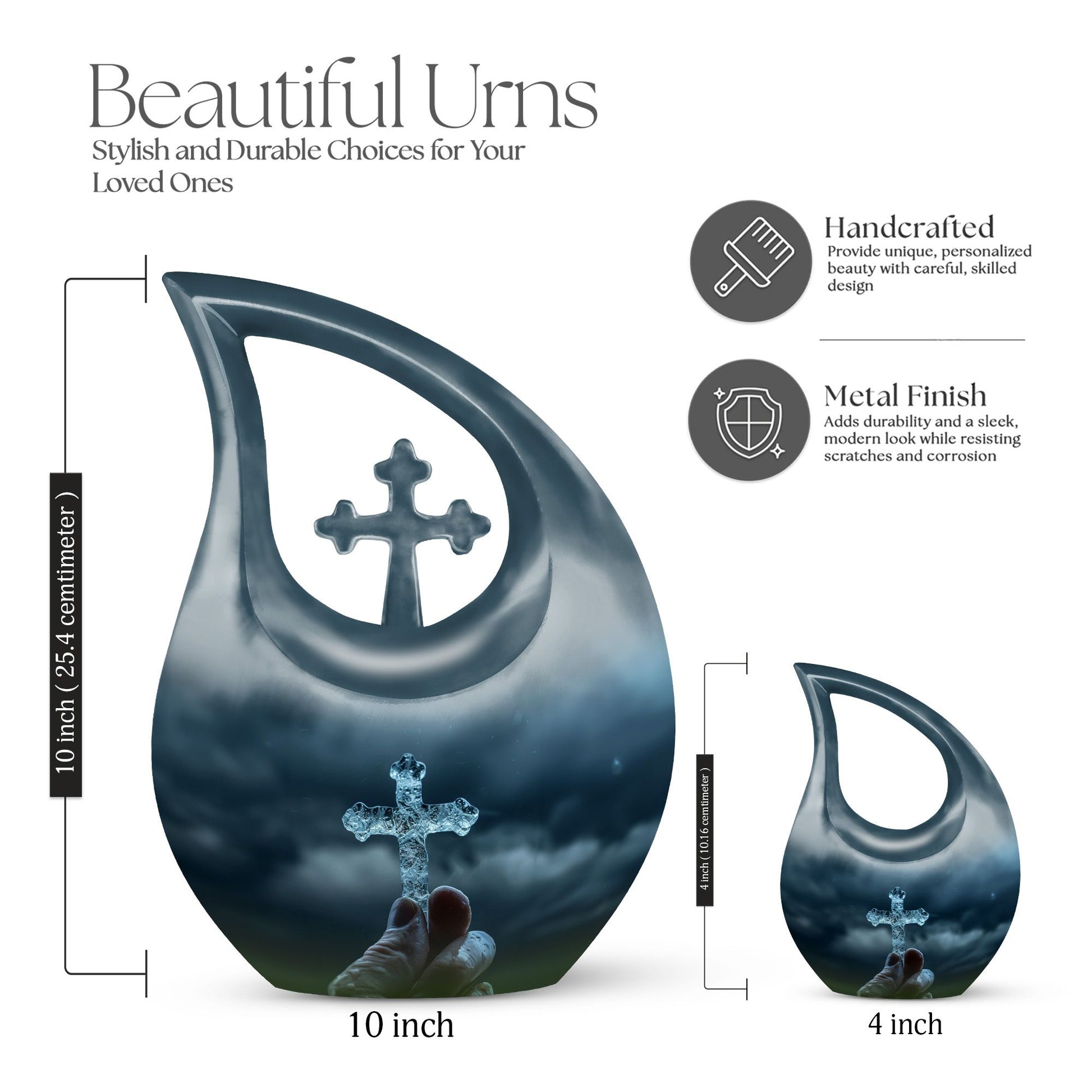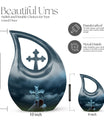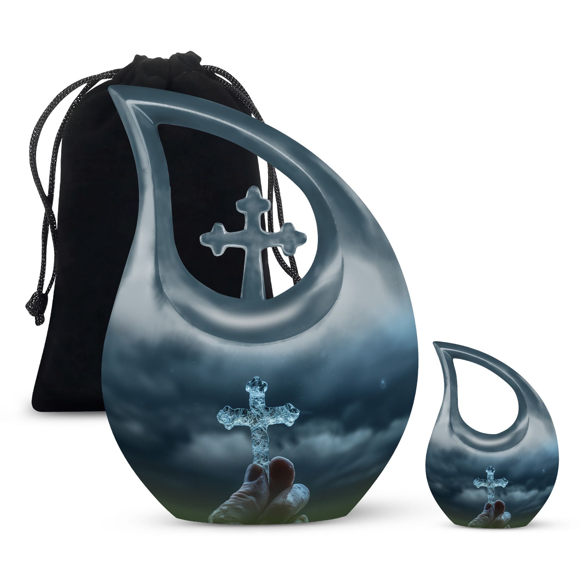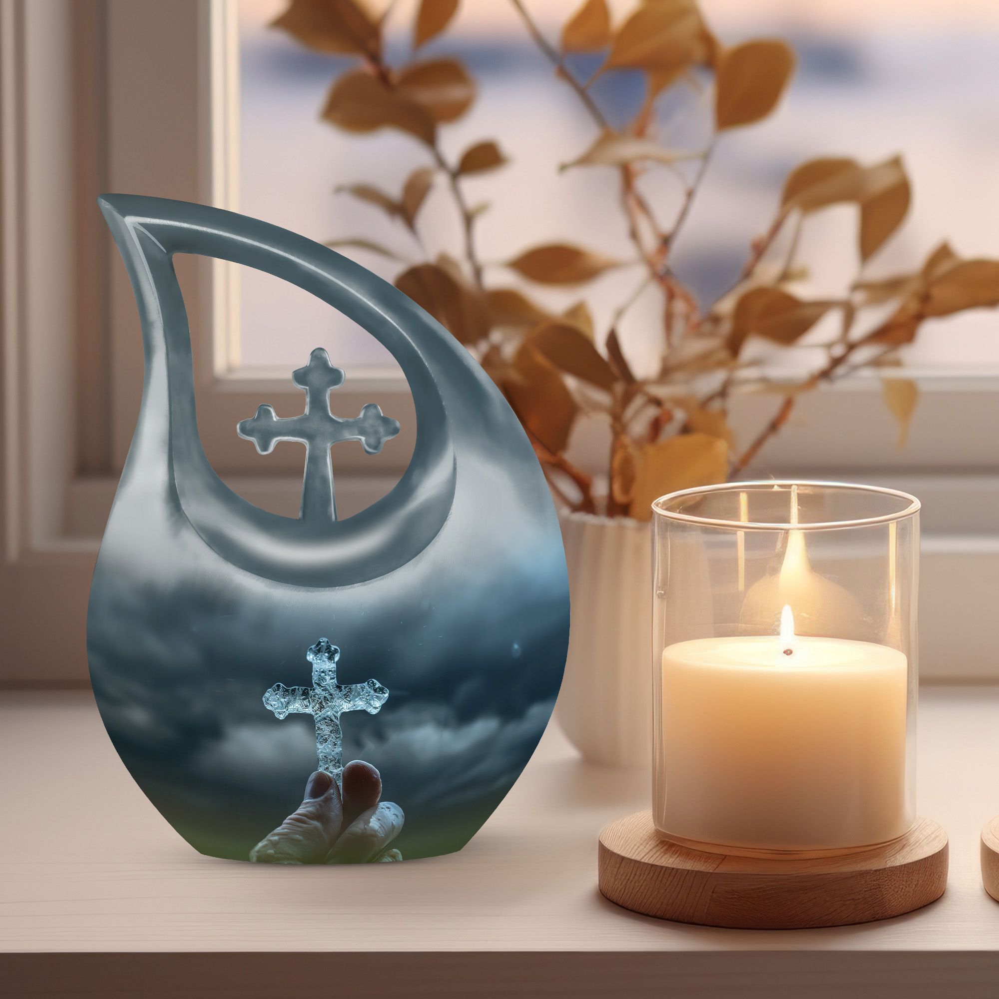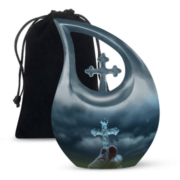Introducing our Crystal Faith Urn, a truly unique tribute to eternal rest. This Large Urn, measuring 10 Inches in height and crafted from robust Aluminium, is a fitting addition to any memorial ceremony. You can personalized this Funeral Urn as per your wishes with engraved names, giving it an additional touch of heartfelt sentiments. With a capacity of a substantial 200 cubic inches, this urn can accommodate the ashes of adults comfortably, contained in a thoughtfully supplied velvet pouch for utmost respect and commemoration. Our Cross Drop Urn, weighing 3.3 pounds, is not just an urn but a symbol of heartfelt memories and prayers. It beautifully blends the essence and purpose of memorial urns, making it an affordable choice without compromising the quality or sentiment. This urn can be indeed a unique yet personal choice for moms ashes or any beloved who rests in peace. Remember, this Crystal Faith urn is more than a container; it's a vessel of lasting memories and love.