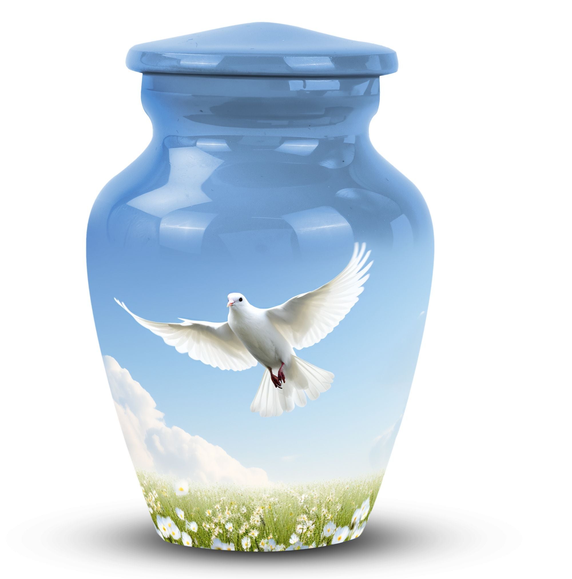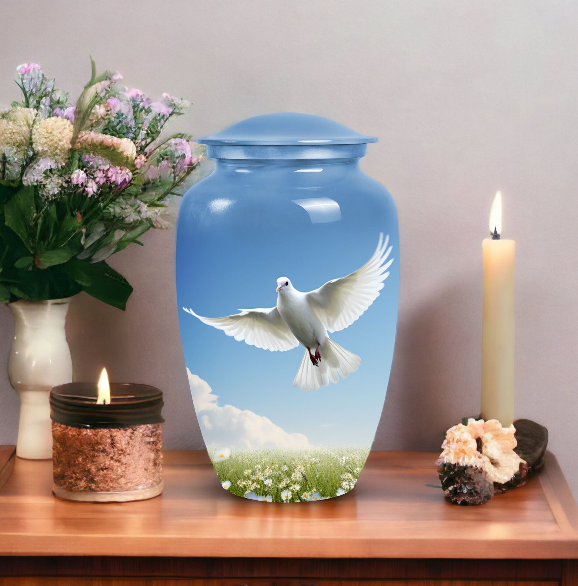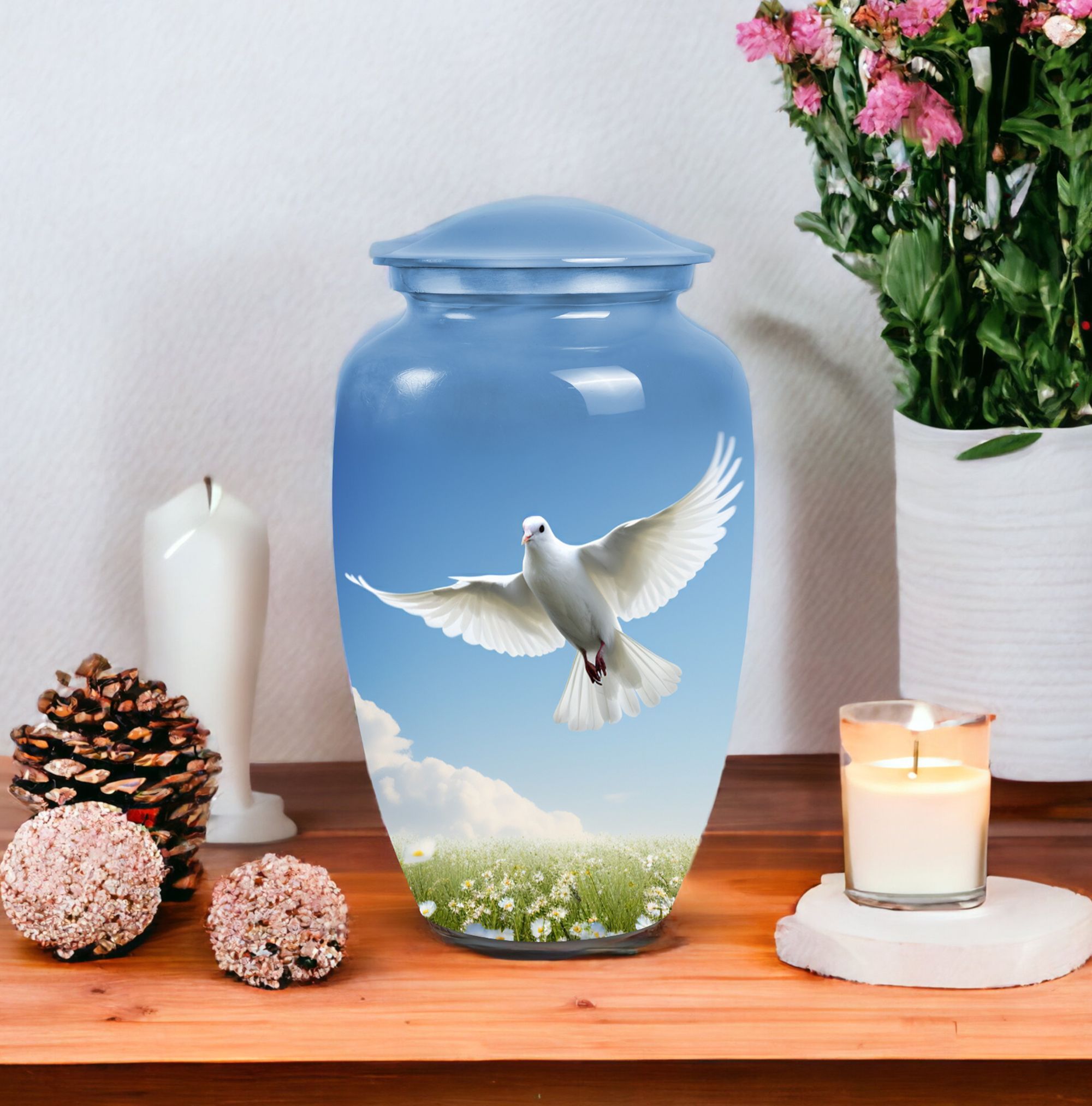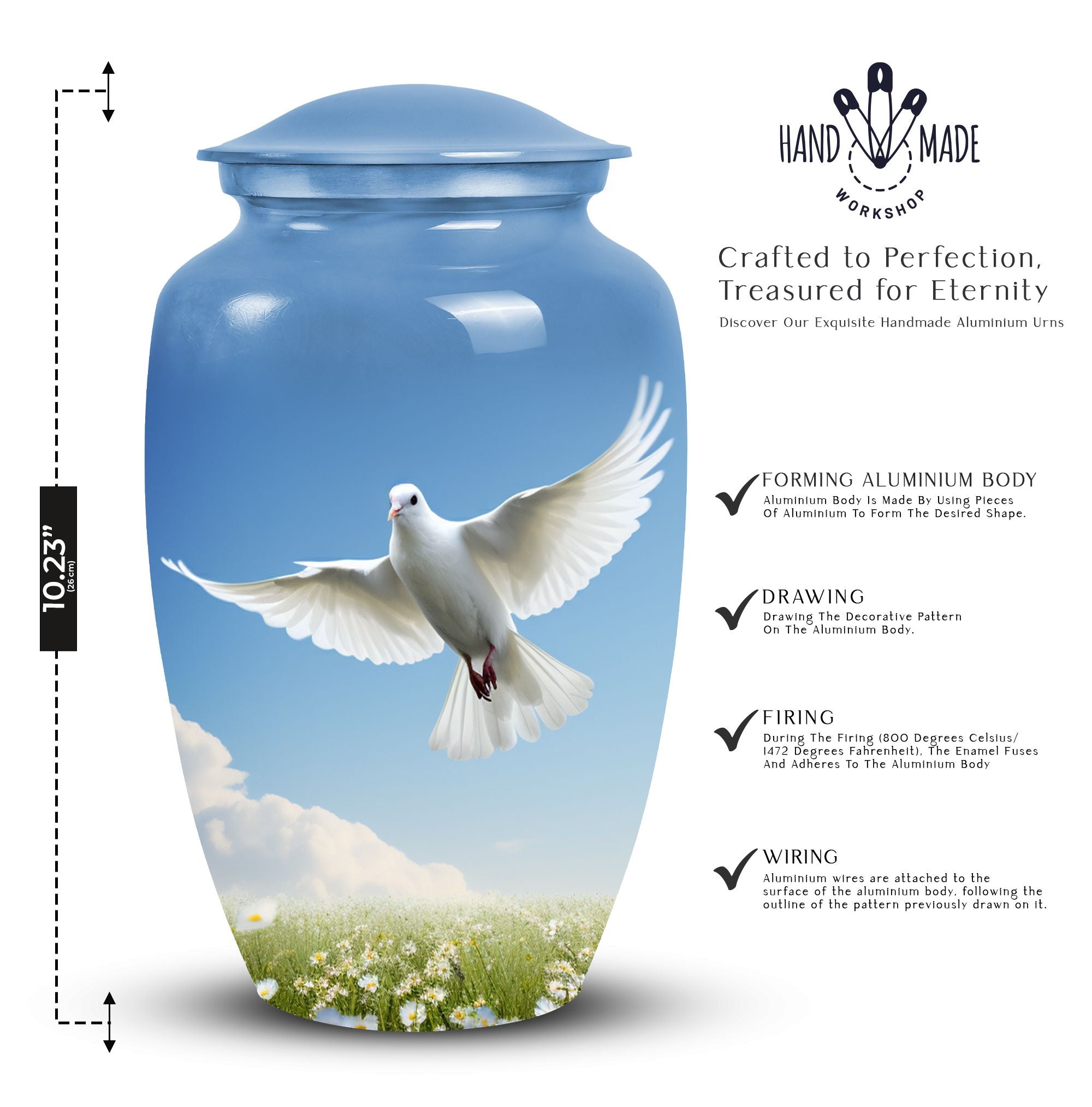 Find solace in the beauty and elegance of our large 'Dove Urns for Ashes'. Crafted with care and precision from high-quality aluminium, these urns for ashes for adults effortlessly blend the grace of traditional 'Classic Urn' design with the strength and durability of modern materials. Measuring a stately 10 inches in height with a capacity of 200 cubic inches, our cremation urn ensures a respectful and dignified home for your loved one's ashes. The urn is also lightweight, at just 3.3 pounds, and comes with a velvet pouch for secure containment of ashes. For a meaningful touch, these urns allow for customization, providing an opportunity to personalize your urn with engraved names. Whether you're looking for burial urns for adults, an urn container or custom cremation urns, these 'Dove Urns for Ashes' offer a memorable nod to your loved one. They also make thoughtful, compassionate gifts, perfect for remembrance and reflection.