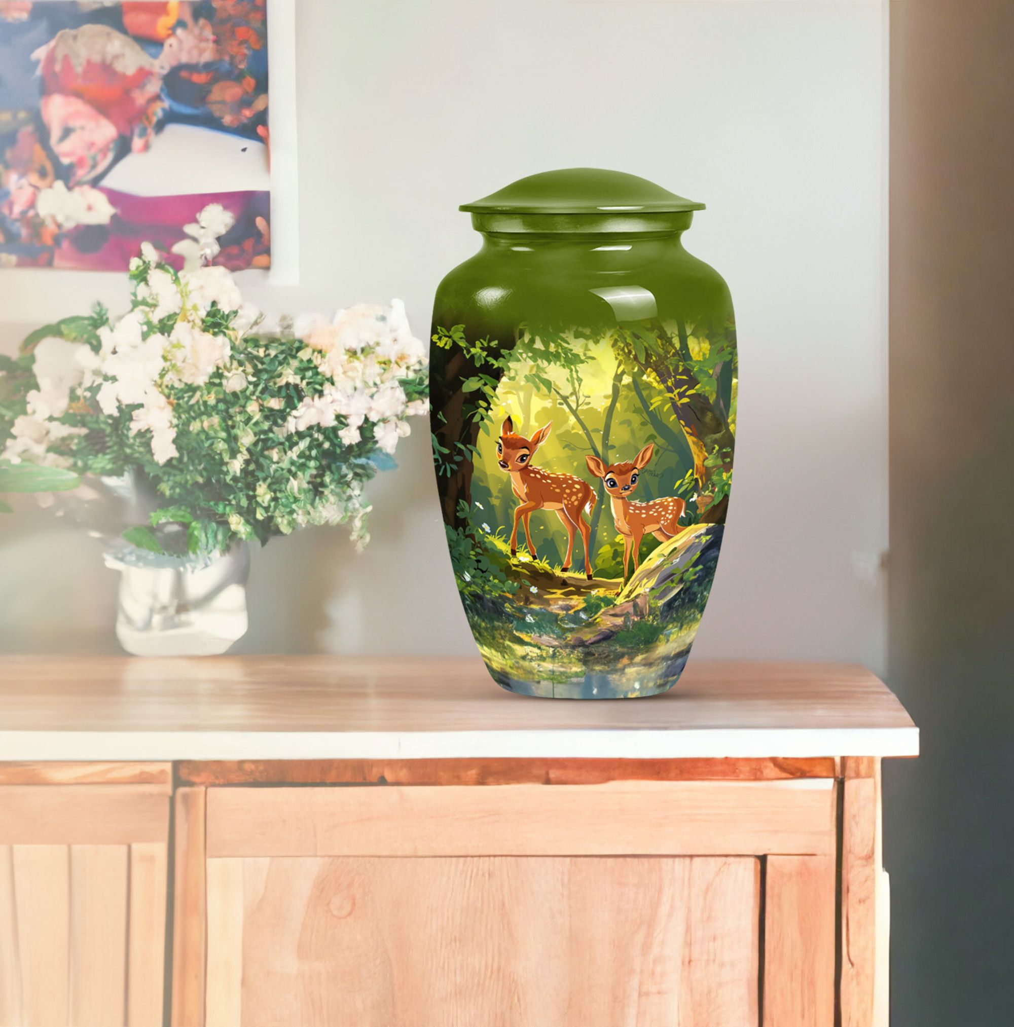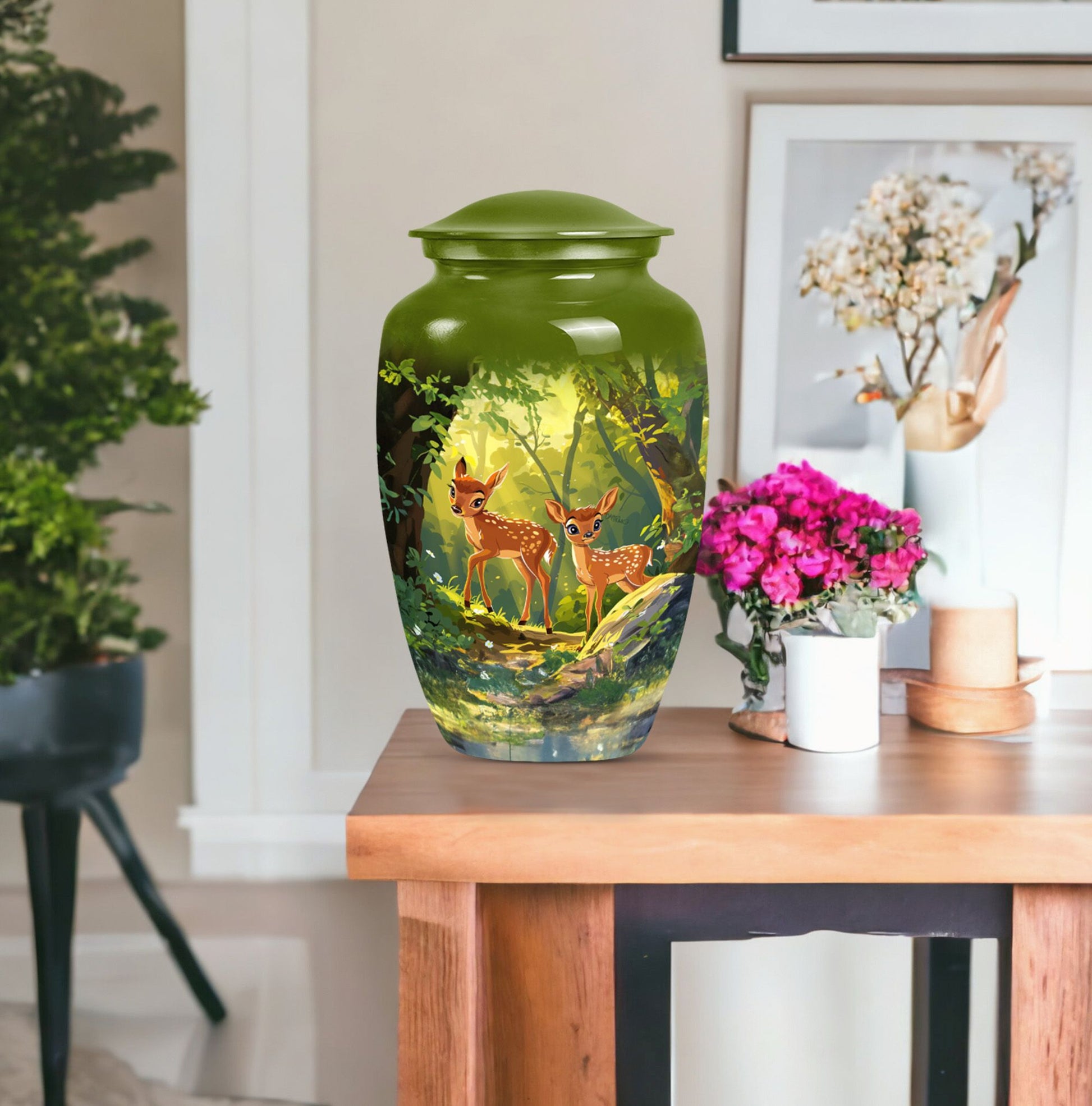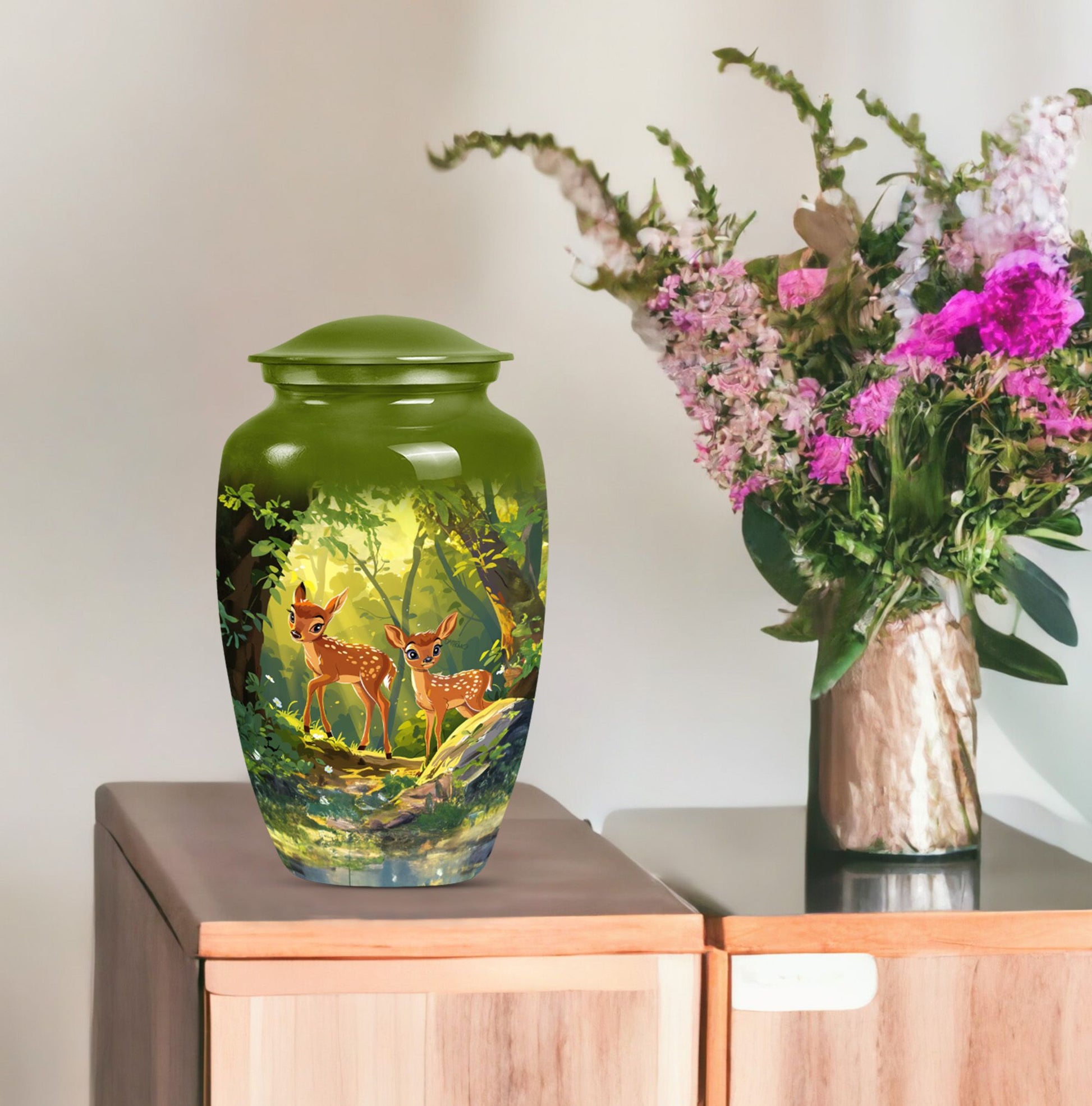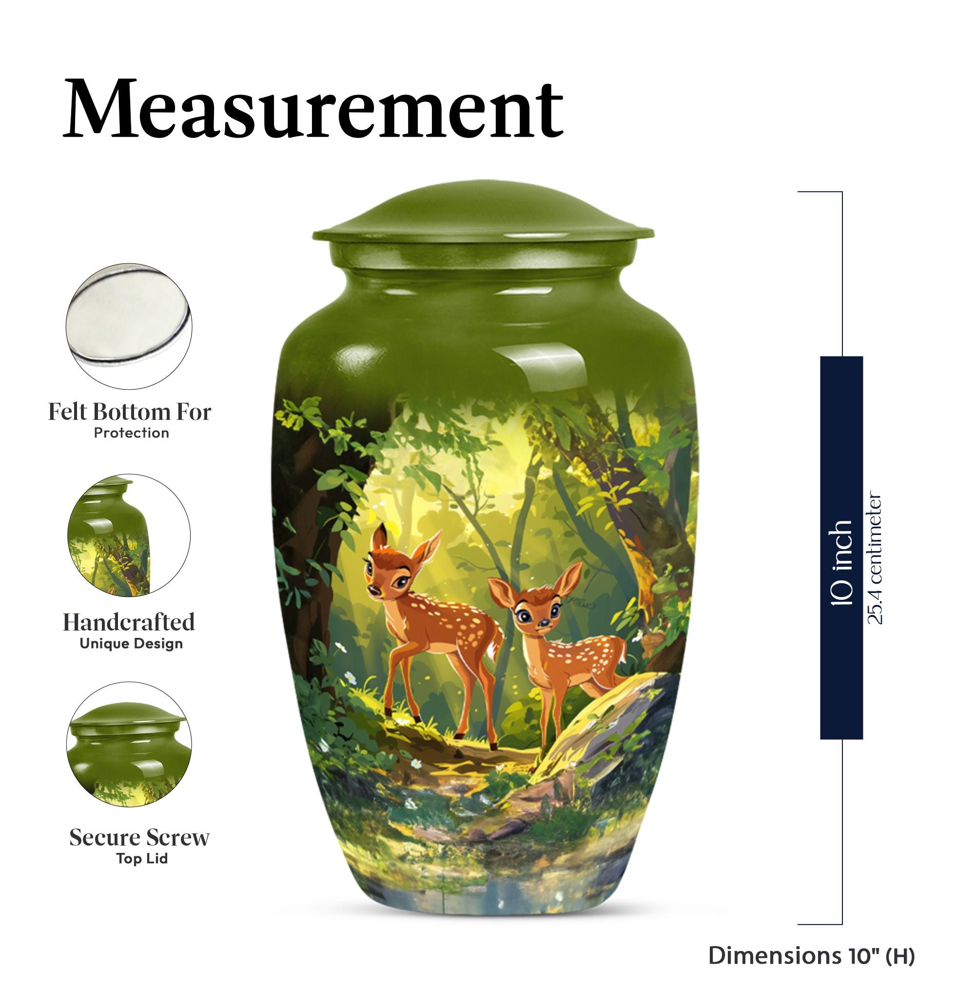 This distinctive 10-inch Deer Urn is not your run-of-the-mill cremation urn. An emblem of grace and majesty, this urn for ashes is thoughtfully curated with an uncommon Gramophone theme, adding a unique touch to a memorial ceremony. Made from high-quality Aluminium, it offers sturdiness and longevity, weighing around 3.3 pounds with the capacity to hold up to 200 cubic inches of ashes. This large urn carries an air of dignity and respect, ideal for a reverent remembrance of an adult male. Further, it presents the option for personalization through engraved names, effortlessly making it a unique memorial artifact. Your dear remains thoughtfully contained within, accompanied by a velvet pouch included in the package. Noteworthy for its classic design, it resonates with both adults and seniors looking for a 'deer Urn' or 'funeral ashes urns.' If you're seeking 'Large Cremation Urns for Men' or a uniquely themed 'metal urn for ashes adult male', this masterpiece is a perfect choice.