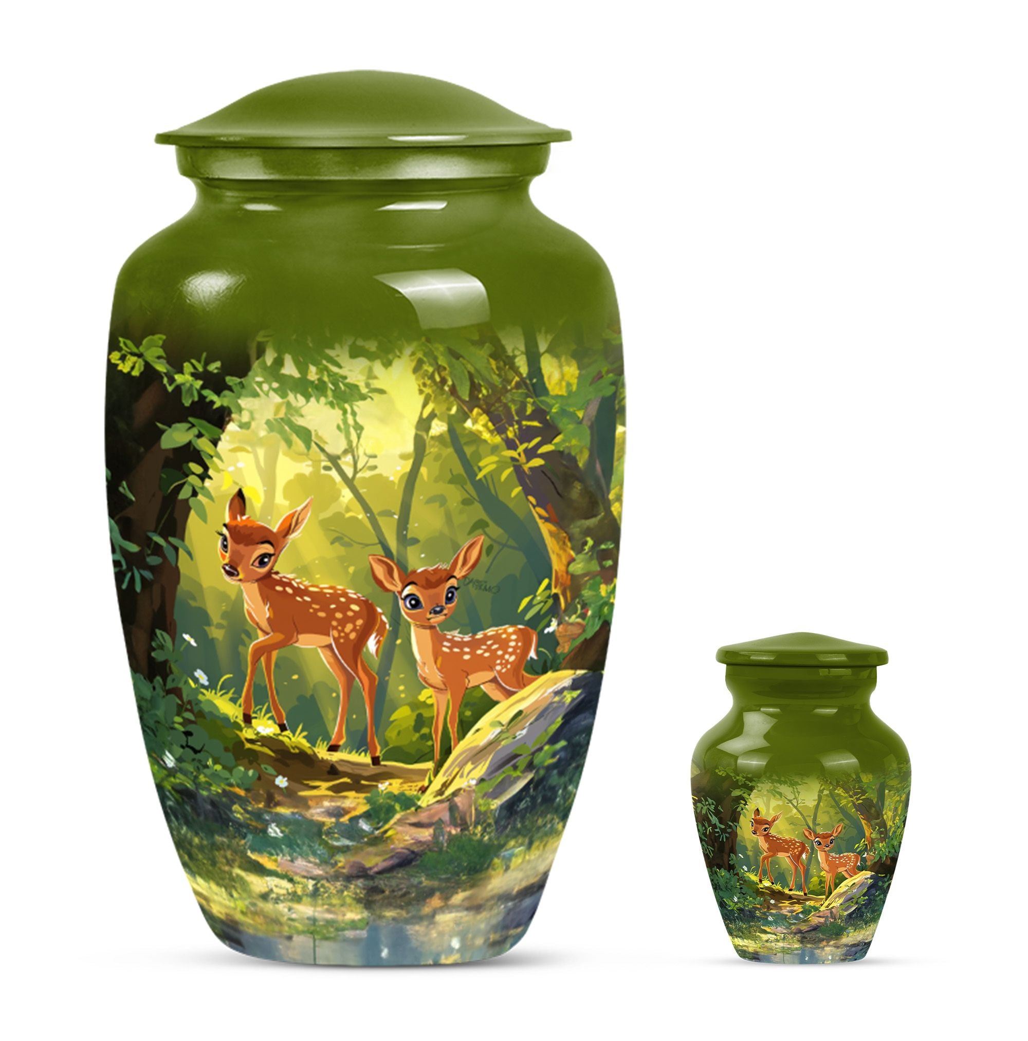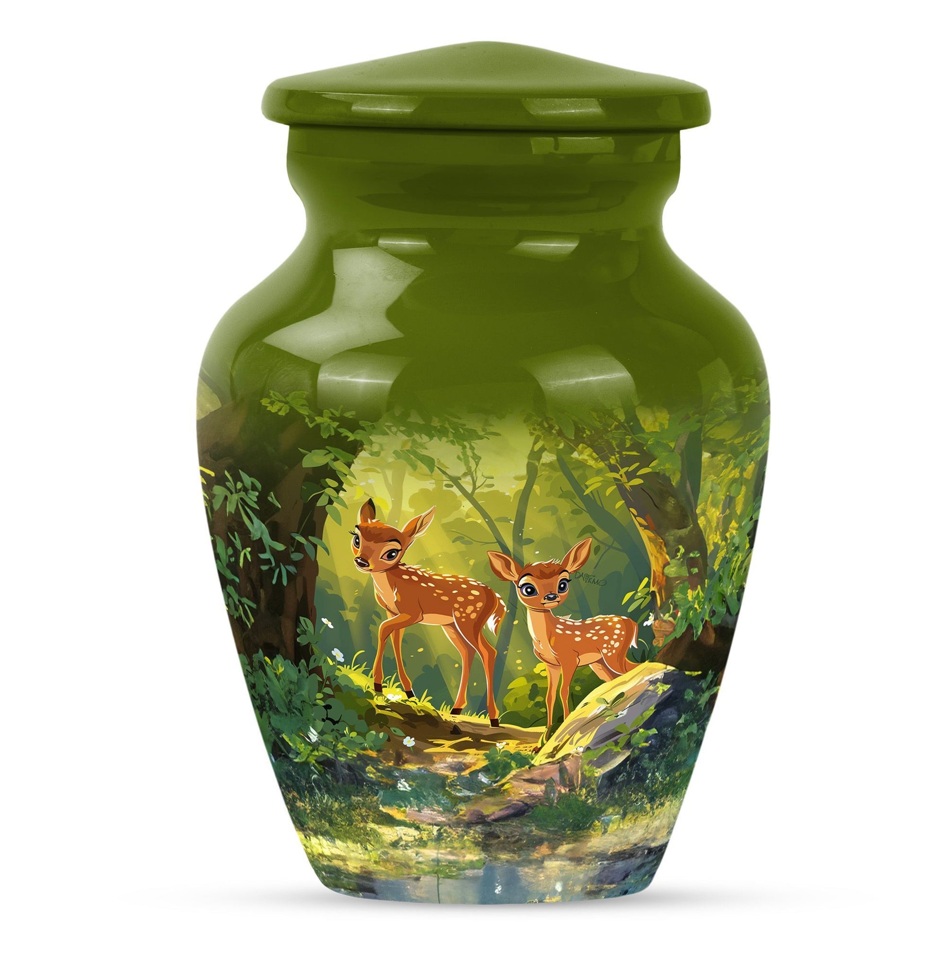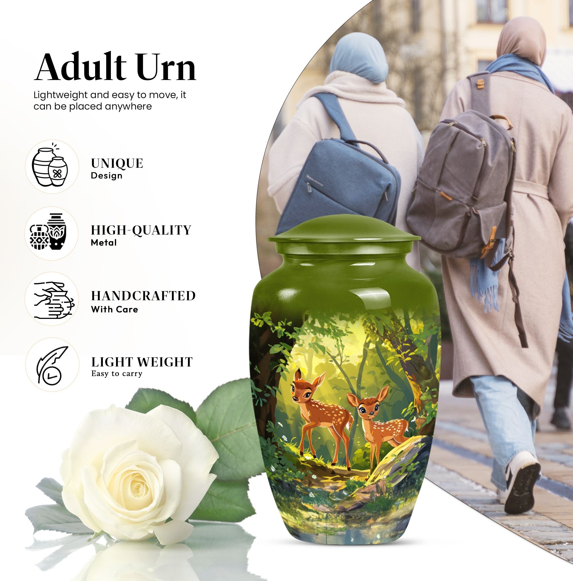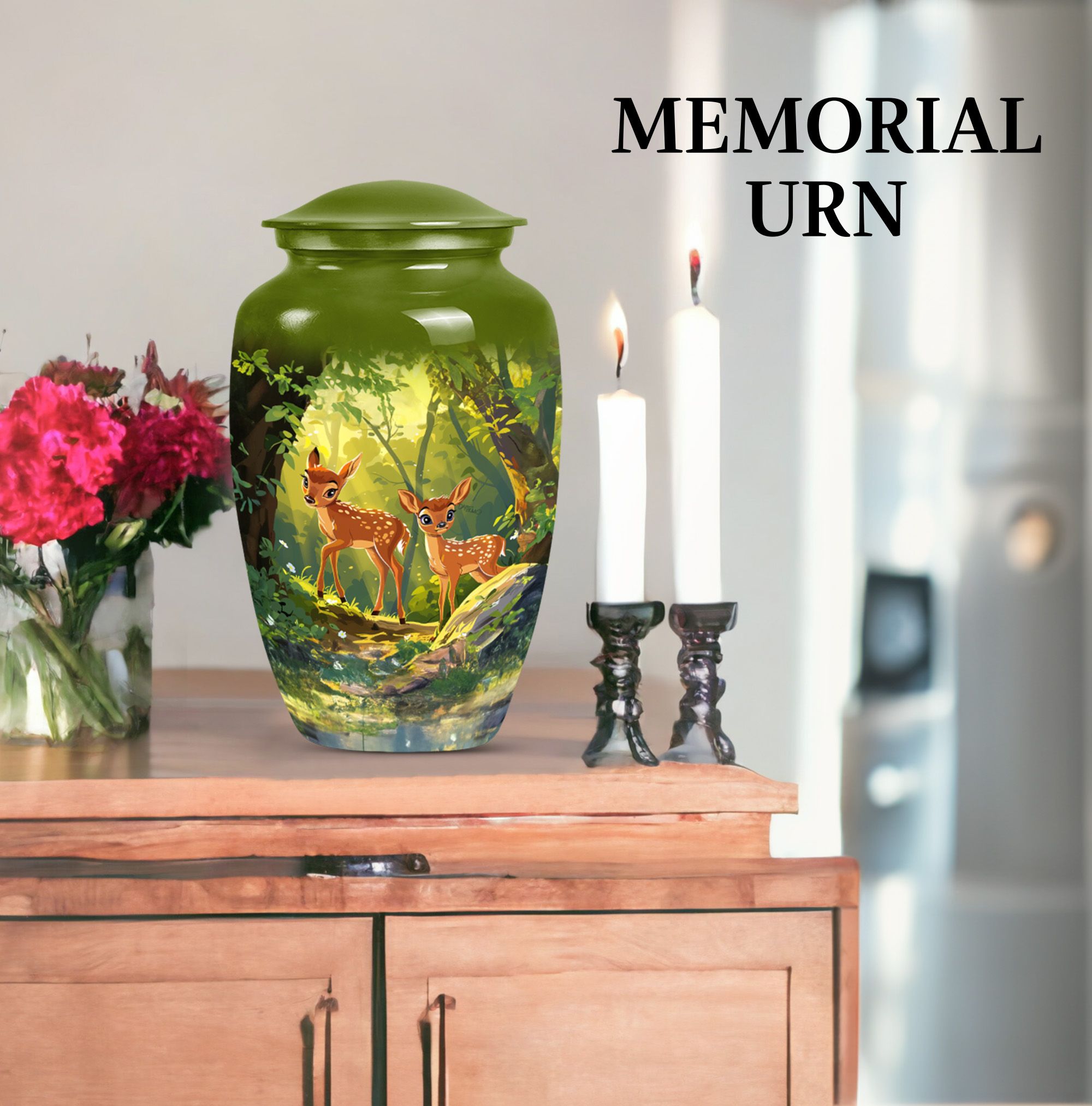 This distinctive 10-inch Deer Urn is not your run-of-the-mill cremation urn. An emblem of grace and majesty, this urn for ashes is thoughtfully curated with an uncommon Gramophone theme, adding a unique touch to a memorial ceremony. Made from high-quality Aluminium, it offers sturdiness and longevity, weighing around 3.3 pounds with the capacity to hold up to 200 cubic inches of ashes. This large urn carries an air of dignity and respect, ideal for a reverent remembrance of an adult male. Further, it presents the option for personalization through engraved names, effortlessly making it a unique memorial artifact. Your dear remains thoughtfully contained within, accompanied by a velvet pouch included in the package. Noteworthy for its classic design, it resonates with both adults and seniors looking for a 'deer Urn' or 'funeral ashes urns.' If you're seeking 'Large Cremation Urns for Men' or a uniquely themed 'metal urn for ashes adult male', this masterpiece is a perfect choice.