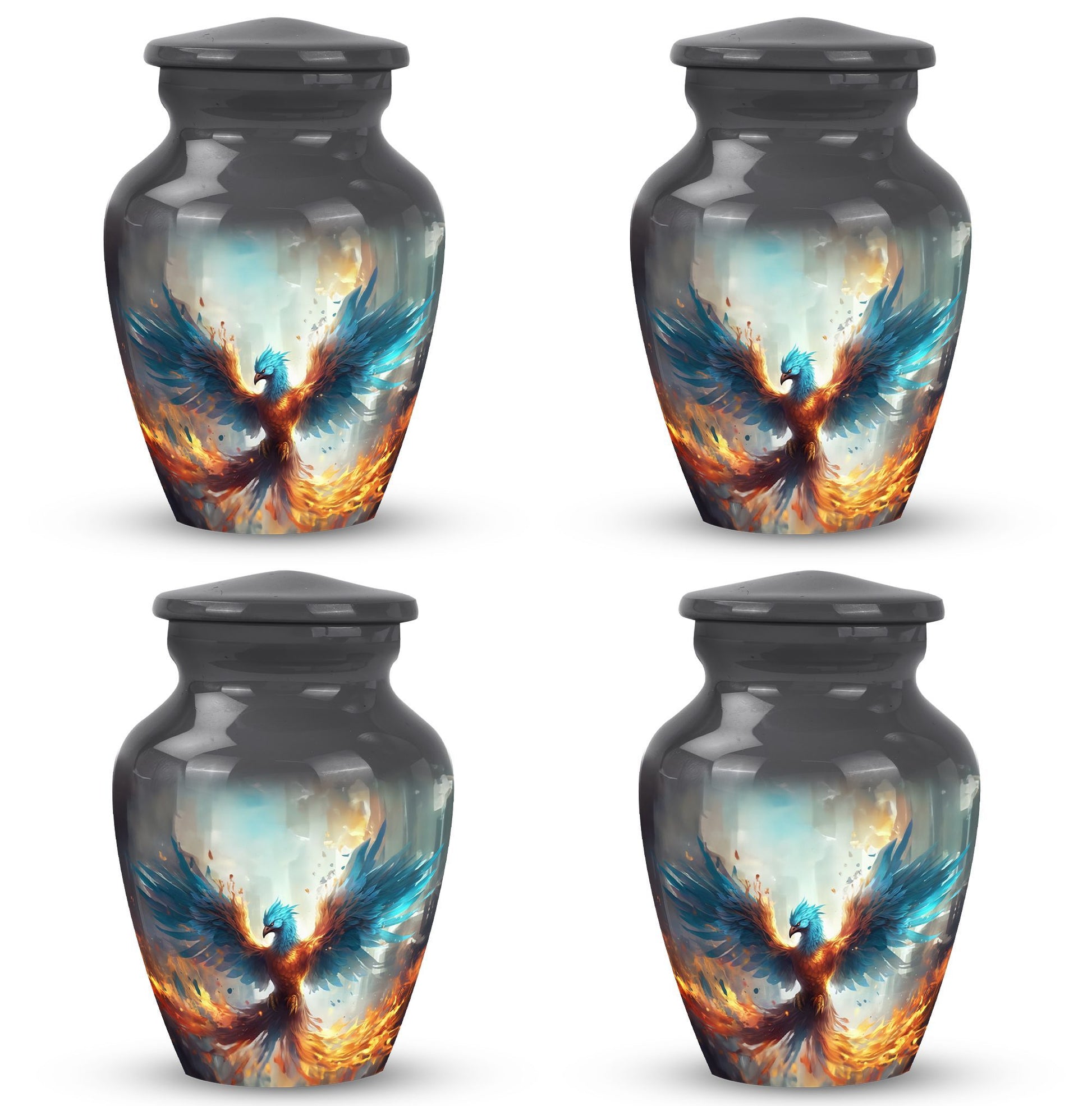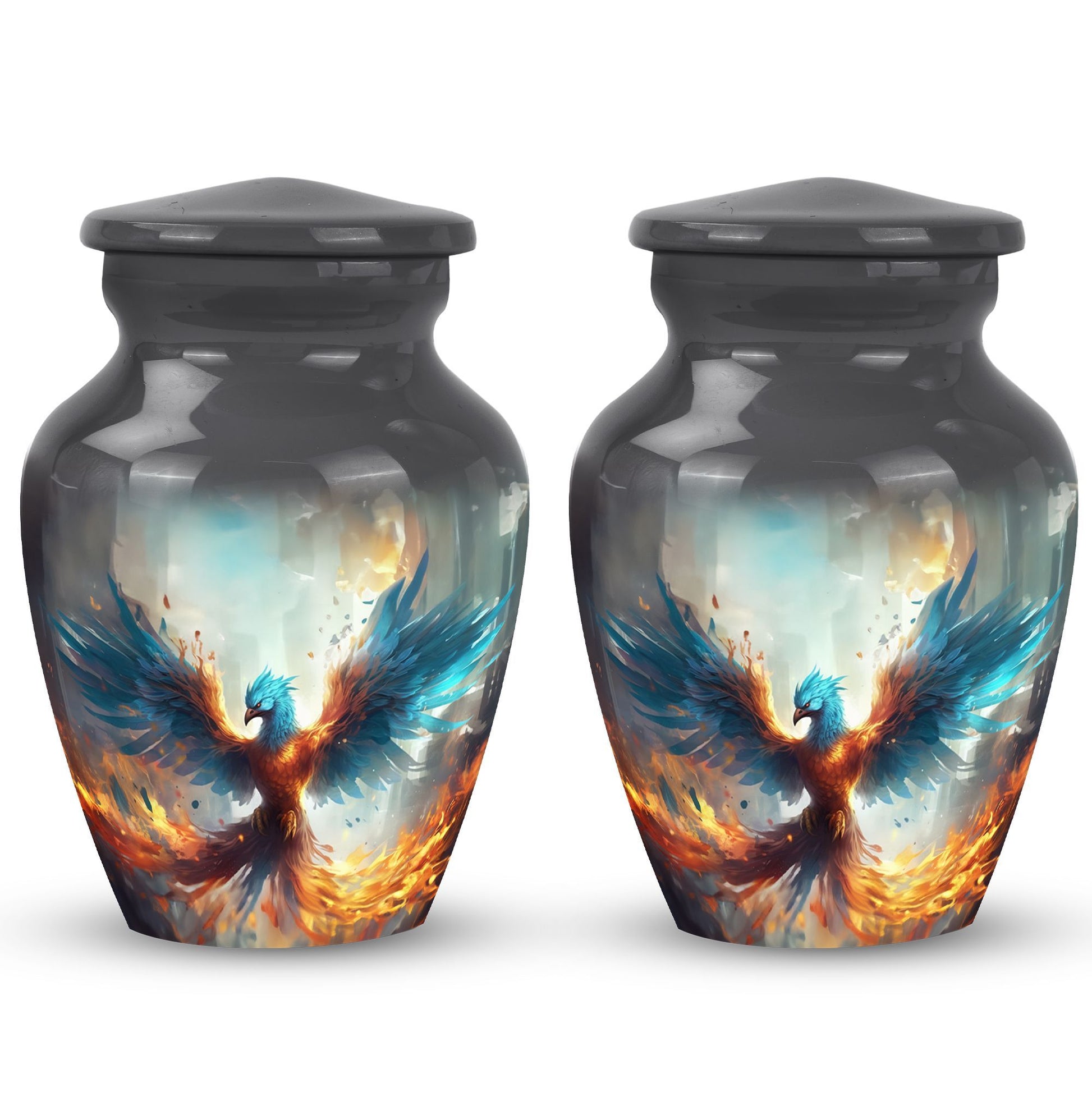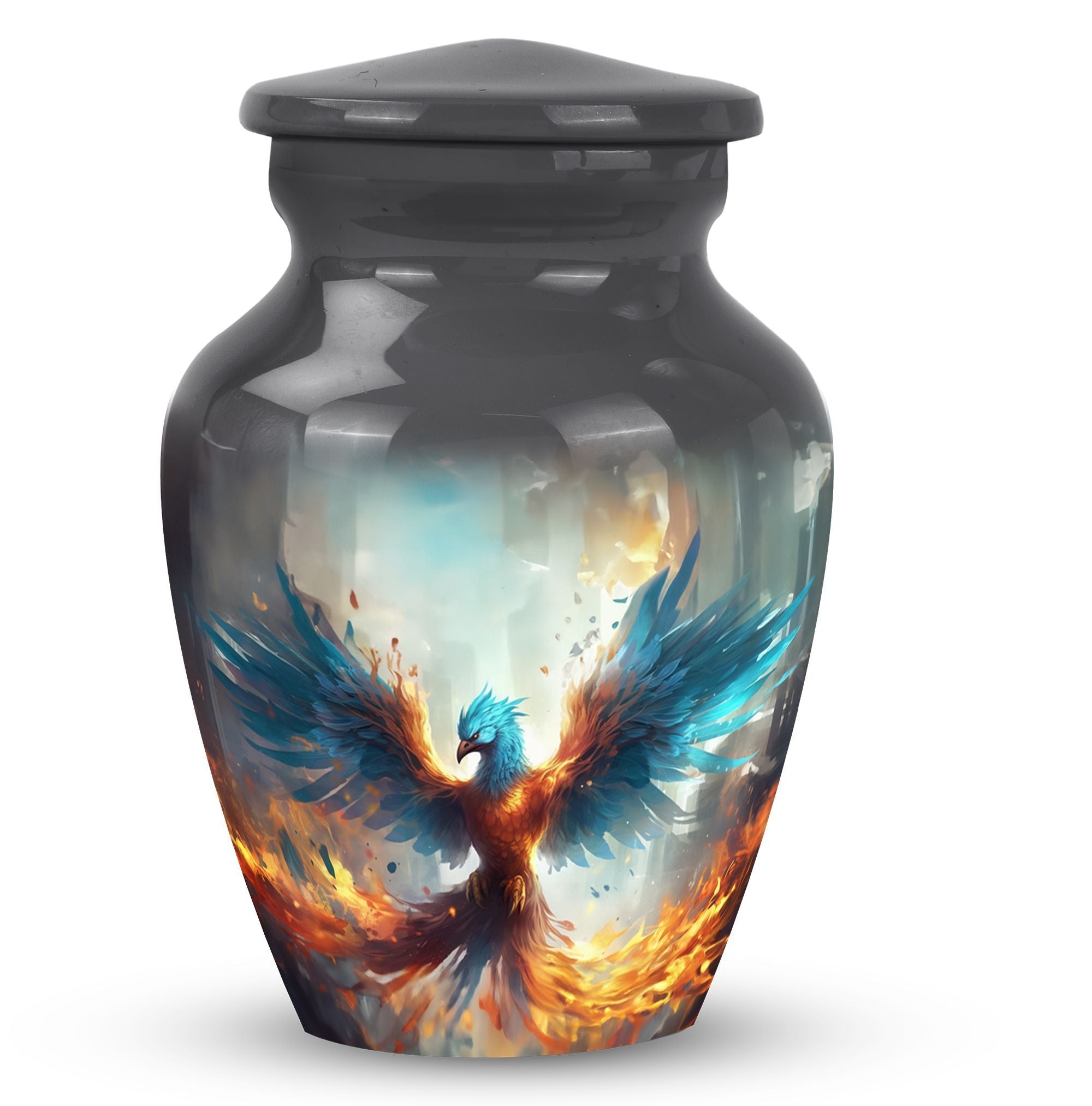 Honor your dearly departed with our Blue Phoenix Urn. This adult urn, meticulously crafted from high-quality aluminium, presents a classic urn profile that stands 10 inches in height and weighs a solid 3.3 pounds. Its 200 cubic-inch capacity can accommodate the ashes from adult humans. As caring as your emotions, it includes a velvet pouch designed to delicately contain the ashes. Most importantly, it allows you to personalize the tribute with engraved names, helping you to hold on to the memories of your lost loved ones. This sizeable urn, suitable for in-home display or burial, ensures a meaningful and respectful resting place. Distinctly a part of the larger urn spectrum, it uniquely addresses the needs of those looking for human cremation urns, modern urns for human ashes, an ashes holder, or burial urns for ashes. Our Blue Phoenix Urn helps to keep them everclose to your heart, in the most respectful and elegant way.