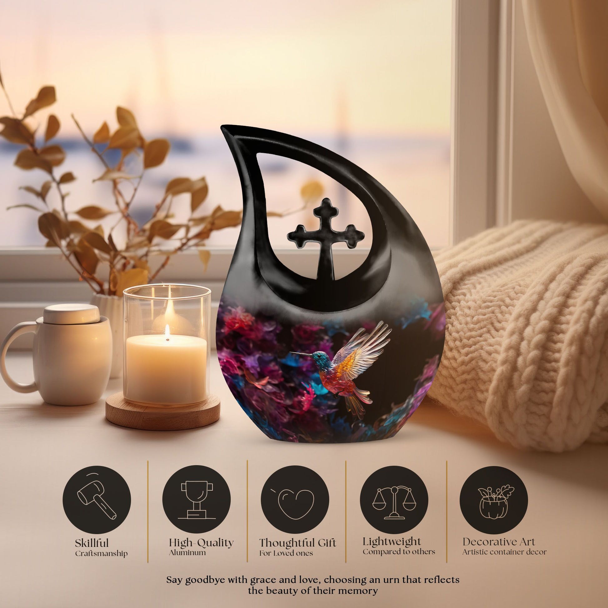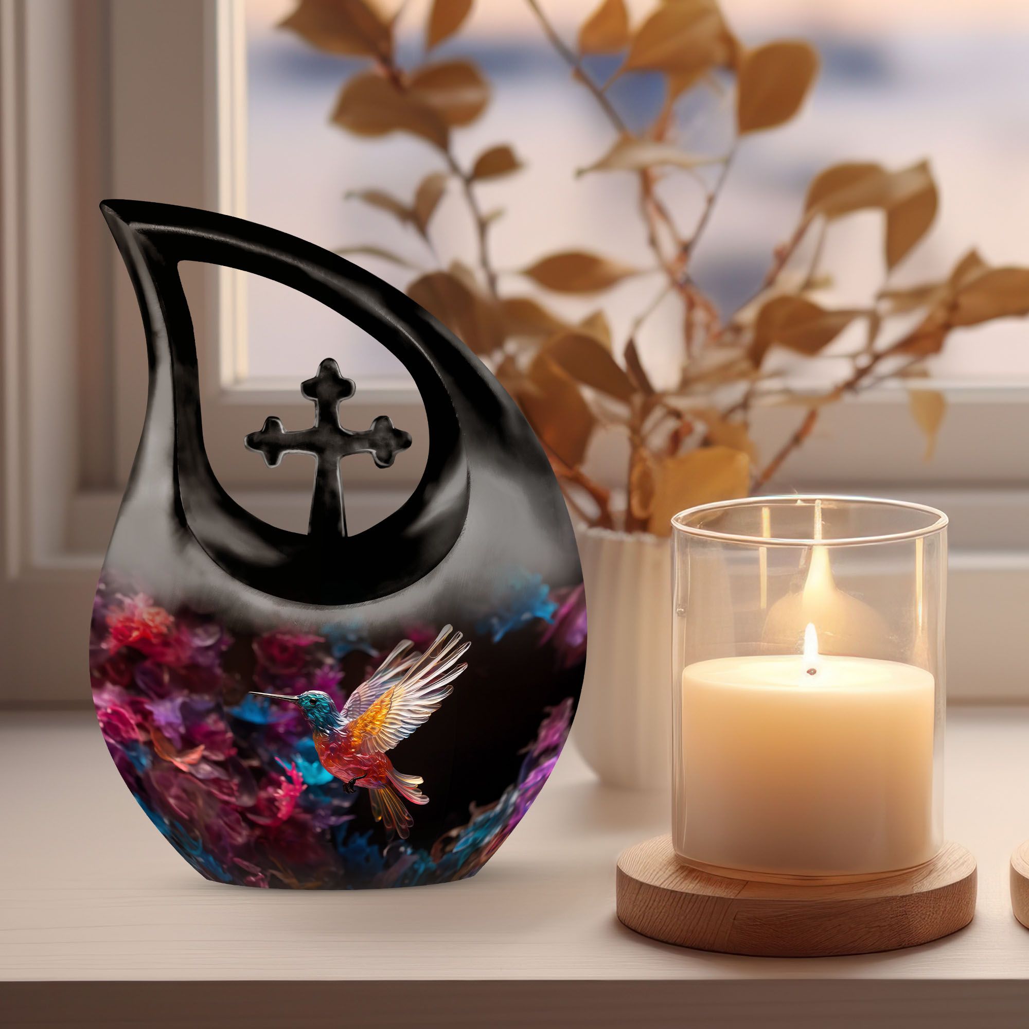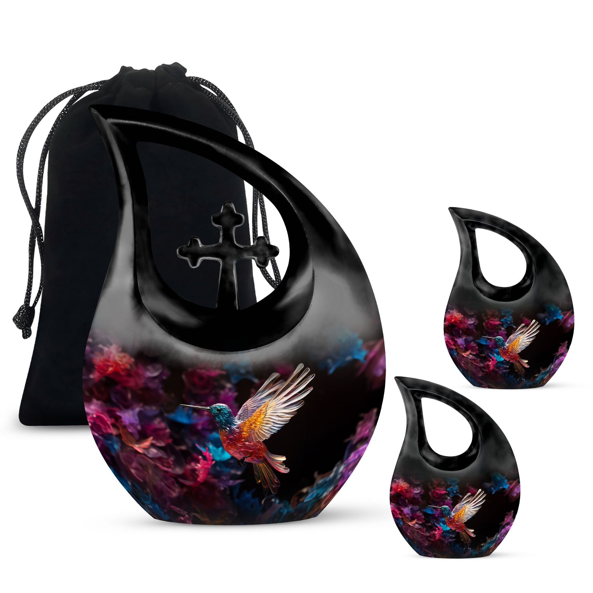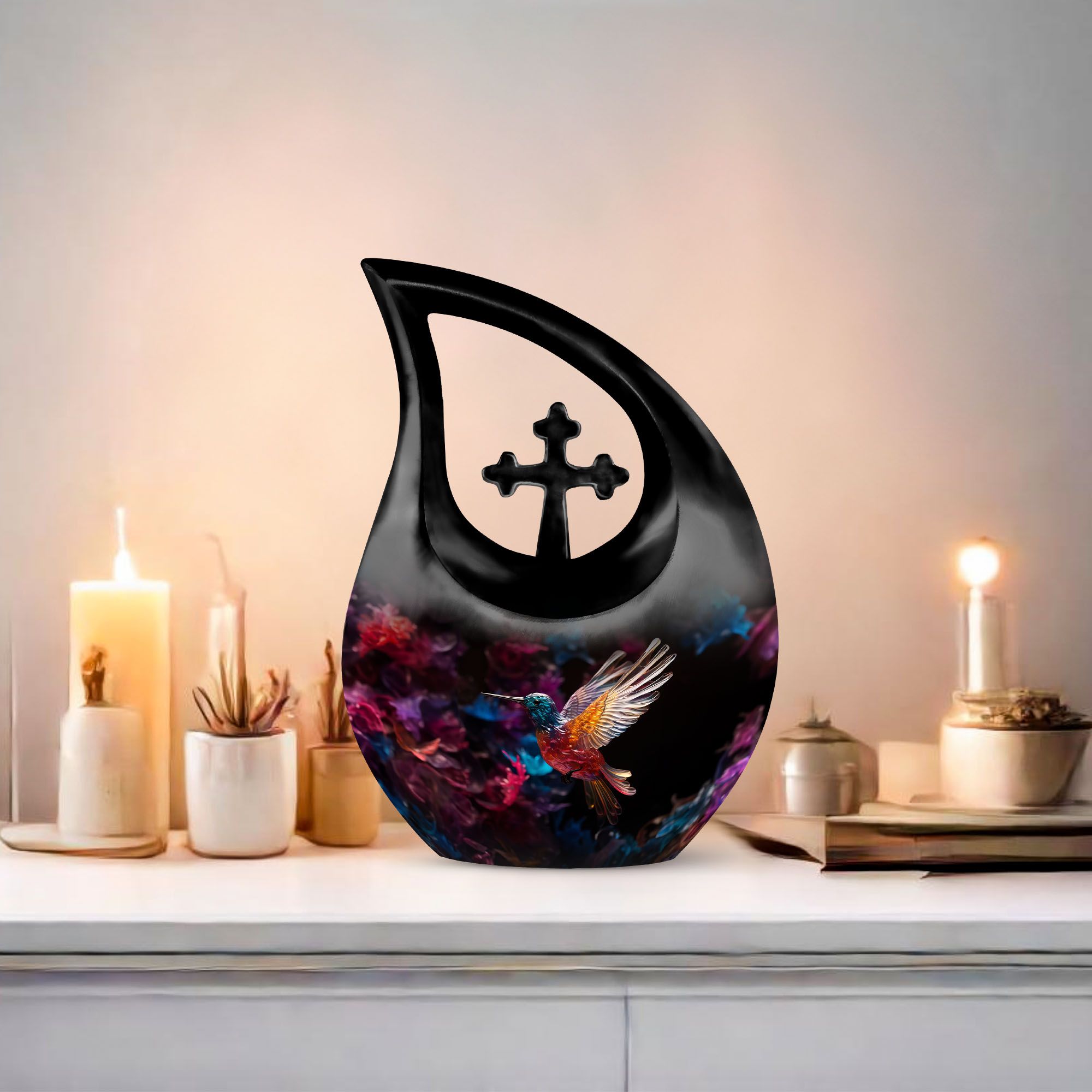 Expertly handcrafted from premium aluminium, this large decorative urn features a shimmering crystal-inlaid hummingbird surrounded by soft floral accents on a serene background. The polished finish enhances its brilliance, while the secure screw-top lid ensures ashes are safely preserved. Designed for both men and women, it’s a timeless choice among urns for cremation ashes female and urns for adult female mom collections.