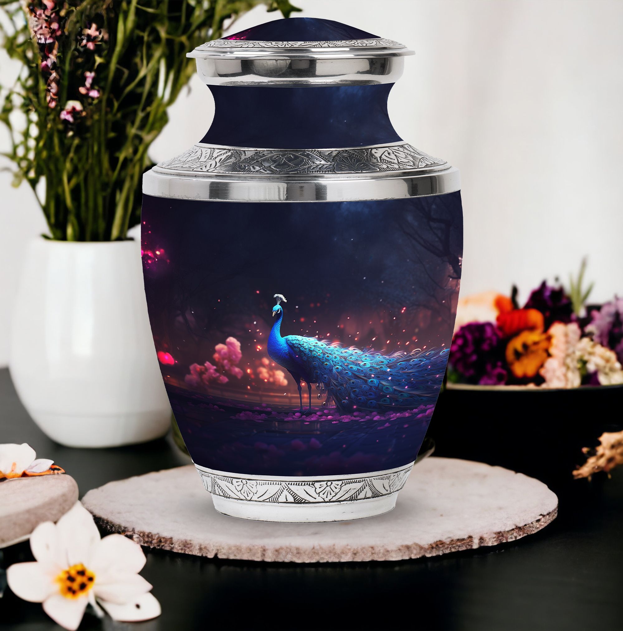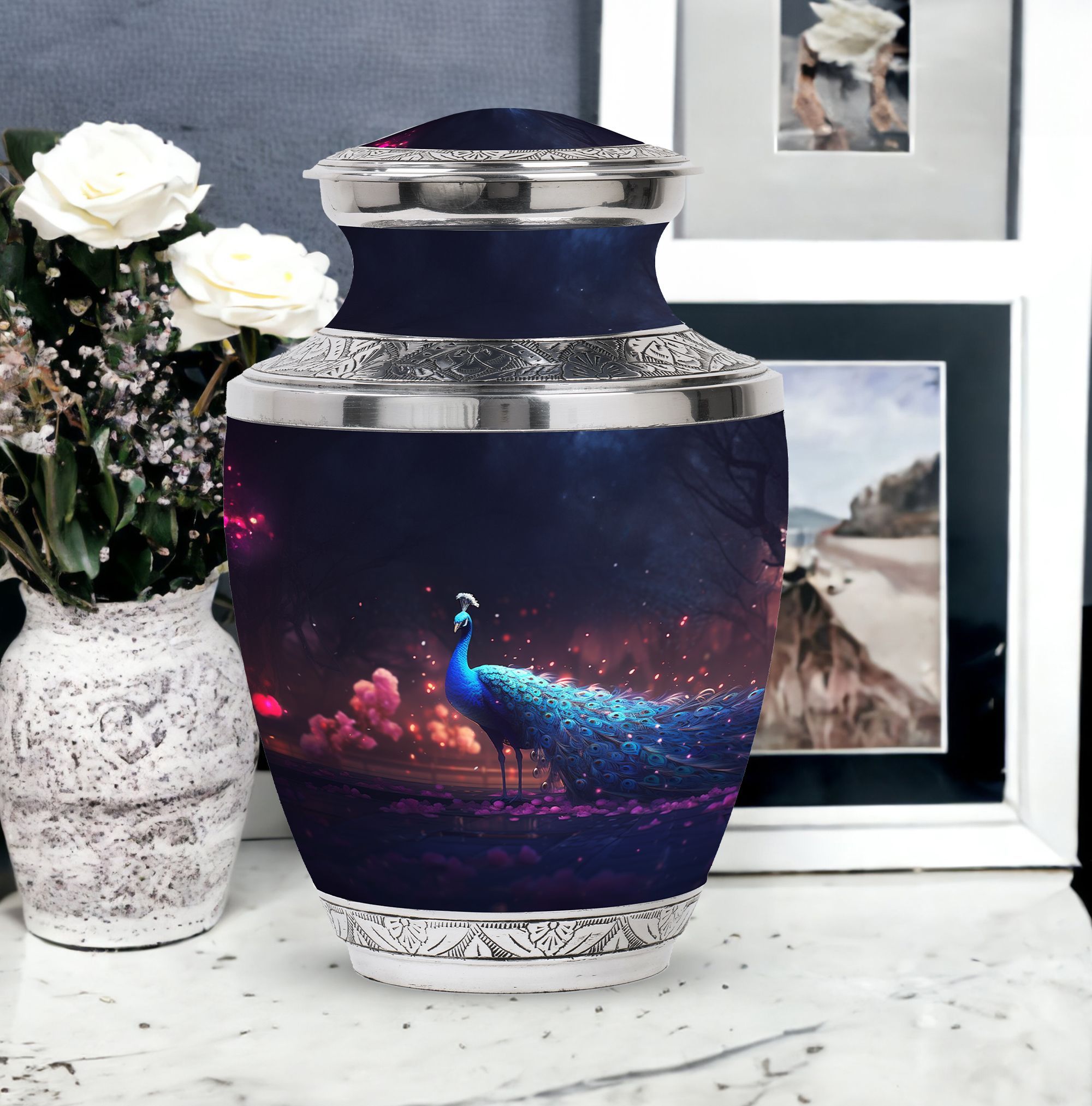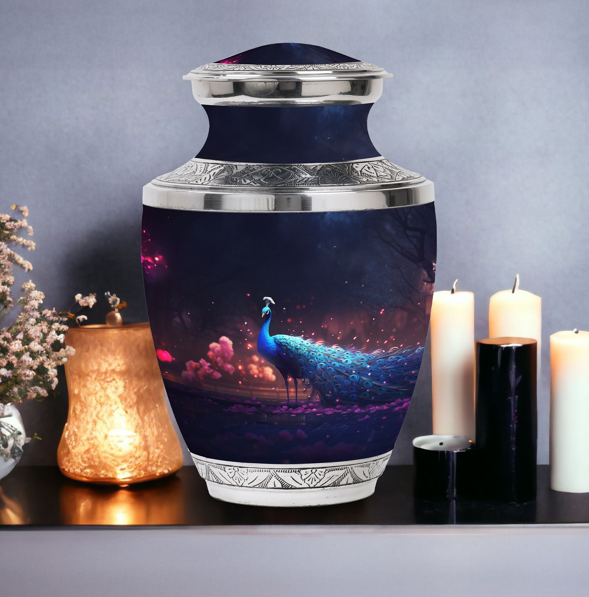Reside in the realm of comfort and peace with this exquisite Peacock Cremation Urn, a splendid item within our collection of Large Urns. Specifically designed as per the conventional 'Classic Urn' style, this Urn is a versatile choice for paying homage to your loved ones. Manufactured from resilient aluminium, it stands 10 inches in height and can contain up to 200 cubic inches of ashes. Weighing 3.3 pounds, it is compact enough to grace any corner of your home with enduring presence. With your purchase, you also receive a beautifully designed velvet pouch, providing protective containment for the ashes. To further add a personal touch, we offer the option for you to personalize this Cremation Urn with engraved names, making it a cherished keepsake in memory of your dearly departed. The brilliance of this Urn aligns perfectly with keywords such as 'Metal Urns for Human Ashes', 'Custom Cremation Urns', 'Funeral Ashes Containers', and 'Modern Urns for Ashes'.