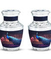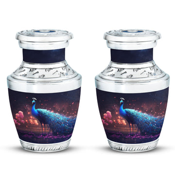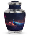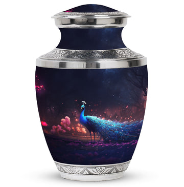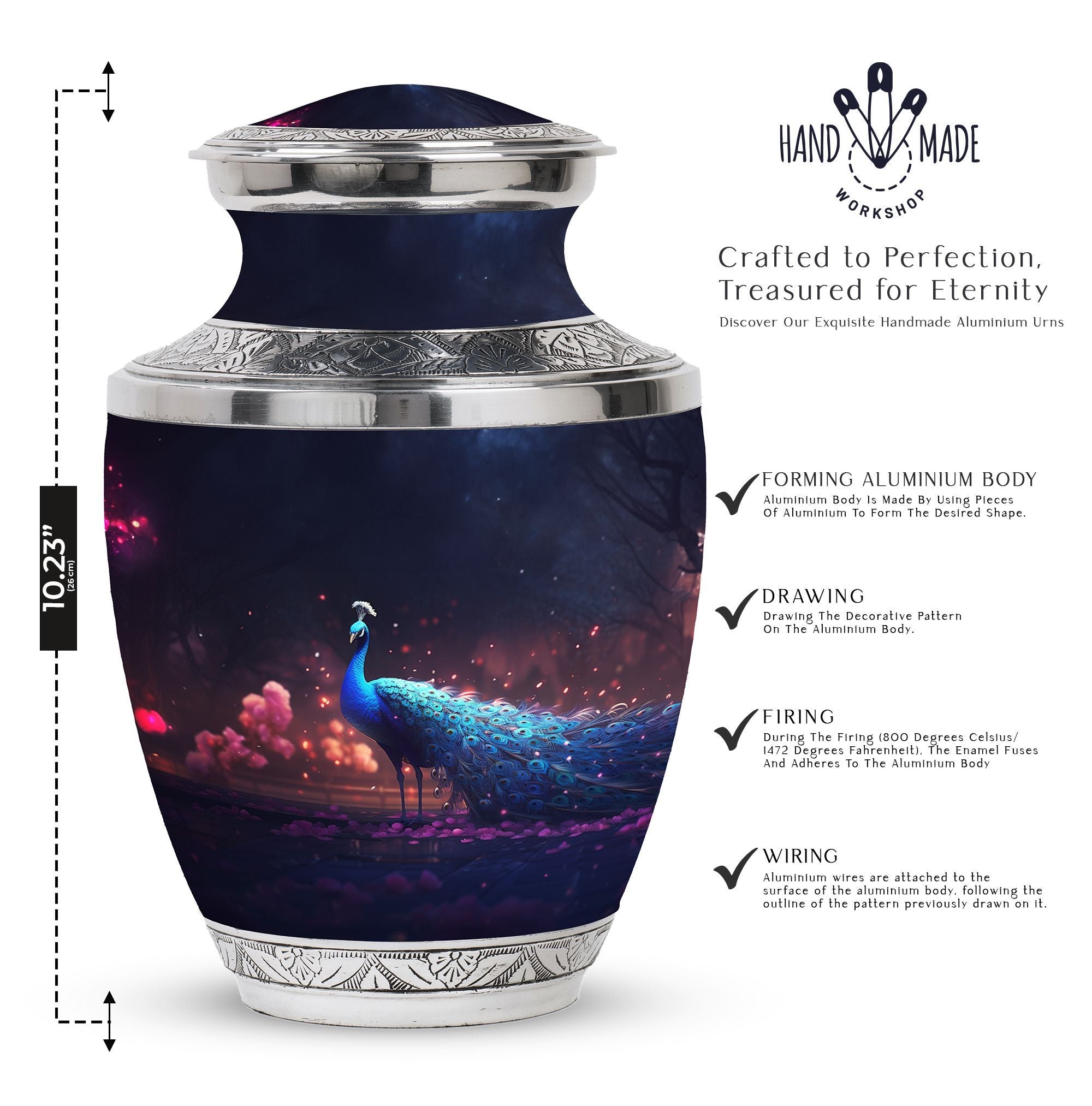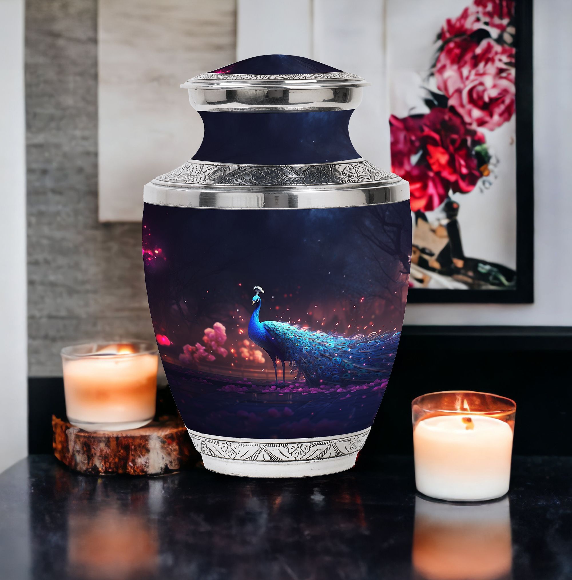 Reside in the realm of comfort and peace with this exquisite Peacock Cremation Urn, a splendid item within our collection of Large Urns. Specifically designed as per the conventional 'Classic Urn' style, this Urn is a versatile choice for paying homage to your loved ones. Manufactured from resilient aluminium, it stands 10 inches in height and can contain up to 200 cubic inches of ashes. Weighing 3.3 pounds, it is compact enough to grace any corner of your home with enduring presence. With your purchase, you also receive a beautifully designed velvet pouch, providing protective containment for the ashes. To further add a personal touch, we offer the option for you to personalize this Cremation Urn with engraved names, making it a cherished keepsake in memory of your dearly departed. The brilliance of this Urn aligns perfectly with keywords such as 'Metal Urns for Human Ashes', 'Custom Cremation Urns', 'Funeral Ashes Containers', and 'Modern Urns for Ashes'.