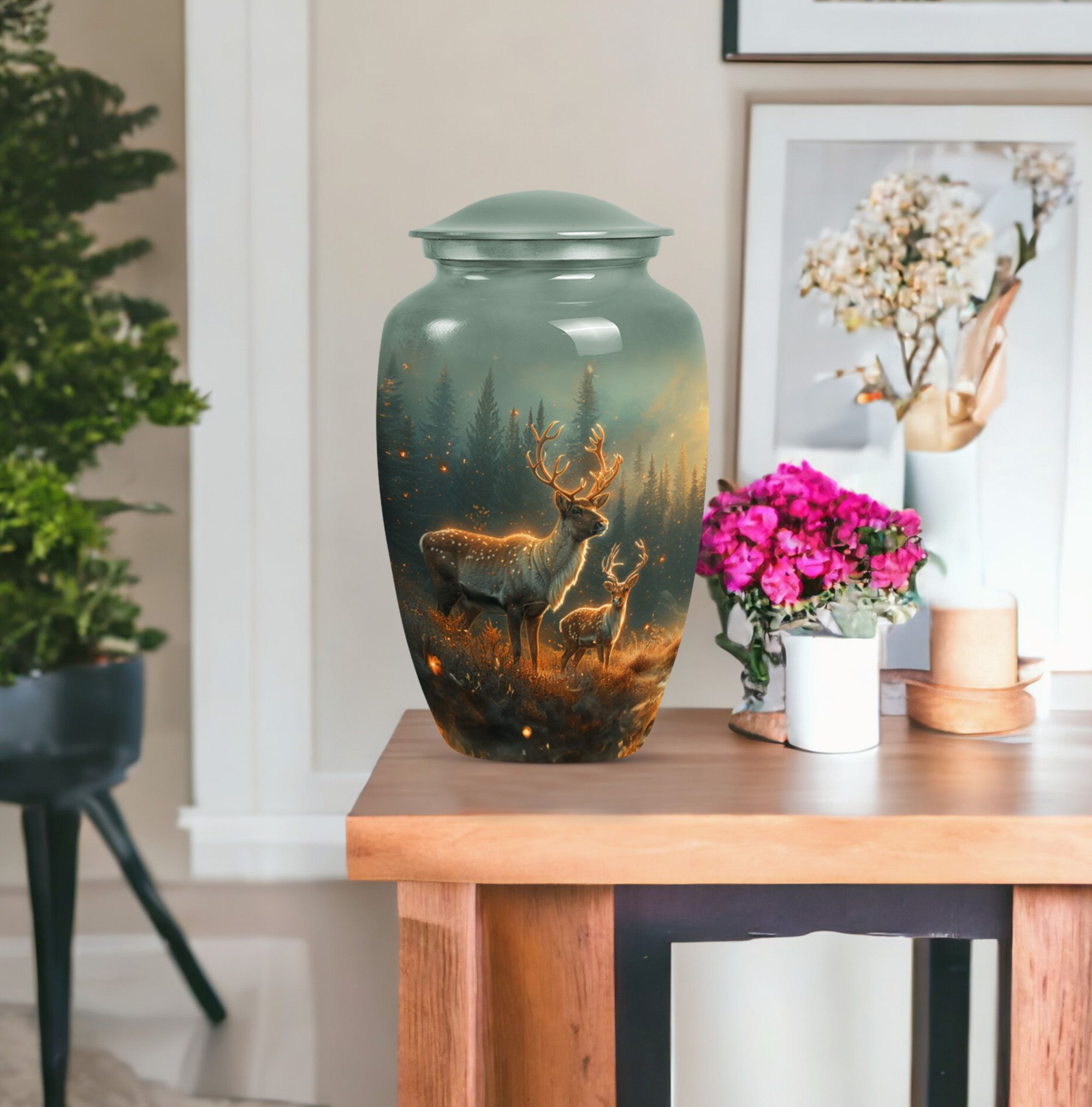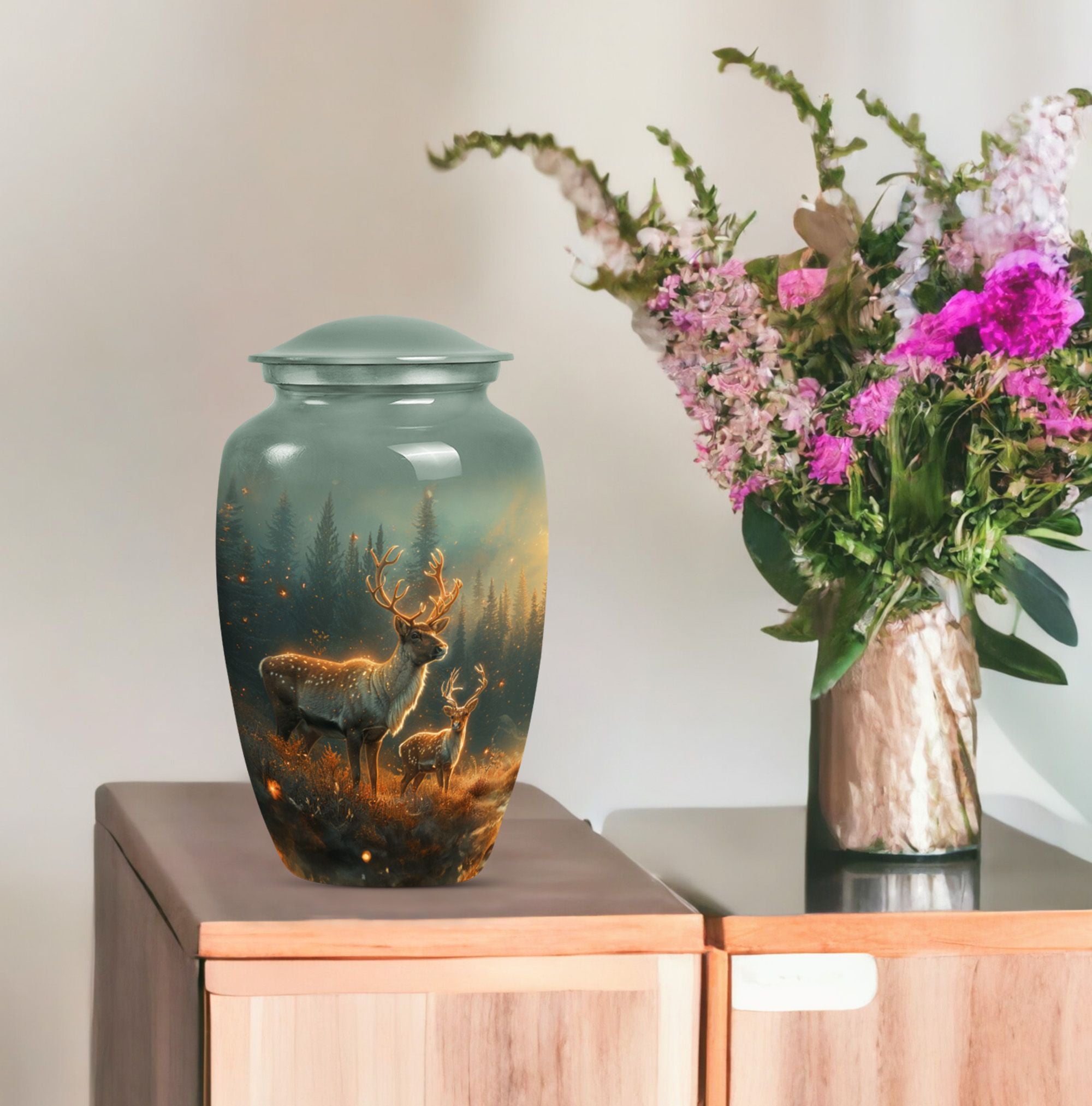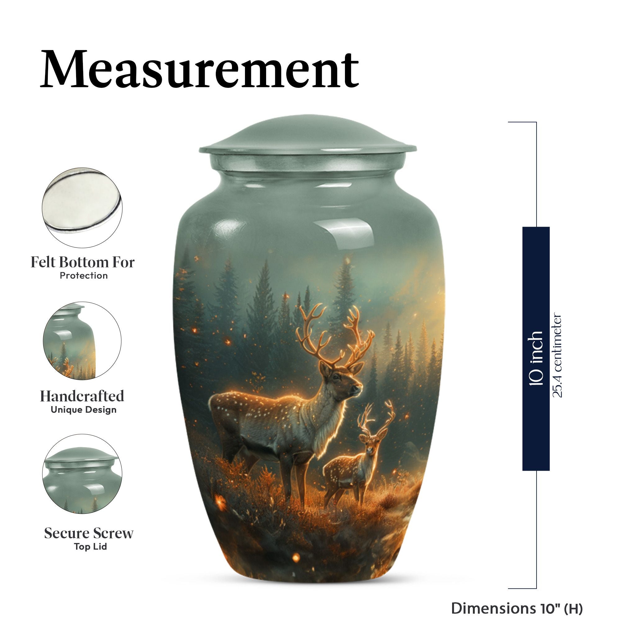 Gently honoring the memory of a loved one, our 10-inch Deer Urn stands as a classical, timeless tribute. Crafted from quality Aluminium, it bears impactful durability and a sentimental gravity of 3.3 pounds. Its design, in the theme of a captivating Gramophone, veers from the common, adding a unique tenderness to the tribute. As an adult cremation urn, its 200 cubic inches of capacity takes on a profound importance, carefully holding human ashes for an adult or a man. Further adding a personal touch, we offer the option to make it matchless with engraved names. Along with this cherished Urn, we include a velvet pouch, easing the containment of the ashes. It celebrates a life lived, making our Deer Urn a standout in burial urns and memorial urns. The Large Urn size caters to convention, rendering it suitable for human ash adult urns or cremation urn for ashes categories. Honor the unforgettable melody of a passed life with our Deer Urn.