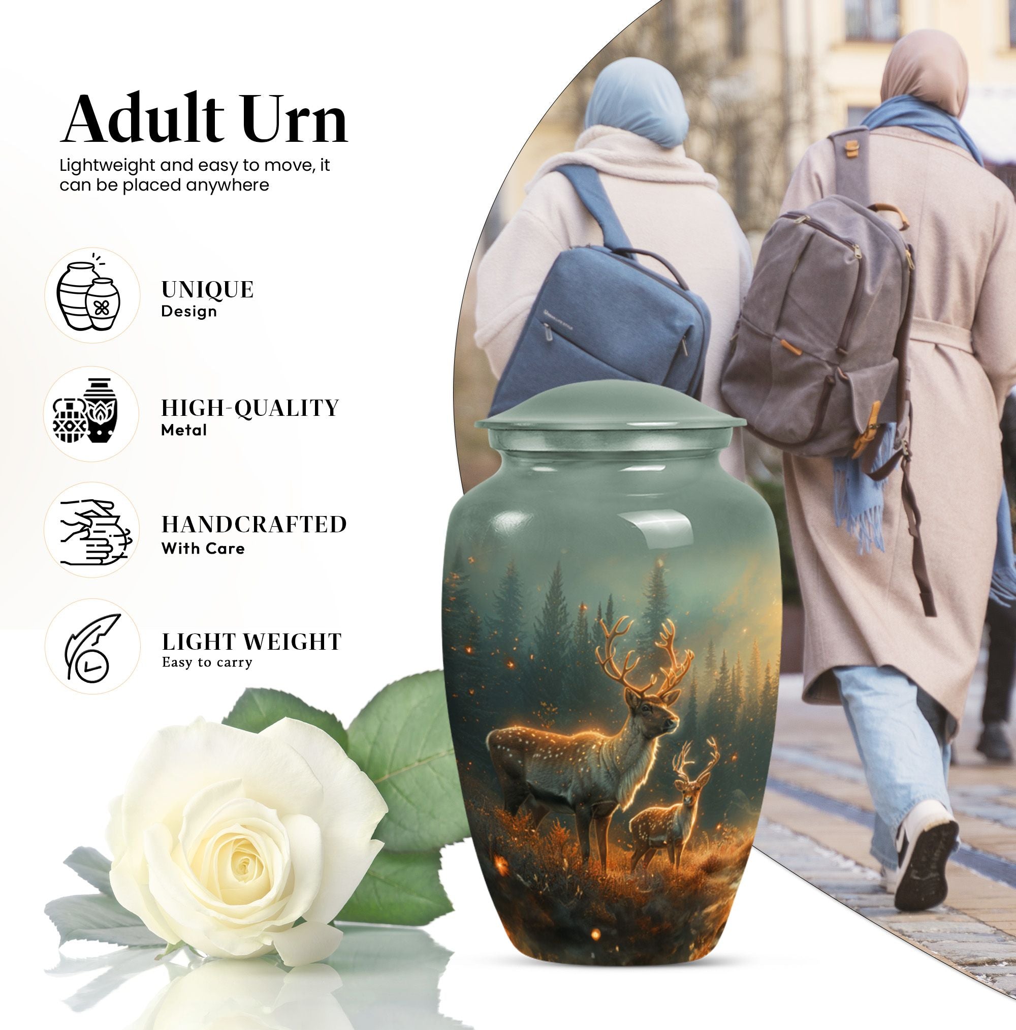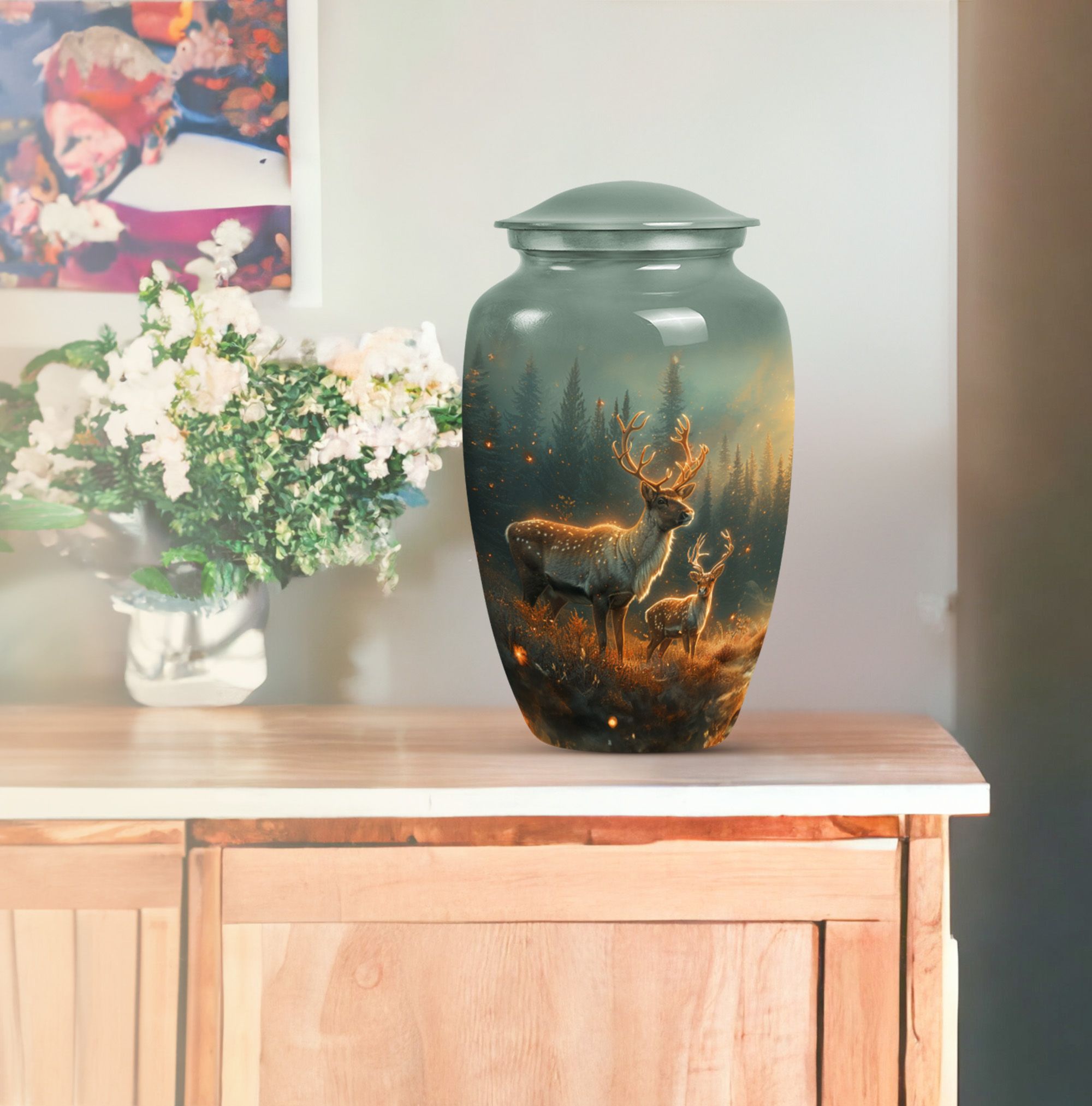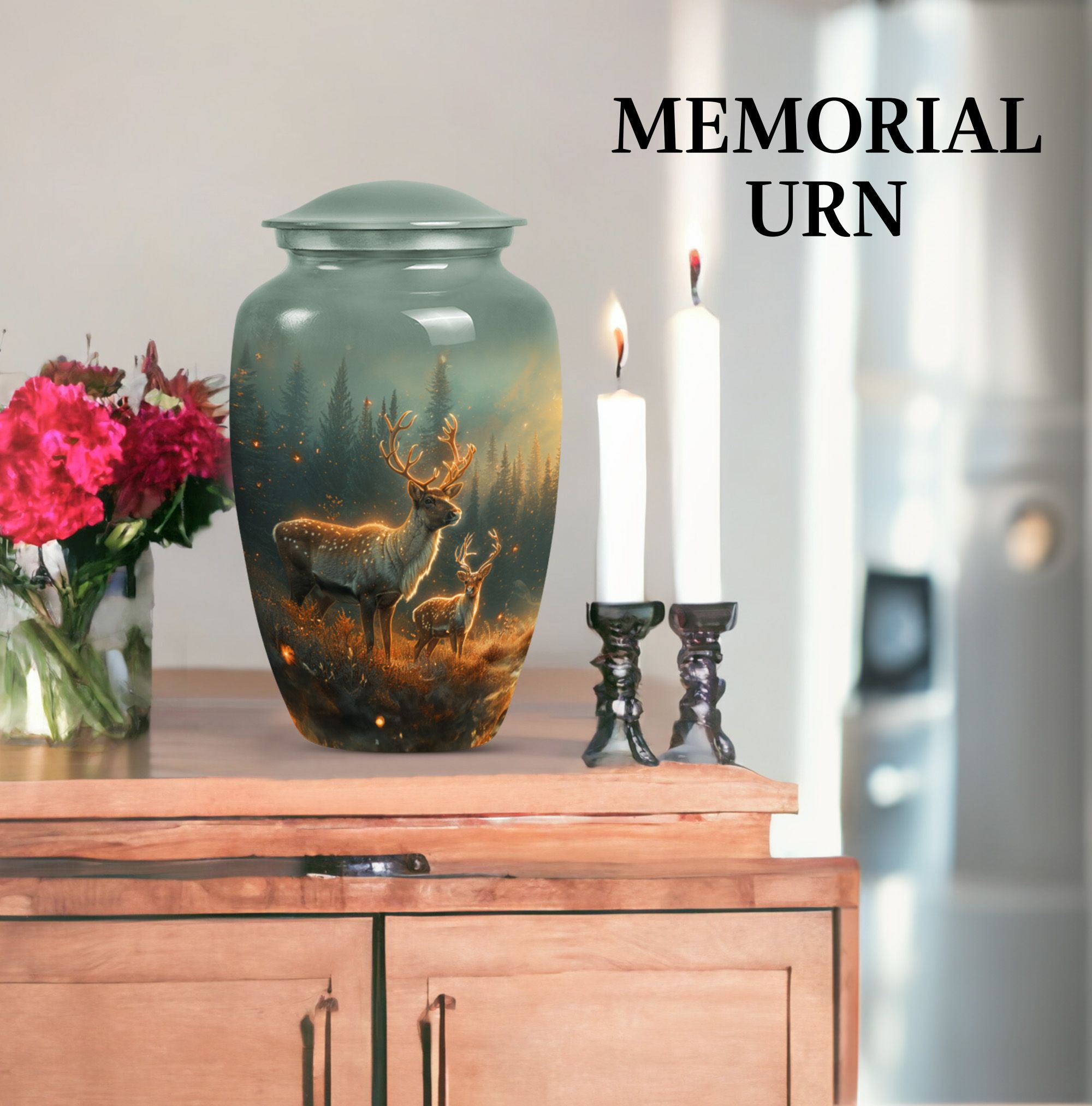 Gently honoring the memory of a loved one, our 10-inch Deer Urn stands as a classical, timeless tribute. Crafted from quality Aluminium, it bears impactful durability and a sentimental gravity of 3.3 pounds. Its design, in the theme of a captivating Gramophone, veers from the common, adding a unique tenderness to the tribute. As an adult cremation urn, its 200 cubic inches of capacity takes on a profound importance, carefully holding human ashes for an adult or a man. Further adding a personal touch, we offer the option to make it matchless with engraved names. Along with this cherished Urn, we include a velvet pouch, easing the containment of the ashes. It celebrates a life lived, making our Deer Urn a standout in burial urns and memorial urns. The Large Urn size caters to convention, rendering it suitable for human ash adult urns or cremation urn for ashes categories. Honor the unforgettable melody of a passed life with our Deer Urn.