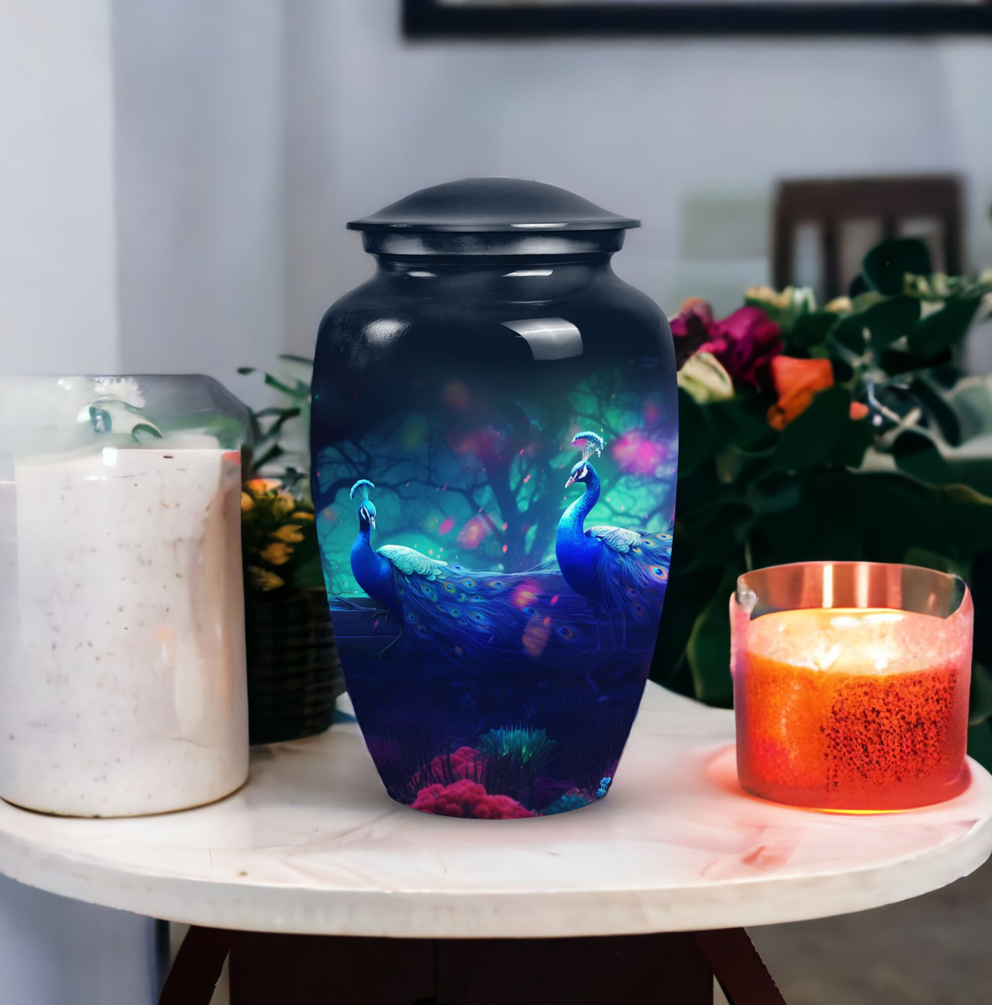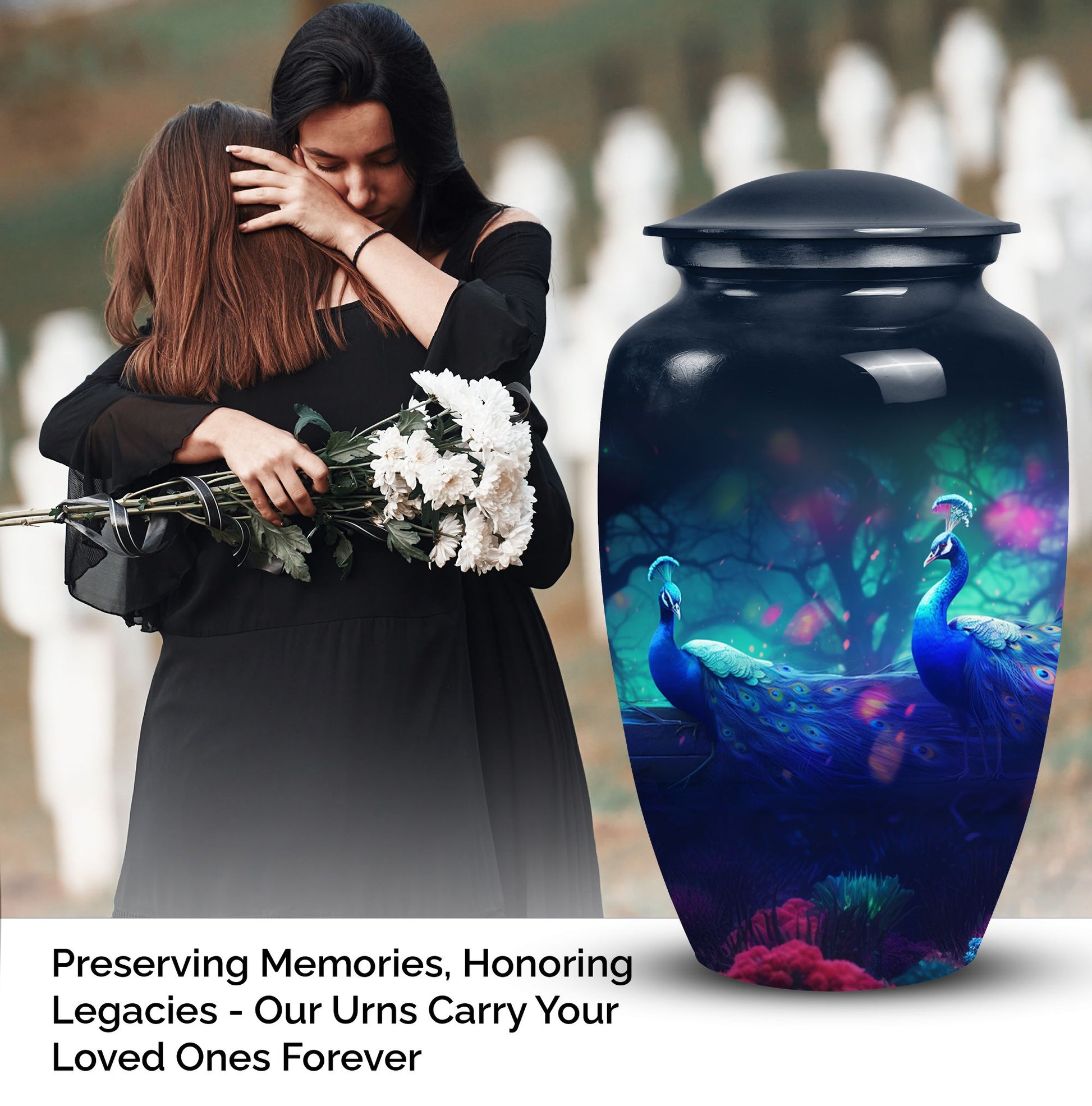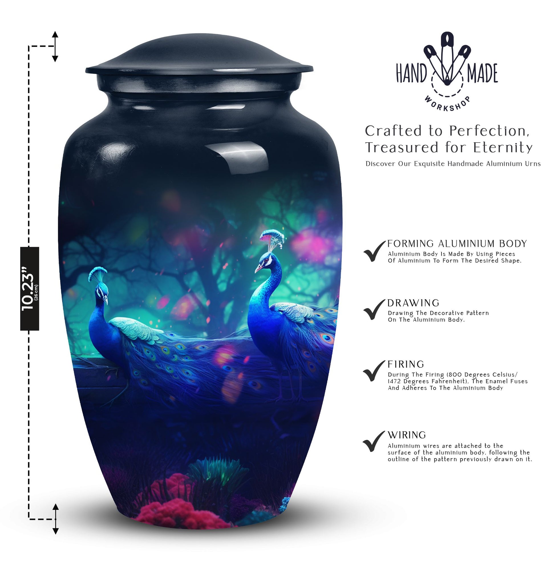 Discover the unique style and grace of our Peacock Cremation Urns, perfect for the dignified honoring of your loved one's memory. Meticulously crafted and intricately detailed, these burial urns evoke the vibrancy of a peacock, exhibiting a colorful manifestation of life to celebrate your dearly departed. Suitable to hold adult human ashes, their size is robust and respectful. Procure tranquility with our elegant cremated ash urns, fulfilling the solemn pledge to rejoice your cherished one's legacy. Our cremation containers offer not just a vessel, but an emblem of remembrance, standing as an evergreen tribute to the cycle of life and death. Specially designed for adult human ashes, they embody enduring quality and reverence. Venture into our exquisite range of cremation companion urns to find a fitting tribute, manifesting compassion and solace. These pieces of ceremonial craftwork go beyond the traditional, forming an emblematic keepsake of your loved one's remarkable journey. As a testament to your timeless affection, they serve as enduring investments into emotional homage and profound serenity.