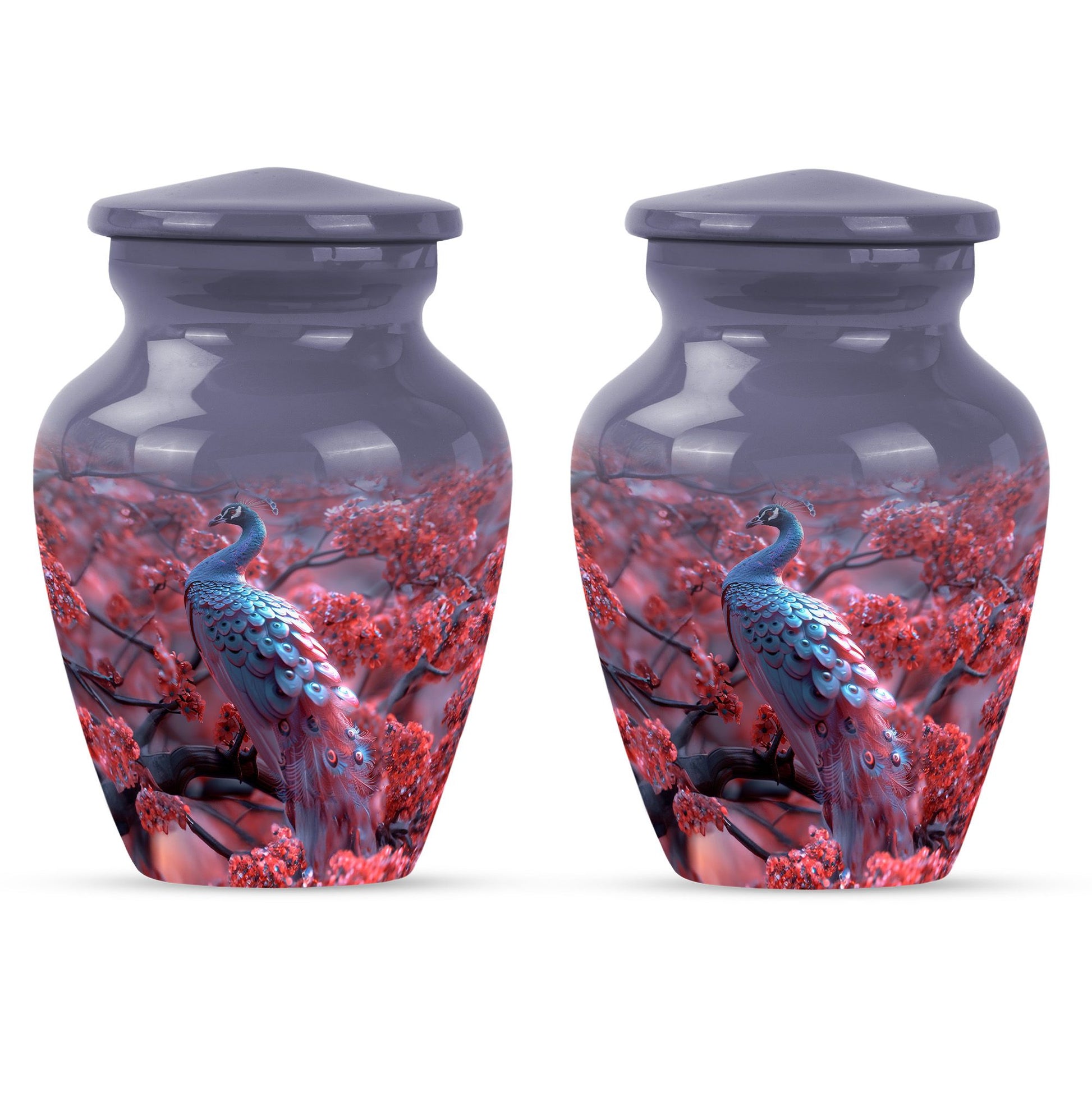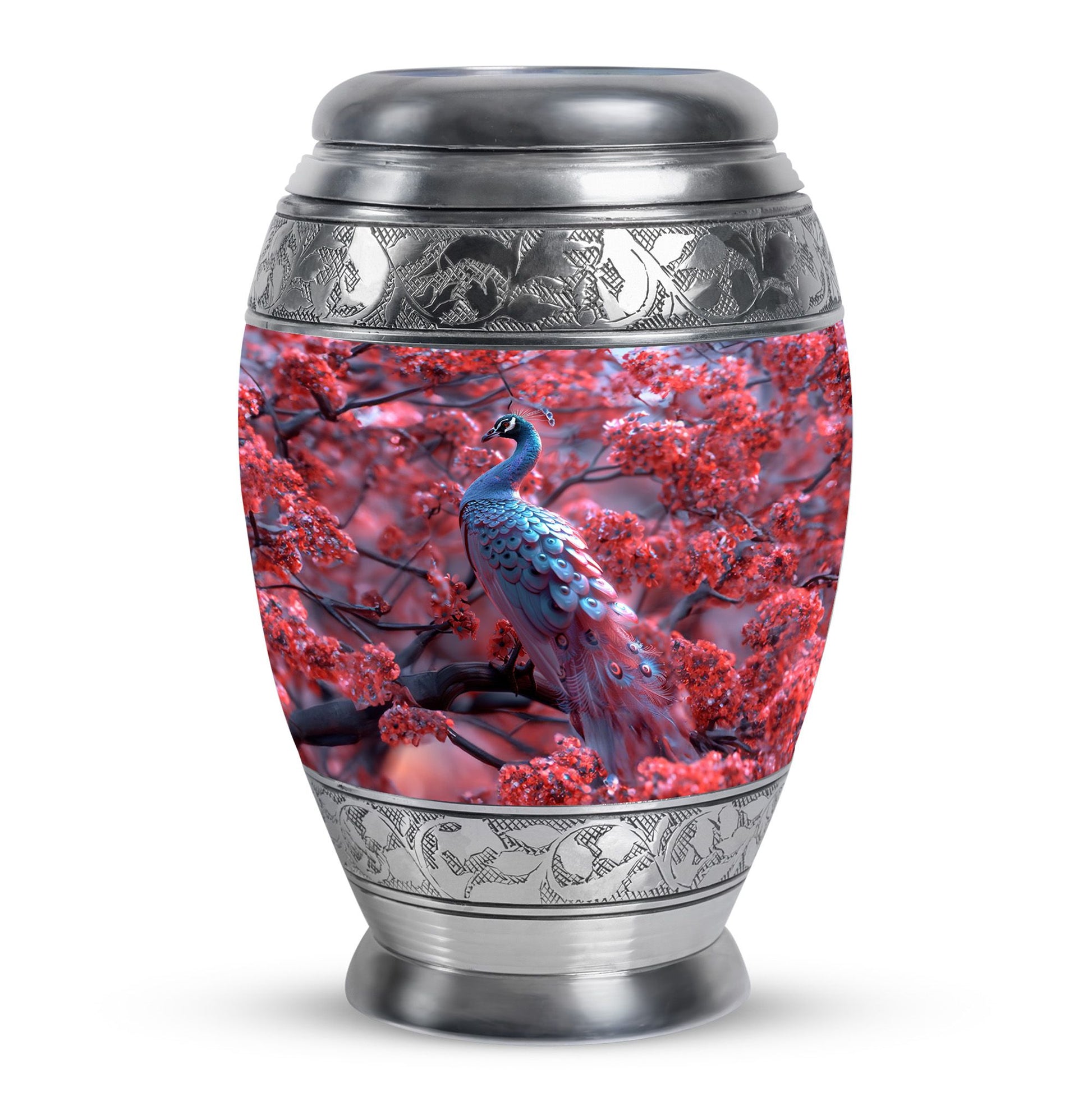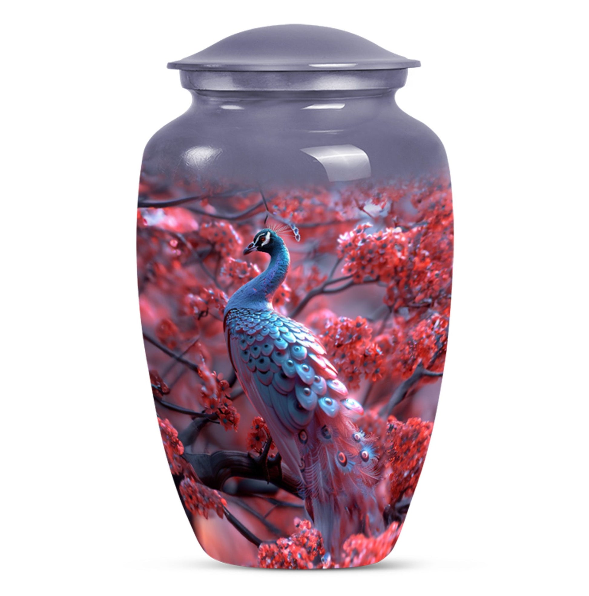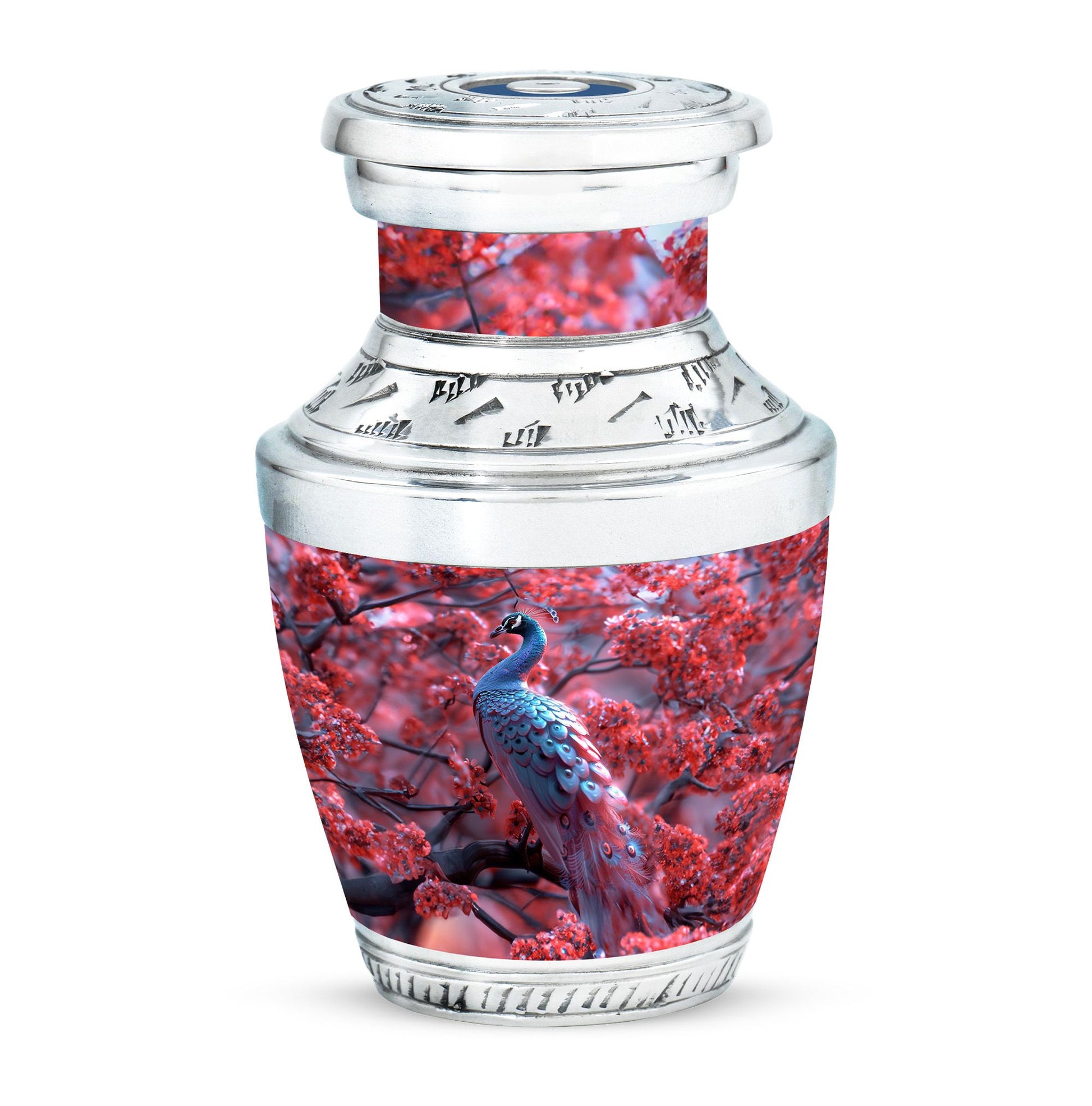Made from durable aluminum, this urn ensures strength while showcasing an artistic red floral and peacock design. Its compact size makes it suitable as a small cremation urn for ashes, a mini cremation urn for human ashes, or one of several urns for cremation ashes small when families wish to share ashes. With a secure screw-top lid, this cremation urn small provides peace of mind that remains are safe.