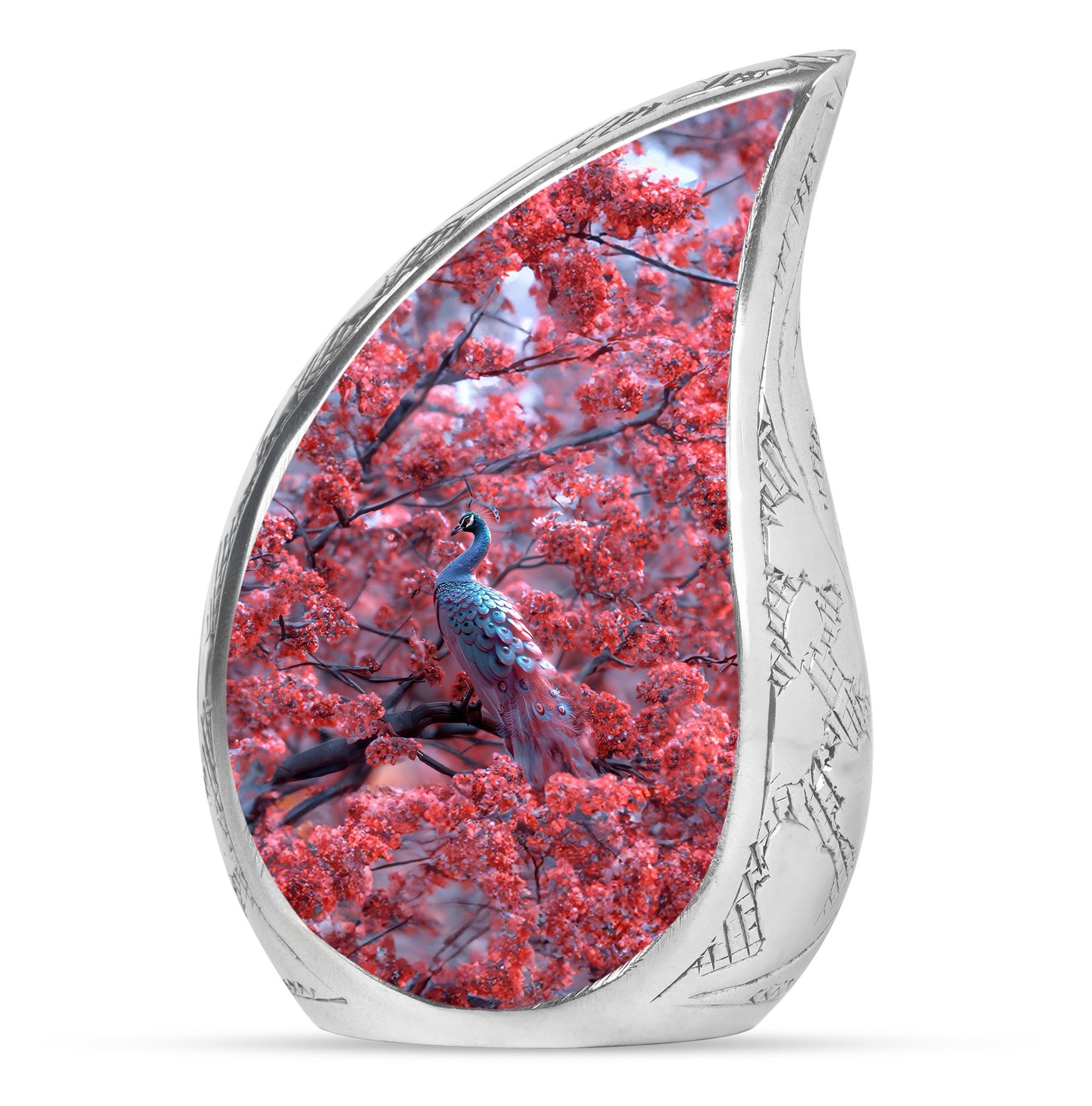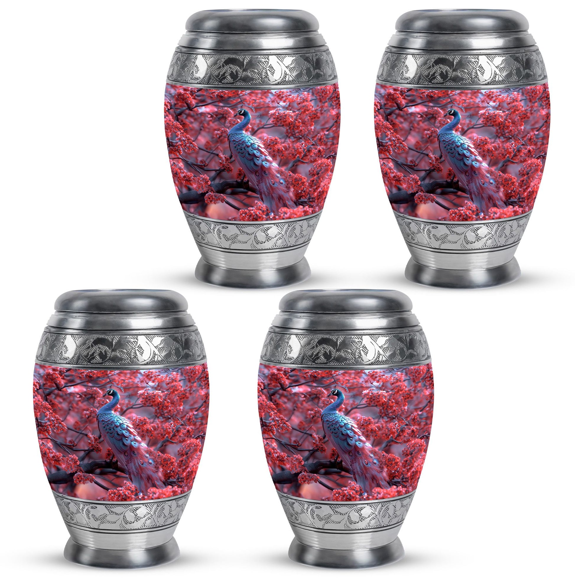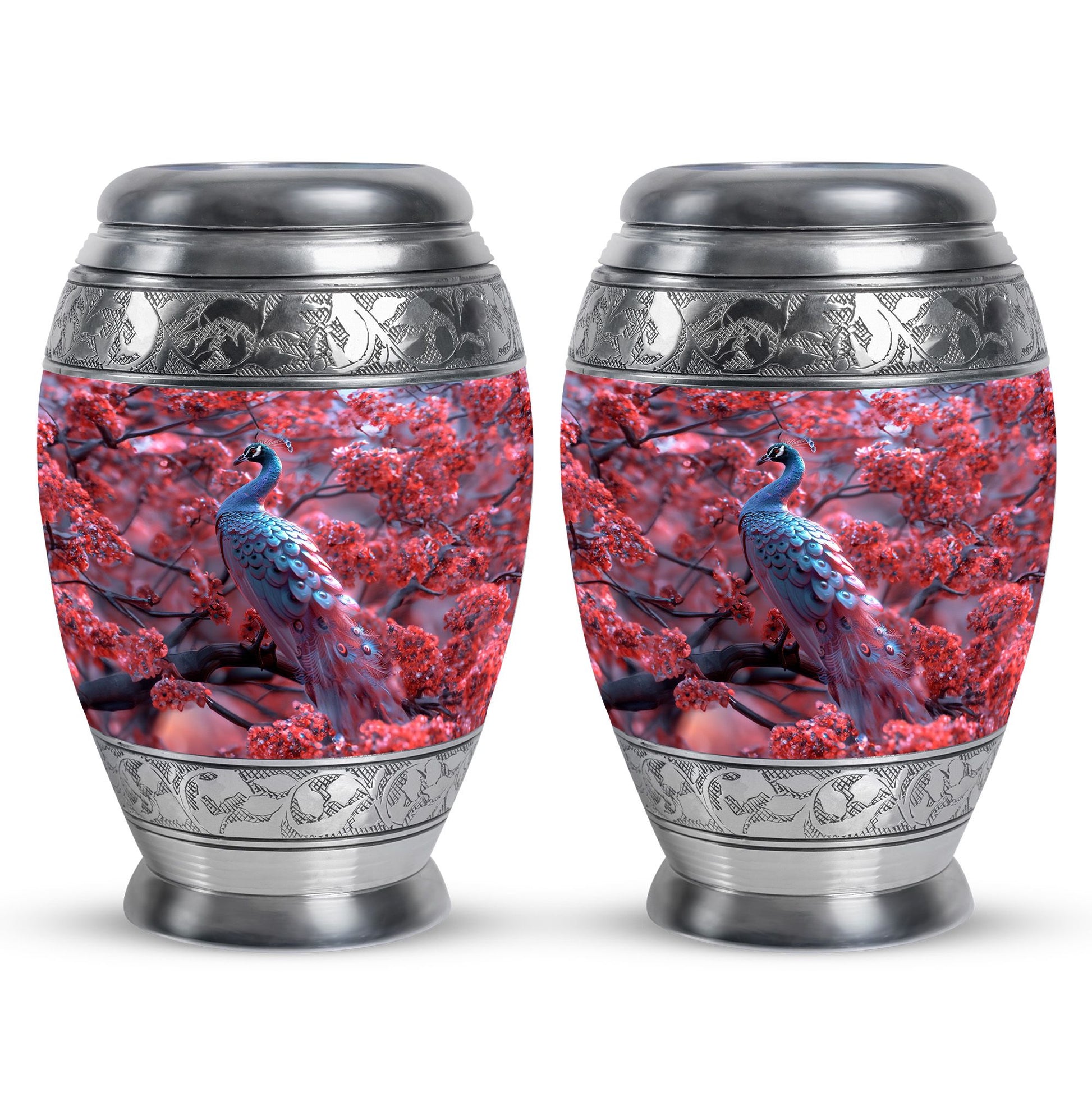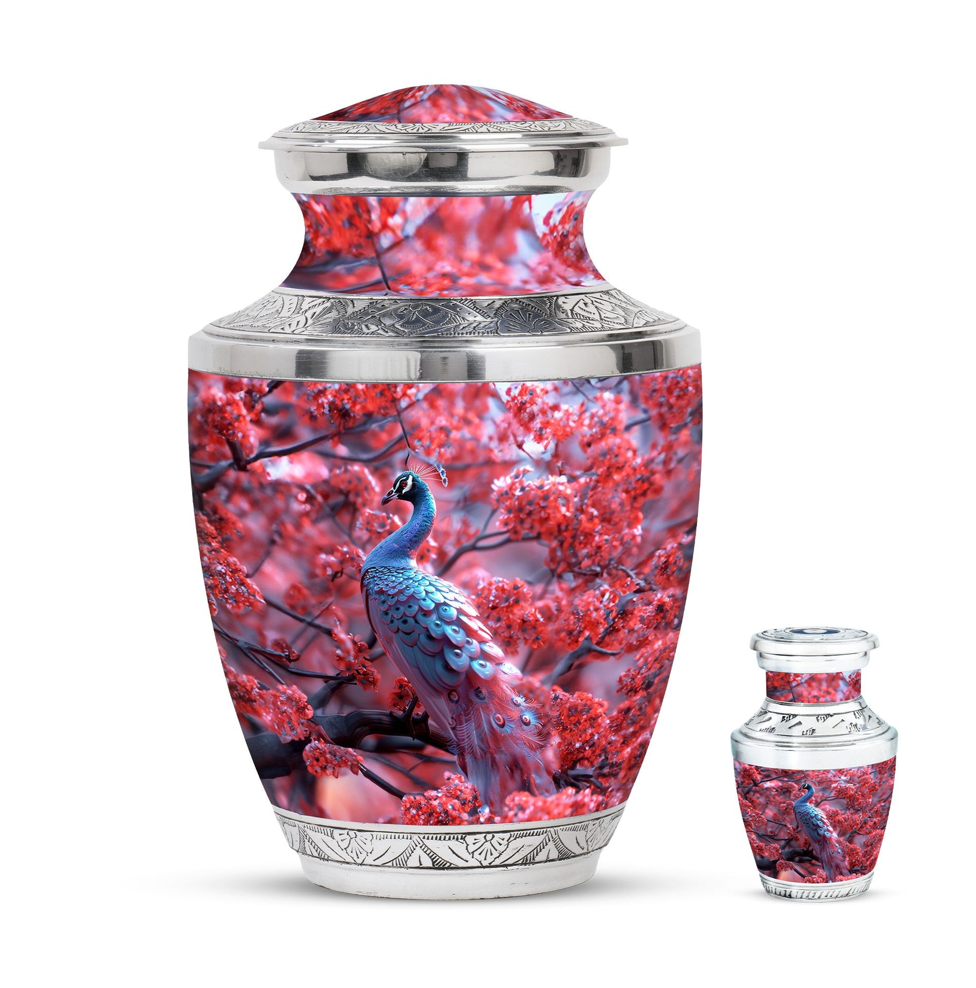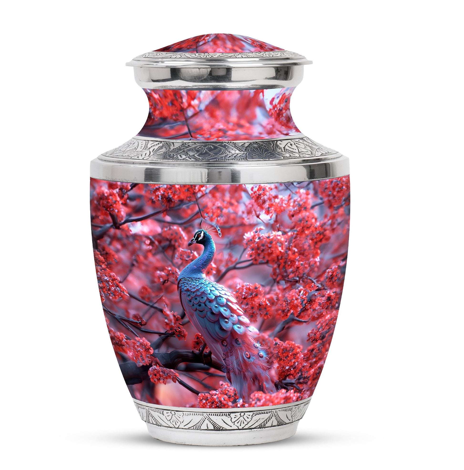 Made from durable aluminum, this urn ensures strength while showcasing an artistic red floral and peacock design. Its compact size makes it suitable as a small cremation urn for ashes, a mini cremation urn for human ashes, or one of several urns for cremation ashes small when families wish to share ashes. With a secure screw-top lid, this cremation urn small provides peace of mind that remains are safe.