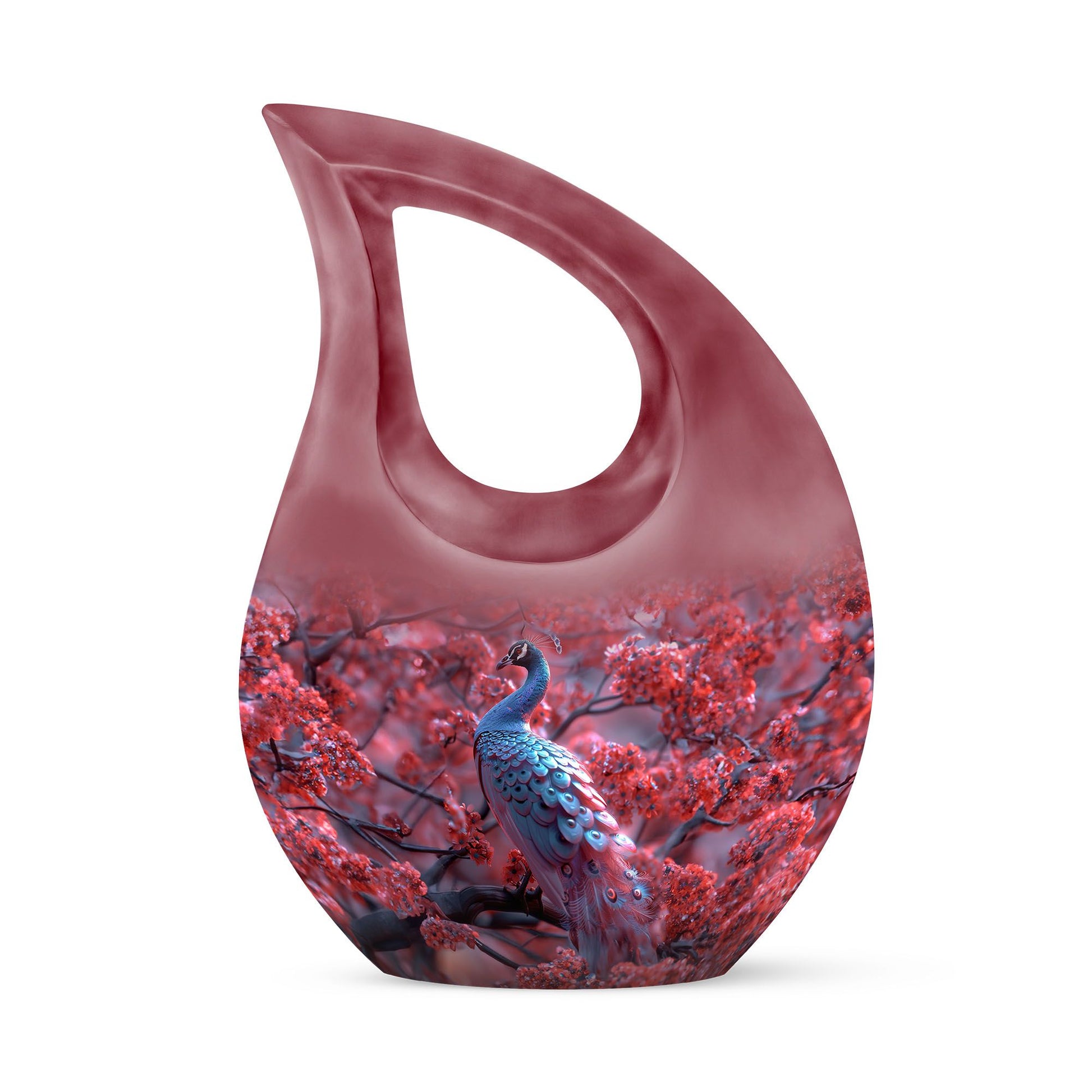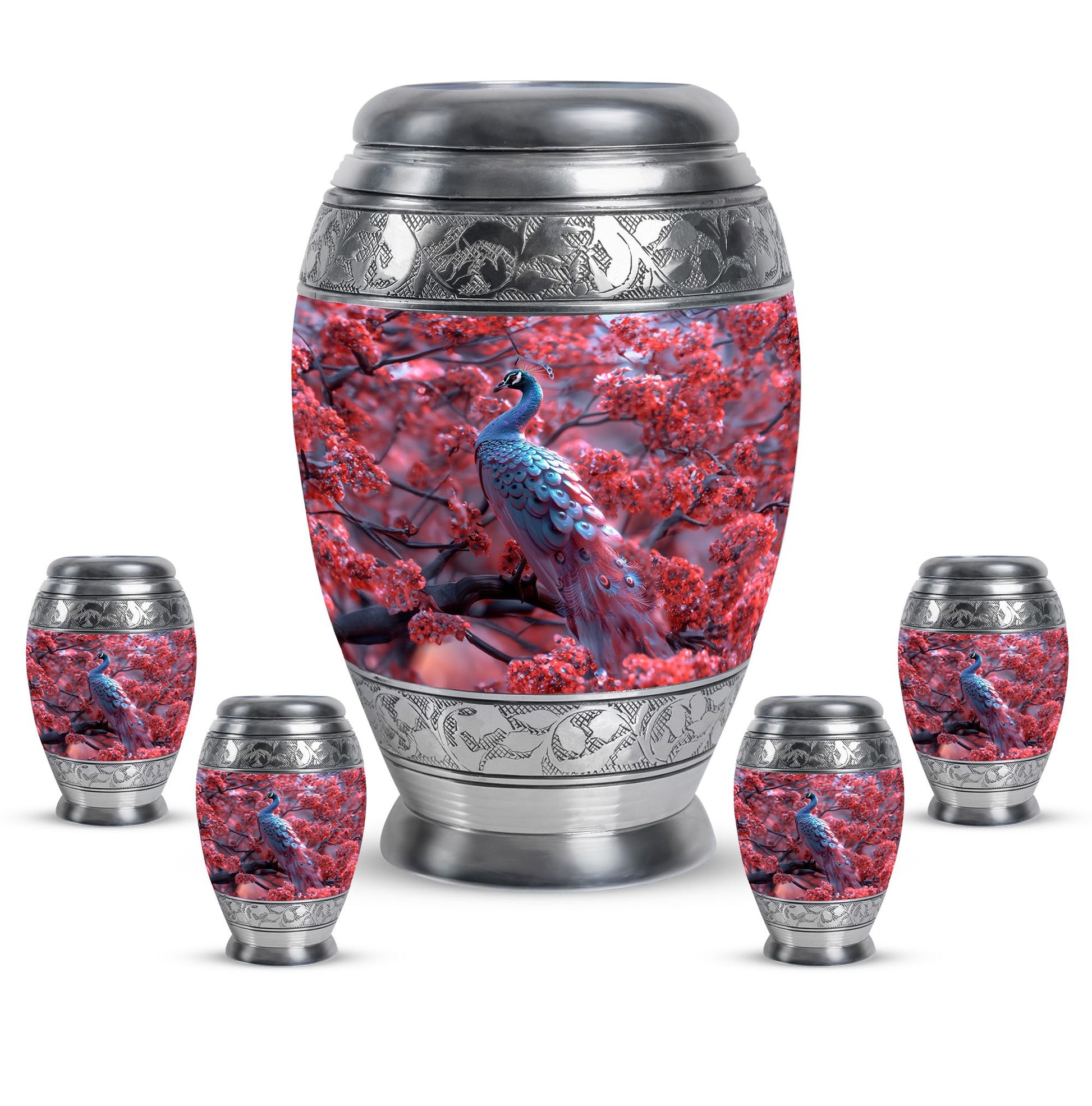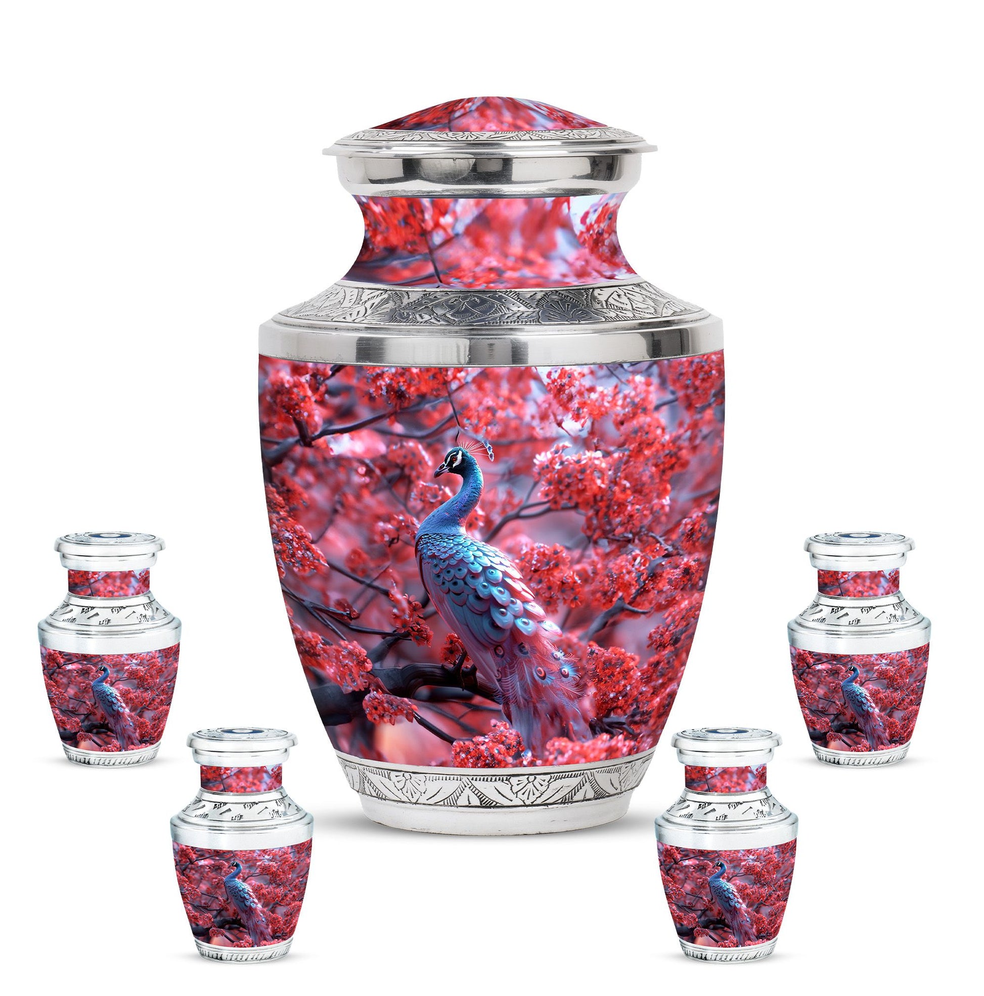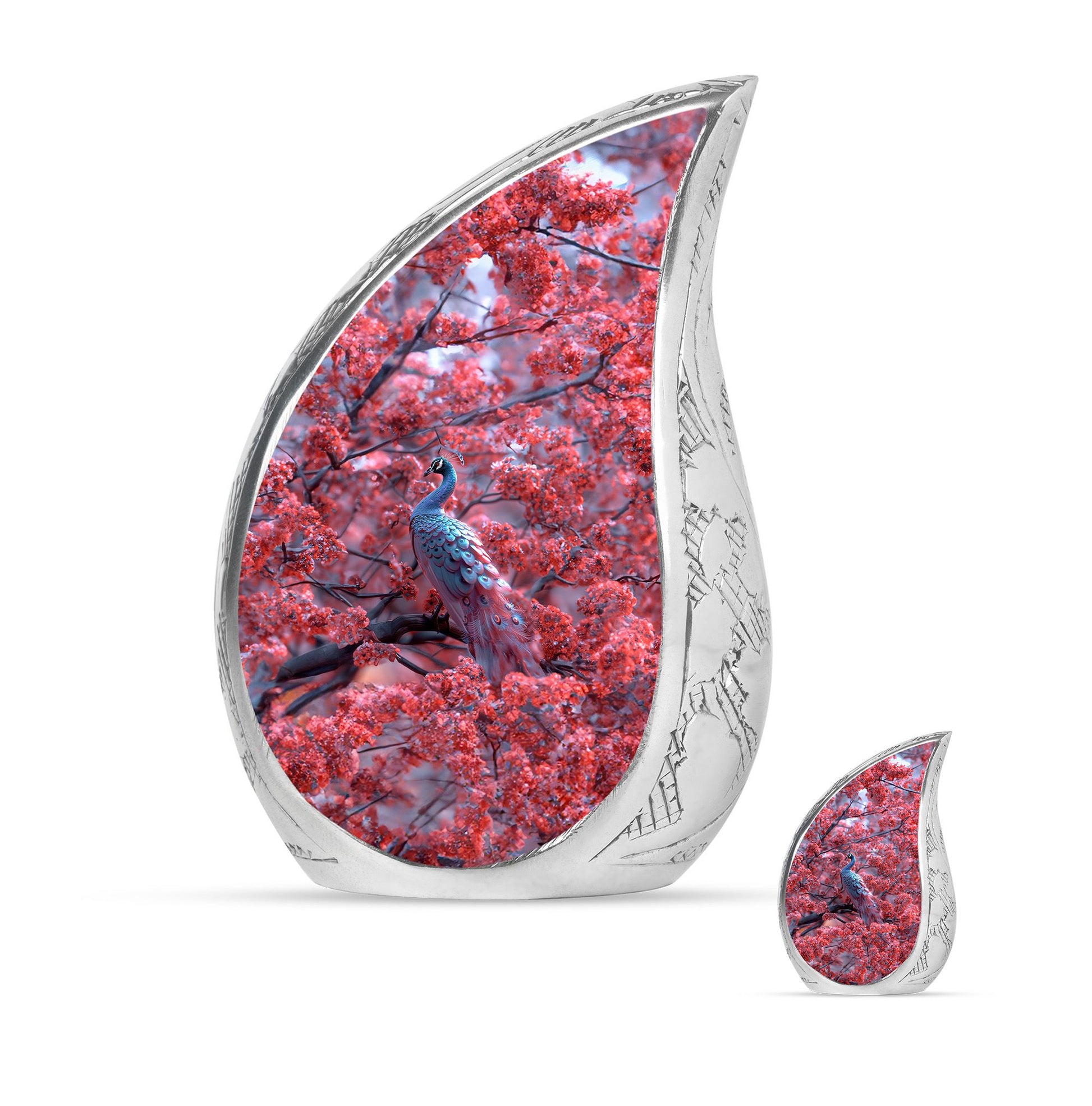 Made from durable aluminum, this urn ensures strength while showcasing an artistic red floral and peacock design. Its compact size makes it suitable as a small cremation urn for ashes, a mini cremation urn for human ashes, or one of several urns for cremation ashes small when families wish to share ashes. With a secure screw-top lid, this cremation urn small provides peace of mind that remains are safe.