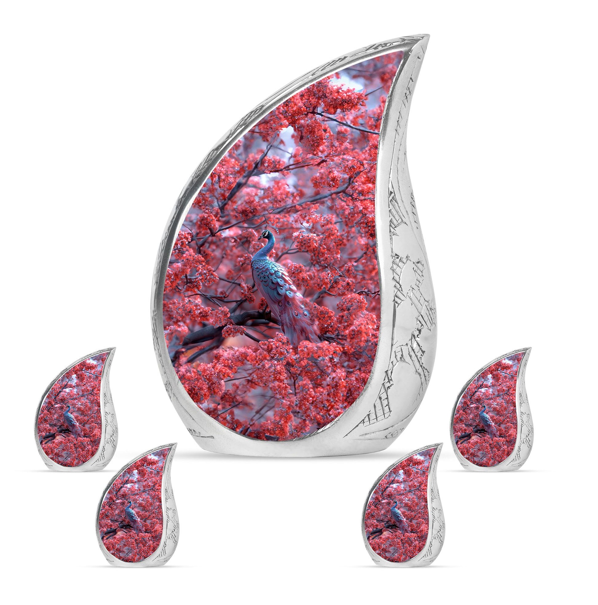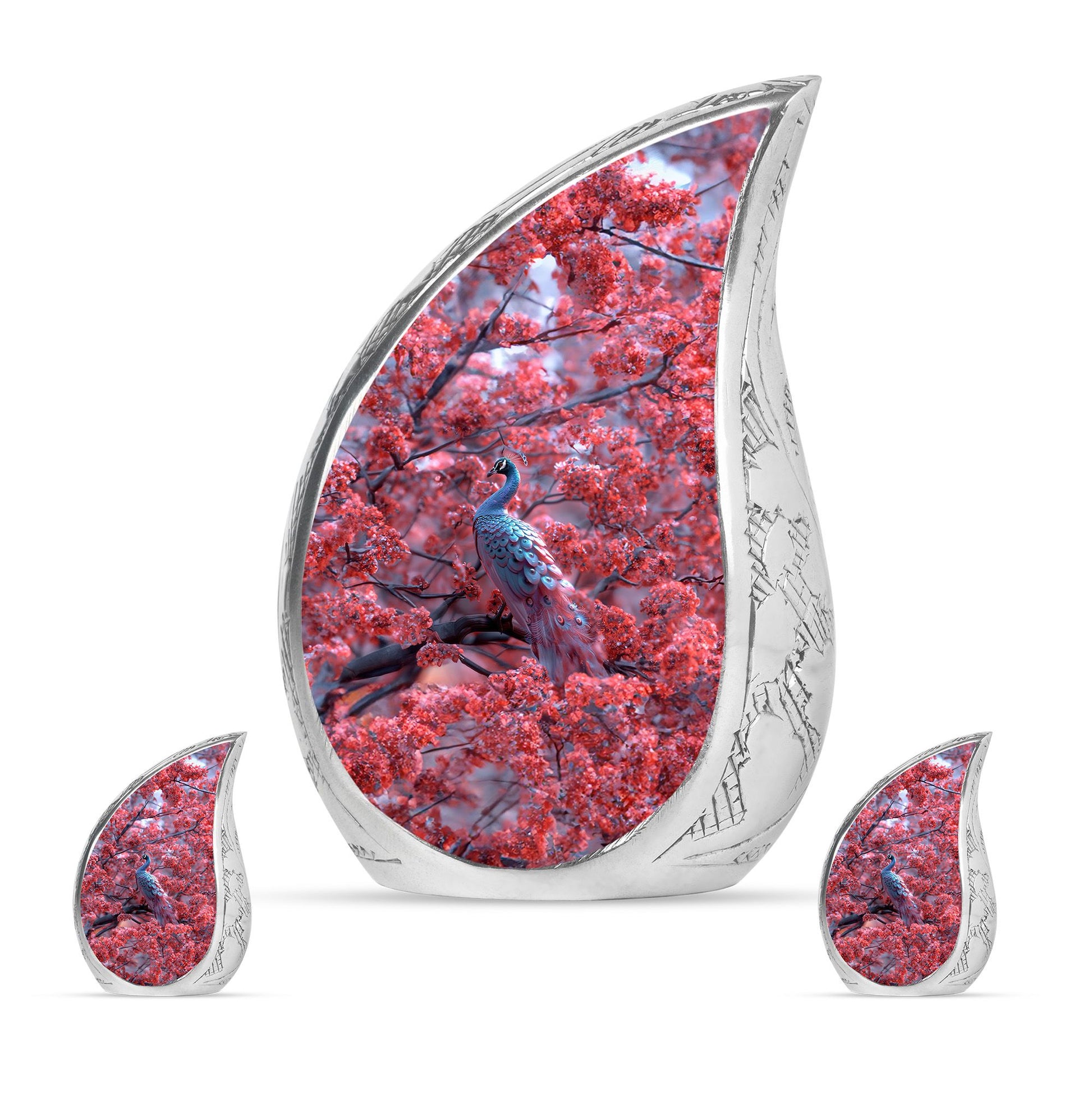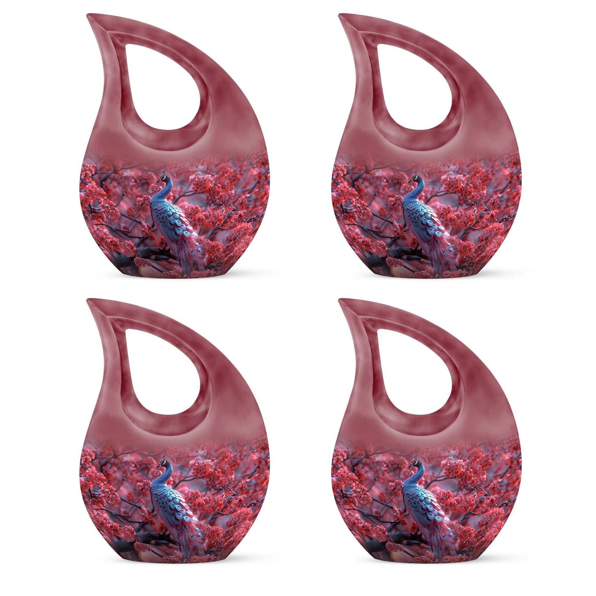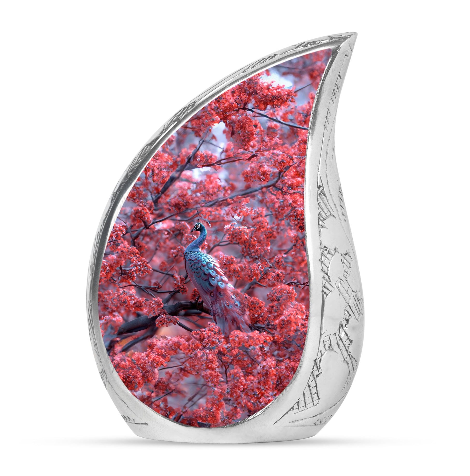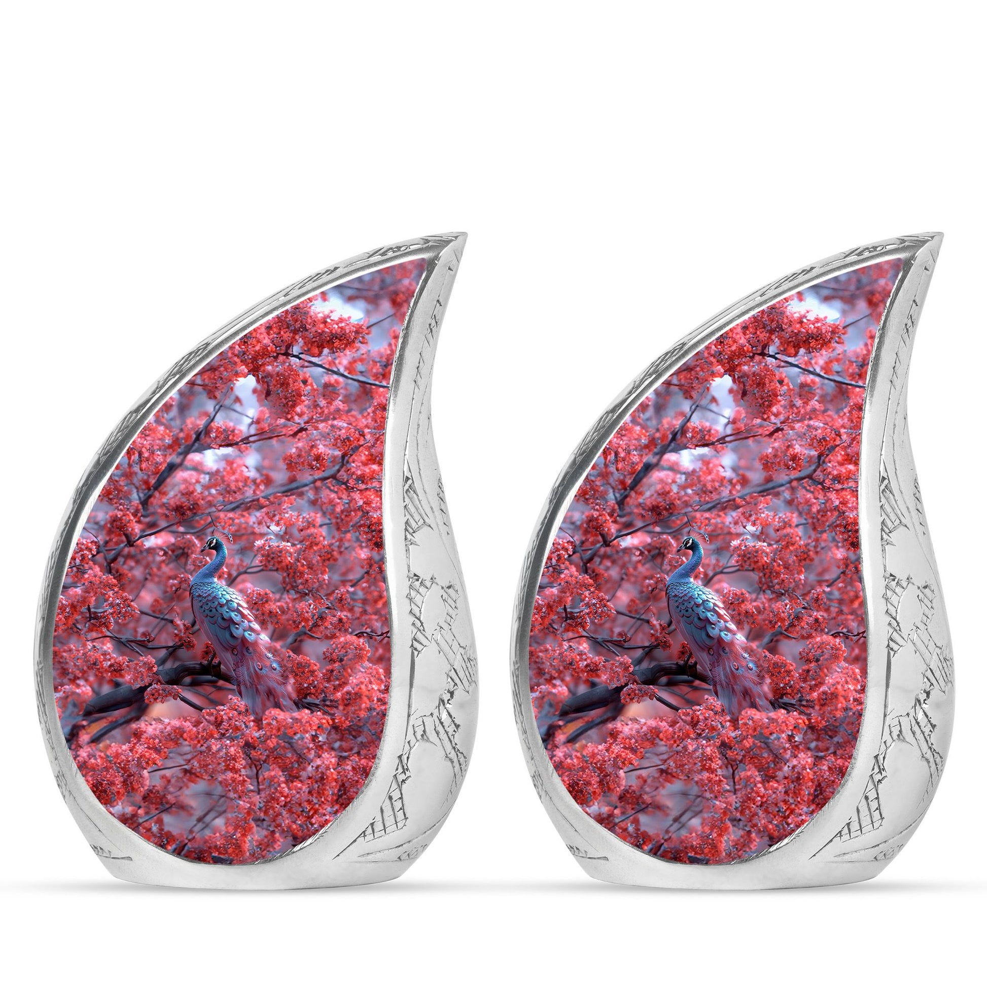 Made from durable aluminum, this urn ensures strength while showcasing an artistic red floral and peacock design. Its compact size makes it suitable as a small cremation urn for ashes, a mini cremation urn for human ashes, or one of several urns for cremation ashes small when families wish to share ashes. With a secure screw-top lid, this cremation urn small provides peace of mind that remains are safe.