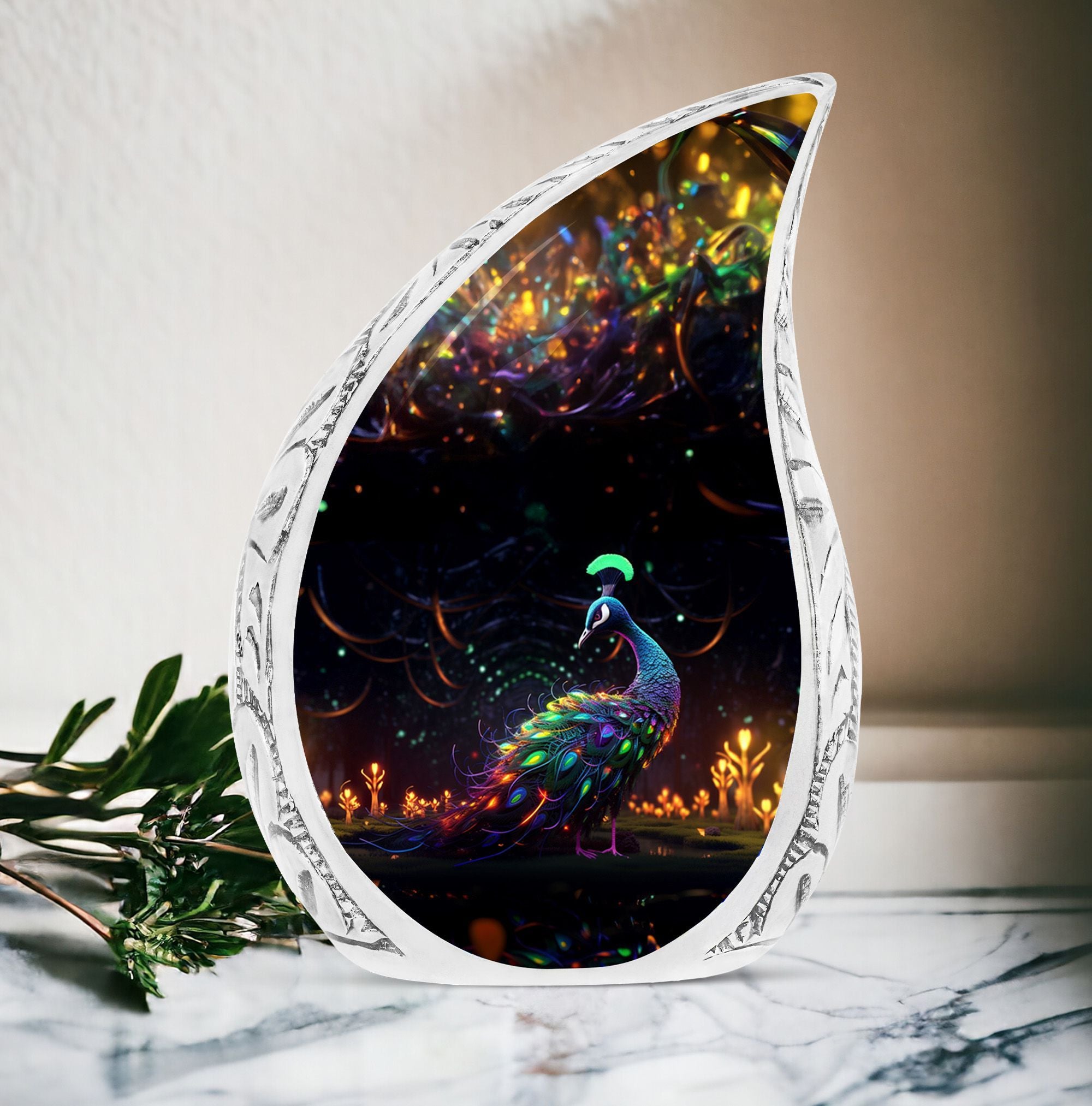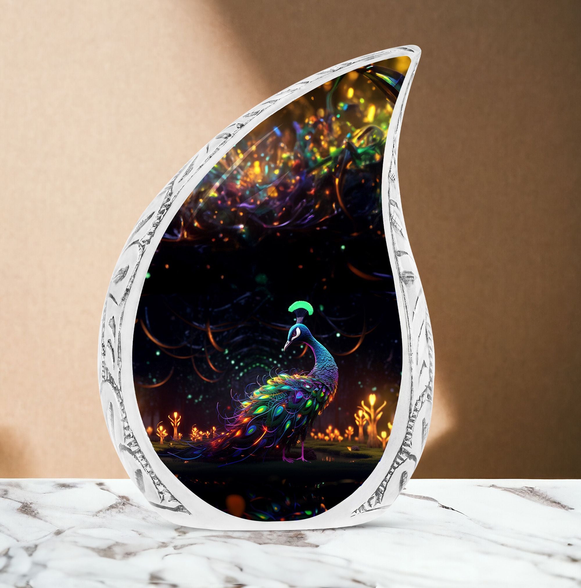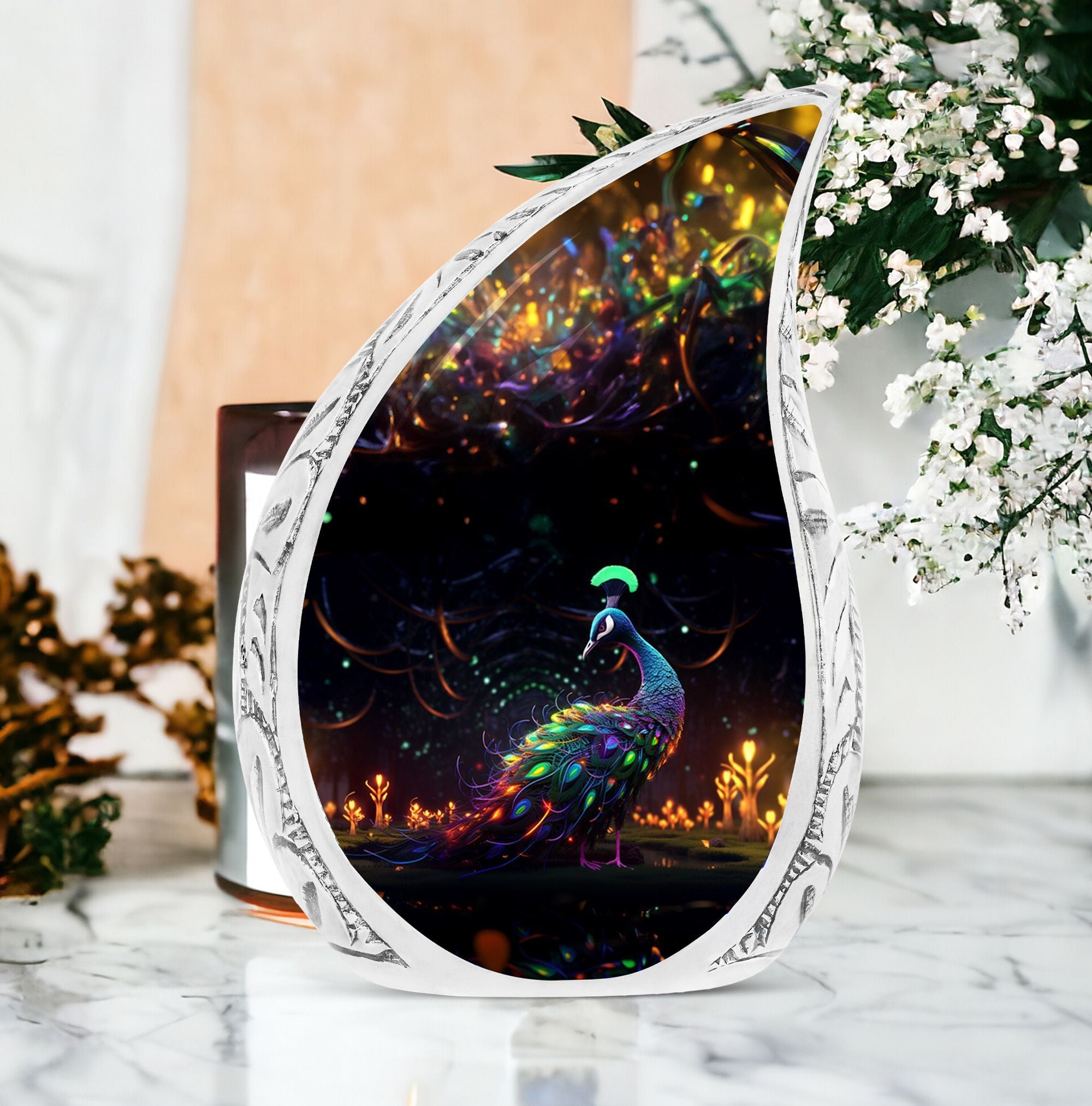 Revere the memory of beloved ones with our Large Peacock Urn, intrinsically crafted from sturdy aluminium, promising exceptional durability. With its classic design that subtly transcends beauty and nostalgia, it offers a capacity of 200 cubic inches, easily containable within its 10-inch height dimensions - an elegantly refined choice for urns for ashes. It's not just an urn, it's a vessel that honours cherished memories. Alongside the urn, the package includes a delicate velvet pouch, perfect for the containment of ashes, ensuring a dignified and respectful keeping. To make it more personal, engraving options are available, allowing you to etch names, creating a personalized urn that resonates with heartfelt memories. This 3-inch, 3.3-pound memorial object effortlessly fits the essence of your beloved. Ideal for seniors and adults, this urn suits extensively for various religious and ceremonial occasions. Keywords like 'Urns for Human Remains', 'Decorative Urns for Ashes', and 'Urns for Ashes for Dad' offers valuable insights into the breadth of this product's use.