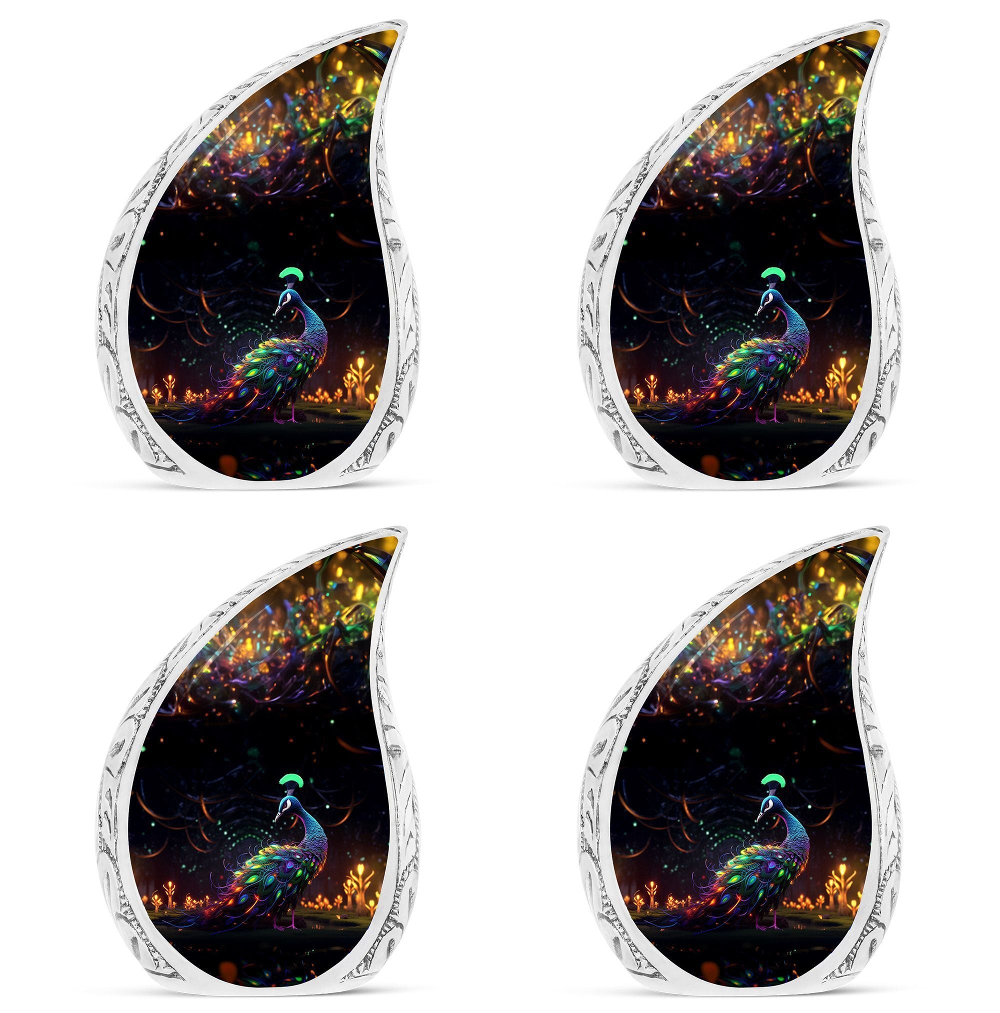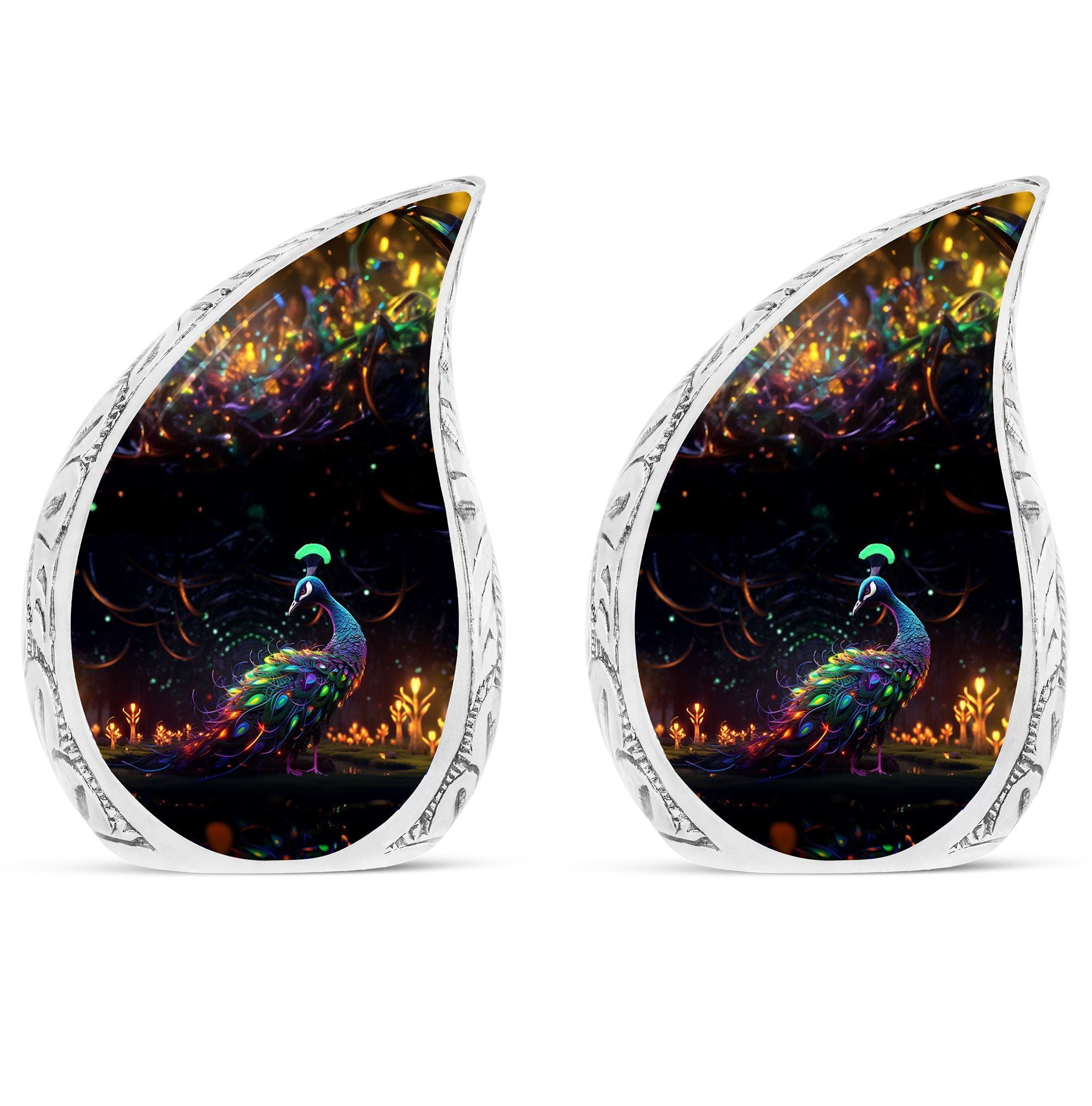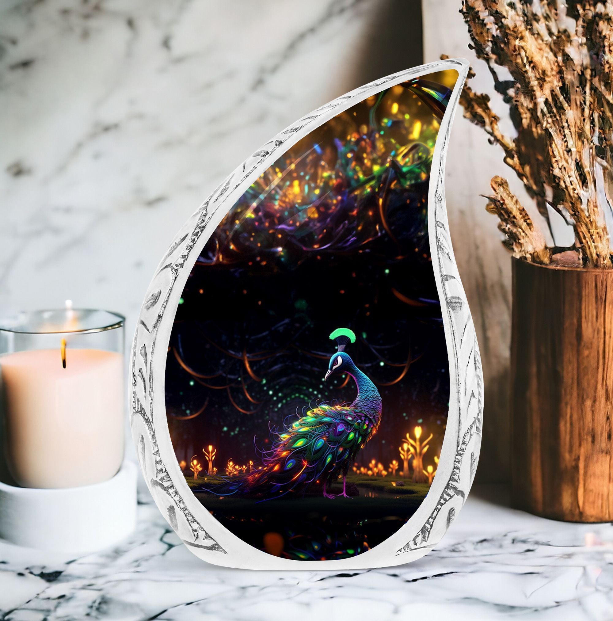 Revere the memory of beloved ones with our Large Peacock Urn, intrinsically crafted from sturdy aluminium, promising exceptional durability. With its classic design that subtly transcends beauty and nostalgia, it offers a capacity of 200 cubic inches, easily containable within its 10-inch height dimensions - an elegantly refined choice for urns for ashes. It's not just an urn, it's a vessel that honours cherished memories. Alongside the urn, the package includes a delicate velvet pouch, perfect for the containment of ashes, ensuring a dignified and respectful keeping. To make it more personal, engraving options are available, allowing you to etch names, creating a personalized urn that resonates with heartfelt memories. This 3-inch, 3.3-pound memorial object effortlessly fits the essence of your beloved. Ideal for seniors and adults, this urn suits extensively for various religious and ceremonial occasions. Keywords like 'Urns for Human Remains', 'Decorative Urns for Ashes', and 'Urns for Ashes for Dad' offers valuable insights into the breadth of this product's use.