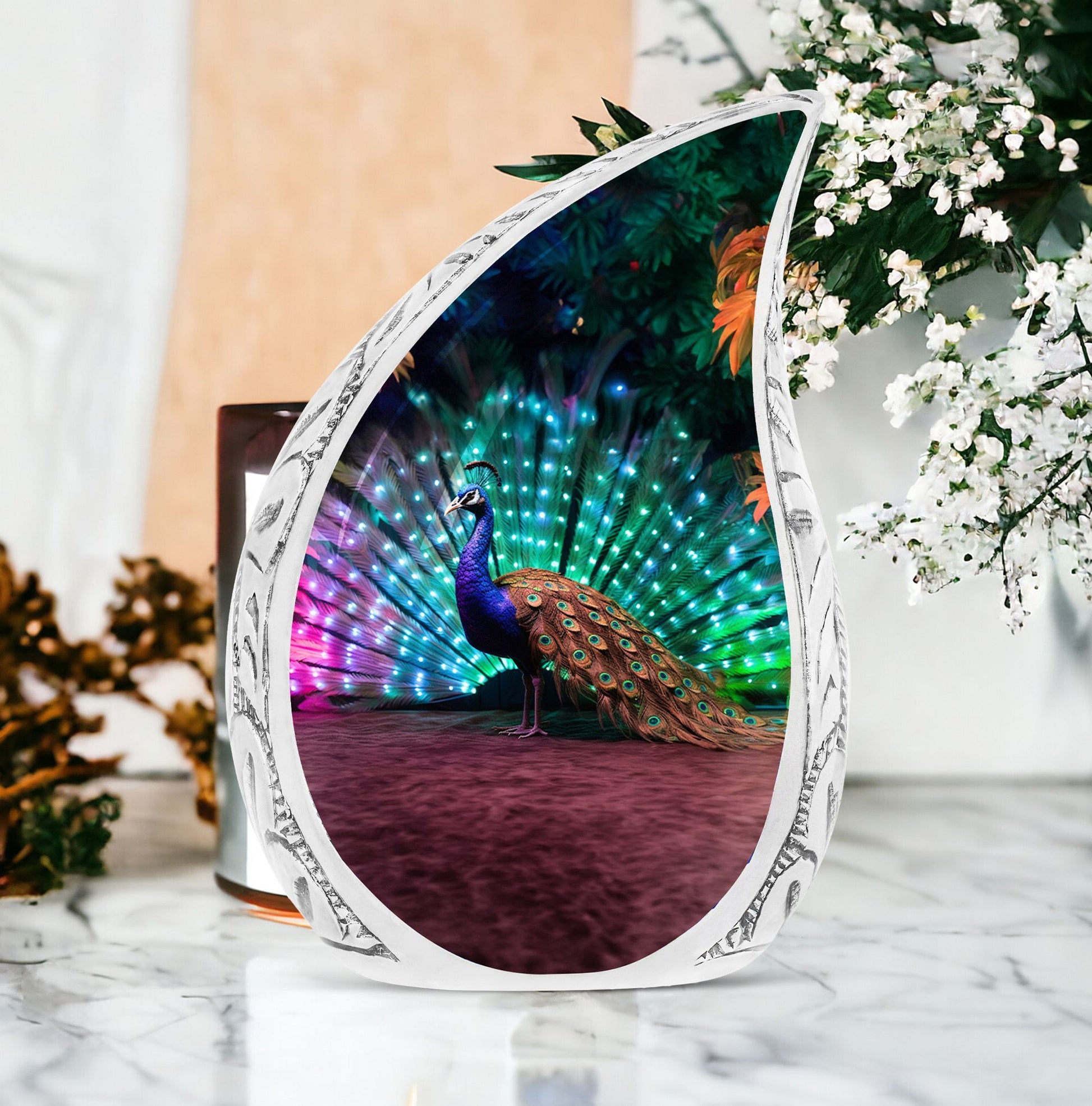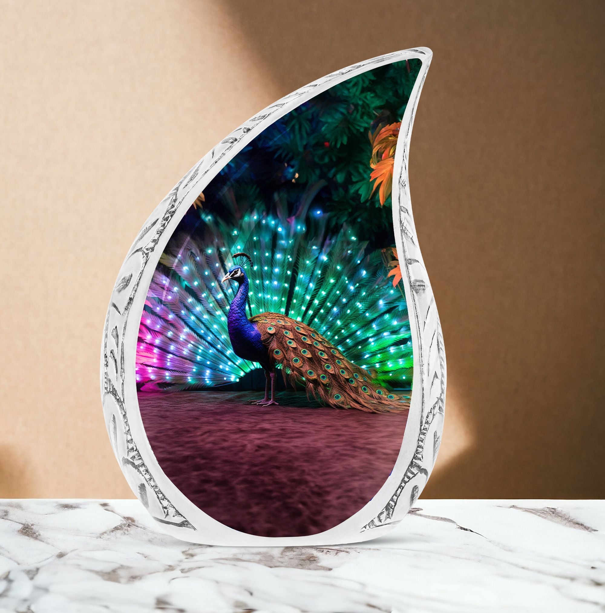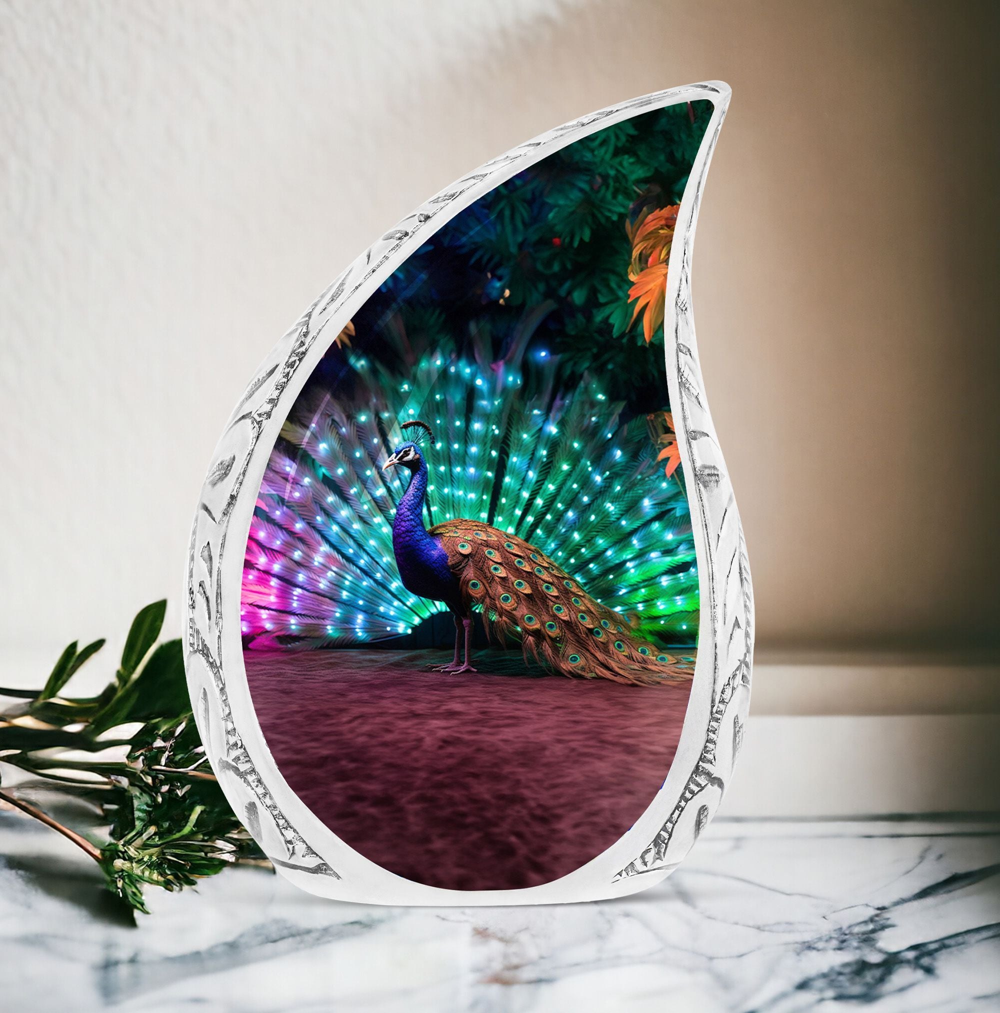 Experience an embodiment of reverence and honor with our meticulously crafted Peacock Cremation Urn. A perfect commemorative piece that offers a dignified resting place for your loved ones. Made from high-quality aluminium, this large urn with dimensions of 10 inches in height, and weight of 3.3 pounds, can capacitate up to 200 cubic inches of ashes. Each purchase includes a lavish velvet pouch for proper containment and solemnity. With its sturdy construction, it guarantees preservation and protection over time. Our urns offer an option to add a personal touch through engraved names, allowing a special way to remember your beloved. This peacock urn does not only serve as a vessel but also resonates the adoration and respect we have for our departed. Please note that these urns for people comply with all guidelines and standards necessary for such items. Perfect for those searching for 'cremation urn', 'customized urns for ashes for adults', or 'urn container'.