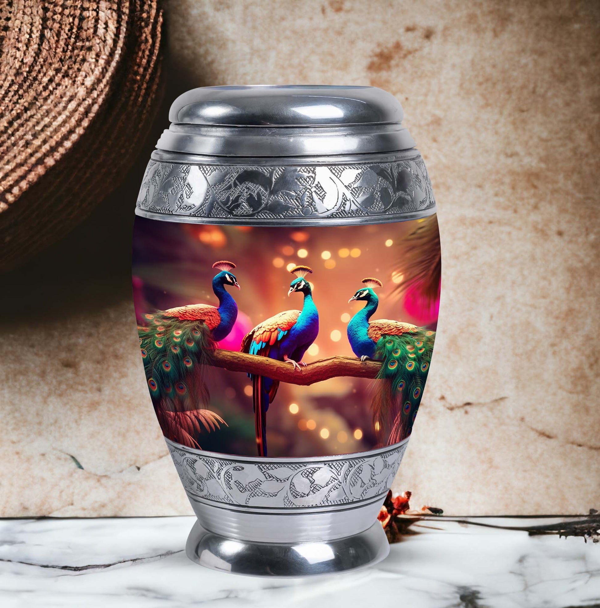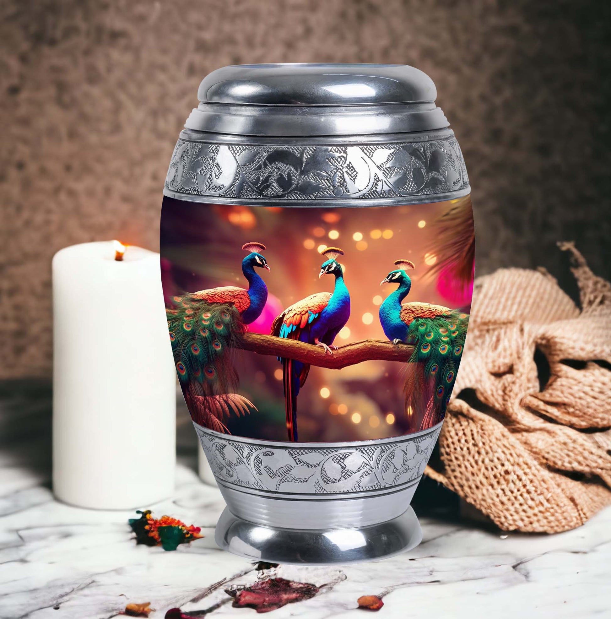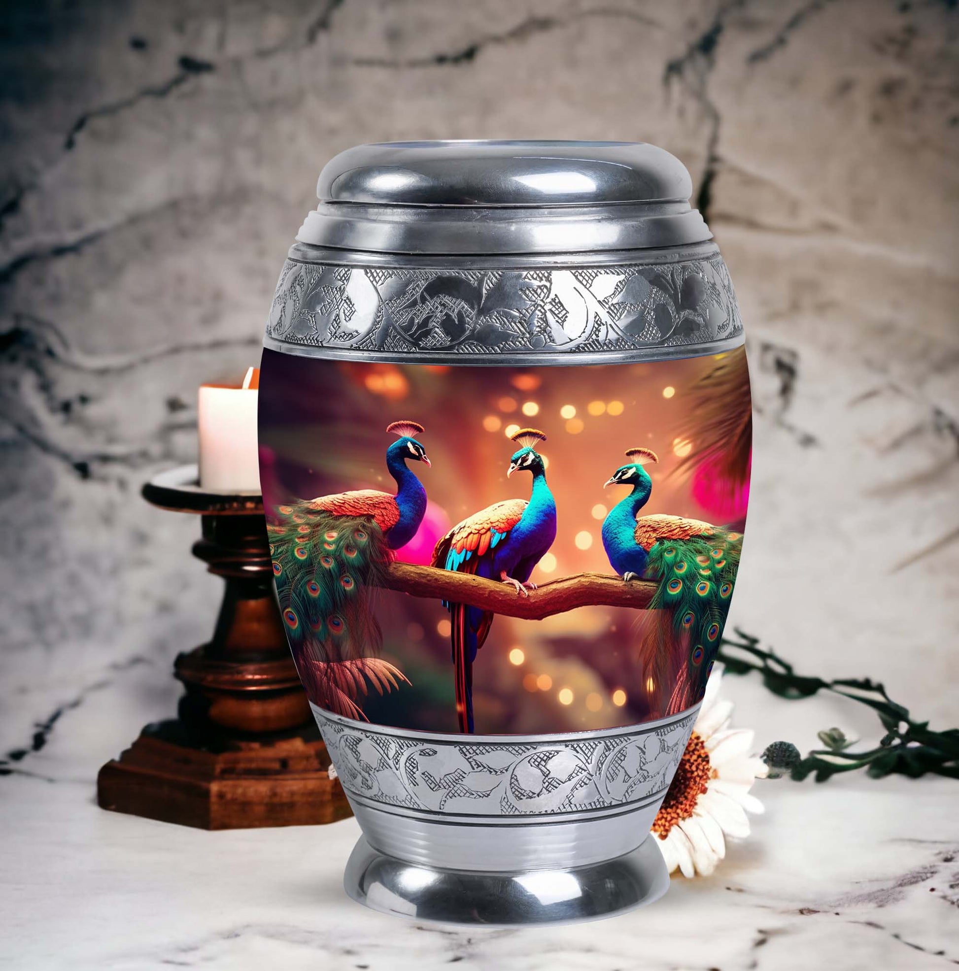 Commemorate your cherished ones with our seat of honor – the Peacock Cremation Urn. This large urn, meticulously moulded from sturdy aluminium, serves as a peaceful spot for your loved one's remains. Standing at a graceful 10 inches and weighing 3.3 pounds, it can comfortably house 200 cubic inches of cremated remains. Shaped with absolute precision and poured into a classic urn form, the urn showcases elegance at its peak. Included in the package is a velvet pouch designed exclusively for the containment of ashes. You can make it a heartfelt personal tribute by adding engraved names—a poignant memory of your loved ones. An ideal choice for burial urns for human ashes, our urns bring solace amid your loss. Turn a vital part in the circle of life into a special tribute, our Peacock Cremation Urn is for those seeking a timeless memory for their loved ones.