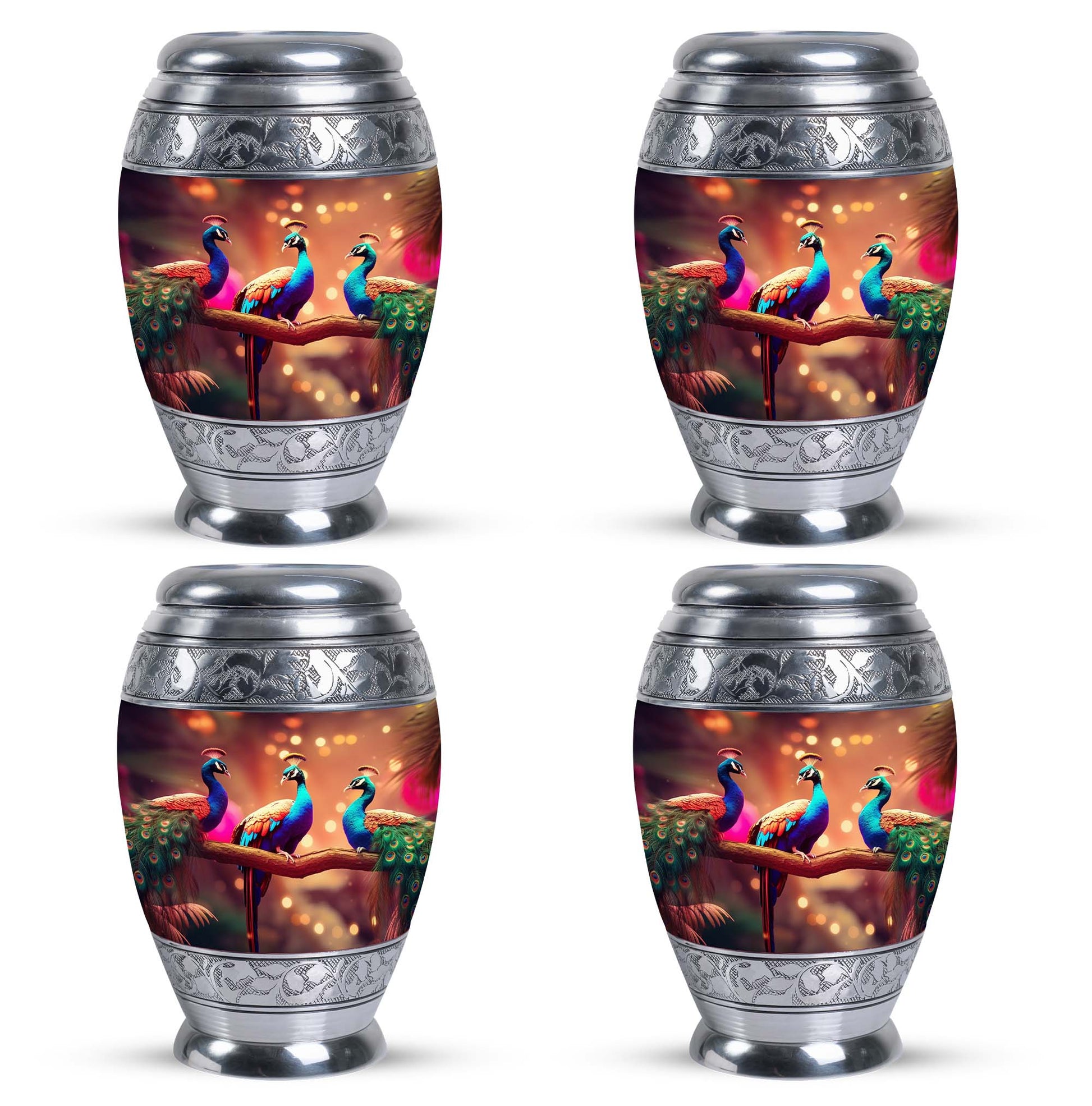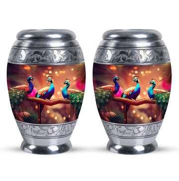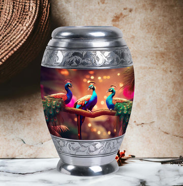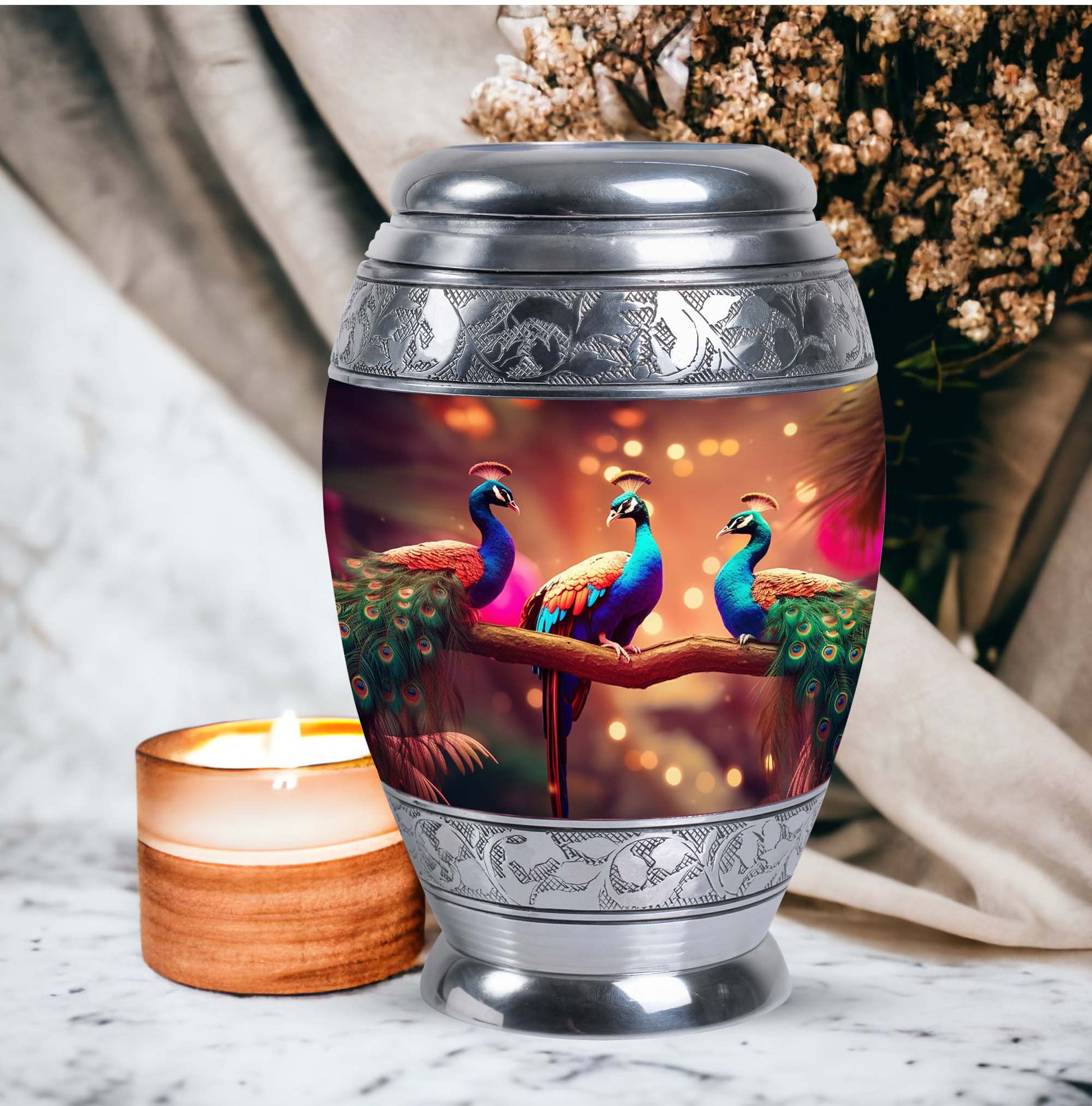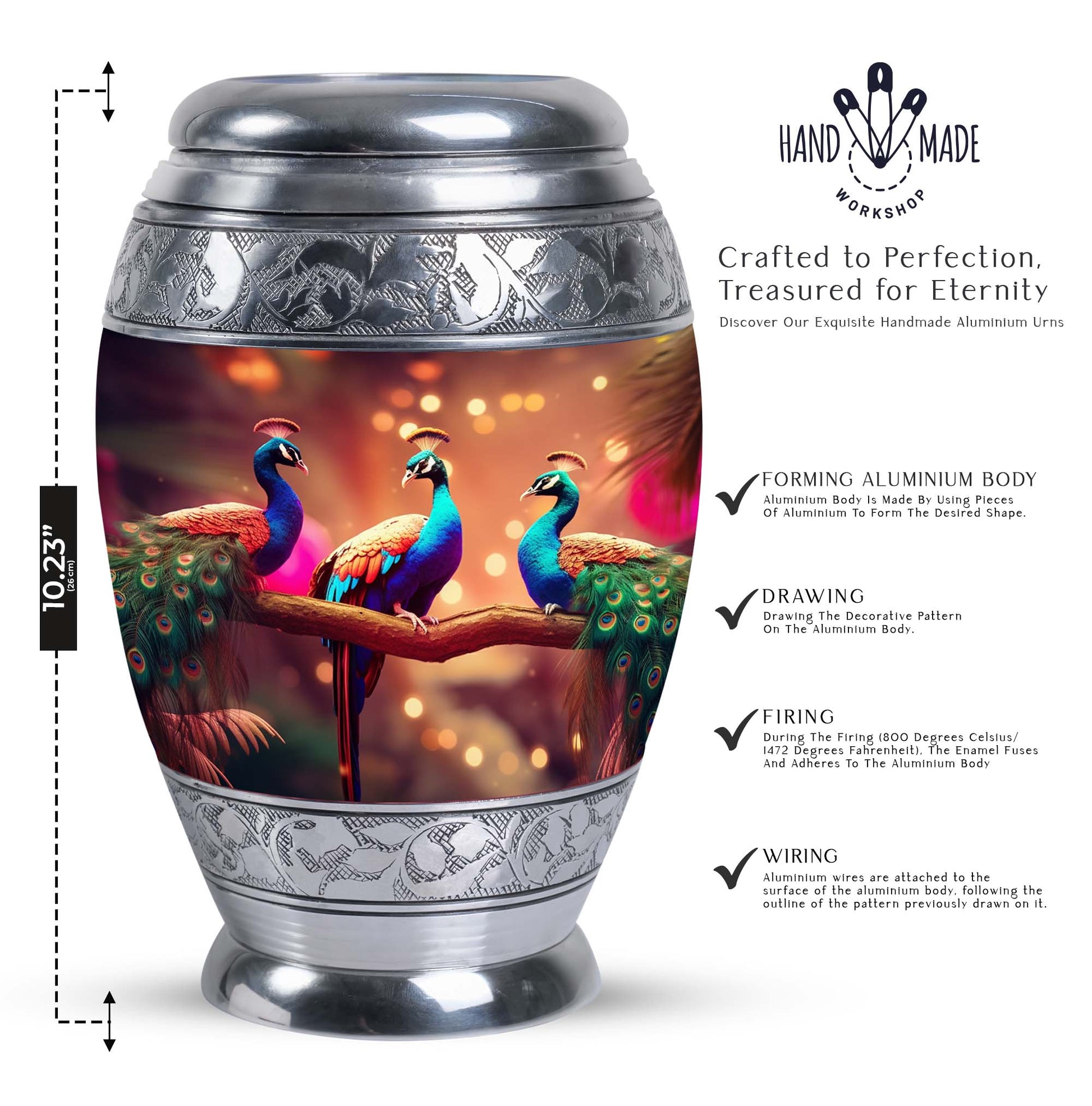 Commemorate your cherished ones with our seat of honor – the Peacock Cremation Urn. This large urn, meticulously moulded from sturdy aluminium, serves as a peaceful spot for your loved one's remains. Standing at a graceful 10 inches and weighing 3.3 pounds, it can comfortably house 200 cubic inches of cremated remains. Shaped with absolute precision and poured into a classic urn form, the urn showcases elegance at its peak. Included in the package is a velvet pouch designed exclusively for the containment of ashes. You can make it a heartfelt personal tribute by adding engraved names—a poignant memory of your loved ones. An ideal choice for burial urns for human ashes, our urns bring solace amid your loss. Turn a vital part in the circle of life into a special tribute, our Peacock Cremation Urn is for those seeking a timeless memory for their loved ones.