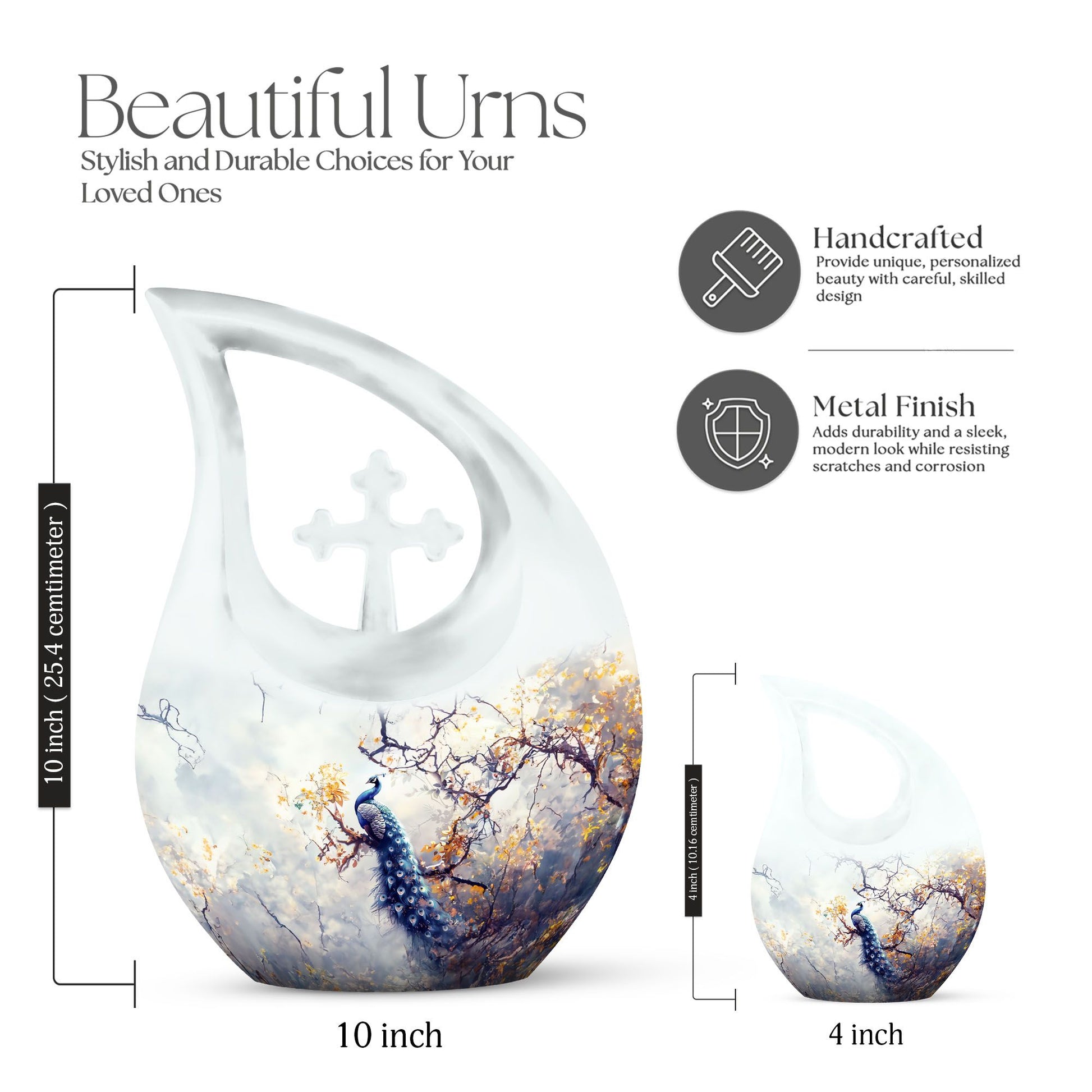 Expertly crafted from durable aluminum, this urn for cremation features a rich peacock-inspired pattern with intricate feather detailing. Its secure screw-top lid ensures ashes remain protected, while the 10-inch height and full adult capacity make it suitable for small urns for cremation ashes, adult size cremation urns, or keepsake cremation urns for human ashes. Whether selected as a cremation keepsake urns for human ashes adult or paired with mini cremation urns for shared remembrance, it offers both beauty and reliability.
