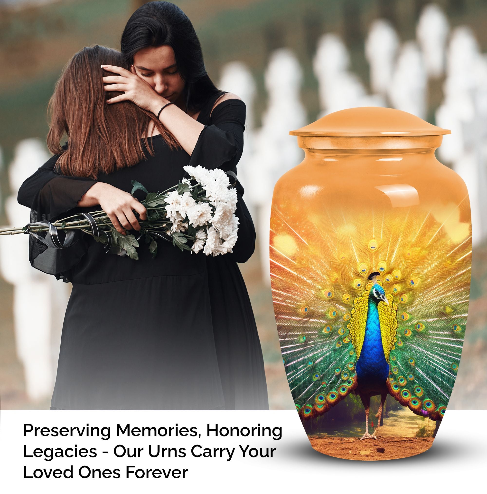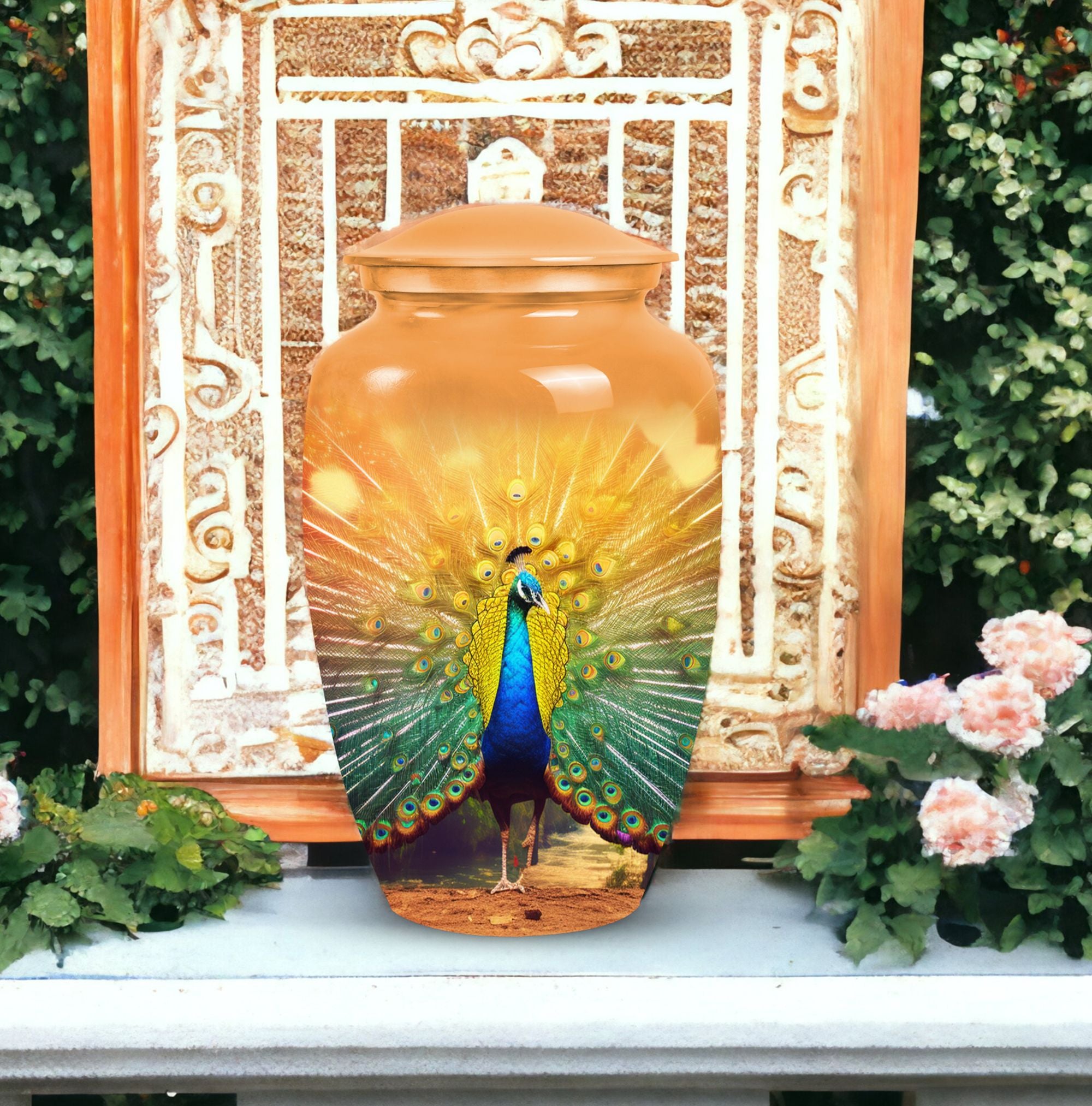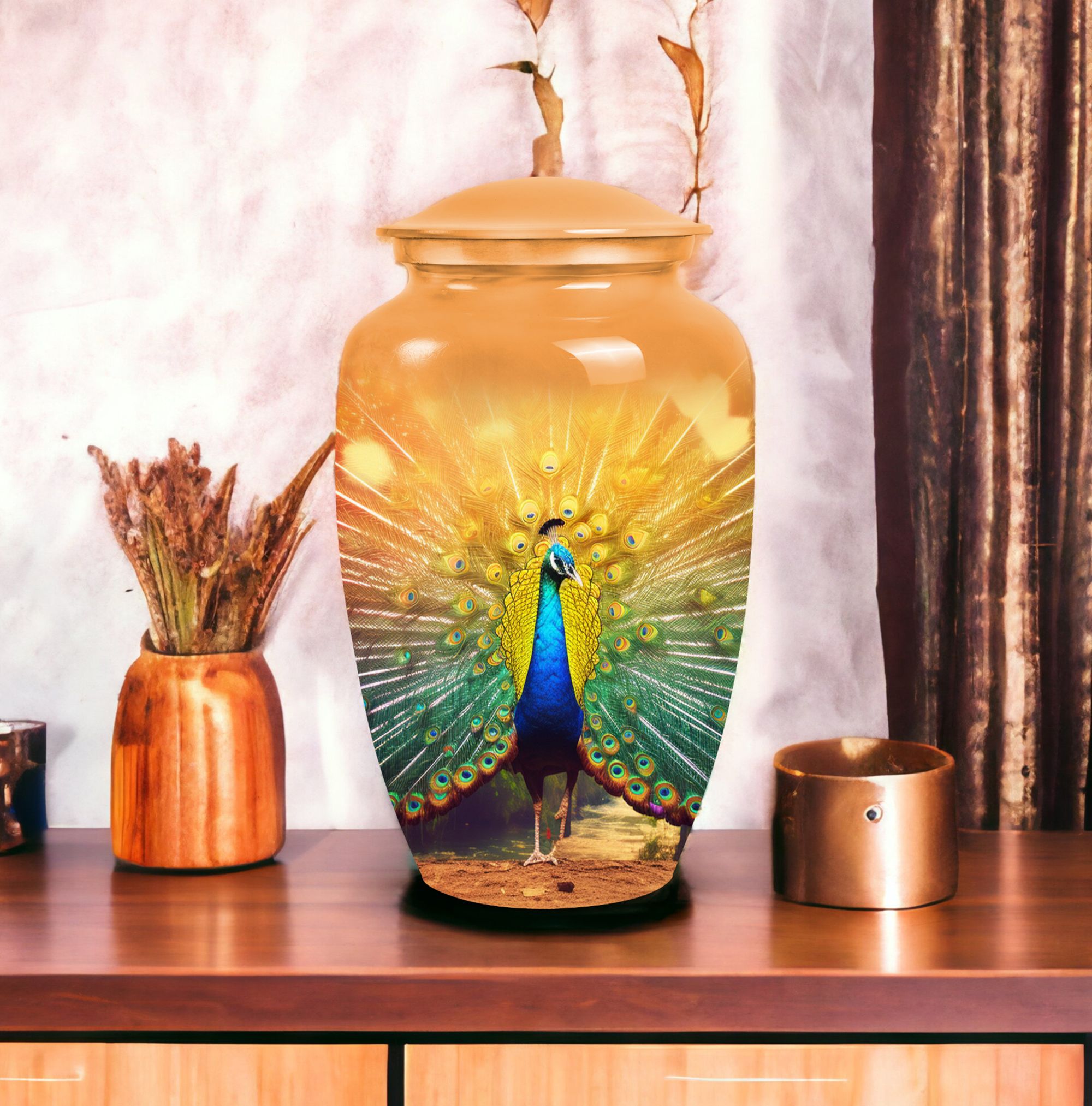 Discover the beauty of our Peacock Cremation Urn, designed to offer a respectful and dignified way of preserving the memory of your loved ones. This piece is not only a vessel for human ashes, but an exquisite work of art. Crafted for solemnity and poise, it is suitable for both males and females. The design is inspired by the regal beauty of an adult male peacock — a symbol of nobility, immortality, and spiritual awakening. With its majestic hues and intricate artwork, it brings a touch of elegance and peace to any setting. It's more than just an urn for ashes — it's a keepsake for cherishing life's fleeting moments. The perfect choice for those seeking cremation urns for human ashes that uniquely resonate with the life lived and loved. Its striking design cleverly encapsulates mystery and celebration, making it an ideal choice for those seeking urns for adult human ashes. Be it for men or specifically for women, the Peacock Cremation Urn is a profound expression of a life well lived.