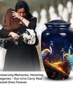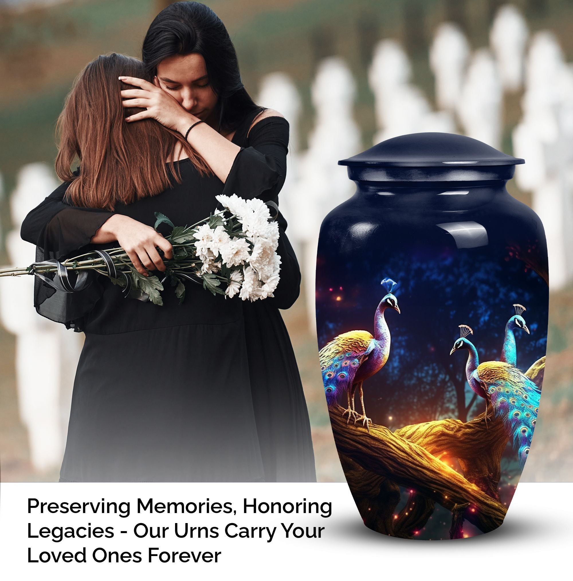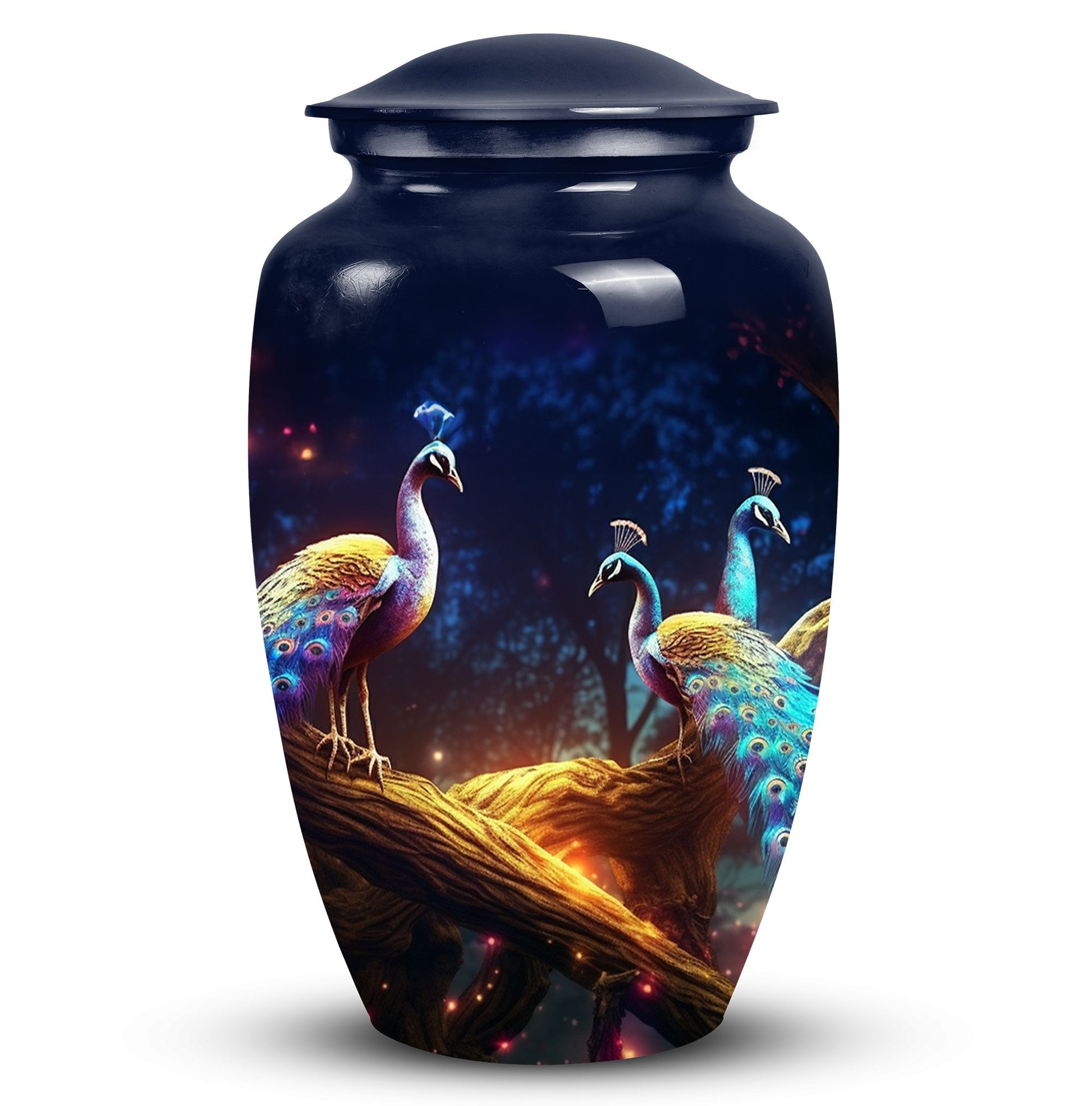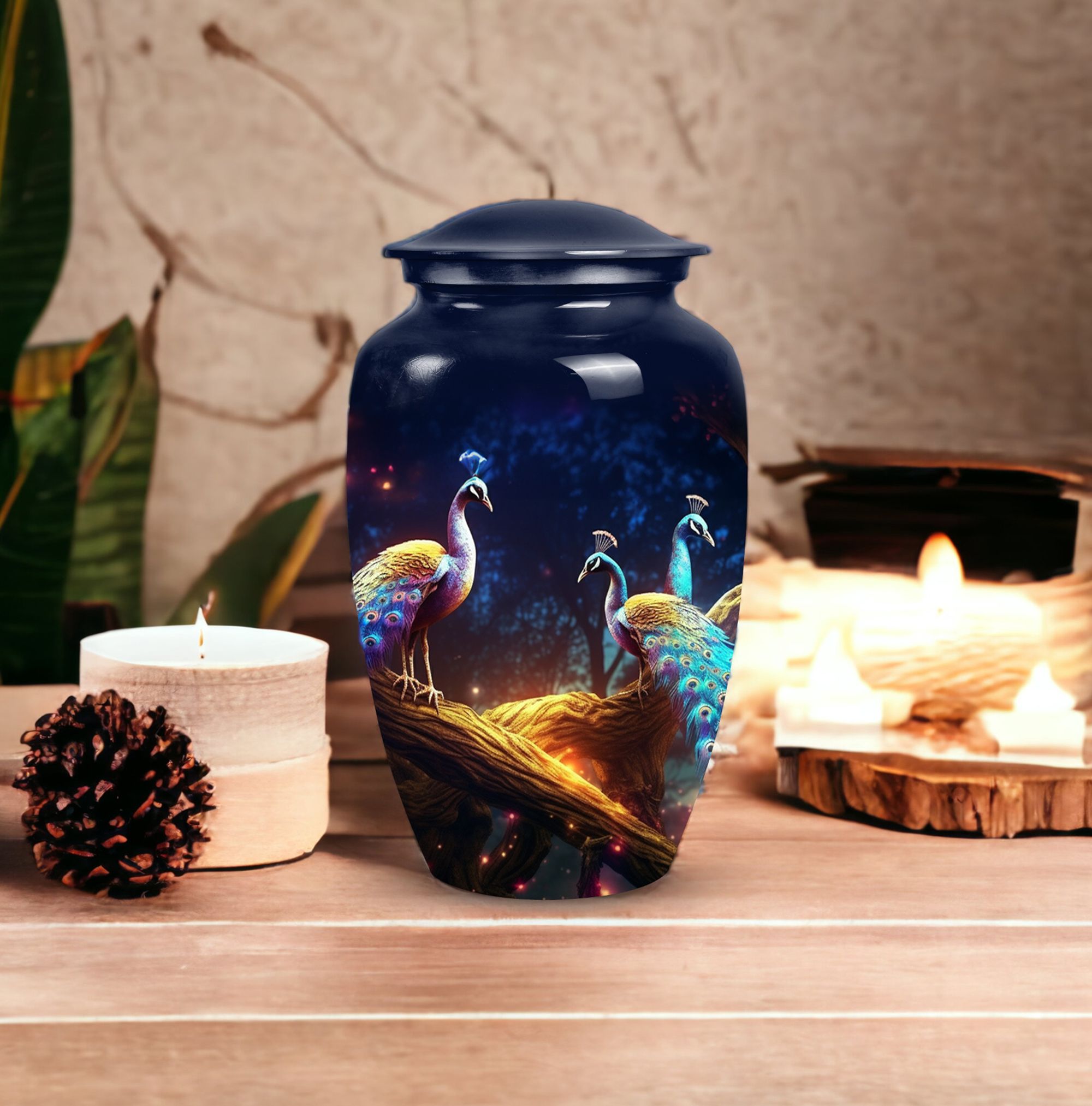 Experience the soothing comfort of remembering loved ones with our Peacock Decorative Urns. Faithfully crafted from robust metal, these distinctive cremation urns are a striking way to keep adored ones, now in spirit, closer to you. Perfectly sized as Medium Urns for Human Ashes, they simultaneously provide a serene but substantial presence. These unique urns stand out for their intricate peacock design, adding a touch of culture and originality to your memorial space. Portable urns for human ashes, these containers are simple to carry and place in your preferred location, whether at home or for burial in ground. Explore our array of well-crafted, tasteful urns that not only pay respect to your loved ones, but also compliment your decor with a blend of traditional aesthetics and modern design. Owning these special urns means keeping cherished memories alive in an artistic and visibly pleasing manner.