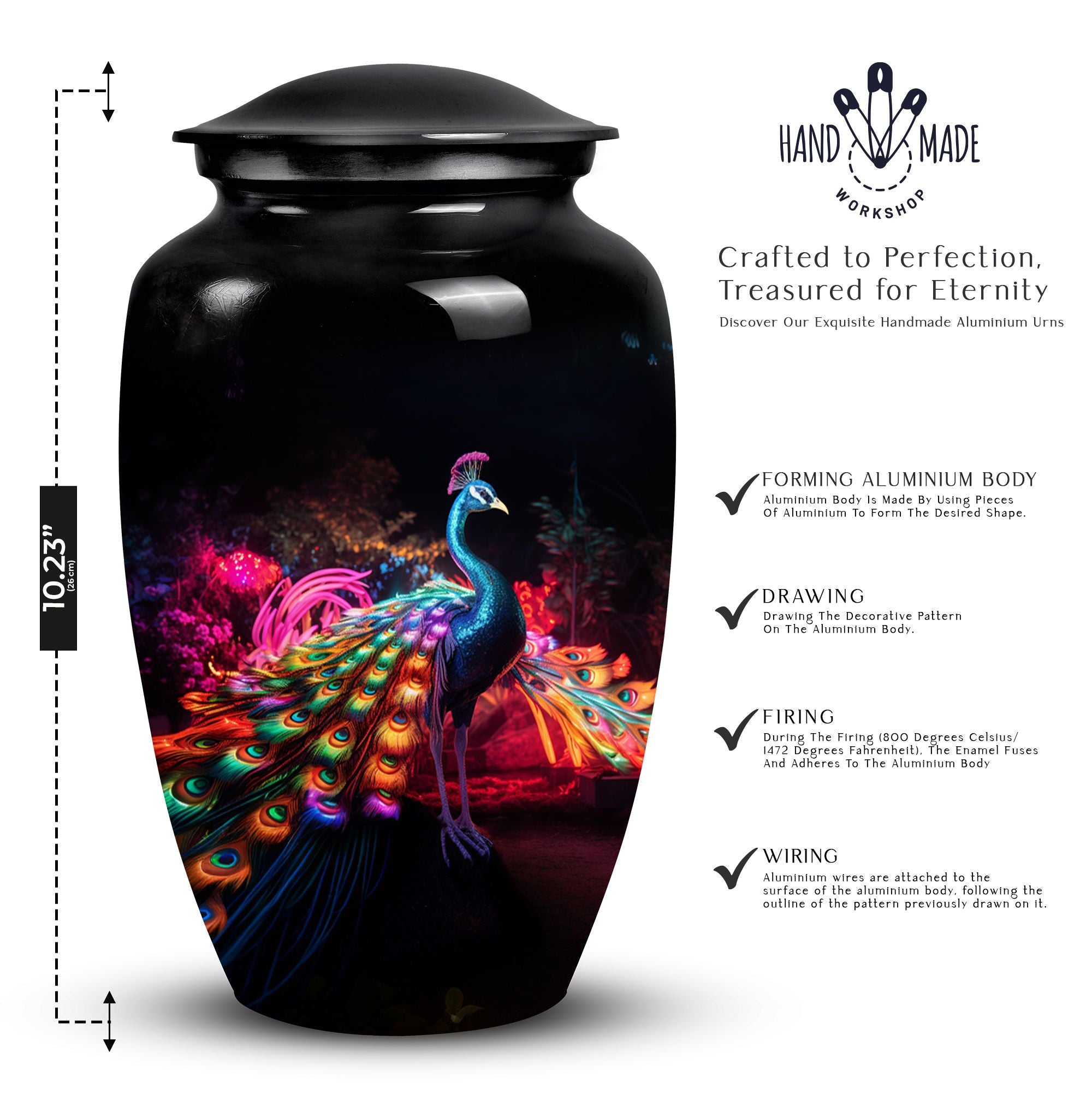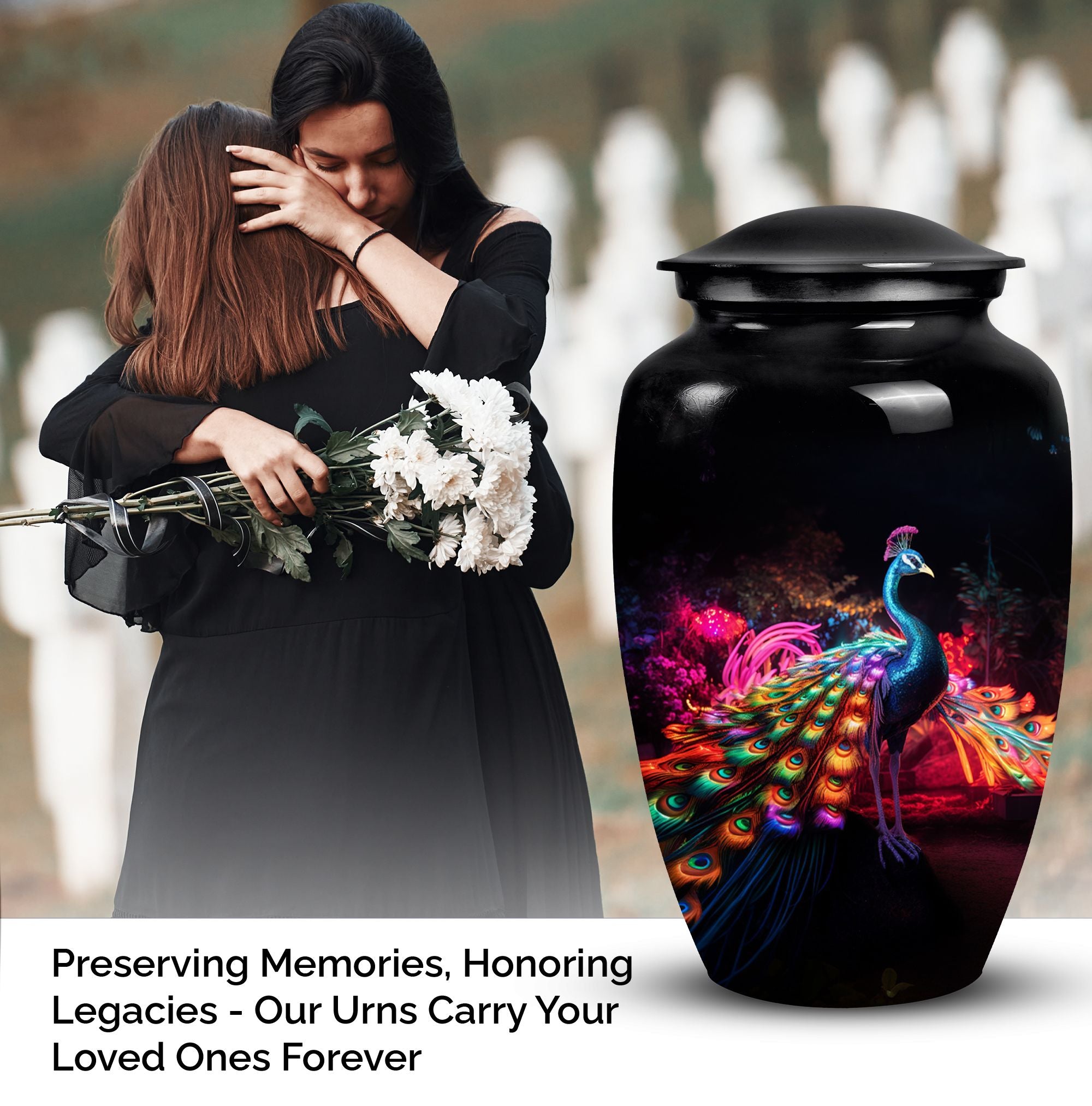 Adorn your loved one's final resting place with our exquisite Peacock Cremation Urn. This urn is not just a vessel, but a delicate piece of art that beautifully captures the essence of impermanence and rebirth, symbolized by the majestic peacock. Each urn is carefully handcrafted to serve as a dignified abode for human ashes. Ideal for both adults and seniors, the urn delicately amalgamates aesthetic appeal with the soothing serenity of a sacred ritual. Often sought out for their enduring sophistication, our burial urns encapsulate the precious complexities of life and death. Whether you're honoring a loved one's memory or planning a respectful funeral decoration, this cremation urn makes for an intimate choice. It's not just an urn for ashes; it's a poetic narrative, sewn with threads of remembrance and love. Search no more, for this exclusive cremation urn, thoughtfully designed for your moments of remembrance.