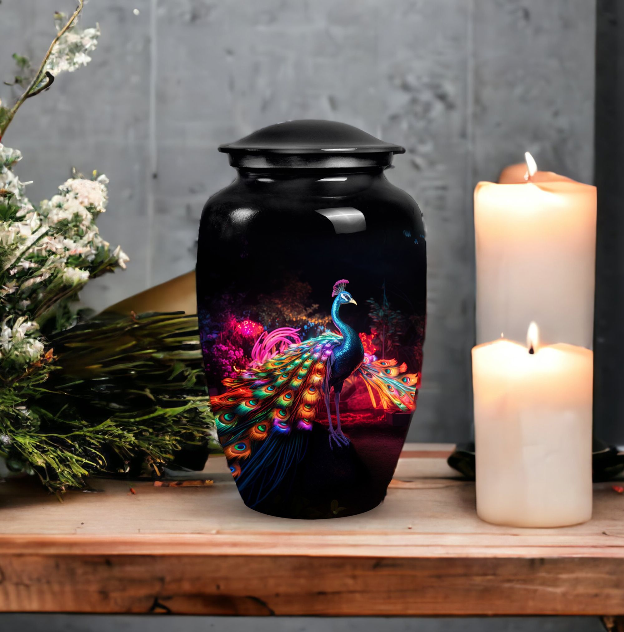 Adorn your loved one's final resting place with our exquisite Peacock Cremation Urn. This urn is not just a vessel, but a delicate piece of art that beautifully captures the essence of impermanence and rebirth, symbolized by the majestic peacock. Each urn is carefully handcrafted to serve as a dignified abode for human ashes. Ideal for both adults and seniors, the urn delicately amalgamates aesthetic appeal with the soothing serenity of a sacred ritual. Often sought out for their enduring sophistication, our burial urns encapsulate the precious complexities of life and death. Whether you're honoring a loved one's memory or planning a respectful funeral decoration, this cremation urn makes for an intimate choice. It's not just an urn for ashes; it's a poetic narrative, sewn with threads of remembrance and love. Search no more, for this exclusive cremation urn, thoughtfully designed for your moments of remembrance.