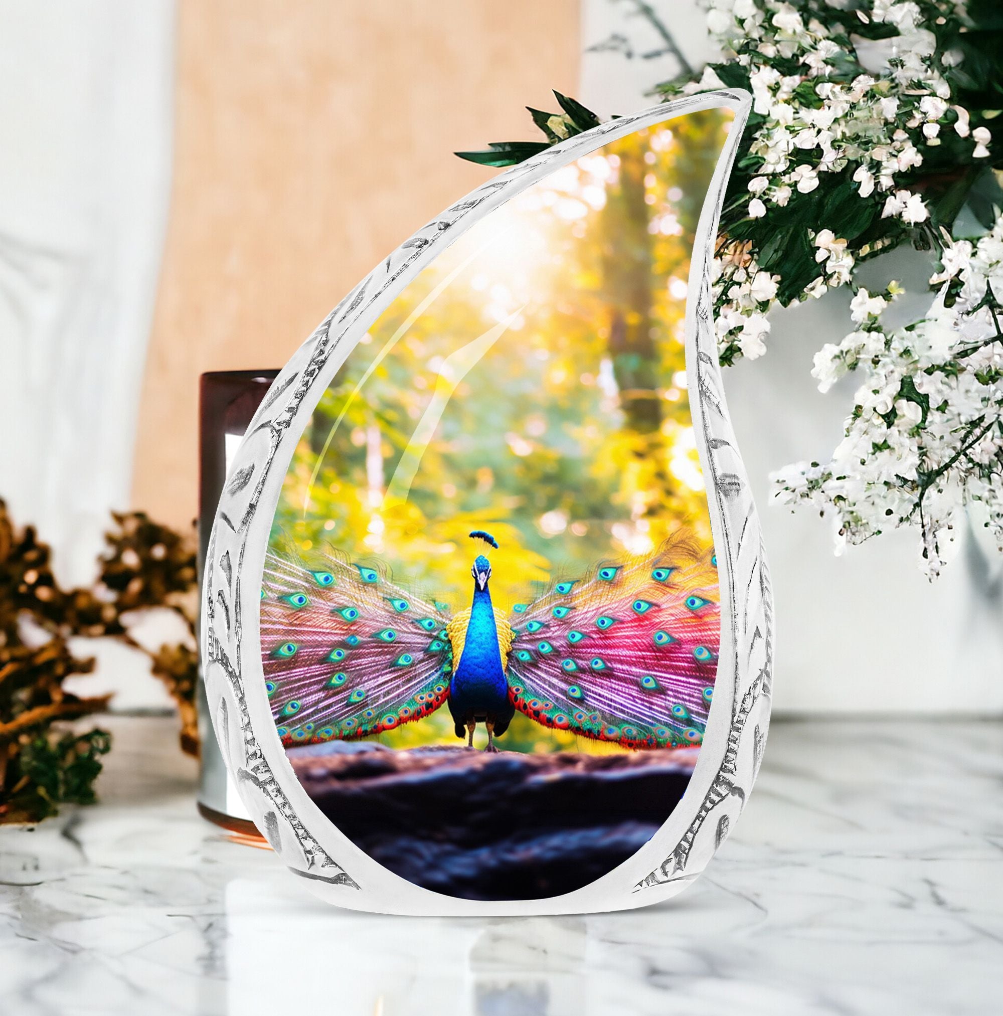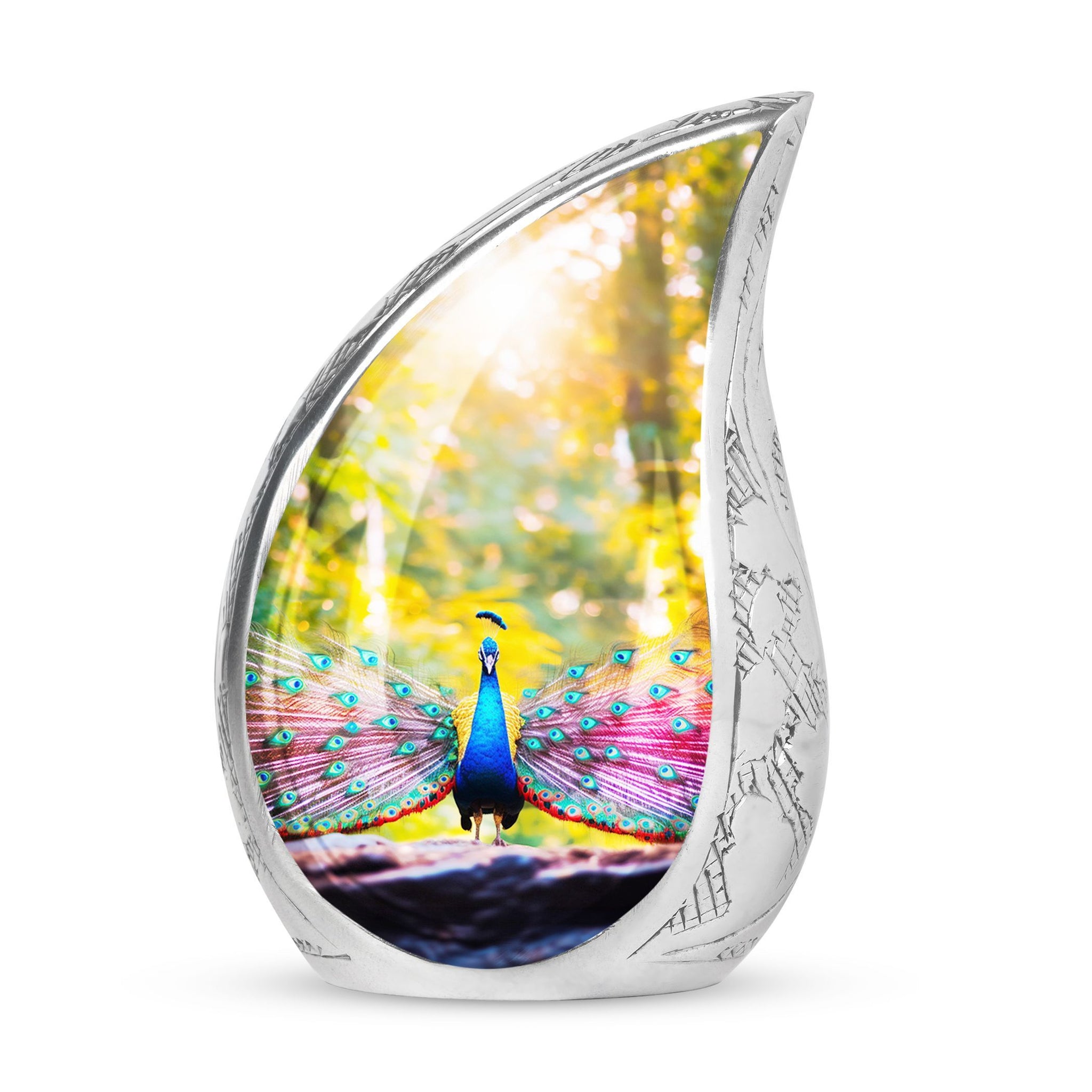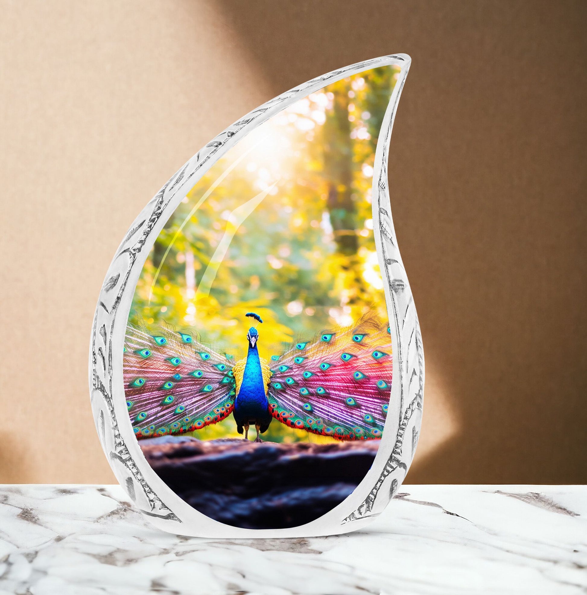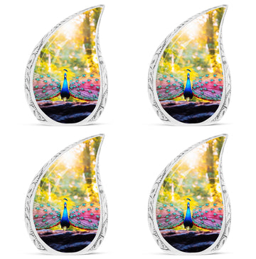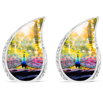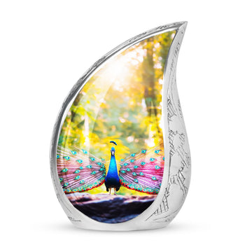 Experience a tender tribute to your loved one with our painstakingly crafted Peacock Urns for Human Ashes - an exquisite garment of remembrance that reflects the time-honored classic urn design. Constructed with high-grade Aluminium, our Large Urns are both sturdy and pleasantly lightweight at just 3.3 pounds. Each cremation urn stands at 10 inches in height and can comfortably accommodate 200 cubic inches of ashes. With customization options available, you can personalize these urns by engraving names making them bespoke tributes to the dearly departed. Each urn also comes with a velvet pouch, ensuring safe containment of the cremation ashes. Our product seamlessly blends modern design with functionality, resulting in a beautiful urn perfect for your memorial ceremonies. Please note that despite their superb craftsmanship, these urns are not just showpieces; they are large enough for adult ashes. Explore our collection of beautiful, custom urns today and find a fitting memorial for your cherished one.