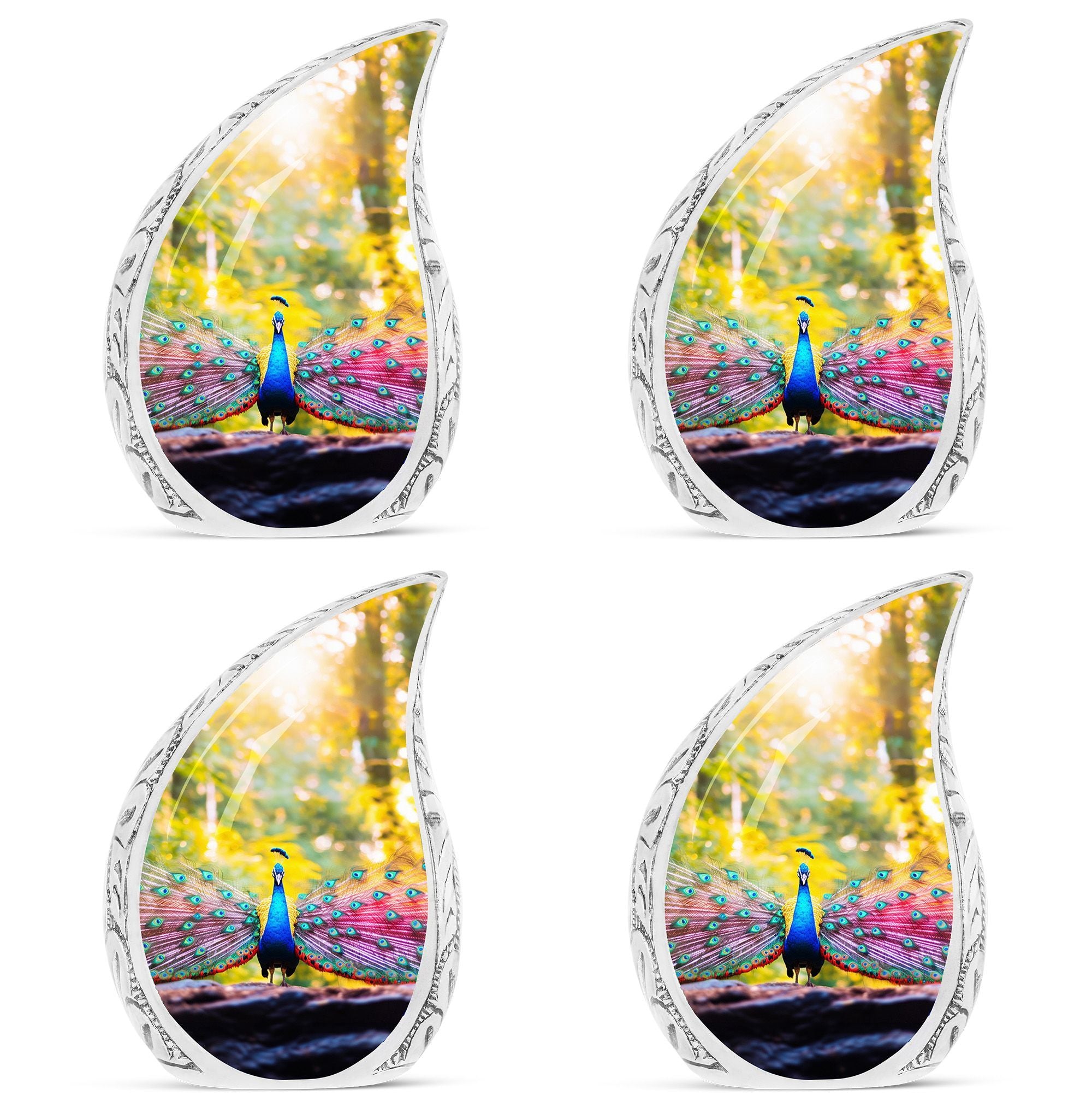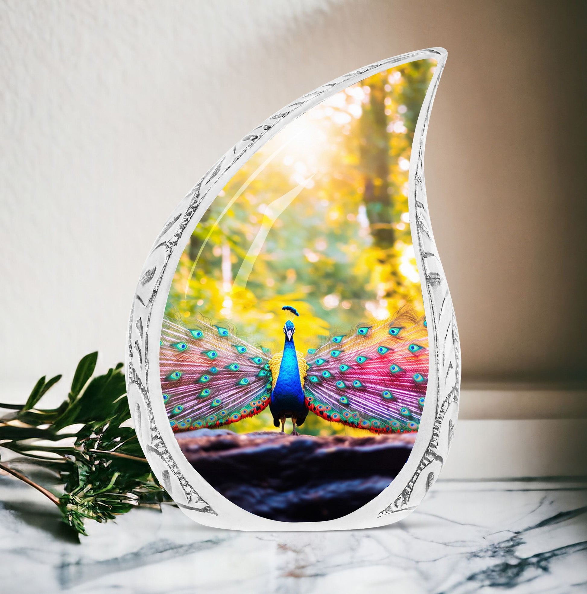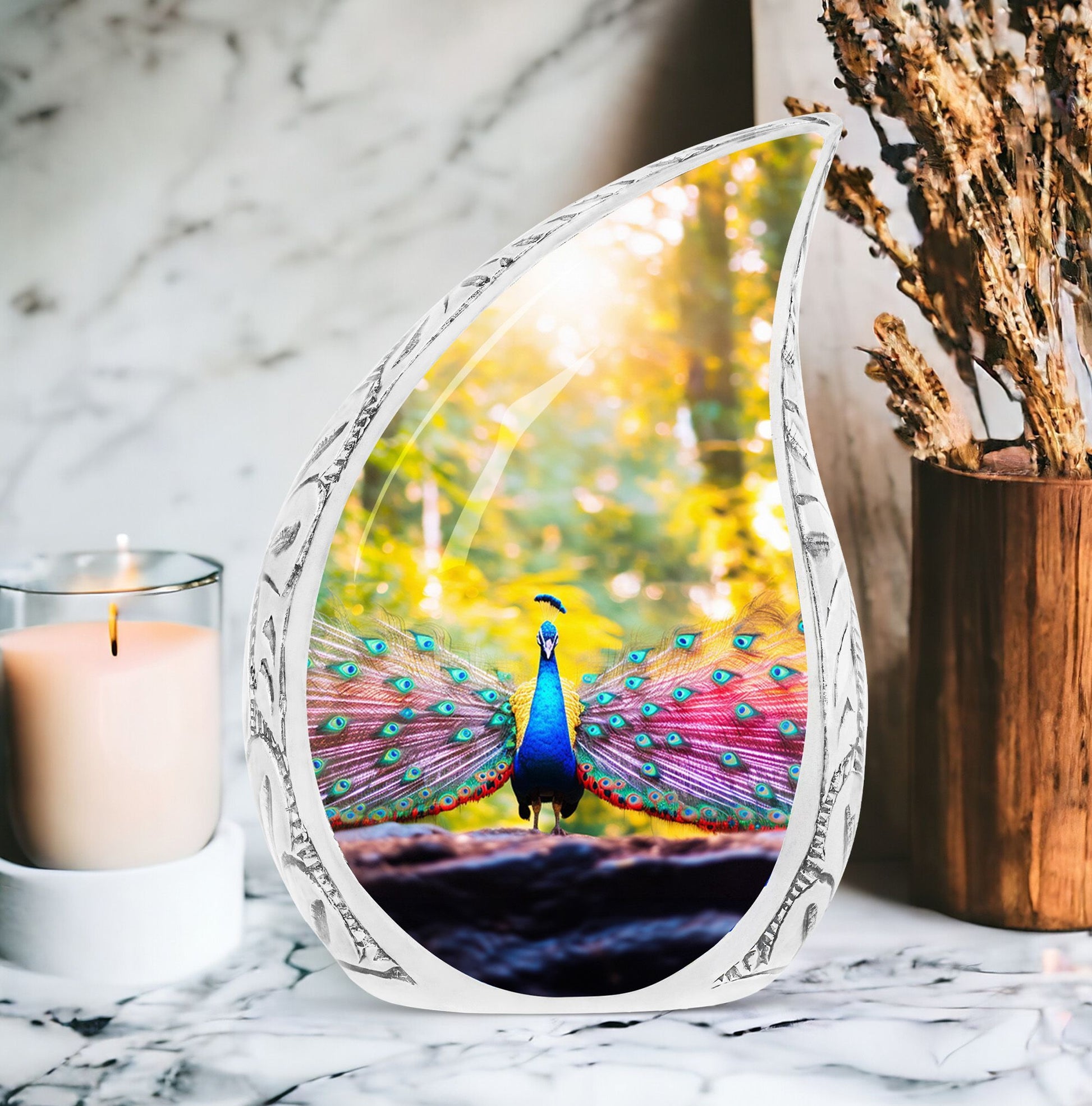 Experience a tender tribute to your loved one with our painstakingly crafted Peacock Urns for Human Ashes - an exquisite garment of remembrance that reflects the time-honored classic urn design. Constructed with high-grade Aluminium, our Large Urns are both sturdy and pleasantly lightweight at just 3.3 pounds. Each cremation urn stands at 10 inches in height and can comfortably accommodate 200 cubic inches of ashes. With customization options available, you can personalize these urns by engraving names making them bespoke tributes to the dearly departed. Each urn also comes with a velvet pouch, ensuring safe containment of the cremation ashes. Our product seamlessly blends modern design with functionality, resulting in a beautiful urn perfect for your memorial ceremonies. Please note that despite their superb craftsmanship, these urns are not just showpieces; they are large enough for adult ashes. Explore our collection of beautiful, custom urns today and find a fitting memorial for your cherished one.