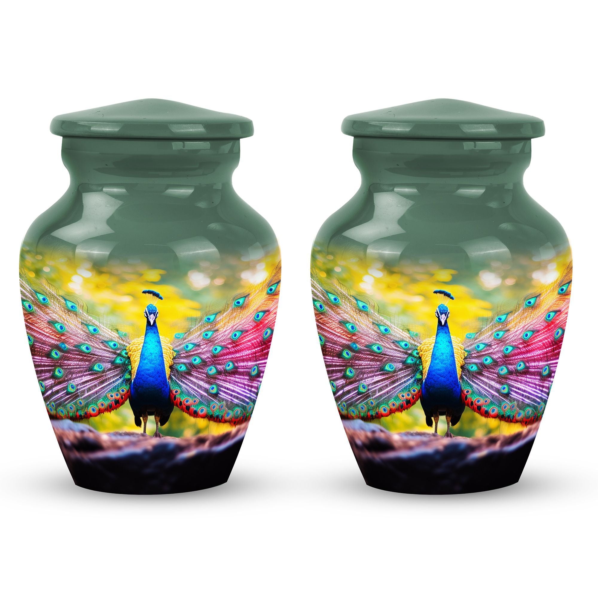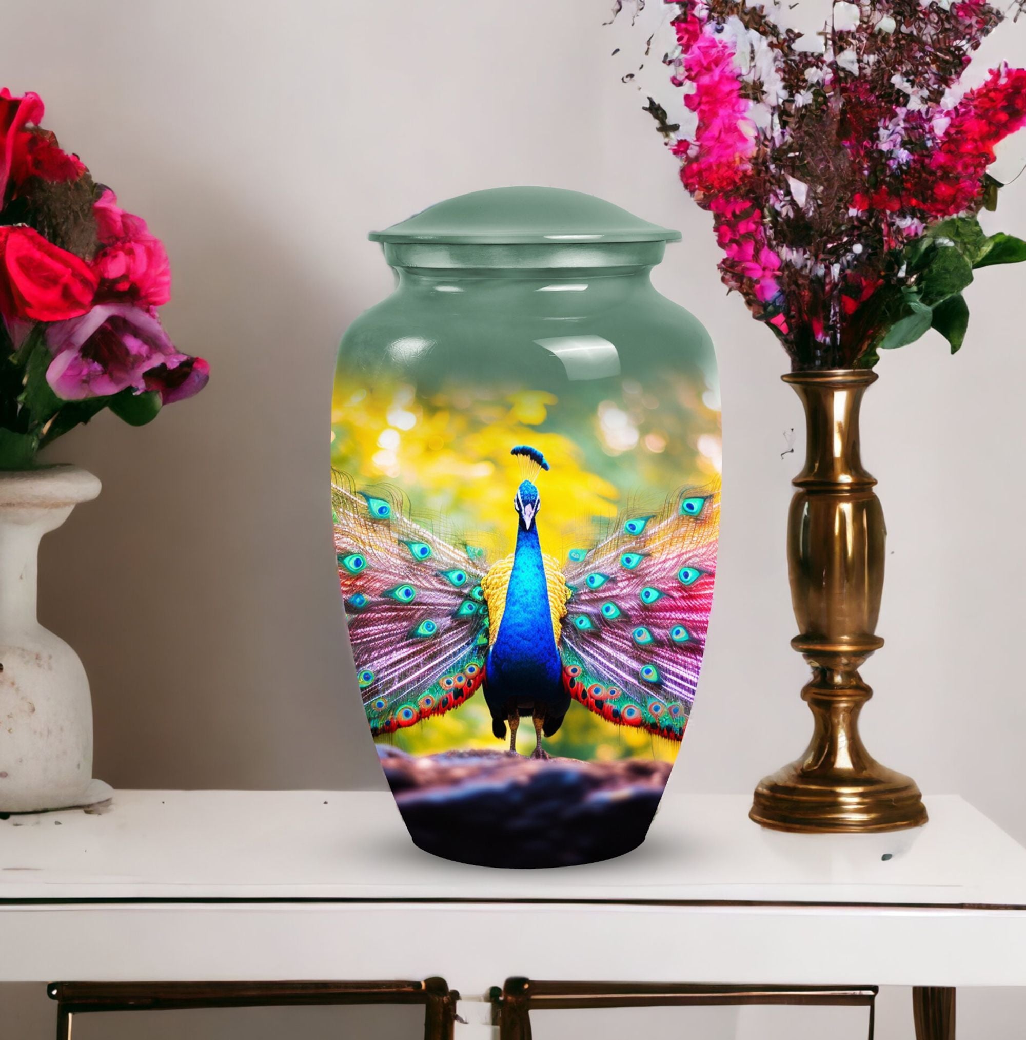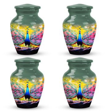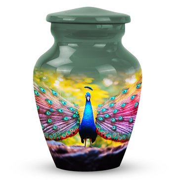 Introducing our Peacock Urns for Human Ashes, expertly crafted from quality aluminium adding a unique aesthetic while ensuring longevity. These large-sized, 3-inch urns bring a sense of serenity and respect to your keepsake or memorial. The dimensions measure an adequate 10 inches in height, weighing a sturdy 3.3 pounds, and offers room for up to 200 cubic inches of ashes, making it a practical and respectful resting place for your loved ones. Your package arrives with a velvet pouch for dignified containment and transportation of ashes. Additionally, we offer a personal touch to this memorable item. You can personalize the urn with engraved names, making this not only an urn but a commemorative piece that truly encapsulates the spirit of your loved one.