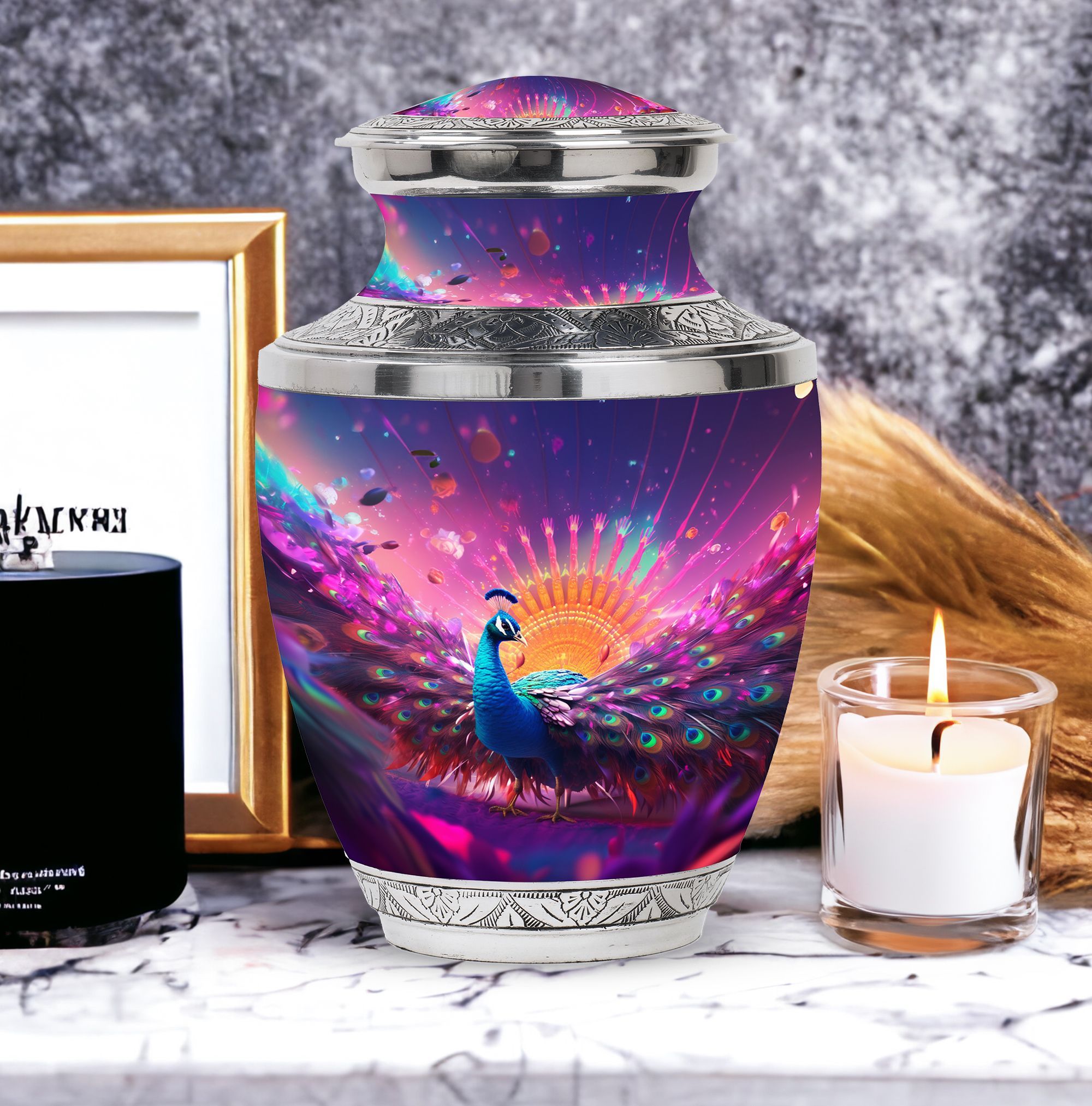 For a timeless and regal manner to pay homage to your loved one, this Peacock Memorial Urn is the ideal choice. Crafted from durable aluminium, it can contain up to 200 cubic inches of ashes, making it a perfect choice for large urns for human ashes. Our urn for ashes weighs a substantial 3.3 pounds and stands 10 inches tall, signifying the dignified presence of your dear departed. Its universal 3-inch size comfortably fits into most niches and offers a serene resting place for the valued remains. Accompanied by a soft velvet pouch for containment of ashes, it ensures a respectful and secure mode of preservation. Elevate the urn for ashes with a personal note by engraving names, thereby adding a touch of intimacy. Although the classic urn design is engaging and noteworthy, it is the emotional significance which makes this memorial urn meaningful. This product, with the versatile keyword phrase 'customized urns for ashes for adults', radiates solemnity aptly. It's an elegant tribute, encapsulating your heartfelt dedication and marking a unique testament of love.