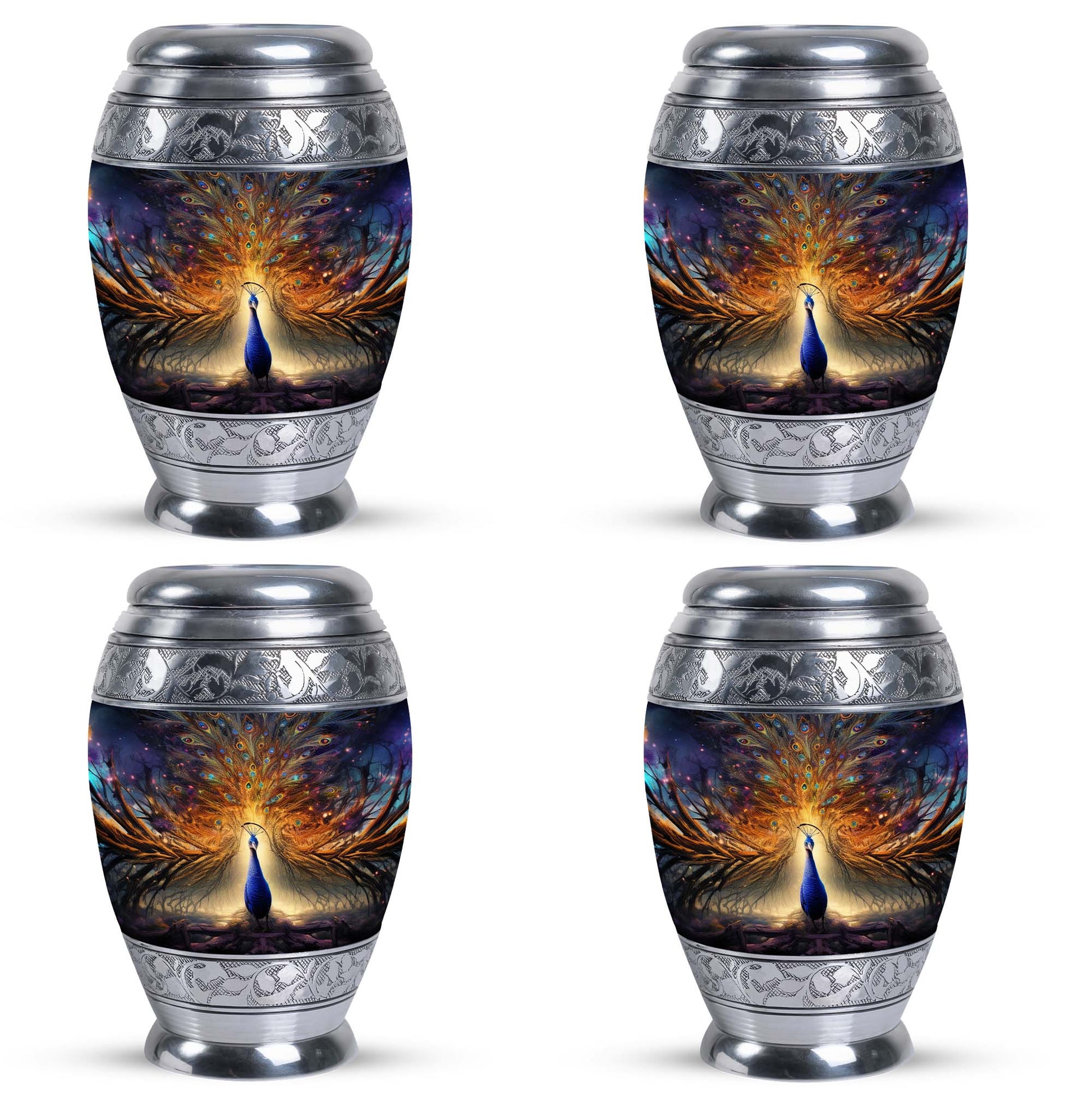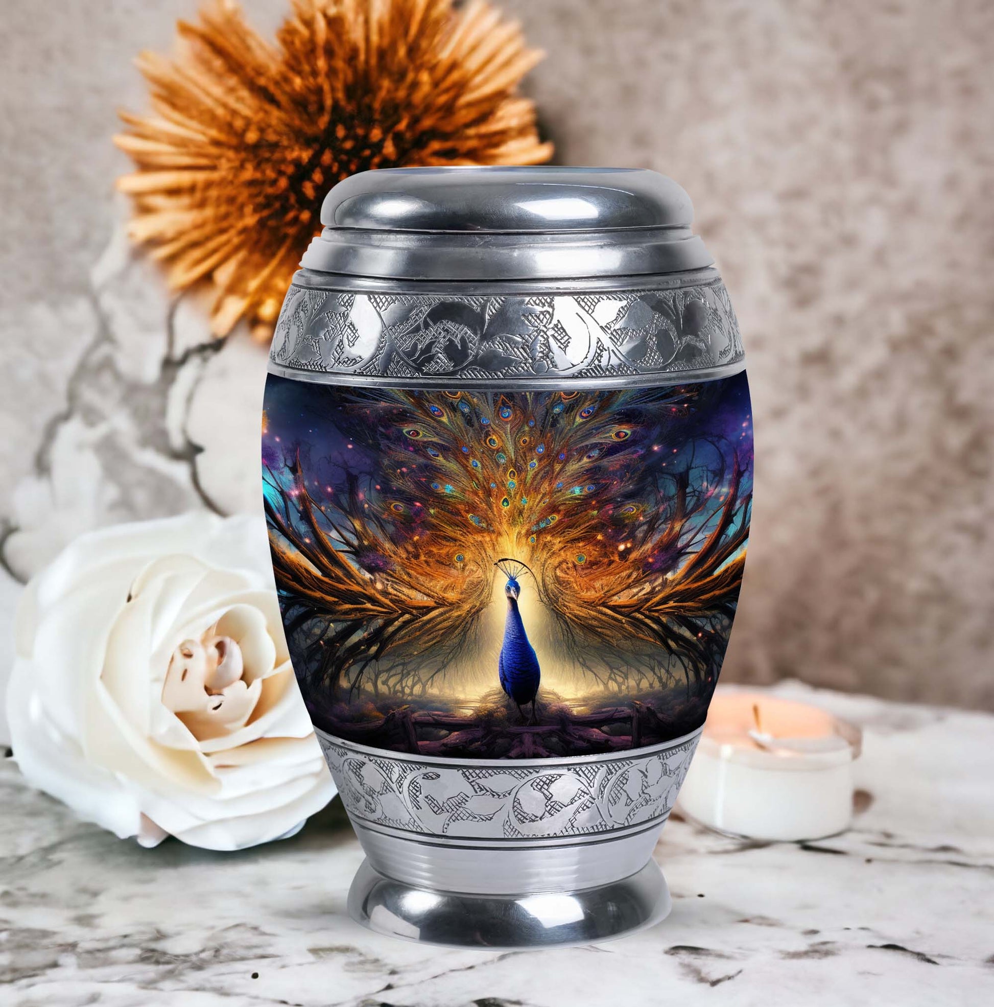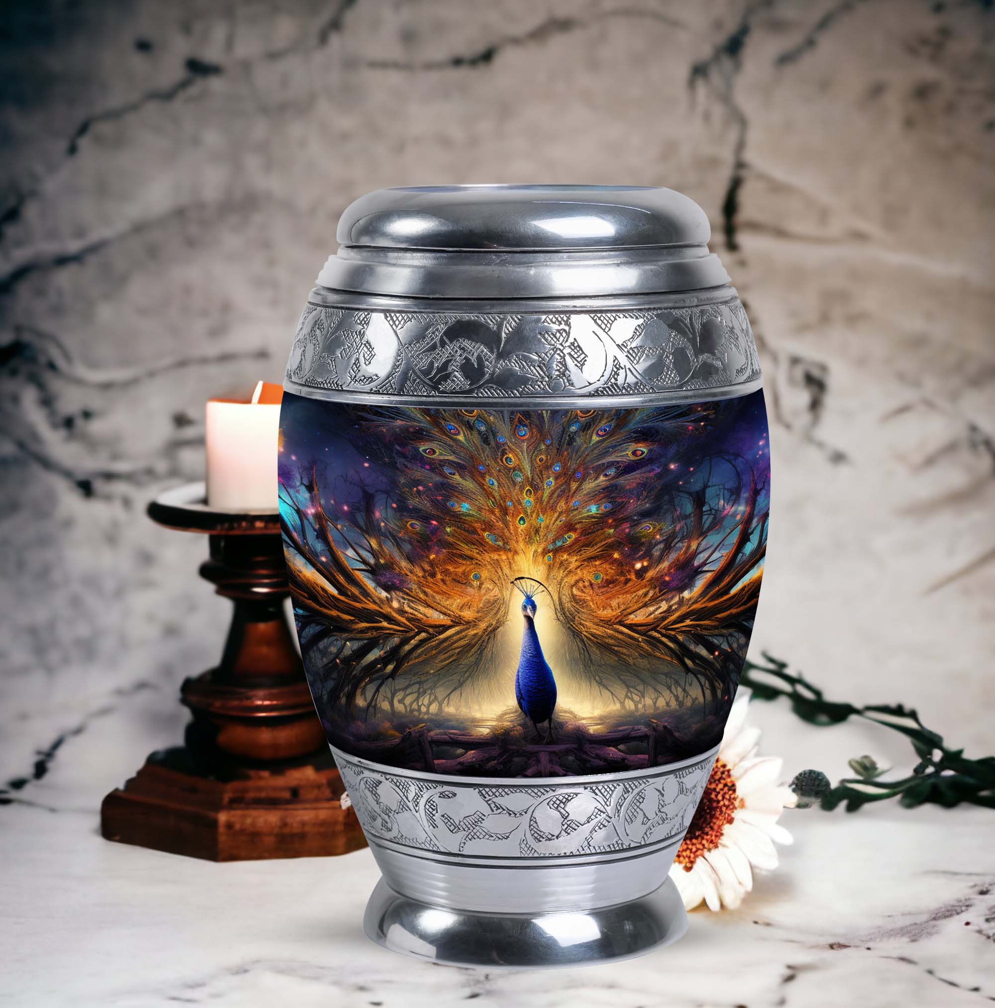 Cherish the memory of your beloved parents with our beautiful 10-inch high large Peacock Urns, made specifically for acting as a keepsake of those who meant the most to you. Crafted with exceptional quality, these memorial urns are made of durable Aluminium, tipping the scales at a sturdy 3.3 pounds. These urns are sized just right at 3 inches, making them perfect to fit in any sacred spot in your home. With a capacity of up to 200 cubic inches, these urns can hold the ashes securely, coming with a gentle velvet pouch. Each urn holds special significance and can be customized to your liking. Personalize these collectibles by engraving names or tender messages that mean something unique to you. The classic urn style manifests respect and love in their simplest forms, and our design is an ode to this timeless aesthetic. This piece is not just an urn; it’s a homage to the special bond you shared with your beloved mother or father. Perfect as a unique burial urn or even a decorative urn in your house, remembering, after all, is an act of love.
