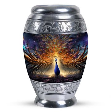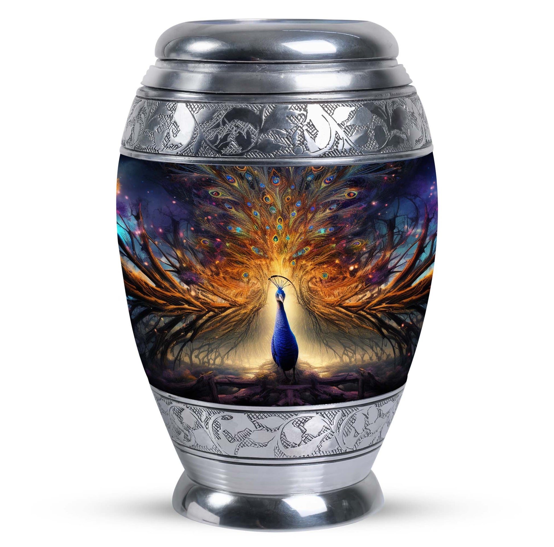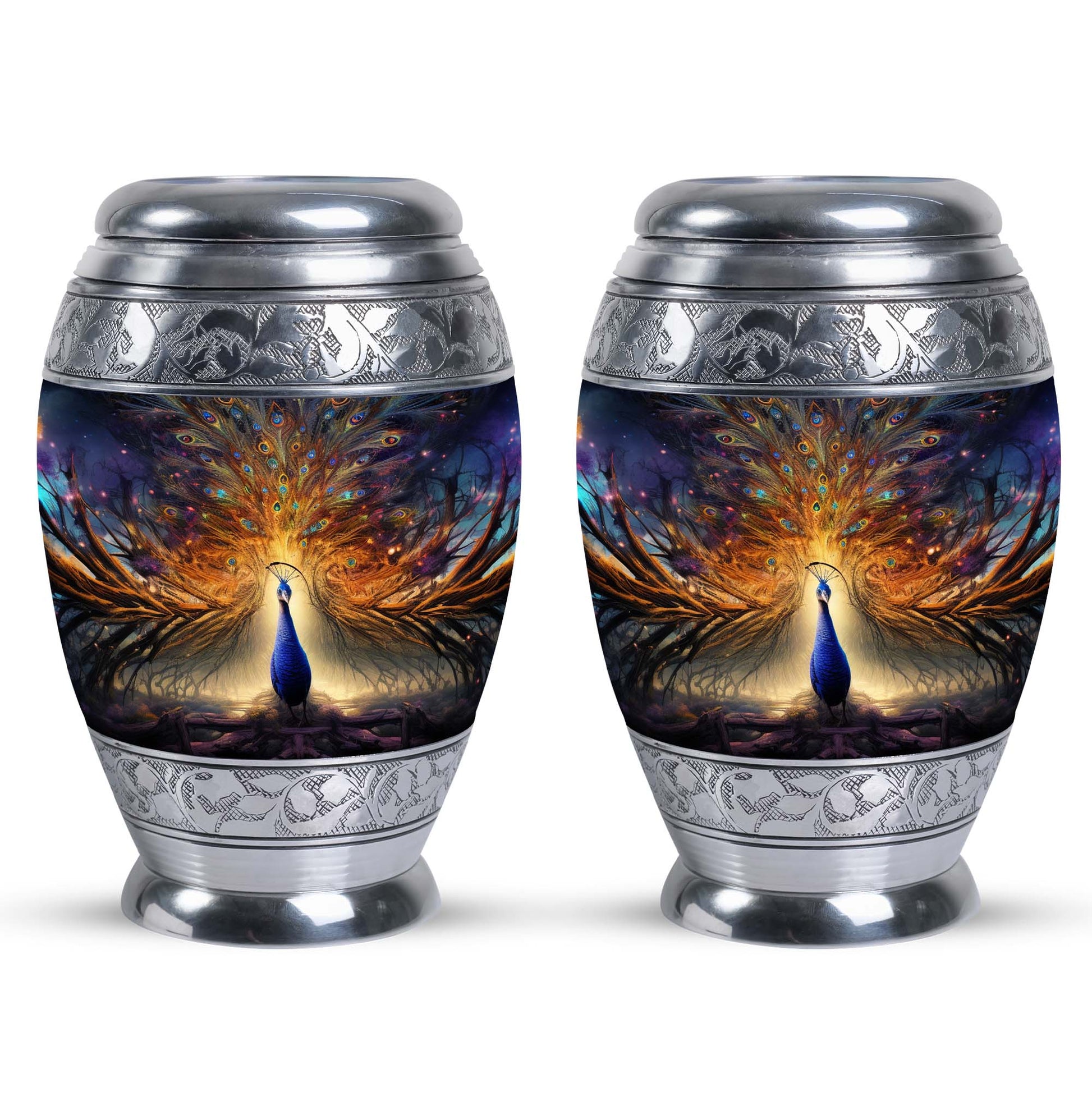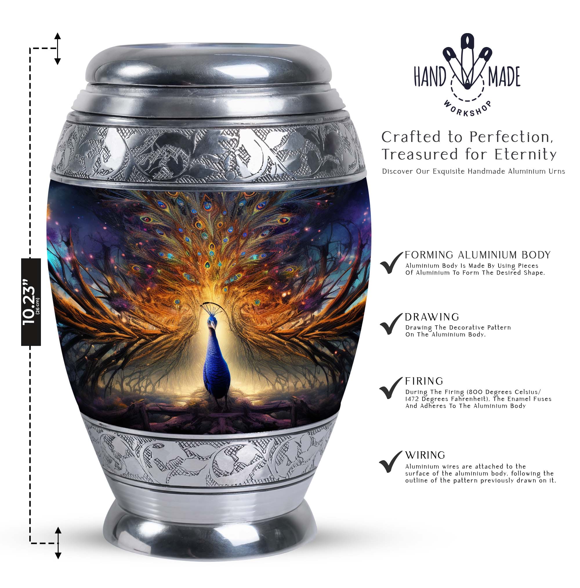 Cherish the memory of your beloved parents with our beautiful 10-inch high large Peacock Urns, made specifically for acting as a keepsake of those who meant the most to you. Crafted with exceptional quality, these memorial urns are made of durable Aluminium, tipping the scales at a sturdy 3.3 pounds. These urns are sized just right at 3 inches, making them perfect to fit in any sacred spot in your home. With a capacity of up to 200 cubic inches, these urns can hold the ashes securely, coming with a gentle velvet pouch. Each urn holds special significance and can be customized to your liking. Personalize these collectibles by engraving names or tender messages that mean something unique to you. The classic urn style manifests respect and love in their simplest forms, and our design is an ode to this timeless aesthetic. This piece is not just an urn; it’s a homage to the special bond you shared with your beloved mother or father. Perfect as a unique burial urn or even a decorative urn in your house, remembering, after all, is an act of love.