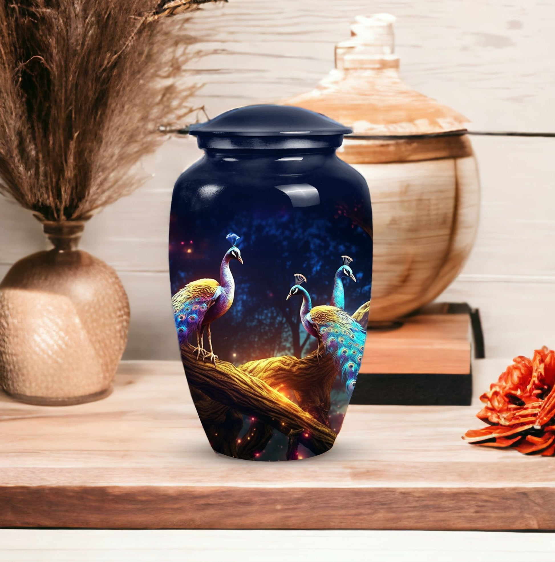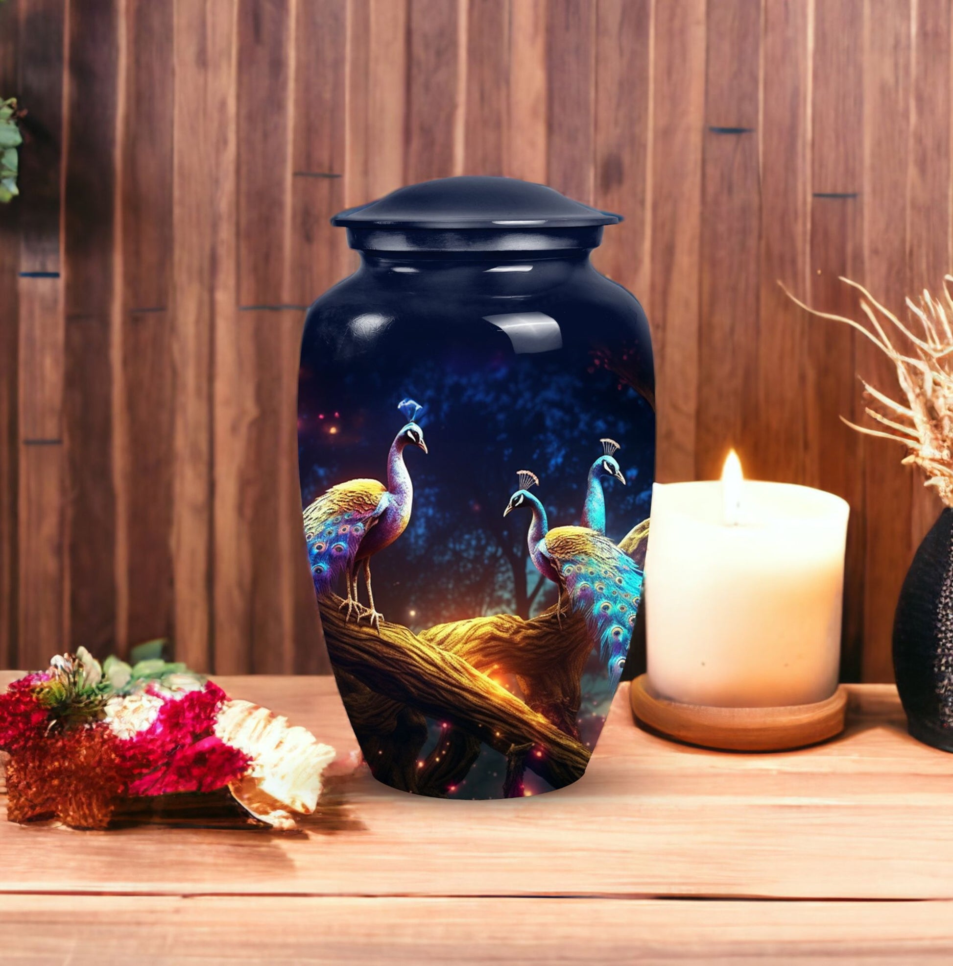 Discover the exquisite Peacock Memorial Urn - a heartfelt solution for preserving the memory of your treasured ones. Sized at 3 inches, this premium, small urn for ashes, charms with its unique Classic Urn style. Fashioned from durable aluminum, it ensures long-lasting use while its substantial weight of 3.3 pounds signals absolute quality. Pay a fitting tribute with this elegant cremation urn that has the capacity to house up to 200 cubic inches of cremated remains. We offer personalized engraving for a truly unique touch. Each piece comes with a velvet pouch for dignified containment of ashes. Ideal for those seeking large urns or metal cremation urns, this urn elegantly bridges the gap between function and sentiment. In the realm of Memorial Urns for Ashes, Personalized Urns for Human Ashes, and Urns for Human Remains, our Peacock Urn stands out with its remarkable balance of design and dignity.