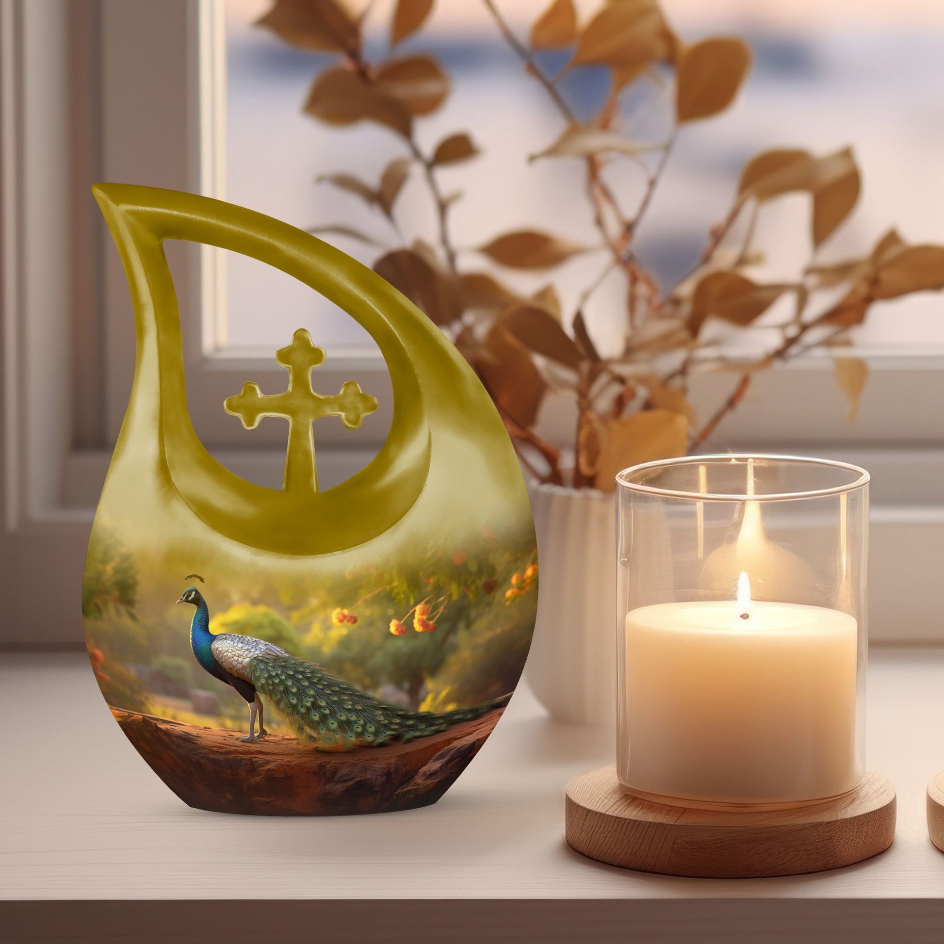 The Golden Peacock Cremation Urn captures the brilliance of a life well lived — a lasting urn for cremation ashes that reflects honor, hope, and the eternal bond shared with your loved one.