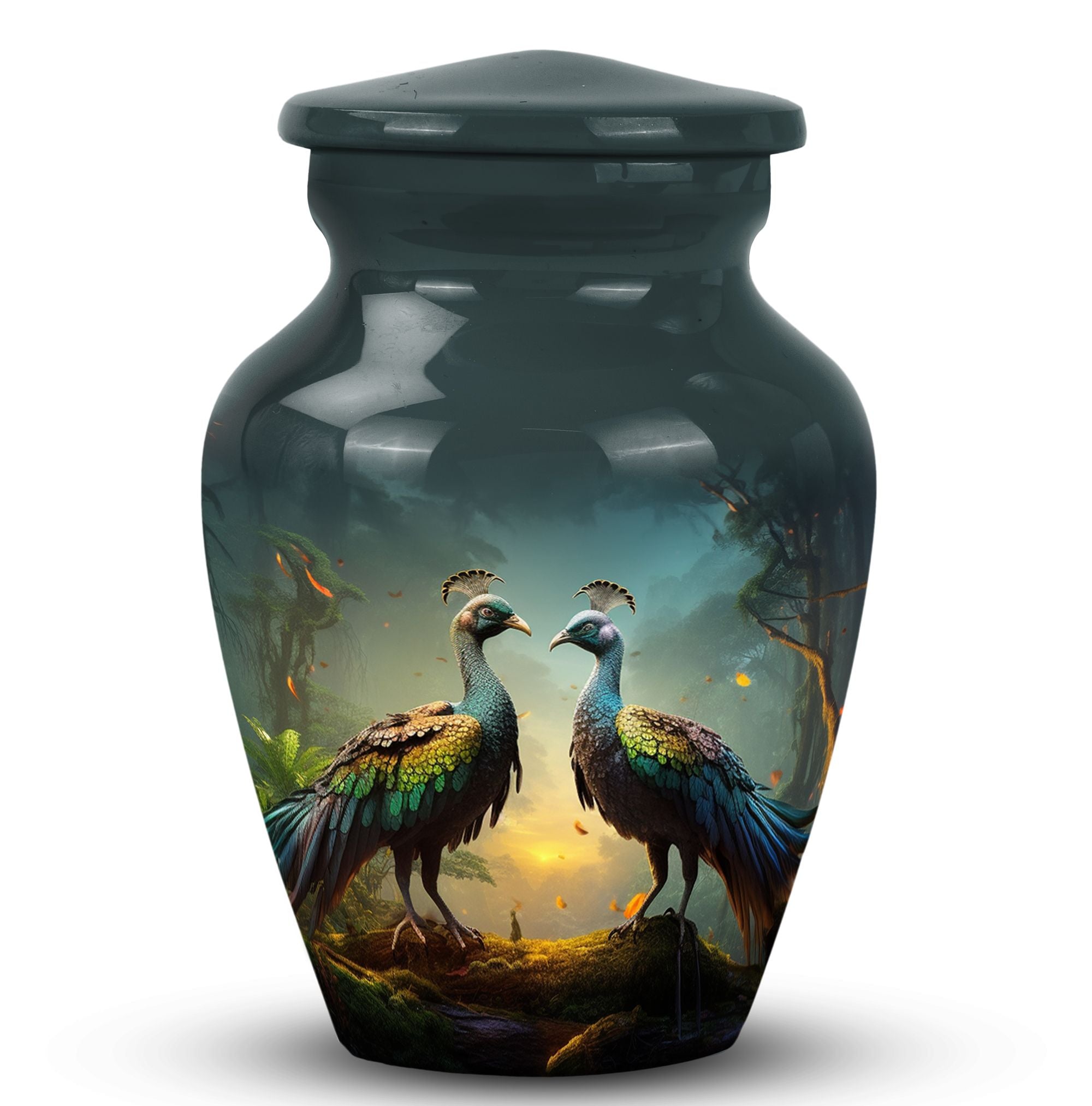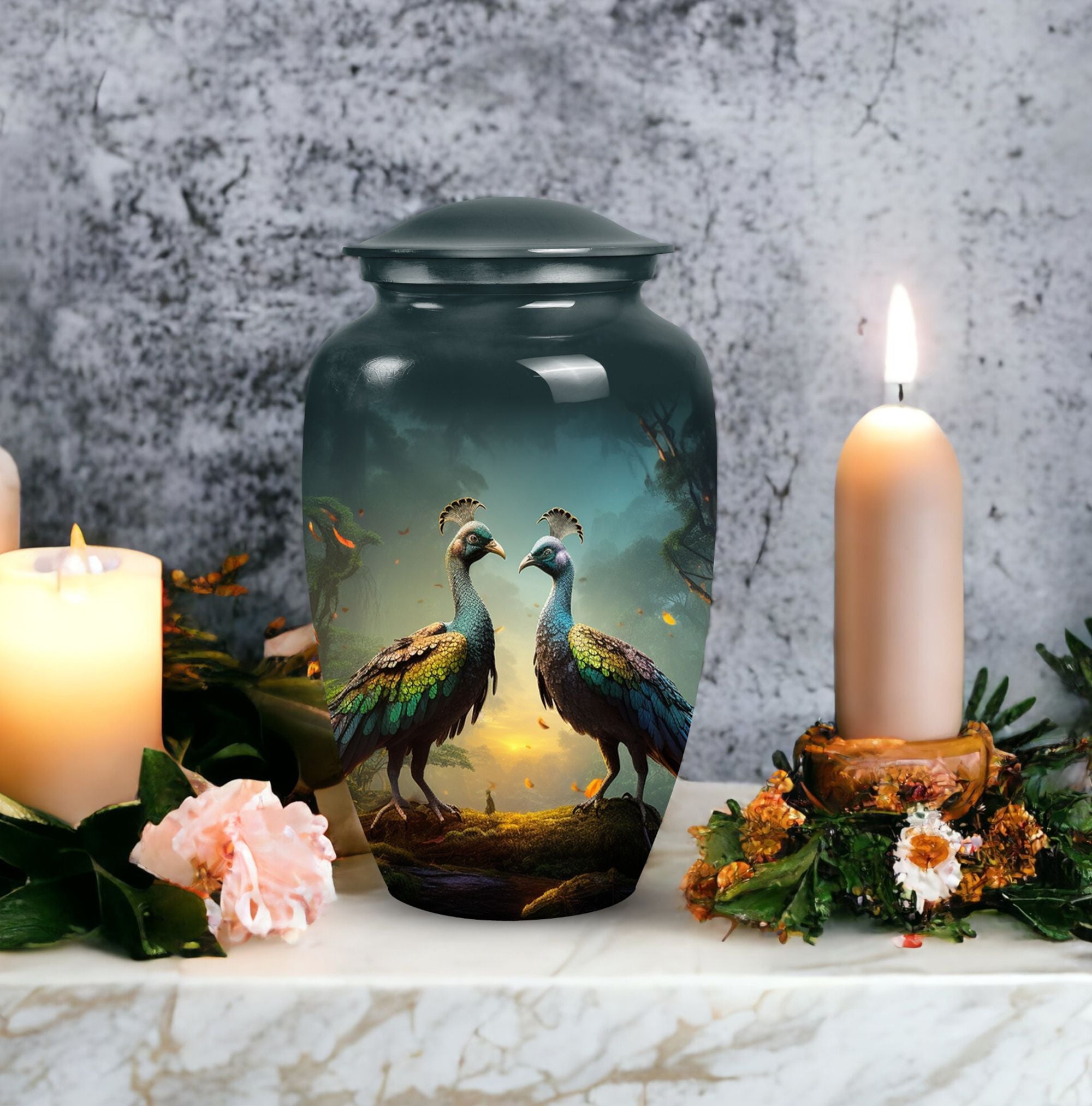 Our Peacock Urns for Human Ashes are not only an exceptional memento, but also a mesmerizing artwork. With its classic urn silhouette, your loved one's memory will be honored in an elegant and timeless style. Crafted with diligence, our large urns are made from sturdy, corrosion-resistant aluminum ensuring its longevity. The container, spanning a height of 10 inches, can securely accommodate 200 cubic inches of mortal remnants. Weighing a solid 3.3 pounds, the urn is truly exploration of solemn aesthetics and unfading remembrance. The package comes with a plush velvet pouch, bestowing additional layer of protection for the treasured ashes. And for a more personal touch, avail of our customization feature by engraving the names of your departed loved ones. Tastefully designed, our keepsake urn is more than just a container for human ashes, it’s an ever-lasting memoir. This item makes an ideal choice for urns for men's ashes, particularly, urns for dad's ashes. Experience the tranquility that our memorial urns deliver.