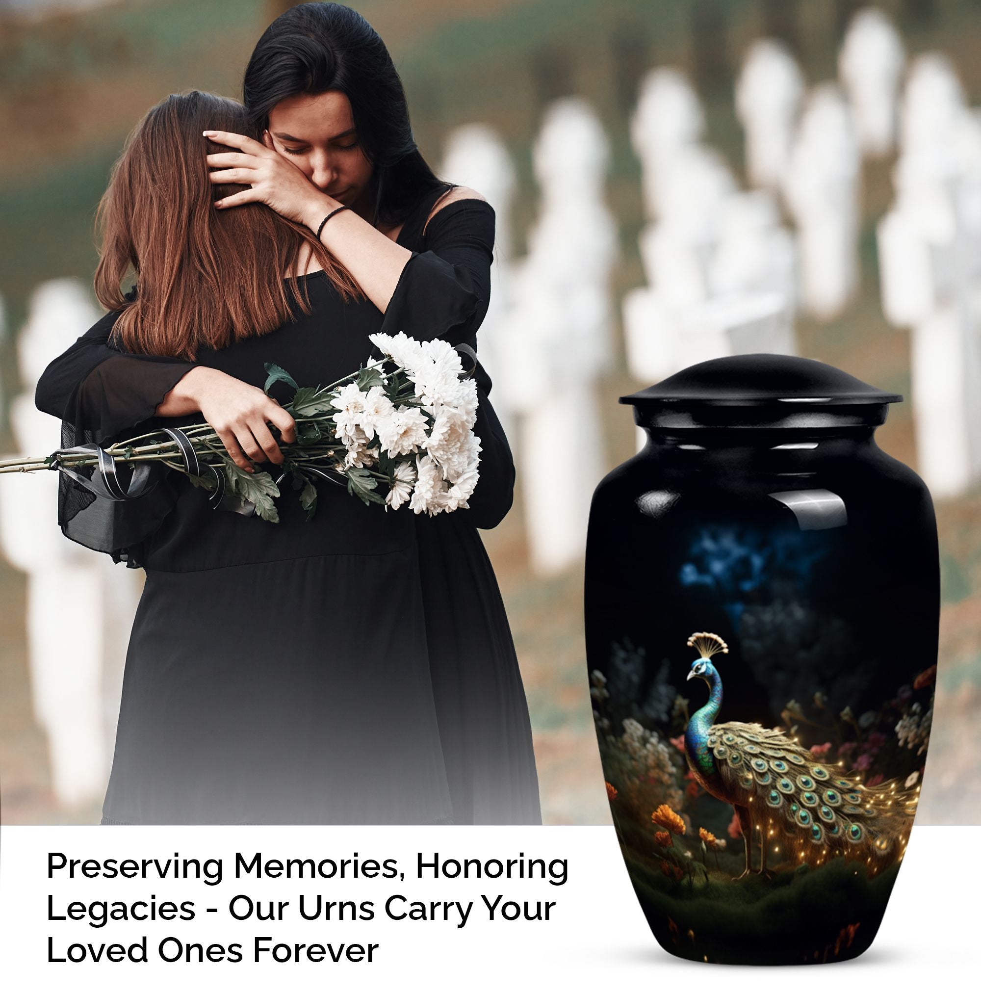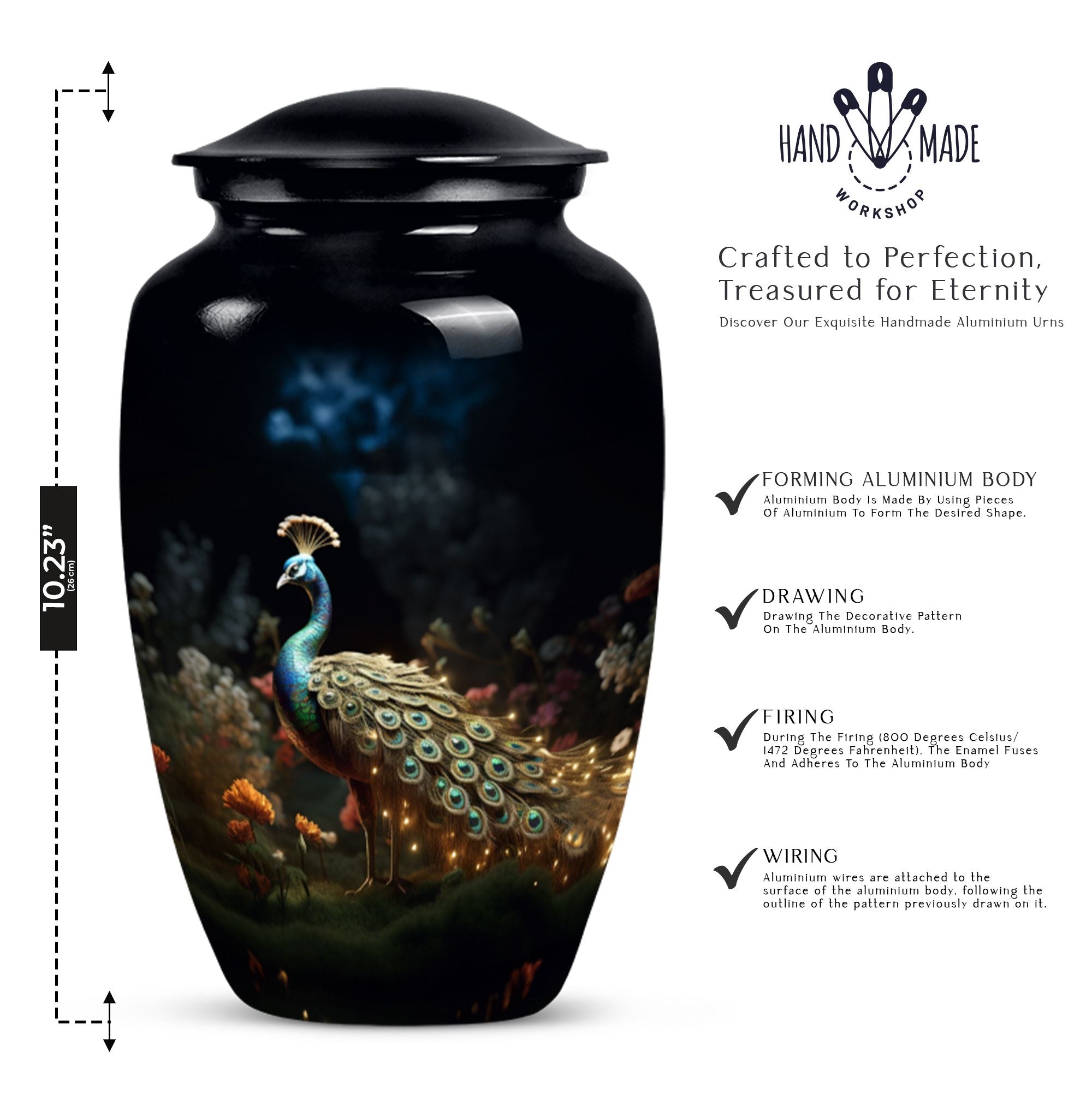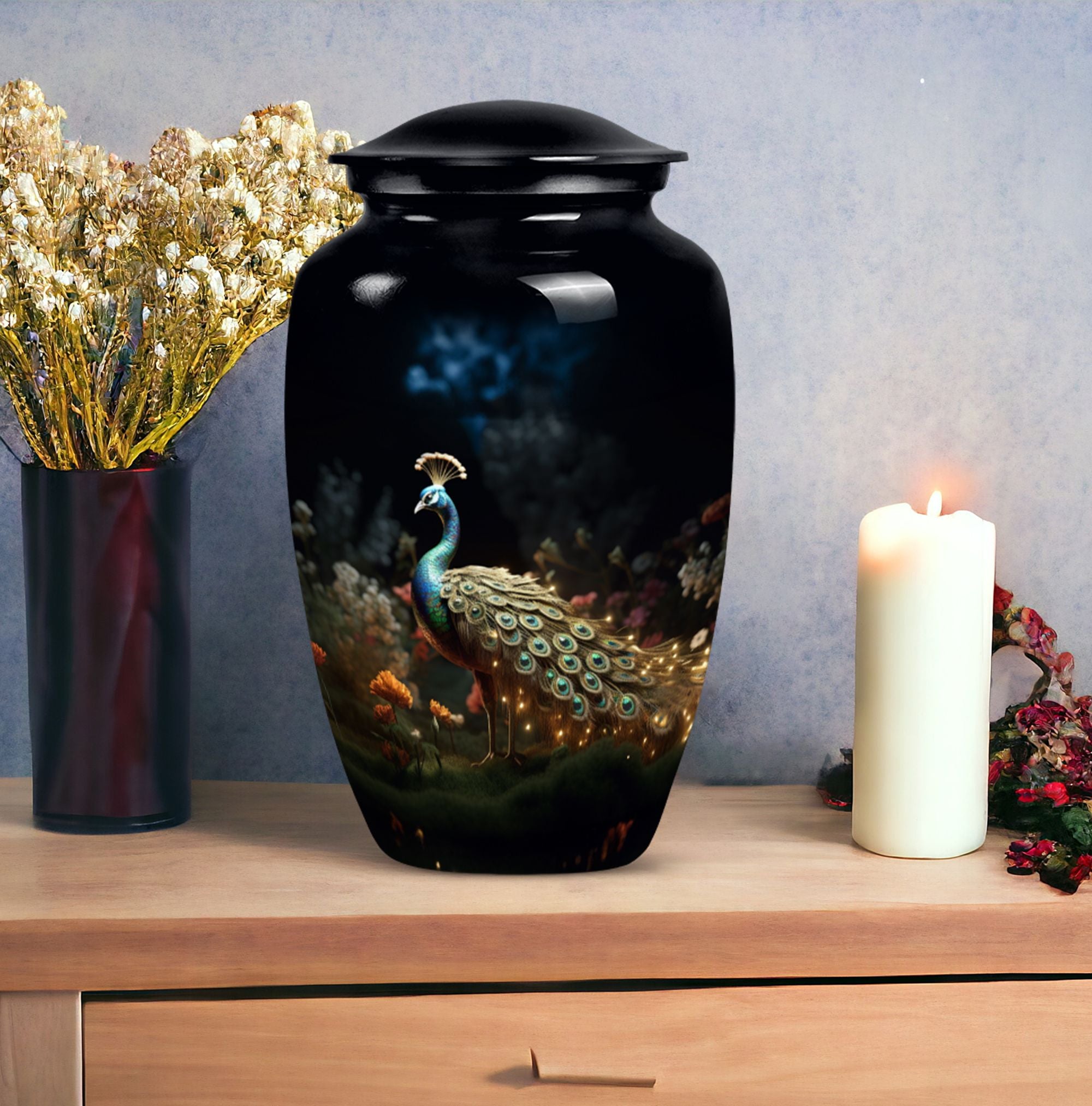 With our Peacock Urn, commemorate the life of a loved one in an unparalleled way. This handcrafted urn is perfect for preserving the ashes of adult women, enhancing the peace of memory with its distinctive beauty. Ideal for the sophisticated matriarch in your life – or perhaps a father whose presence was hard to miss. If you're in search of urns for human ashes, adult male or female, this is an exceptional choice. Thoughtfully designed to serve as a unique memorial, it's more than just an urn for cremation ashes - it's a way to pay tribute while beautifying your home. Notably, it is crafted with meticulous attention to detail, reflecting the light in an array of colors like the grand display of a peacock. This cremation urn brings a touch of nobility and dignity, perfect for cherishing the memories held within it. By choosing our peacock urn, you are honoring a life lived with grace and style. It's not just about urns for ashes, adult female mother or father—it’s about giving your loved one a worthy final resting place.