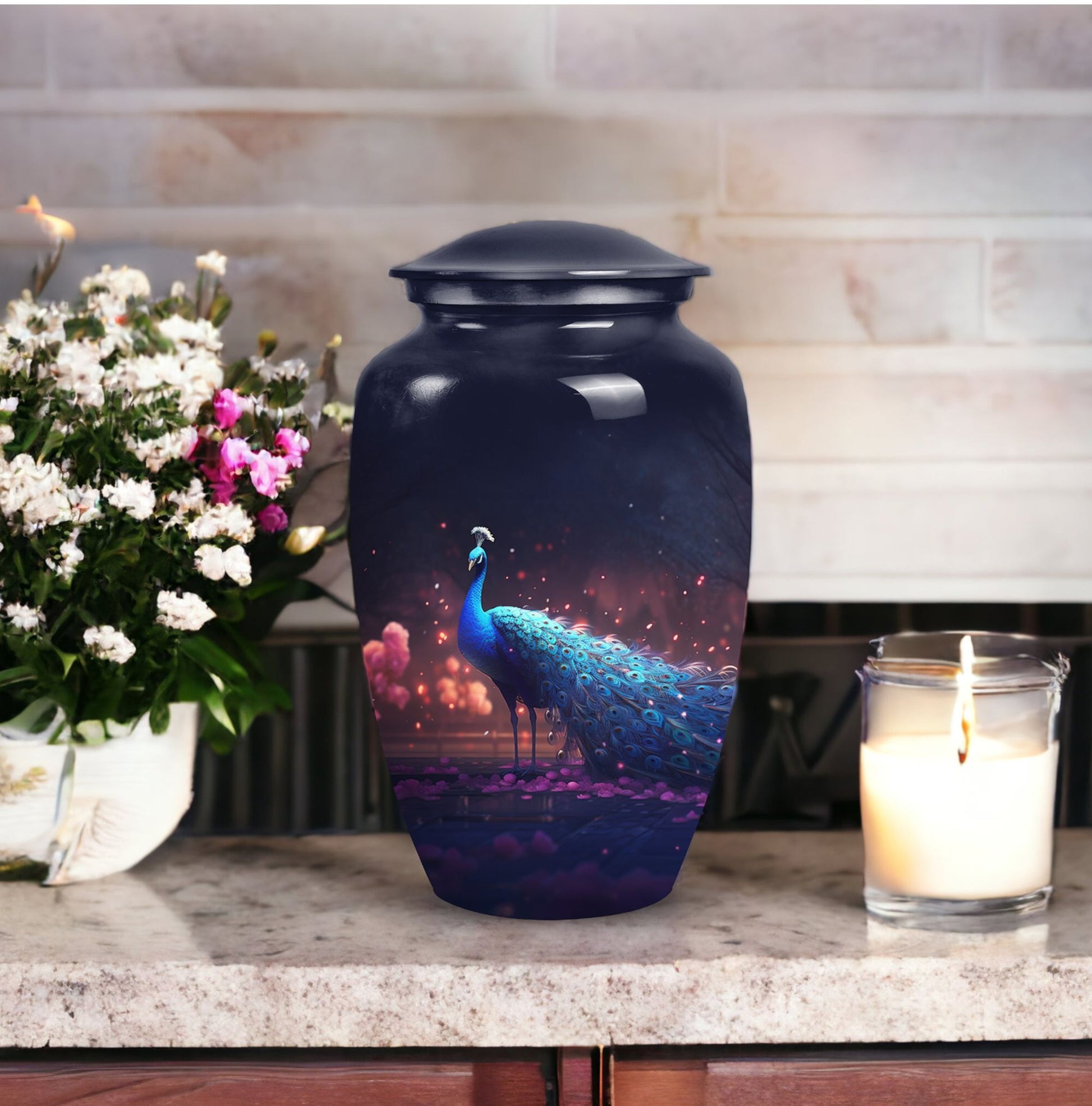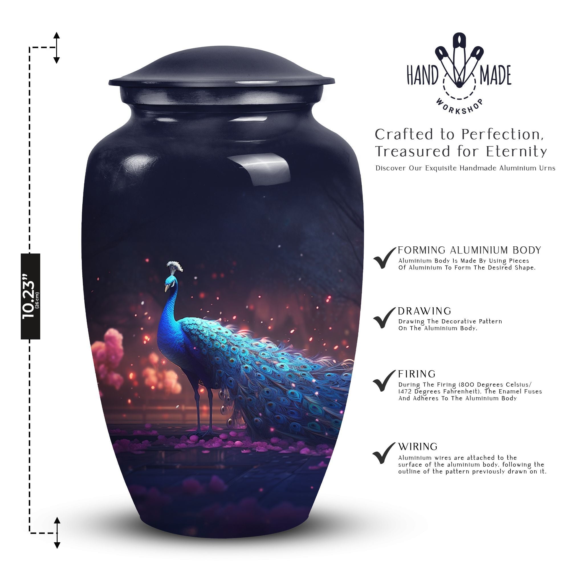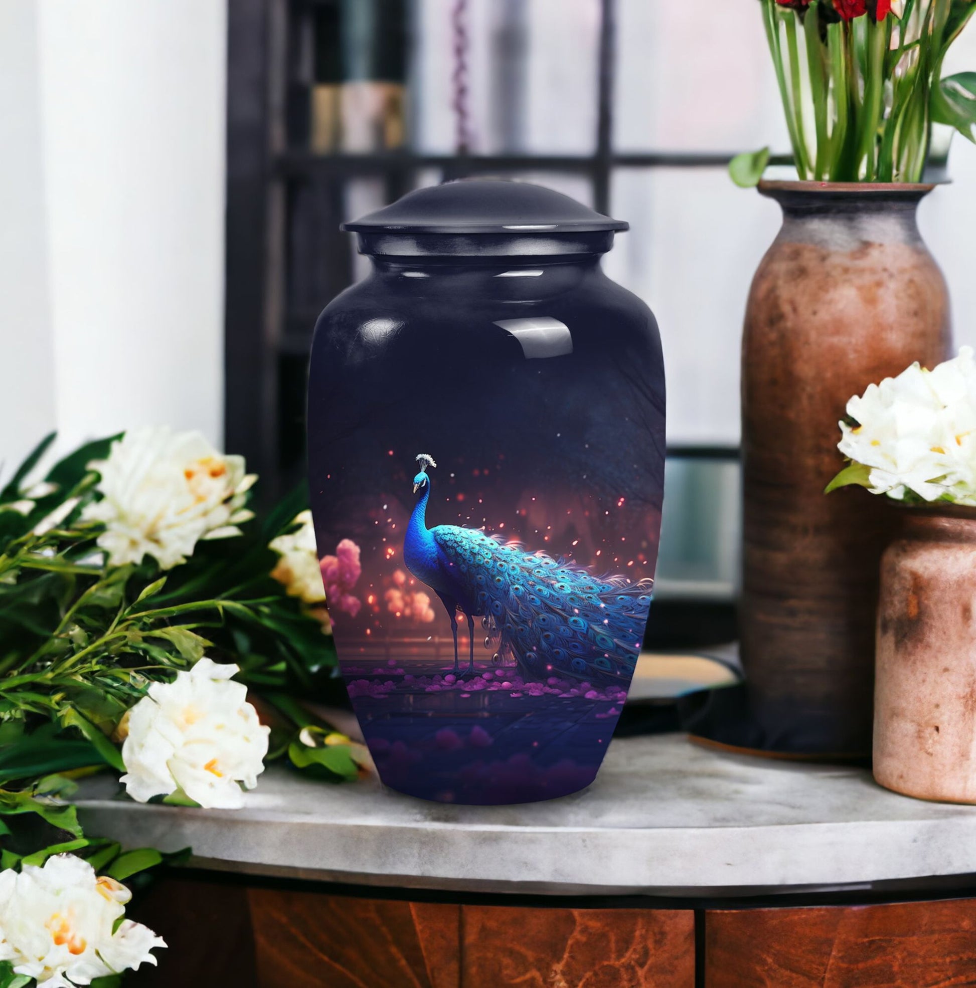 Treasure your beloved departed in this noble Peacock Cremation Urn, a dignified final abode for someone dear. As sublime as the love you hold for the departed, this Large Urn lends a solemn and serene essence. Composed with premium-grade Aluminium, it guarantees longevity and durability. Matchless comfort stems from its generous 200 cubic inches capacity, allowing a spacious area for ashes. The urn measures 10 inches in height and weighs a stable 3.3 pounds, a steadfast reminder of the enduring nature of precious memories. The urn can be made more special by personalizing it with engraved names to extend a heartfelt touch. A velvet pouch accompanies the urn, providing a cozy containment for the ashes. Perfect for those seeking Urns for Mom or any cherished family members, this cremation urn embraces your sentiments. Whether you're looking for Metal Urns for Human Ashes or Funeral Ashes Containers, this product melds aesthetics with profound sentiment. Uplift your sacred reminiscence with our Custom Cremation Urns and Modern Urns for Ashes.