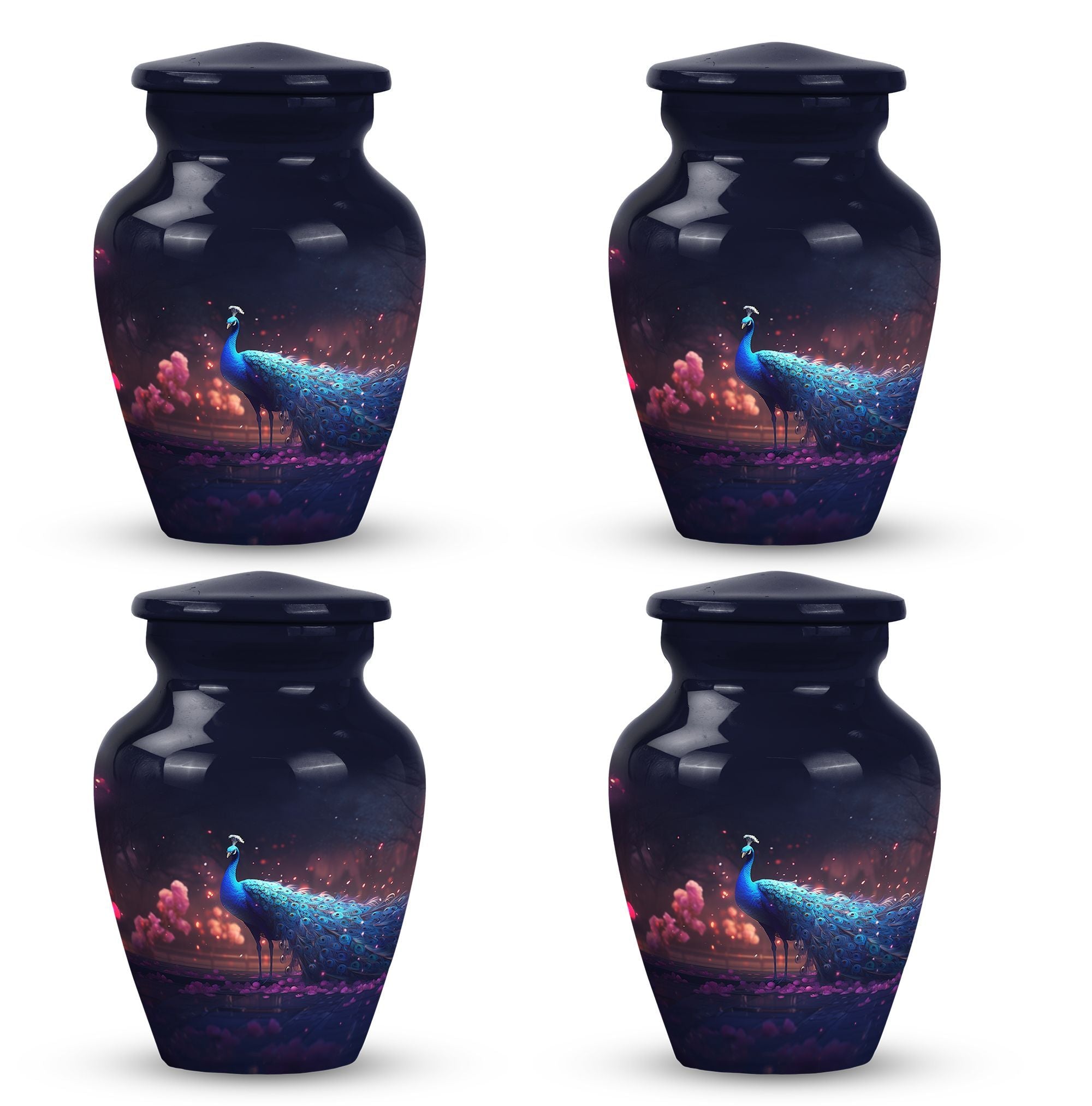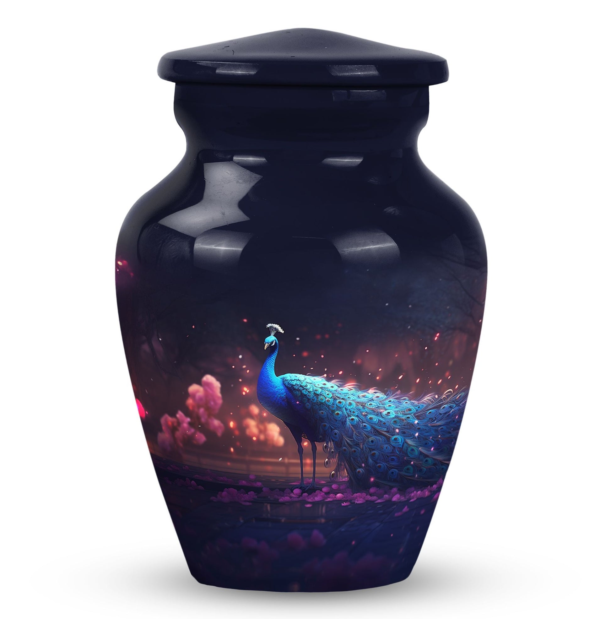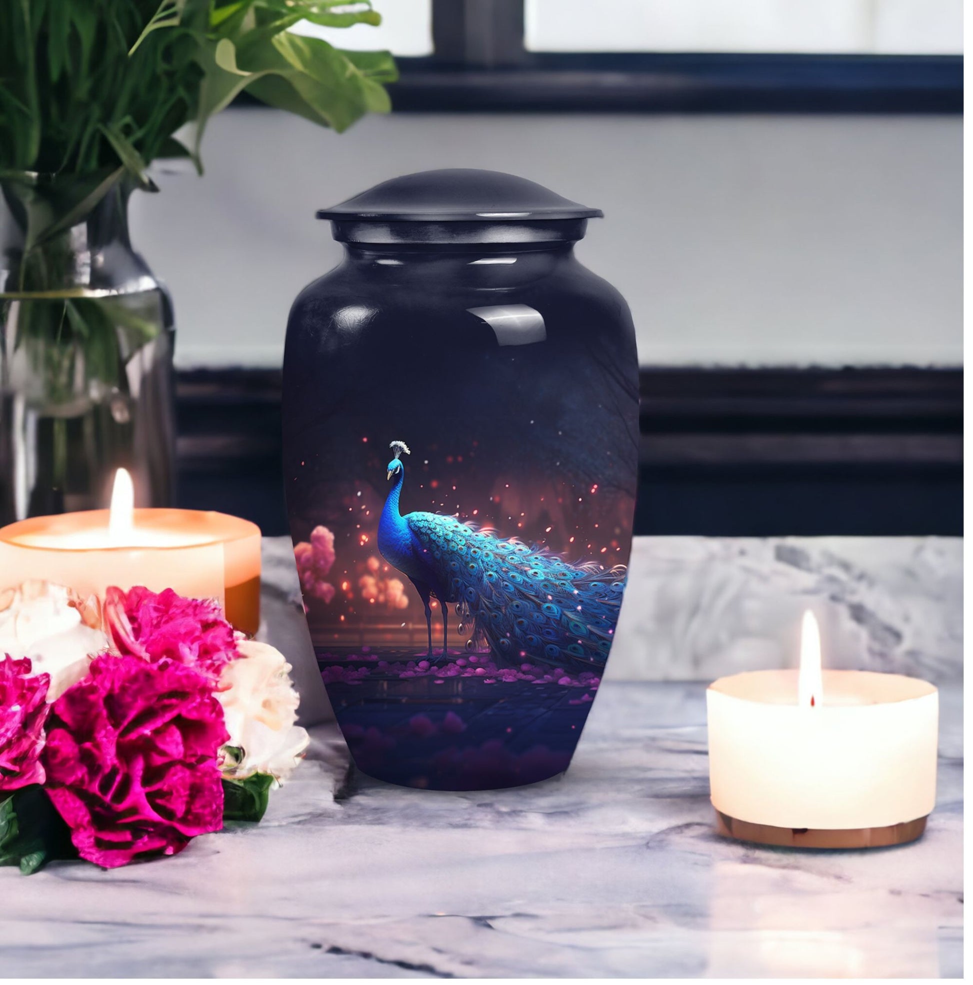 Treasure your beloved departed in this noble Peacock Cremation Urn, a dignified final abode for someone dear. As sublime as the love you hold for the departed, this Large Urn lends a solemn and serene essence. Composed with premium-grade Aluminium, it guarantees longevity and durability. Matchless comfort stems from its generous 200 cubic inches capacity, allowing a spacious area for ashes. The urn measures 10 inches in height and weighs a stable 3.3 pounds, a steadfast reminder of the enduring nature of precious memories. The urn can be made more special by personalizing it with engraved names to extend a heartfelt touch. A velvet pouch accompanies the urn, providing a cozy containment for the ashes. Perfect for those seeking Urns for Mom or any cherished family members, this cremation urn embraces your sentiments. Whether you're looking for Metal Urns for Human Ashes or Funeral Ashes Containers, this product melds aesthetics with profound sentiment. Uplift your sacred reminiscence with our Custom Cremation Urns and Modern Urns for Ashes.