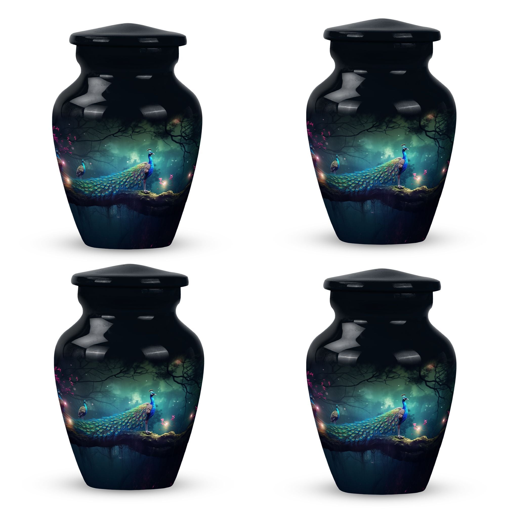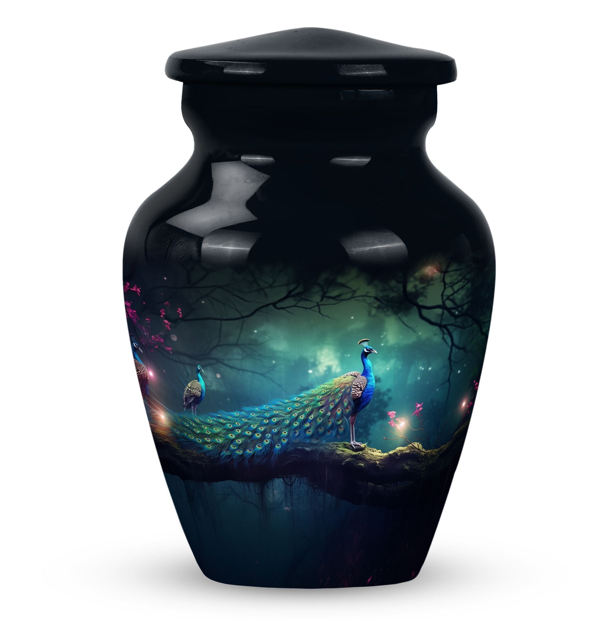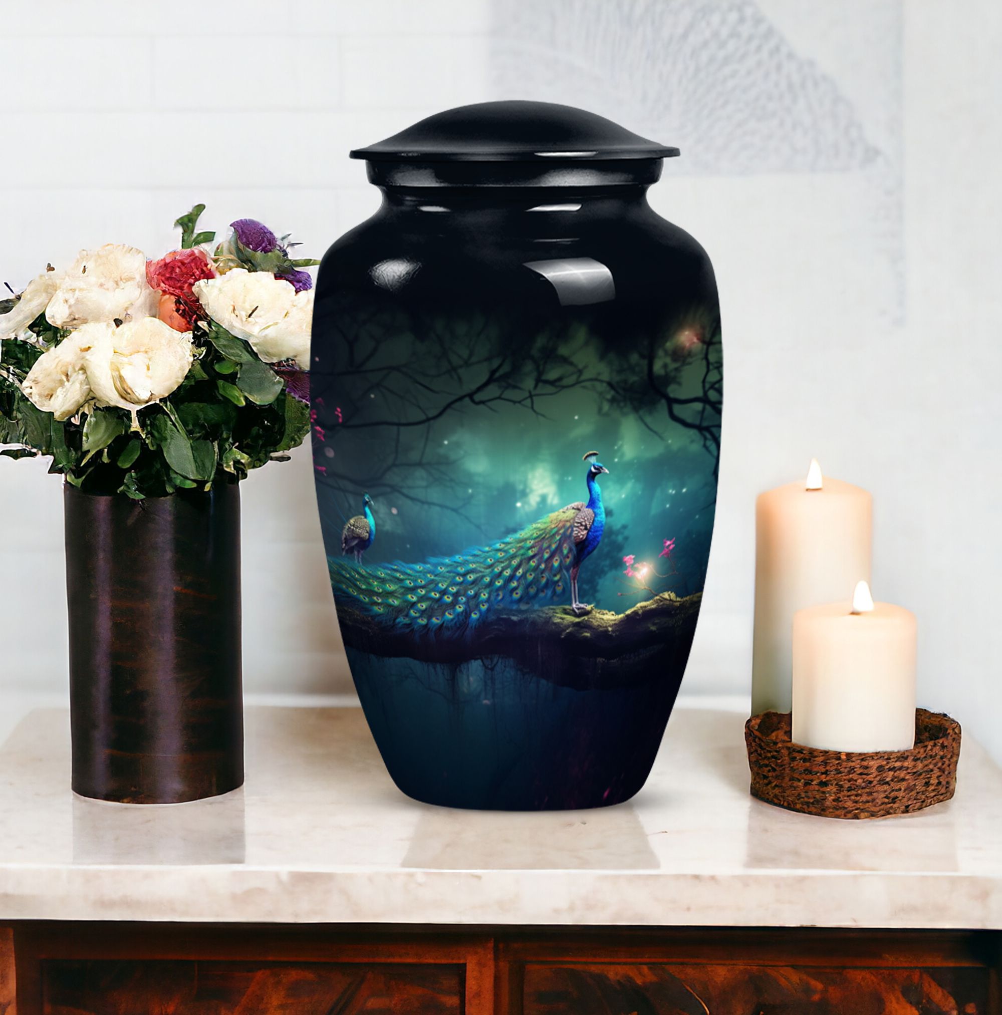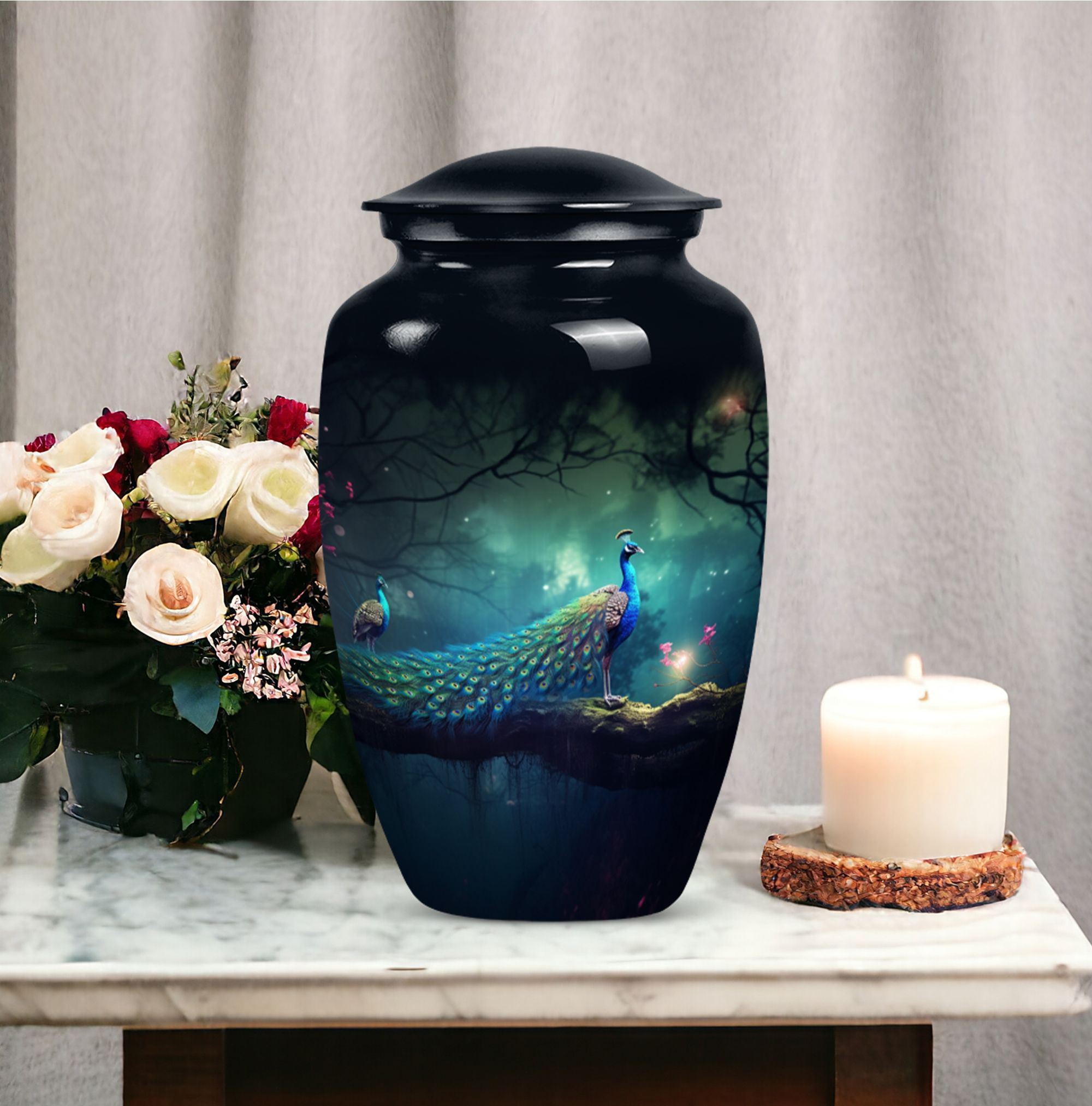 Cherish the memory of your older ones with our spectacular Peacock Urn, an impressive yet subtle tribute for preserving precious remains. This 10-inch tall, 3 Inch diameter classic urn stands out among urns for cremation due to its substantial capacity of 200 cubic inches, adept to hold plentiful ashes. Weighing a sturdy 3.3 pounds, the urn confides in its aluminium construction and robustness. Its personalized engraving option allows you to inscribe your loved ones' names, fostering a familiar connection. It also comes with a soft velvet pouch to compassionately safeguard the contained ashes. This large urn gracefully amalgamates modernity and tradition, making it a fitting choice as a memorial urn for the revered ones.