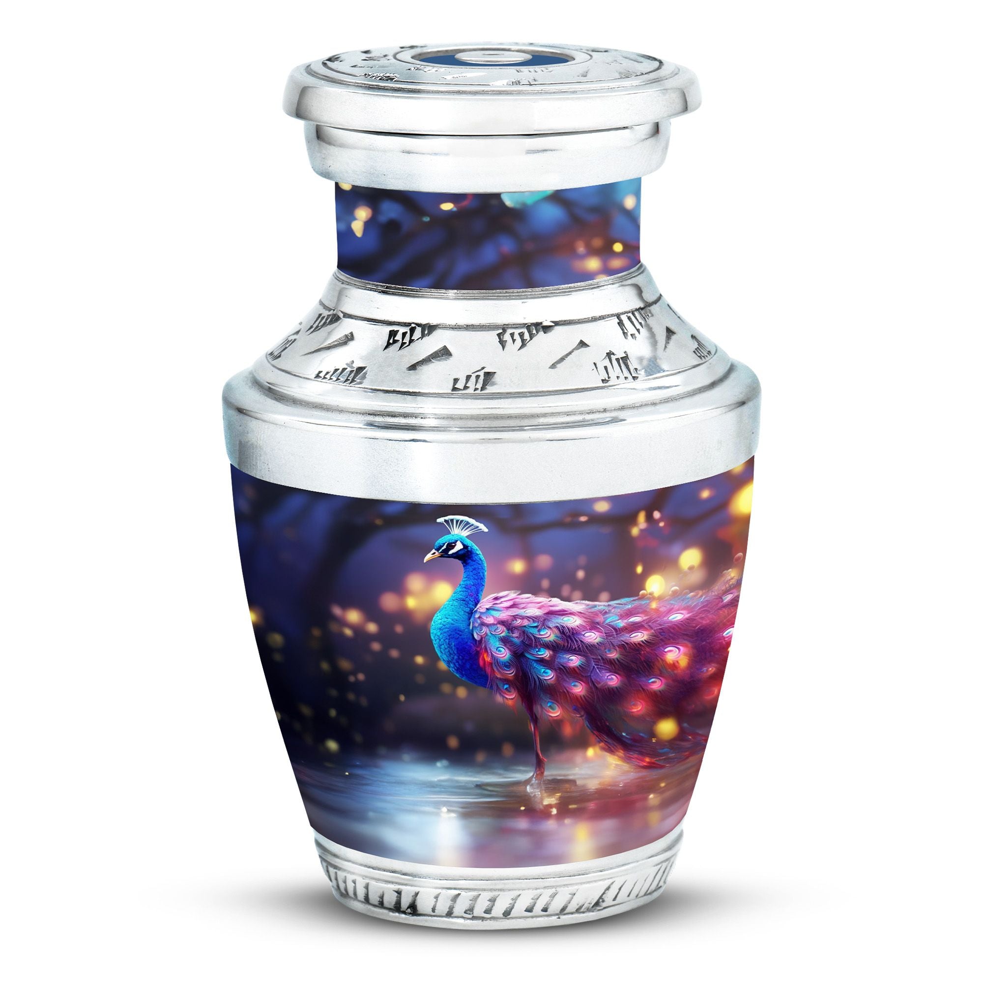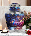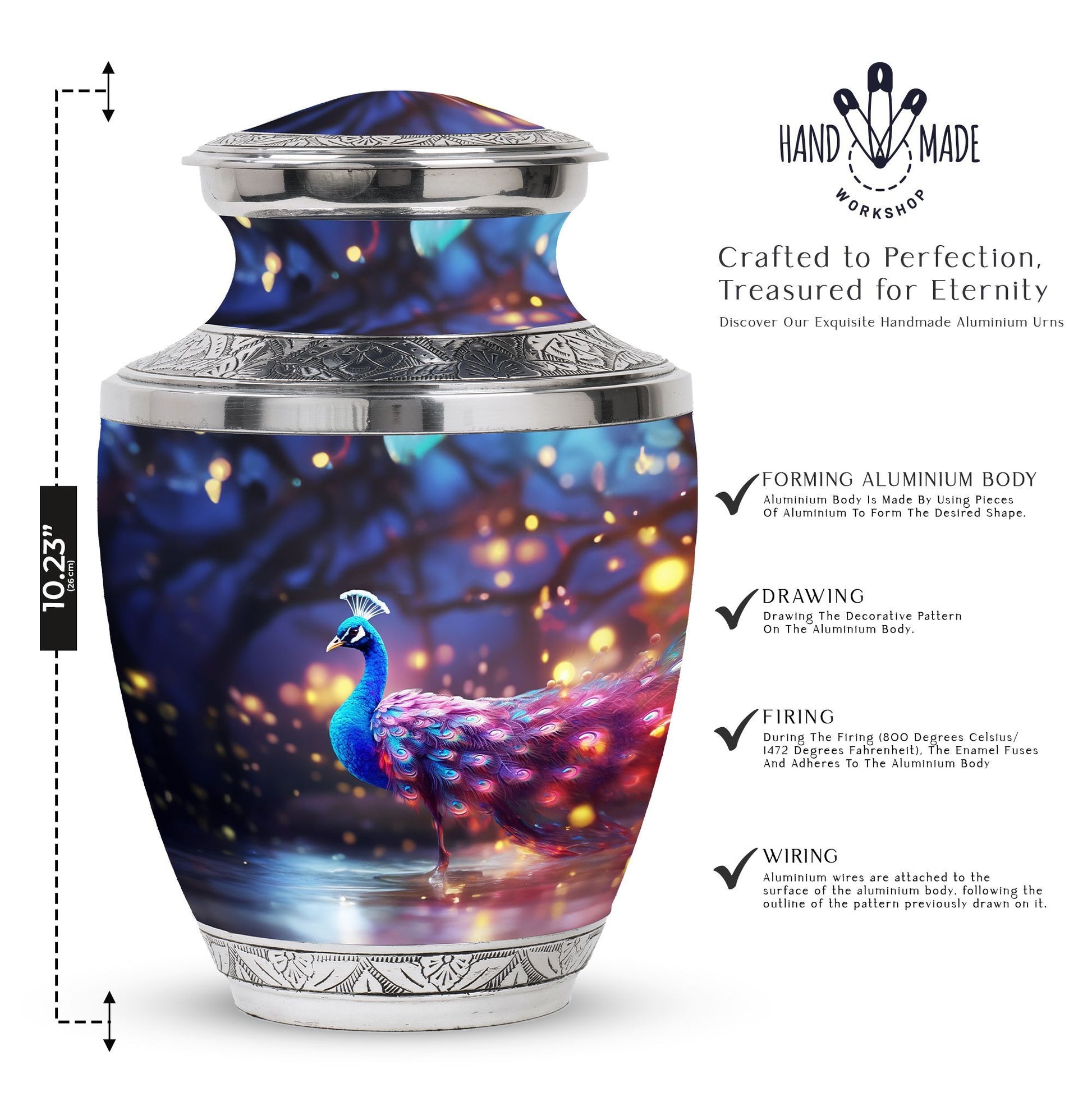 Introducing our exquisite Peacock Urns for Human Ashes, a poignant and dignified option in our collection of Large Urns. These Memorial Urns have a classic design and are carefully crafted from premium quality Aluminum imparting them an elegant and serene look. With a size of just 3 inch, they are purposefully designed to be compact yet have a sizeable capacity of 200 cubic inches. These human cremation urns weigh a modest 3.3 pounds for easy handling and are designed at 10 inches in height offering a substantial presence. The urns come with a velvet pouch for containment of ashes, ensuring a respectful and dignified home for your loved one's remains. An added feature is the customization option that allows you to personalize these decorative urns with engraved names. Poignant and beautifully crafted, these urns are an elegant tribute to your loved one's memories.