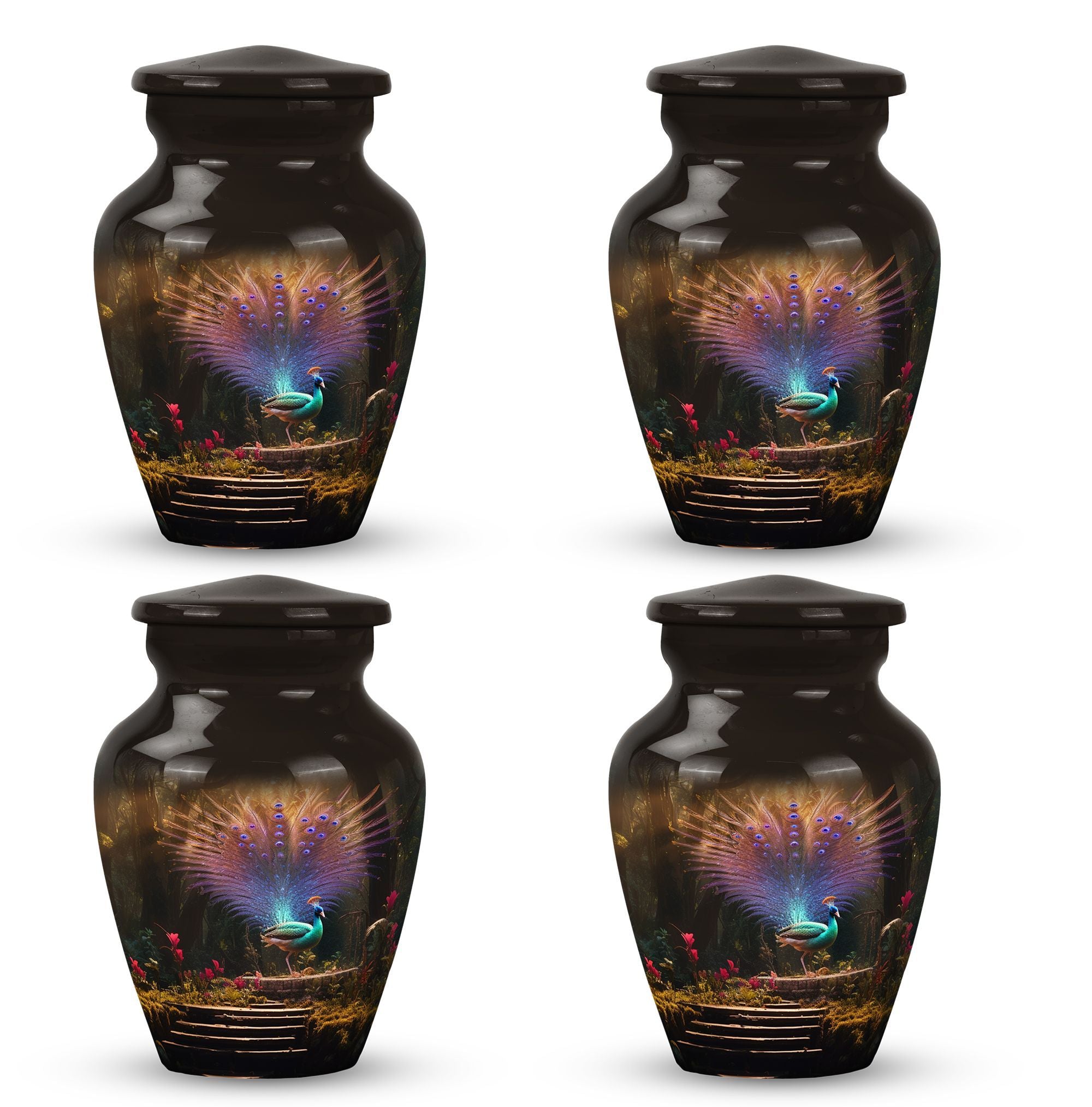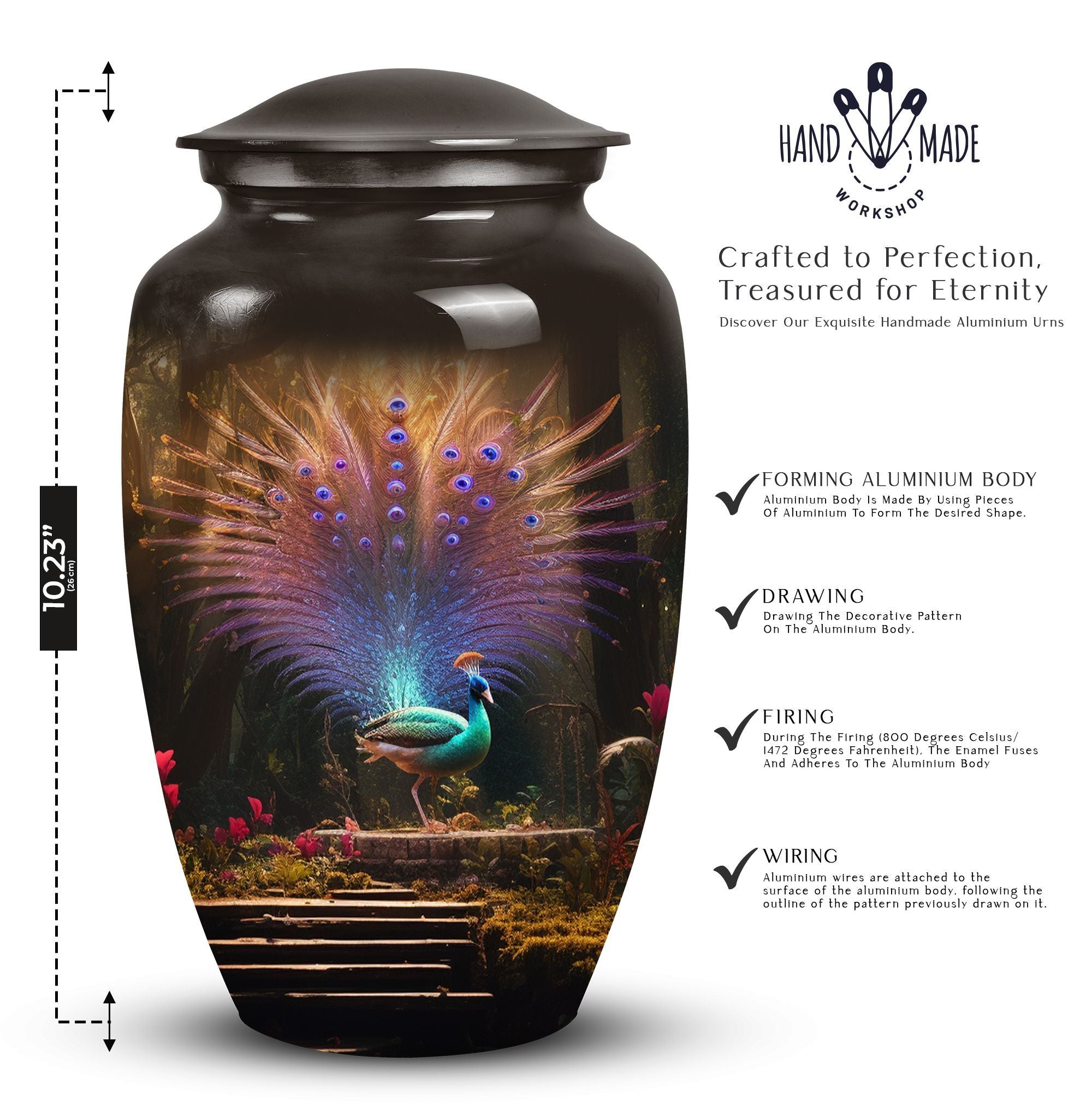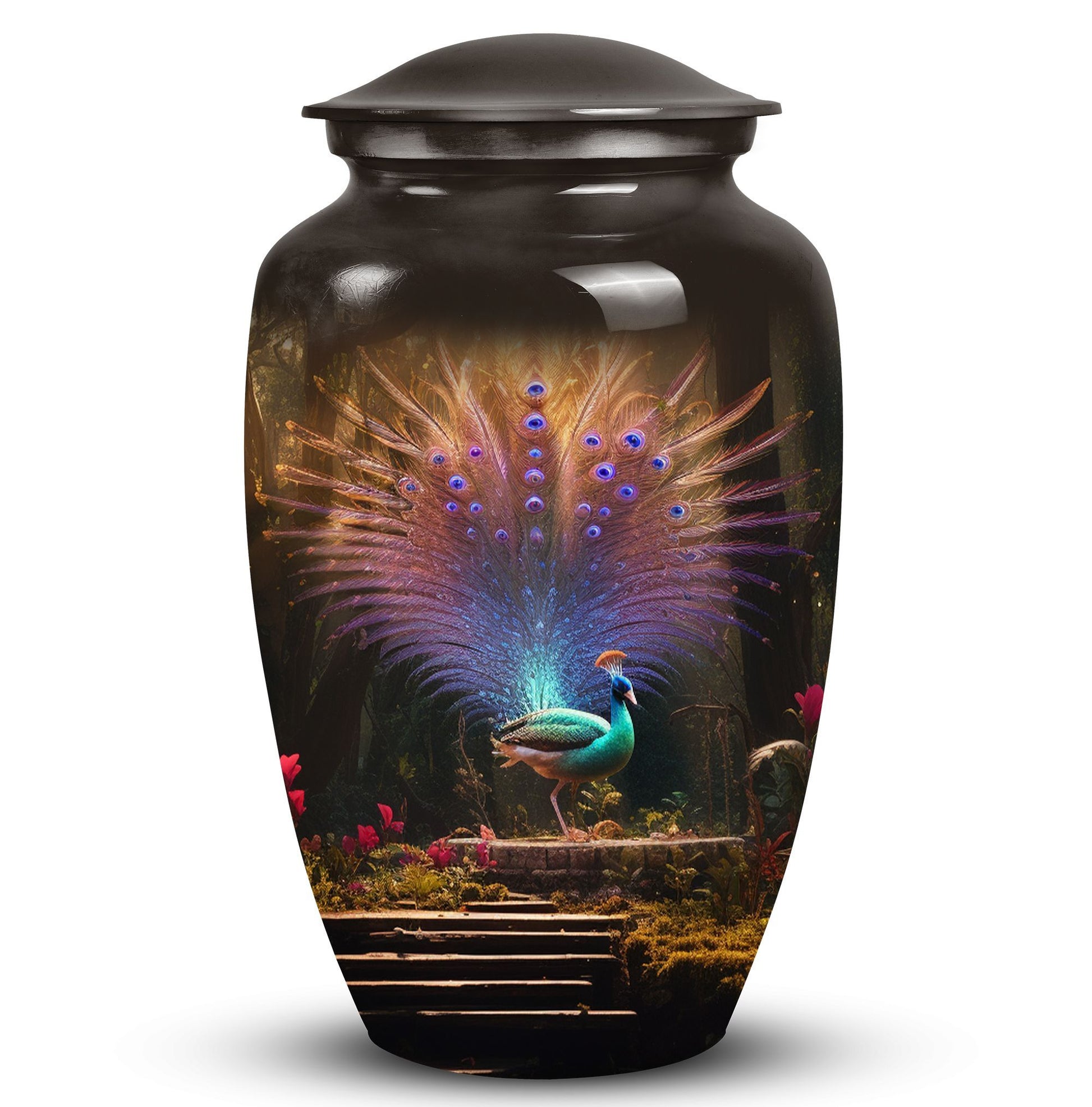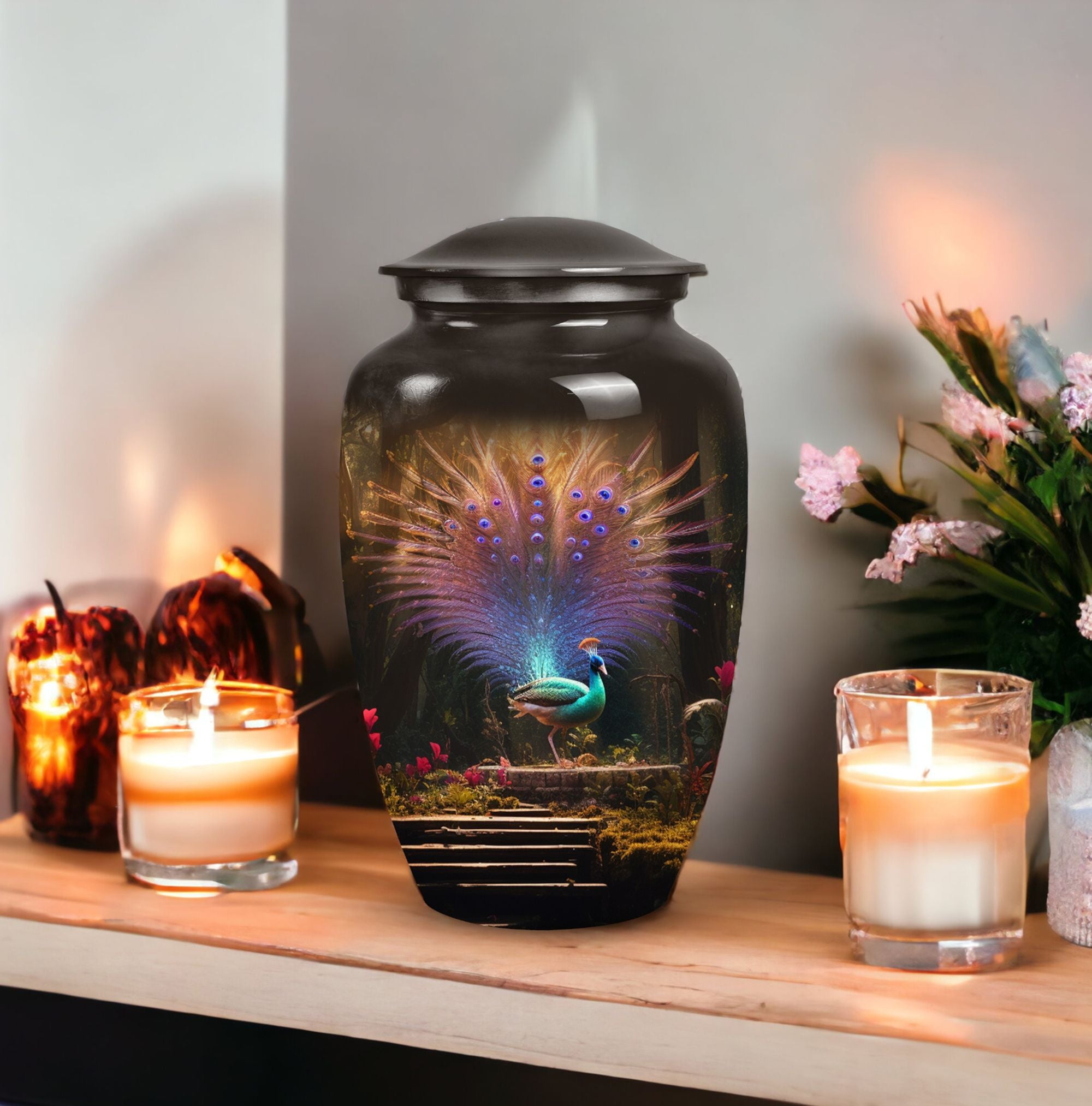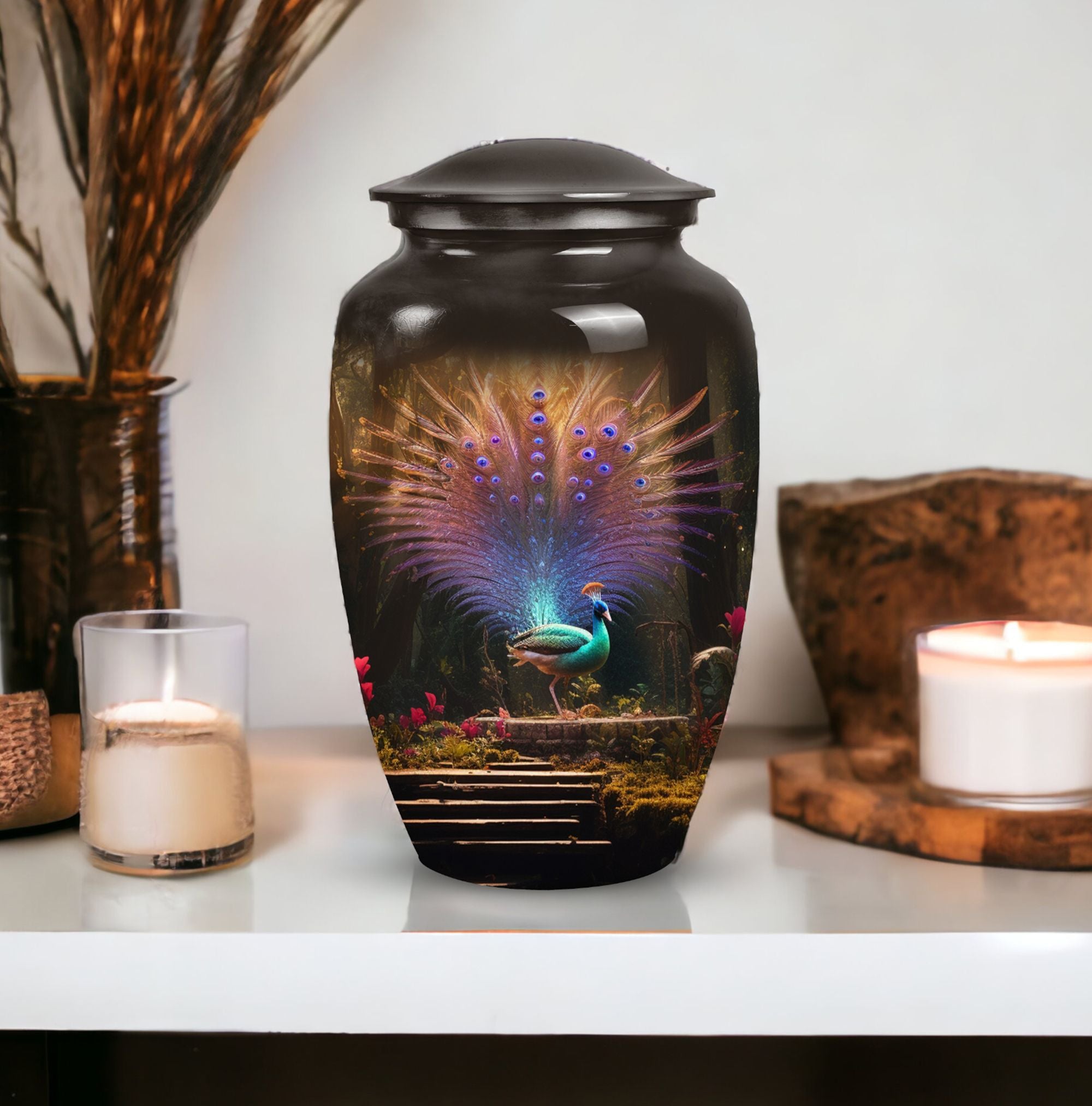 Elevate your loved one's memorial to new heights with our 'Peacock Urns for Ashes' - a touch of timeless dignity. These large urns, forged from high-quality aluminium, boast a substantial capacity of 200 cubic inches, making them suitable for maintaining integrity of ashes. Nicely weighted at 3.3 pounds, they stand tall at 10 inches, perfect for displaying on a mantelpiece or in a sacred spot. Size isn't an issue with these urns, having been precisely constructed to have a 3-inch diameter ensuring stability. With these cremation urns, you'll also receive a velvet pouch, a thoughtful addition meant to contain the ashes. Personalize your urn with an engraving, adding your own essence to the classic design. These quality urns capture the beauty of life and the solemnity of loss, making them perfect memorial urns for adu=lts.