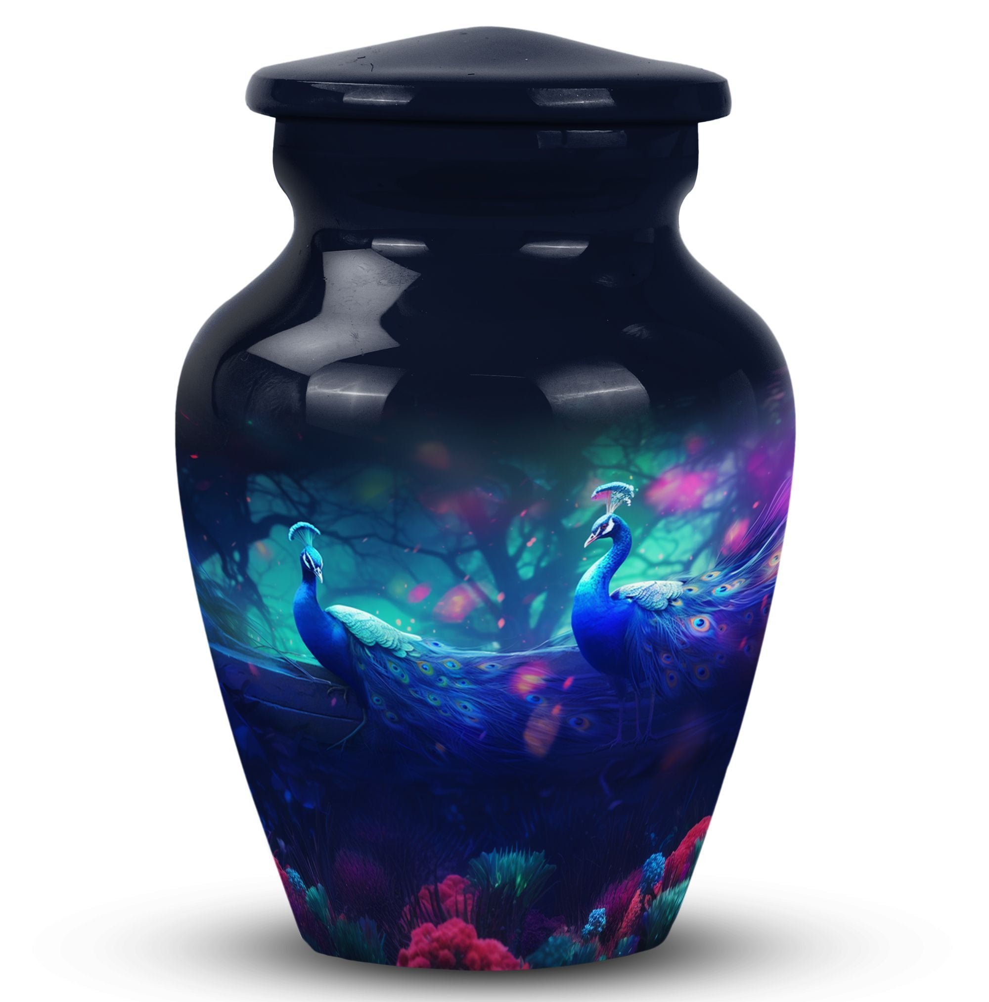 Imagine an awe-inspiring Peacock Urn, a 10-inch emblem of respect and remembrance in the realm of Memorial Ceremony Supplies. Handcrafted from superior aluminium, this cremation urn provides an elegant and weighty (3.3 pounds) place, sized at 200 cubic inches, to keep your cherished one's ashes. This 3-inch Classic Urn adds a touch of nobility to any setting and comes enveloped in a velvet pouch for dignified containment of ashes. As a tribute to your loved one, our Peacock Urn can be personalized with engraved names. It is not just an urn for ashes; it is a signal of enduring love. Perfect for those seeking a large, aesthetically pleasing vessel for a loved one's remains.