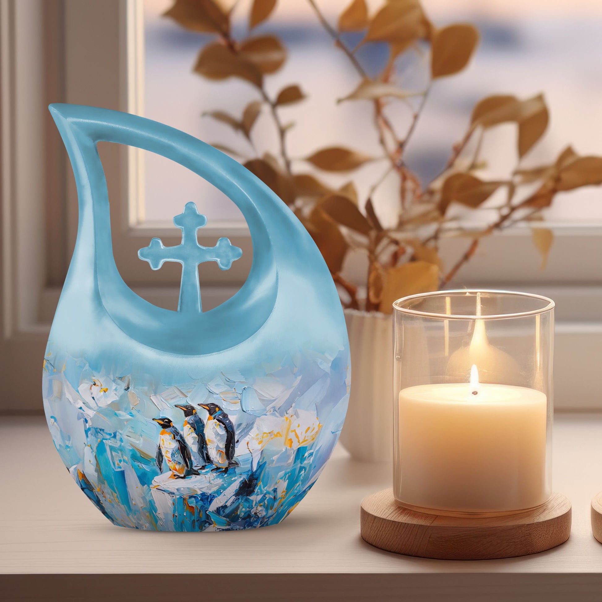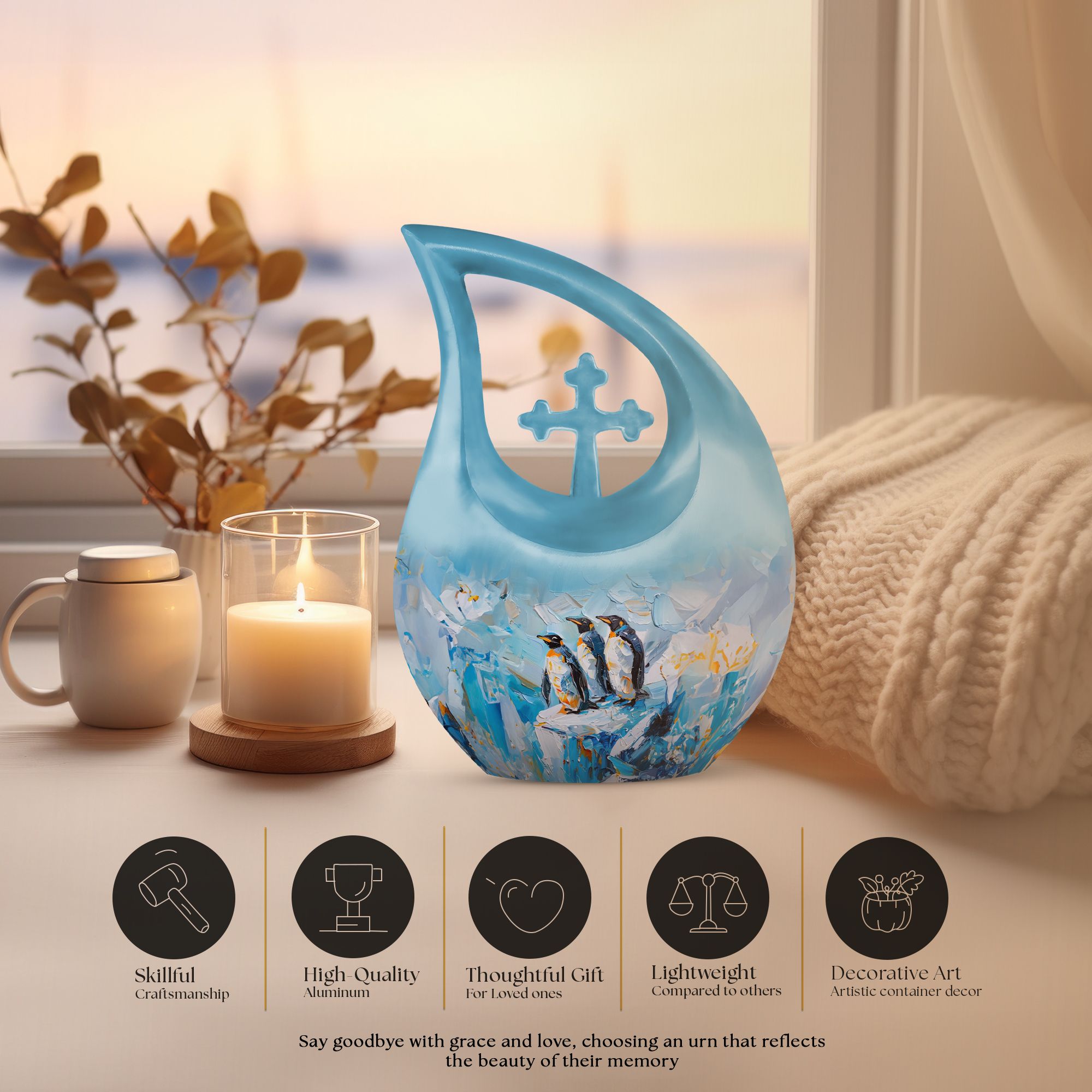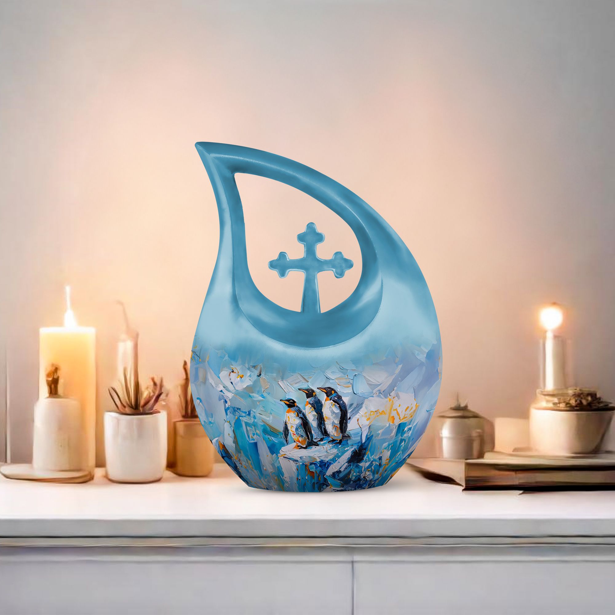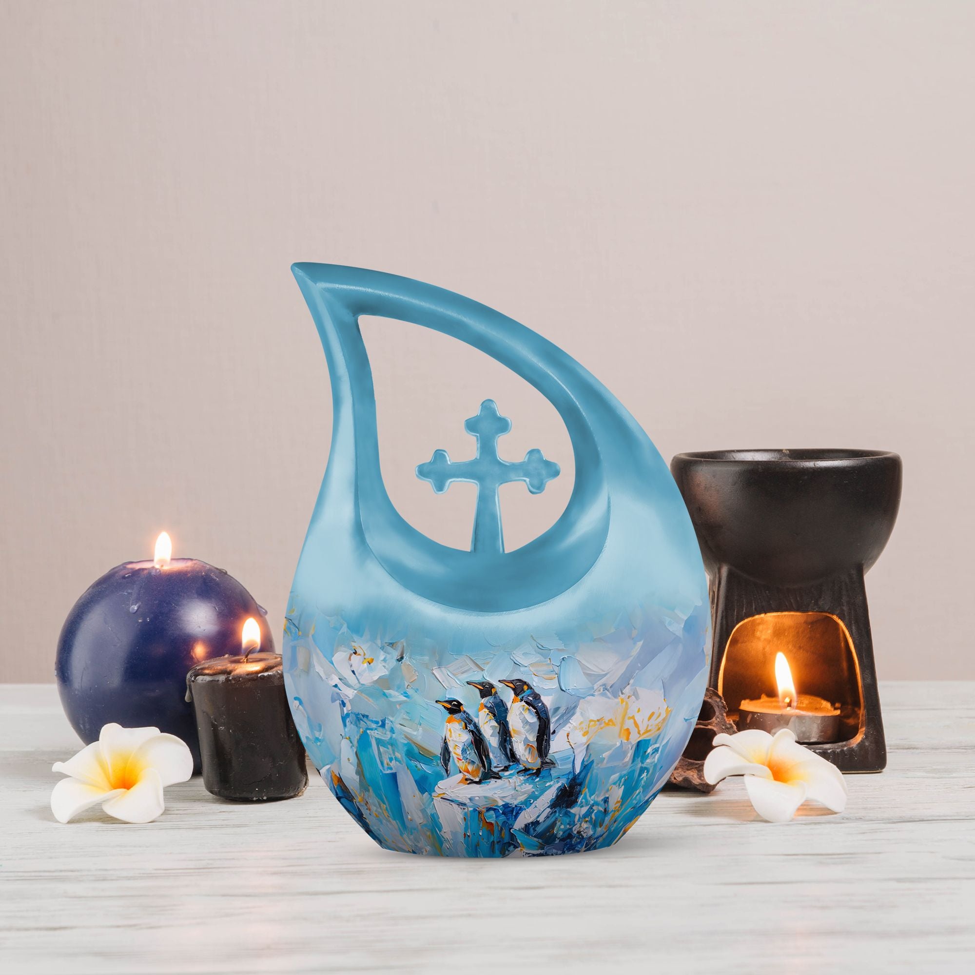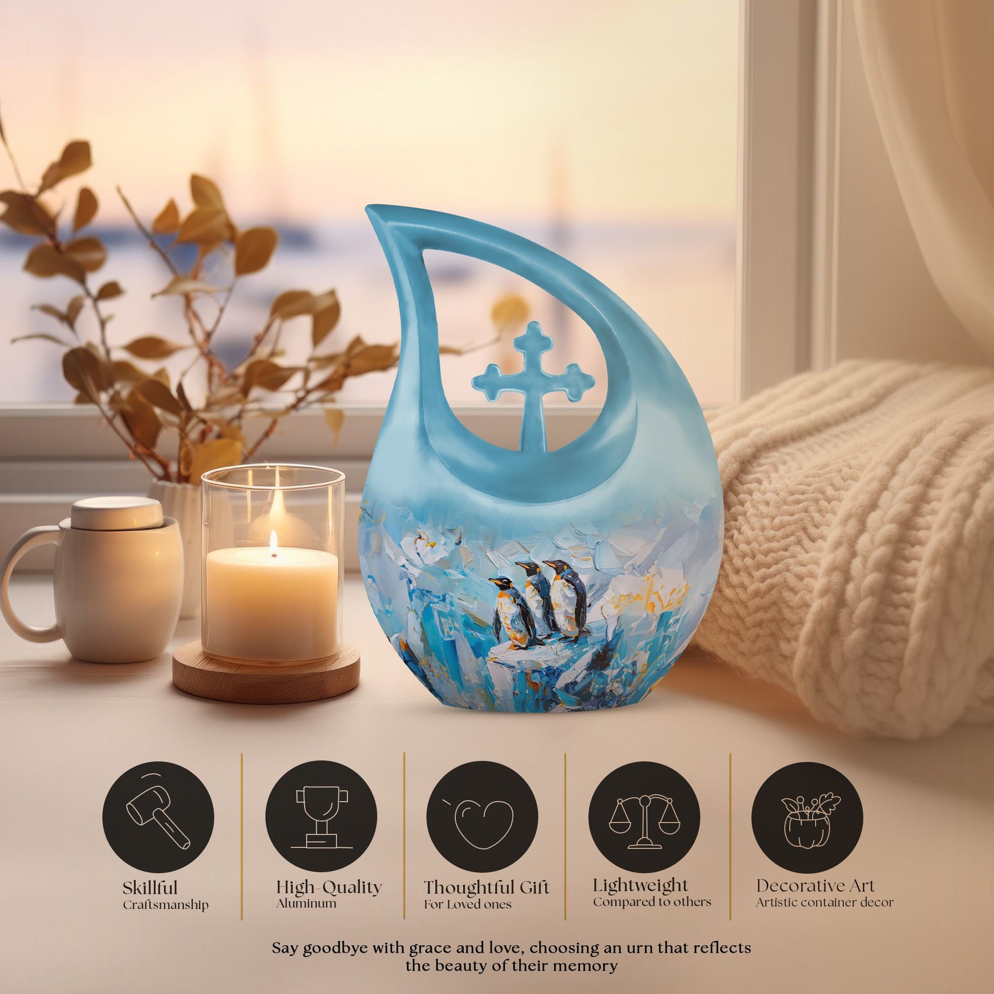 Honor your loved ones with our Penguin Urn, an impressive dimension of 10 inches in height, artfully crafted from high-quality Aluminium. Weighs at 3.3 pounds and caters to a capacity of 200 cubic inches, large enough to encapsulate the remainders flawlessly. The striking Cross Drop pattern, exclusive to this Penguin-themed urn, adds a layer of meaning to this crucial memento. Our special urn is tailored for your needs with a Personalize with engraved names feature, adding a unique touch to the process of remembrance. Each Urn package includes a lush velvet pouch that serves for secure containment of ashes, ensuring tender care during this emotional process. This large urn is your keepsake memory box, a beautifully functional representation of your precious memories. As you continue to search 'Memorial Urns' or 'Urns Online', consider our exquisite Penguin Urn. Our exceptional range also features 'Cool Urns, Keepsake Memory Box, Cremation Boxes For Adults, and Metal Urns For Ashes', showcasing our dedication to providing distinguished urns best suited for your needs.