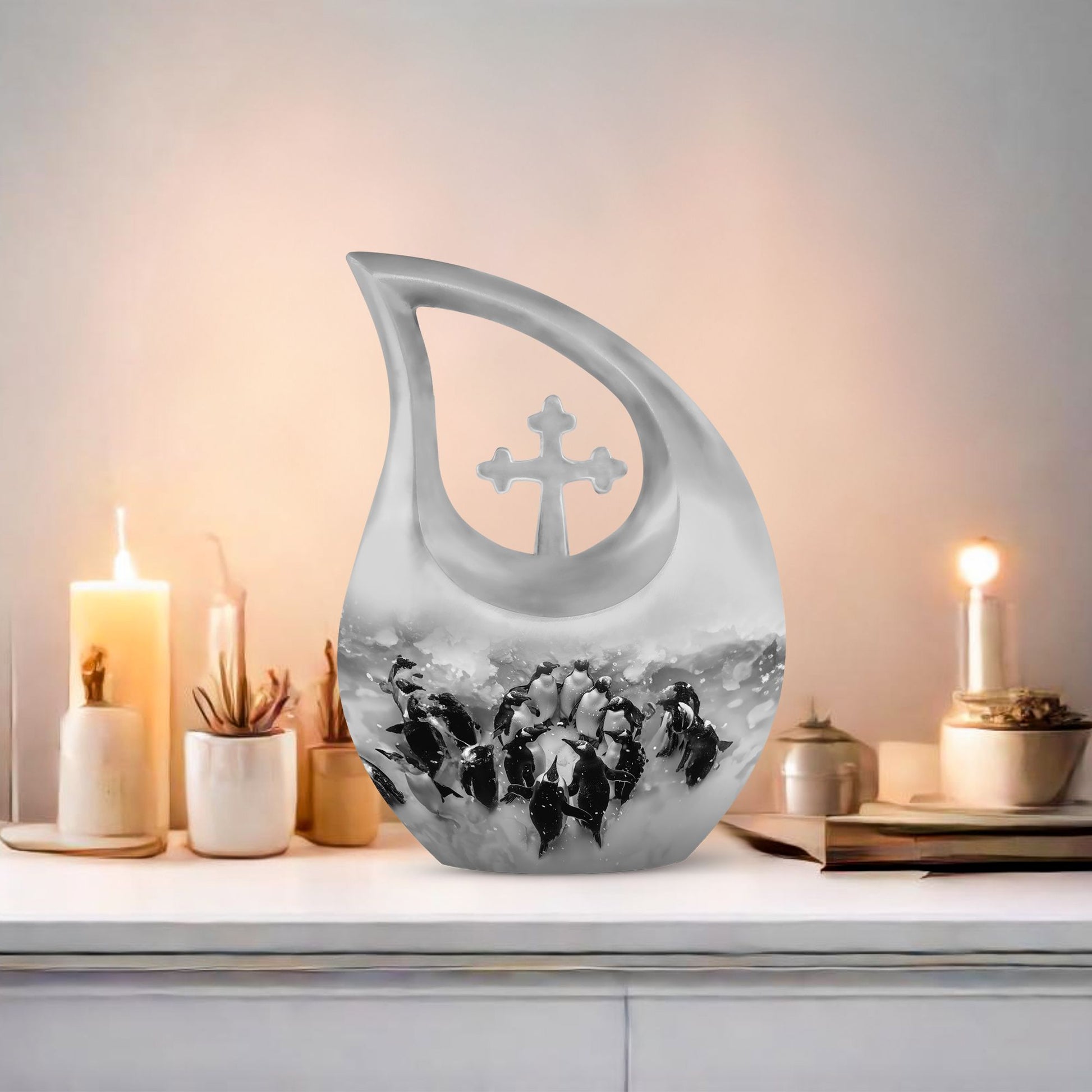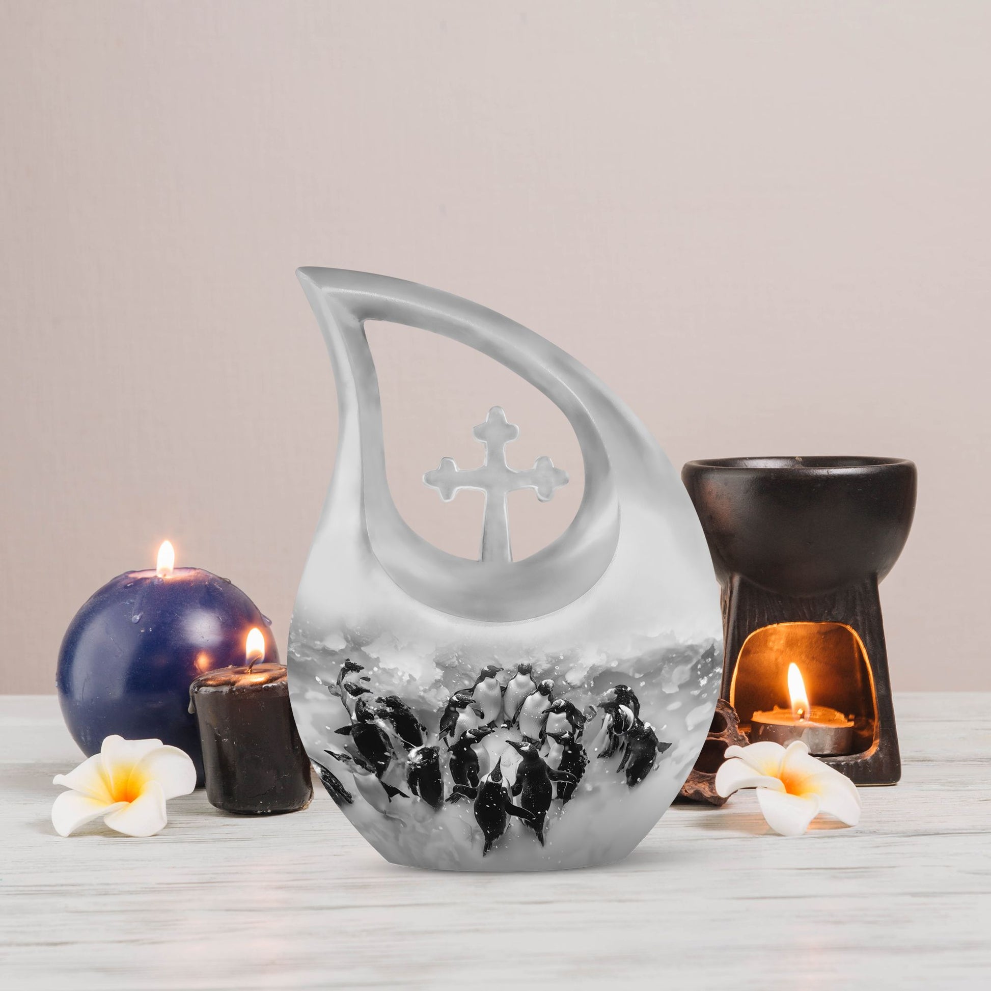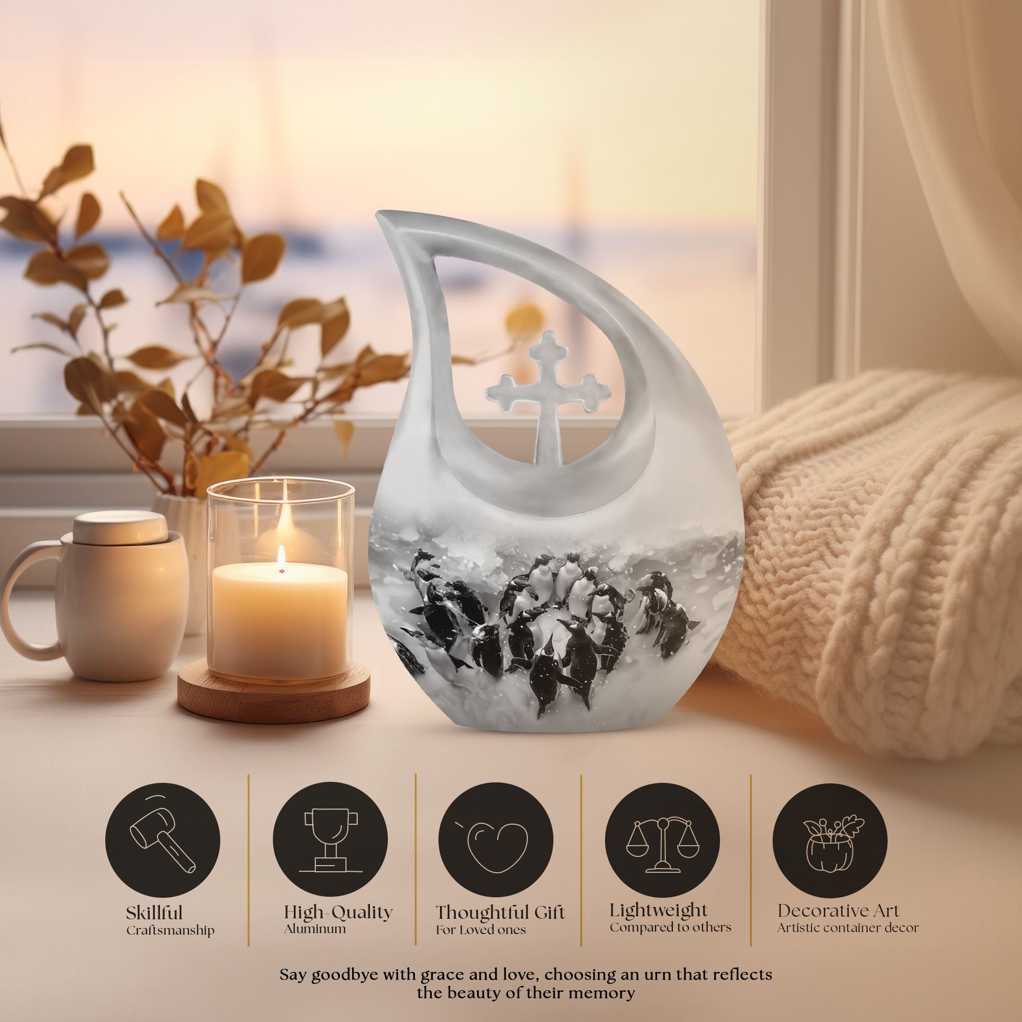Embrace this time-honored commemoration with our Penguin-themed Large Urn. Crafted with meticulousness from resilient Aluminium, this Cross Drop urn, standing tall at 10 inches, accounts for an intricate balance between elegance and durability. This labor-of-love holds up to 200 cubic inches of remains, ensuring a substantial reserve for your dearly departed. It is accentuated by the convenience of a velvet pouch, ensuring secure containment of the ashes. Achieving the unique polyphony of quality and aesthetics, it weighs a modest 3.3 pounds, easy to handle and manage. Personalize this urn with engraved names to cherish the essence of your loved one. This Penguin Urn is perfect for those seeking Unusual Urns For Ashes or Beautiful Urns to celebrate the life of a loved one. Be it a Custom Mom Urn or an Ashes Keepsake For A Man, our product tops your search for memorial urns.