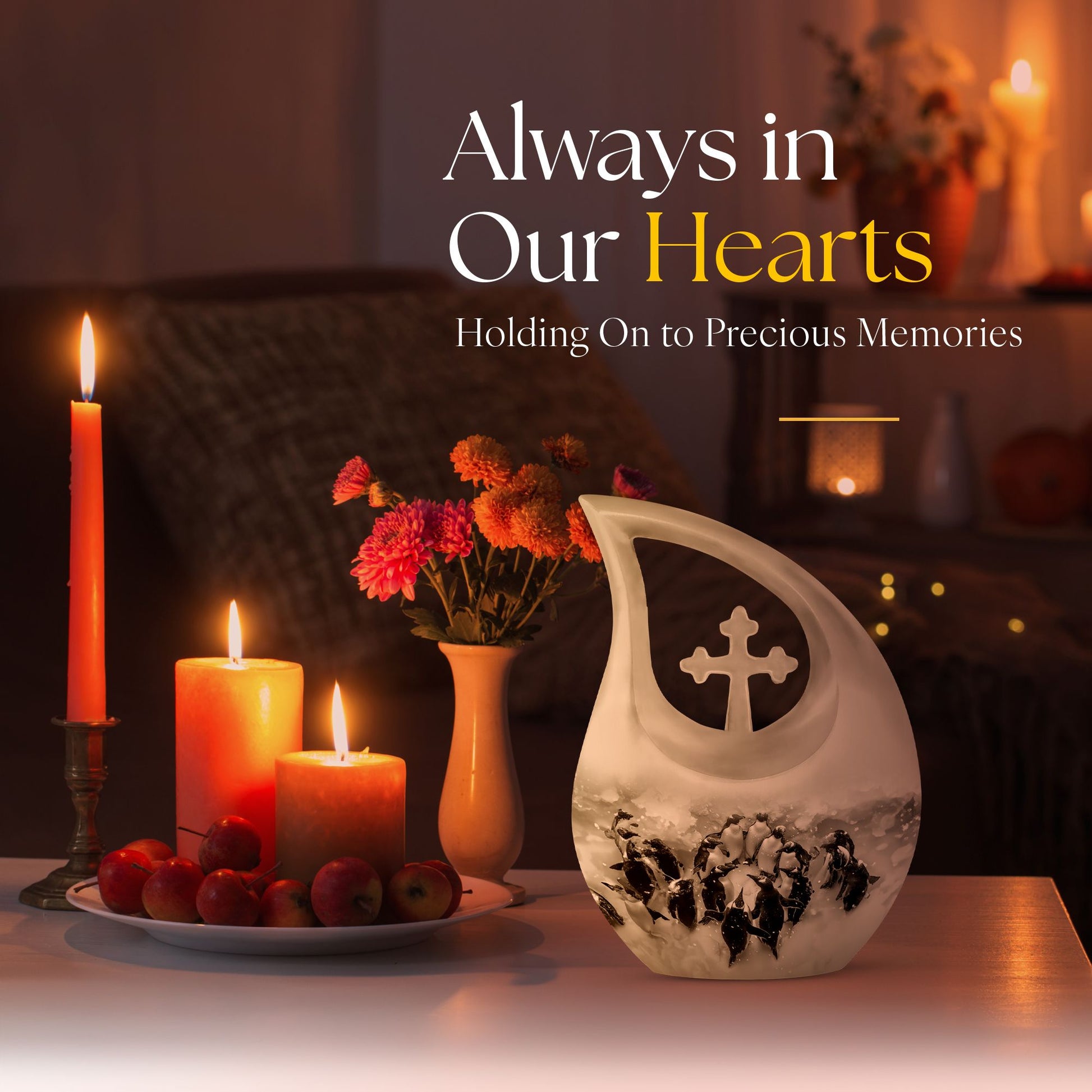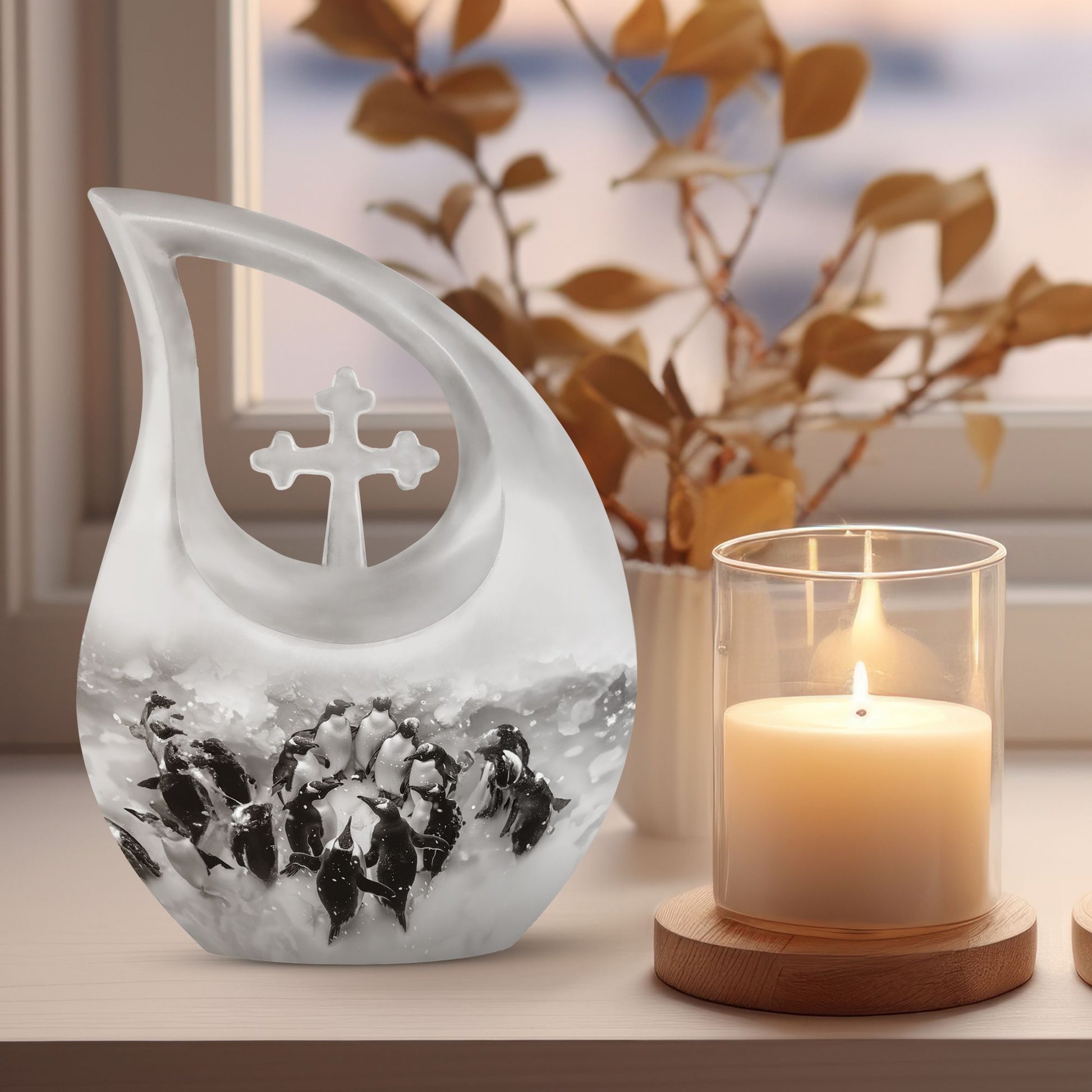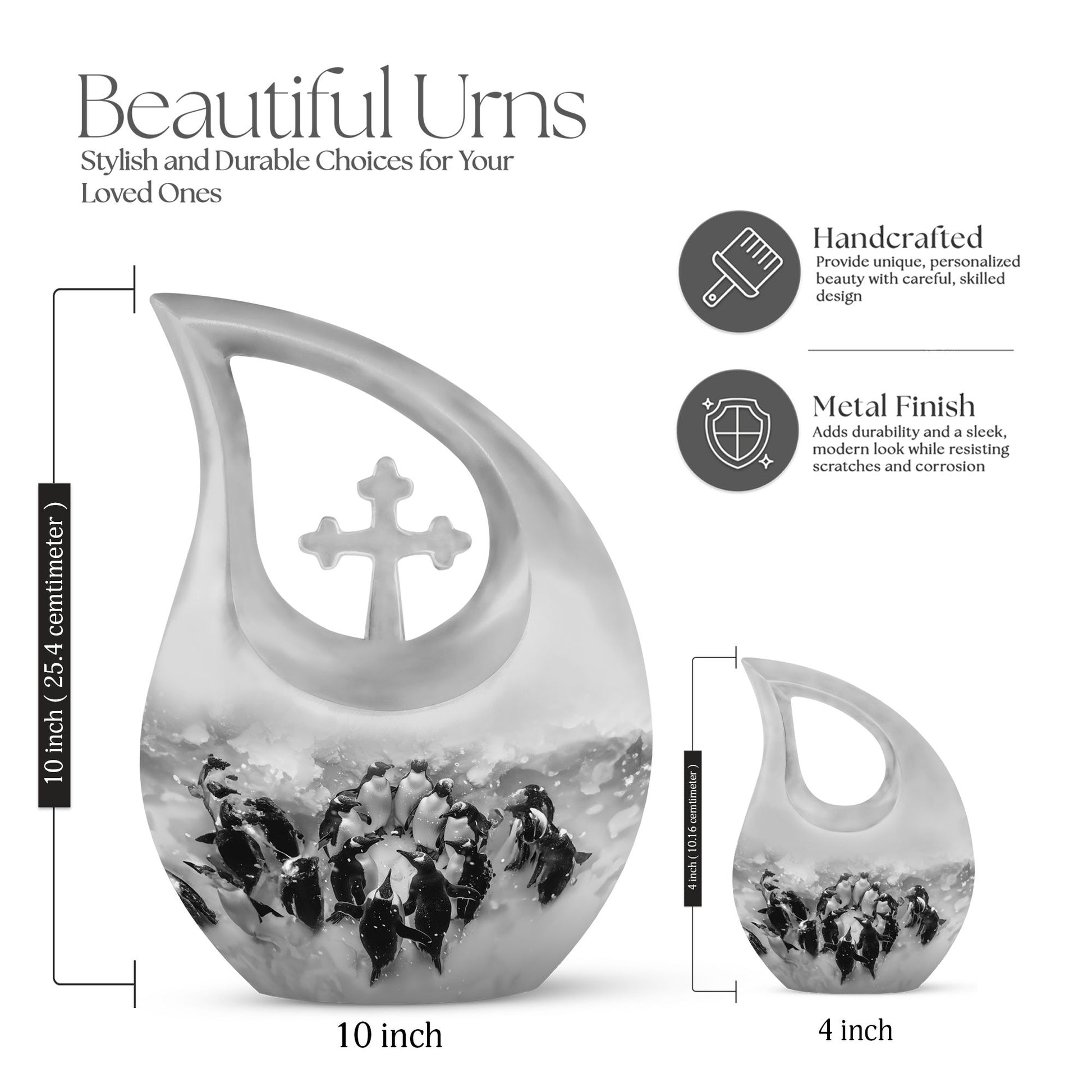 Embrace this time-honored commemoration with our Penguin-themed Large Urn. Crafted with meticulousness from resilient Aluminium, this Cross Drop urn, standing tall at 10 inches, accounts for an intricate balance between elegance and durability. This labor-of-love holds up to 200 cubic inches of remains, ensuring a substantial reserve for your dearly departed. It is accentuated by the convenience of a velvet pouch, ensuring secure containment of the ashes. Achieving the unique polyphony of quality and aesthetics, it weighs a modest 3.3 pounds, easy to handle and manage. Personalize this urn with engraved names to cherish the essence of your loved one. This Penguin Urn is perfect for those seeking Unusual Urns For Ashes or Beautiful Urns to celebrate the life of a loved one. Be it a Custom Mom Urn or an Ashes Keepsake For A Man, our product tops your search for memorial urns.