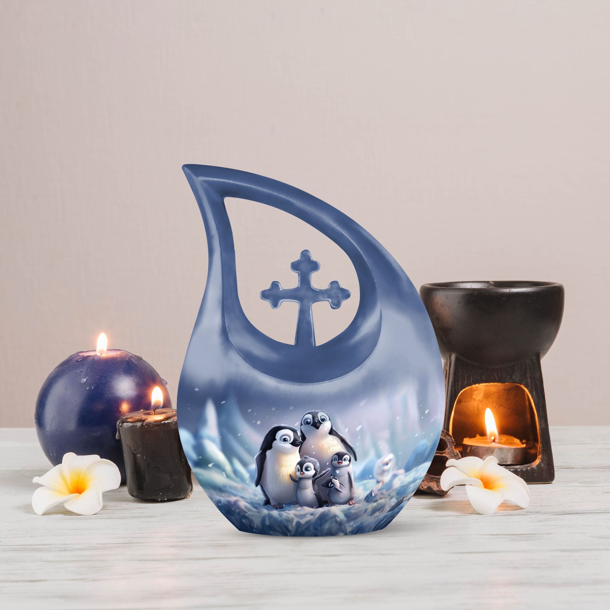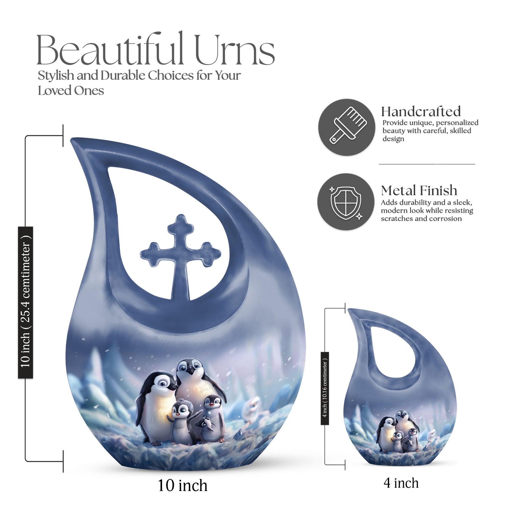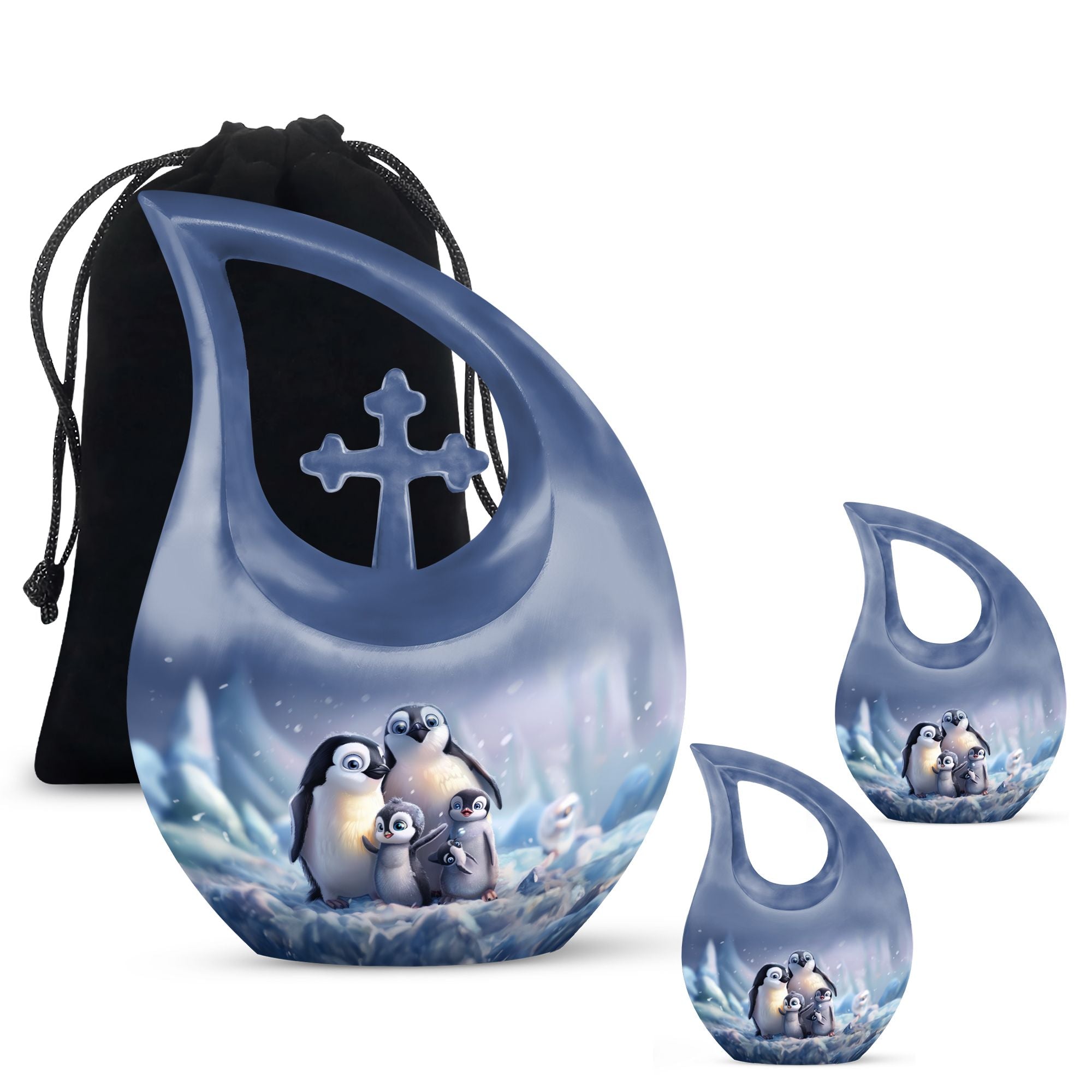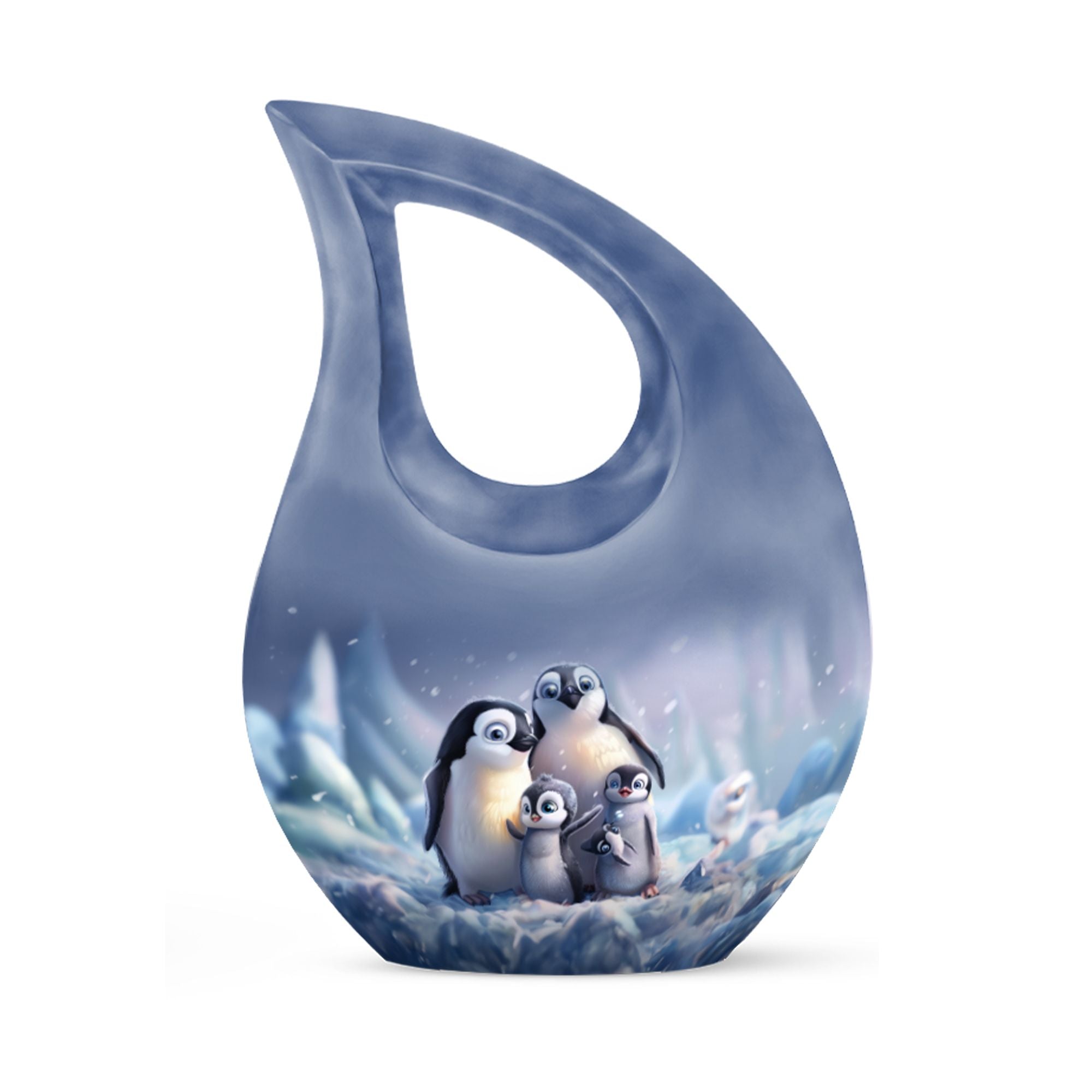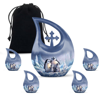 Delve into a cherished tribute with our large Penguin Urn, an elegant remembrance urn for ashes captivatingly crafted from durable aluminium. Captivate in its unique 10-Inch stature, this modern urn for ashes is meticulously personalized with engraved names, making it an exclusively bespoke piece for your loving mom. It weighs a solid 3.3 pounds and with dimensions of 10 inches in height, it commands respect and reverence. The urn generously offers a sizable capacity of 200 cubic inches and comes hand in hand with a snug velvet pouch for containment of ashes, underscoring its unmatched value. Our signature 'Cross Drop' asserts itself on this urn, giving it a sacred feel, fitting for angels and loved ones. Its theme dances to the penguin tune, a subtle symbolism of love, family and community cohesion. Be assured to have your desires in urn customization met in this embodiment of sublime craft and tradition, a fitting vessel to pay tribute to your mom's beautiful life. A memento to hold dear, this urn serves as a loving sanctuary for your lost loved one's ashes.